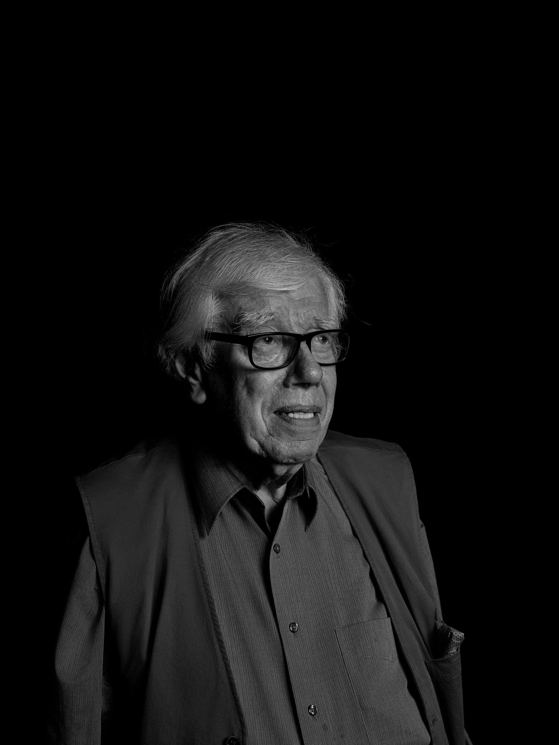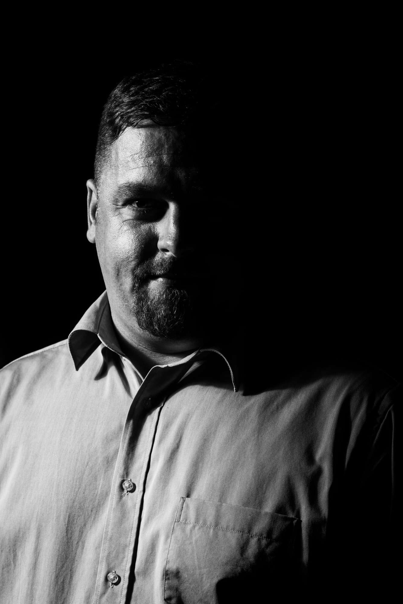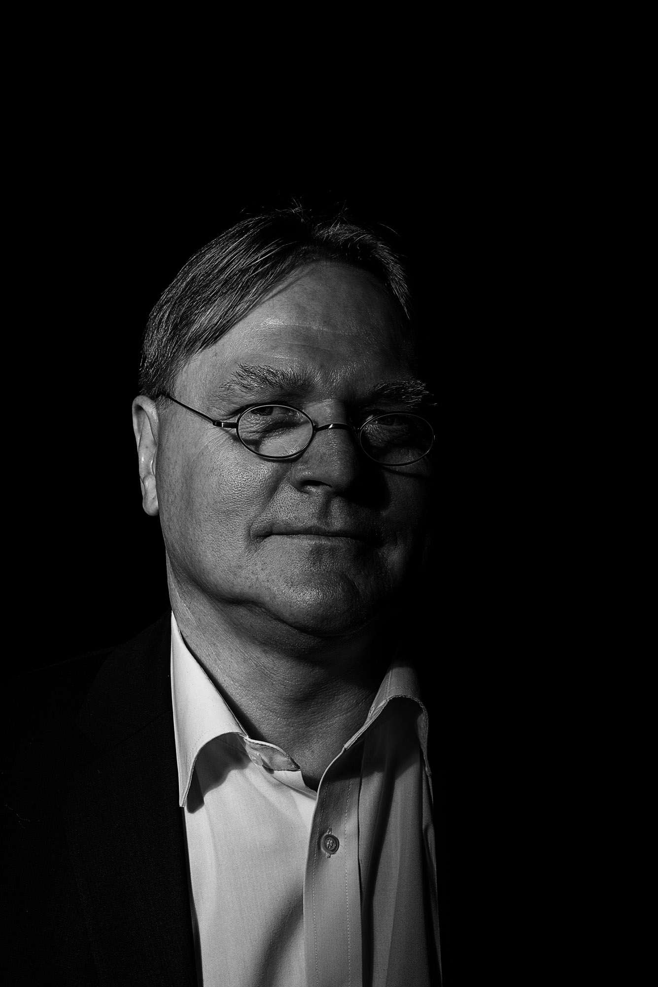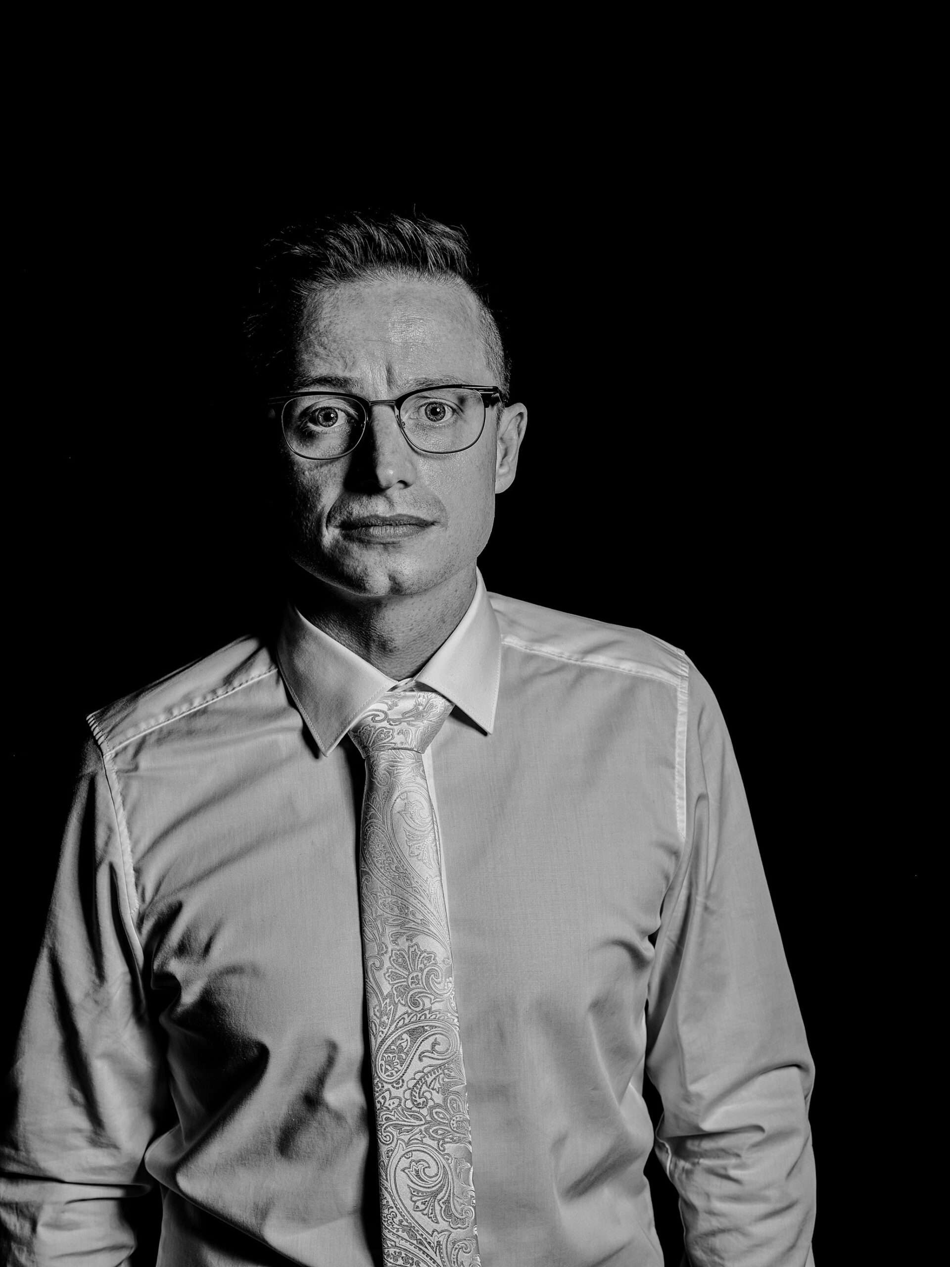 Schwarz-weiß Porträt eines Mannes mit Brille.