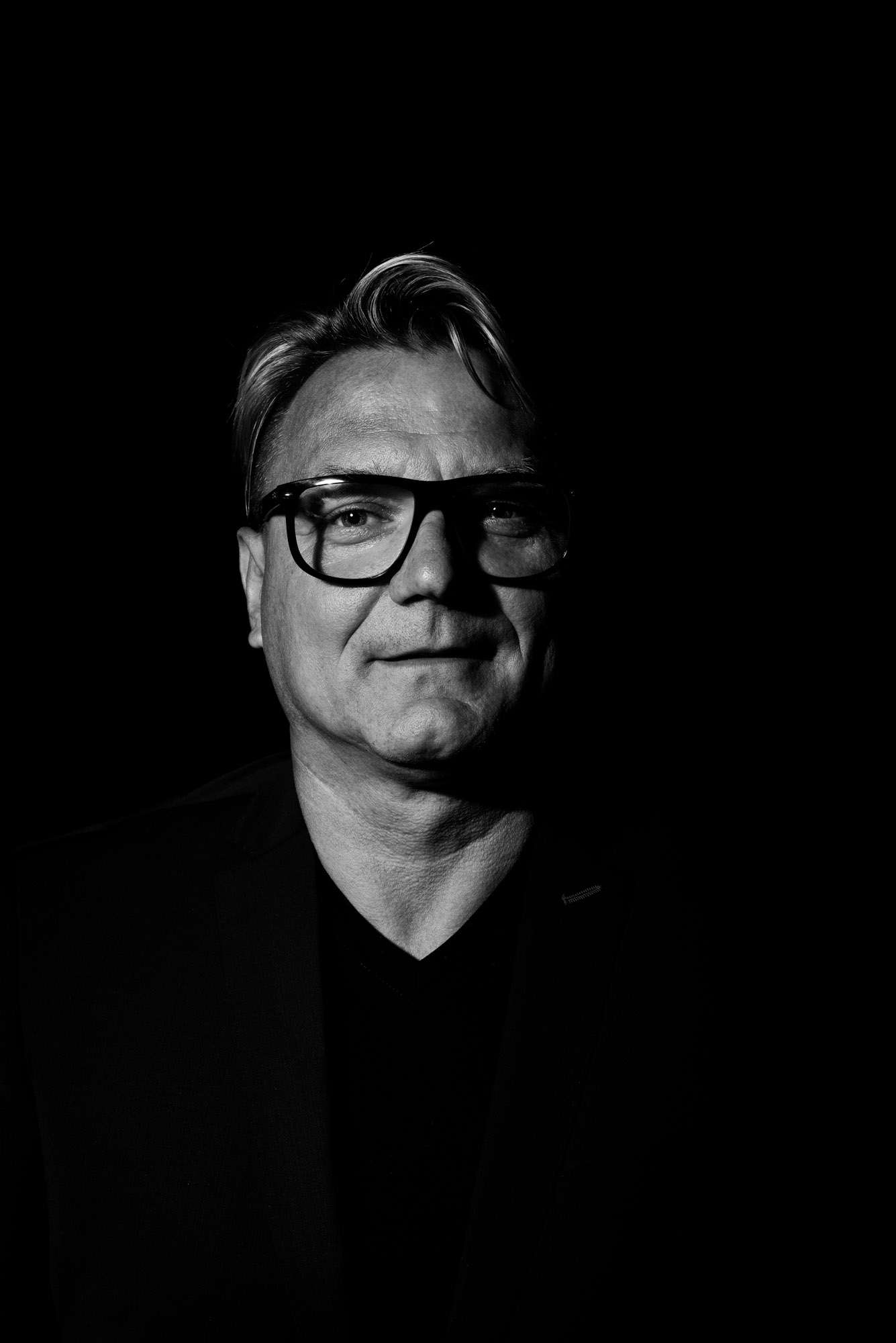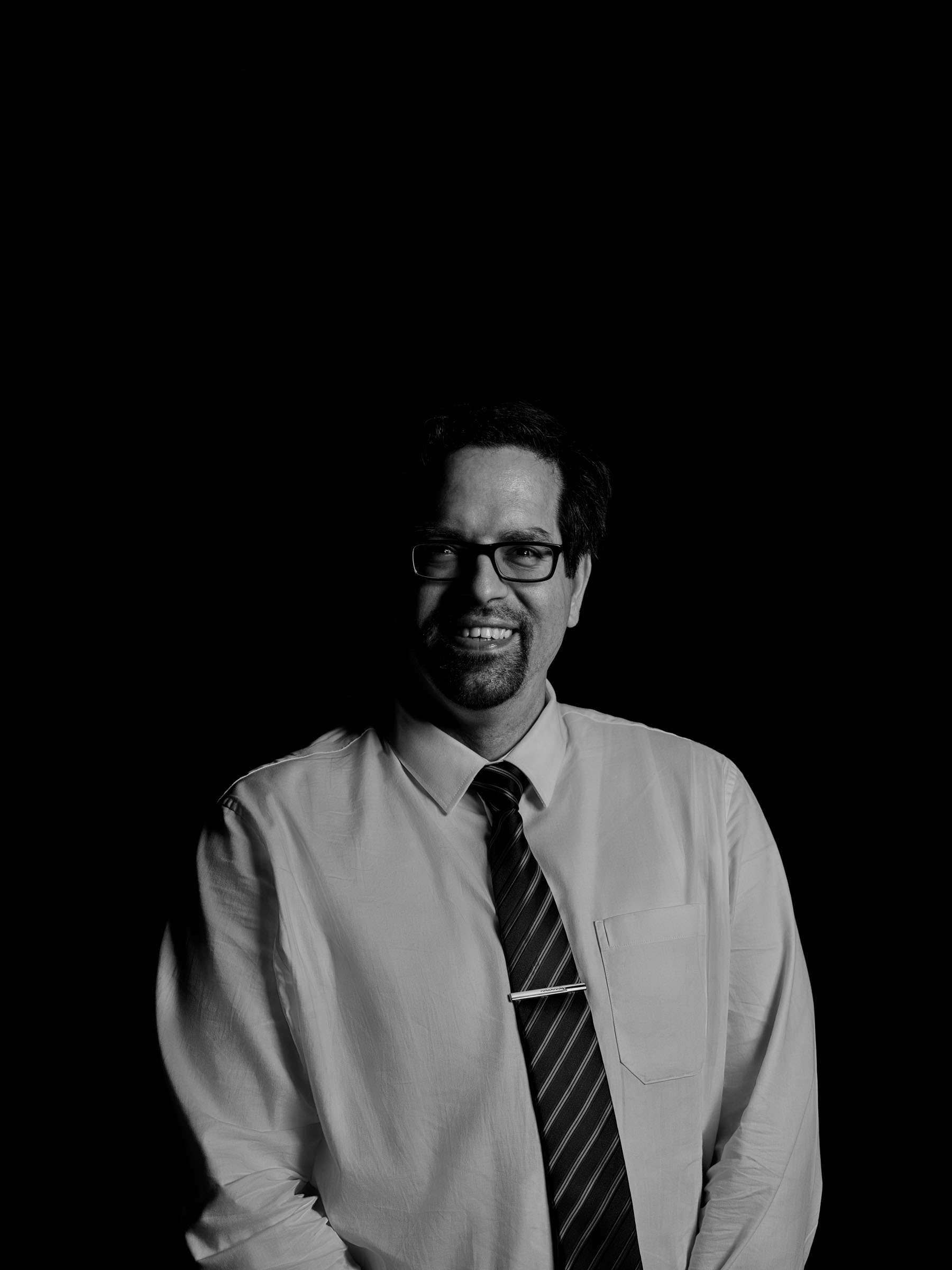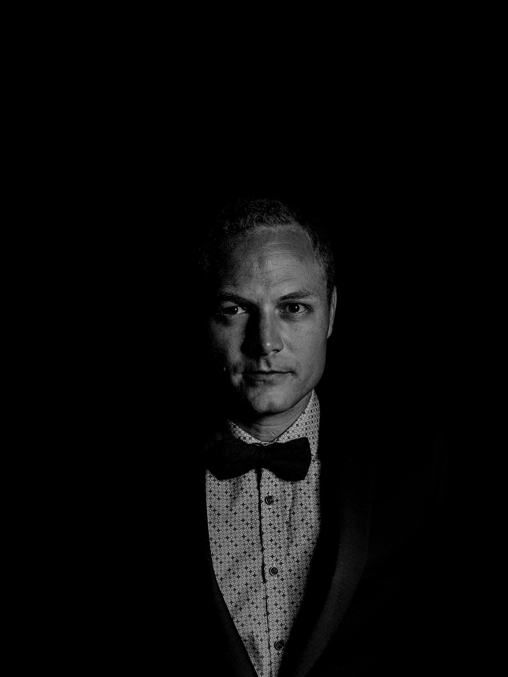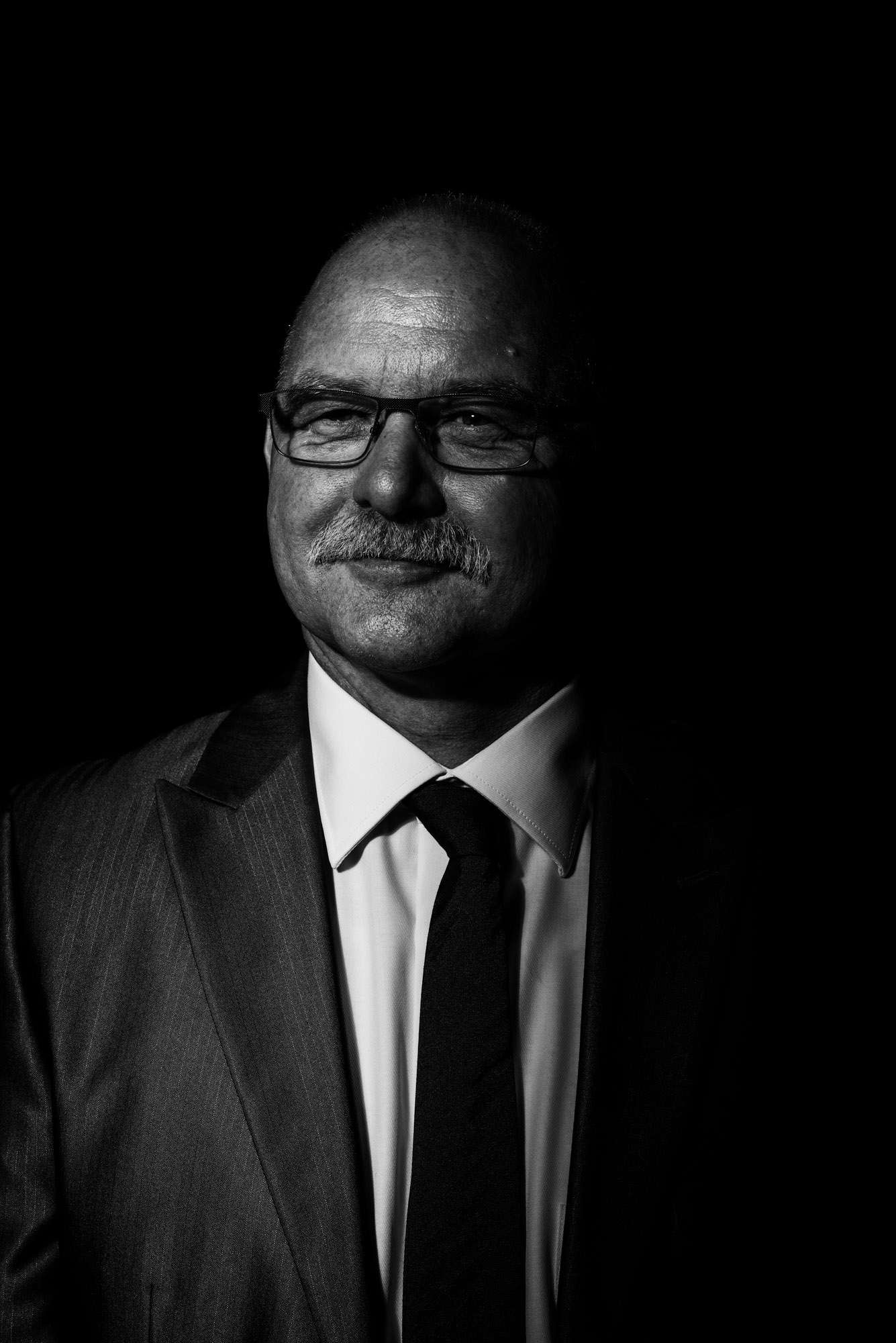 Schwarz-weiß Porträt eines Mannes mit Brille.