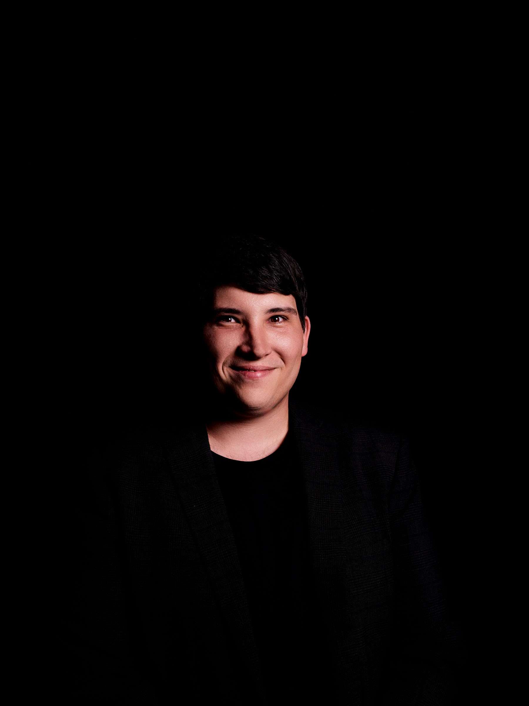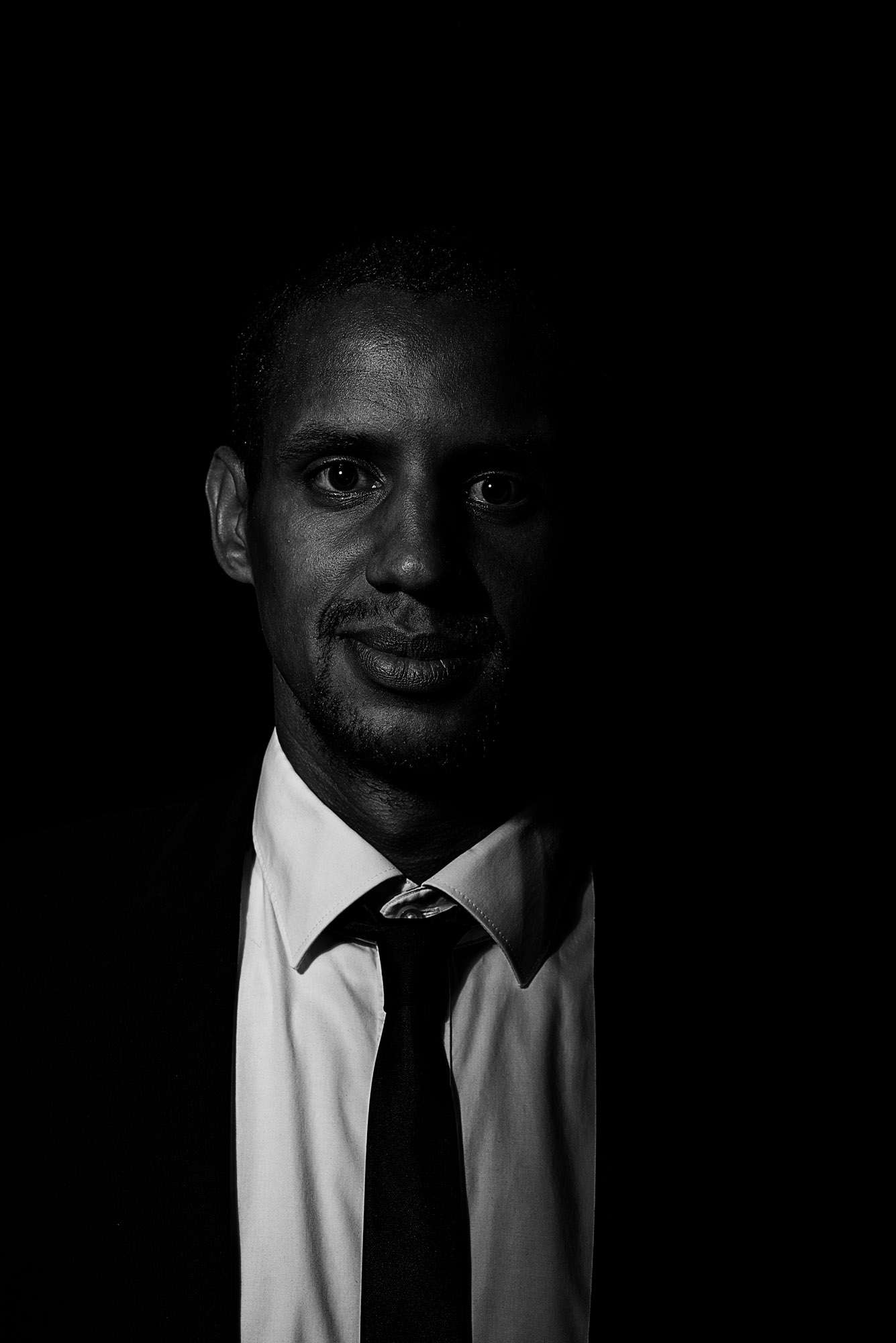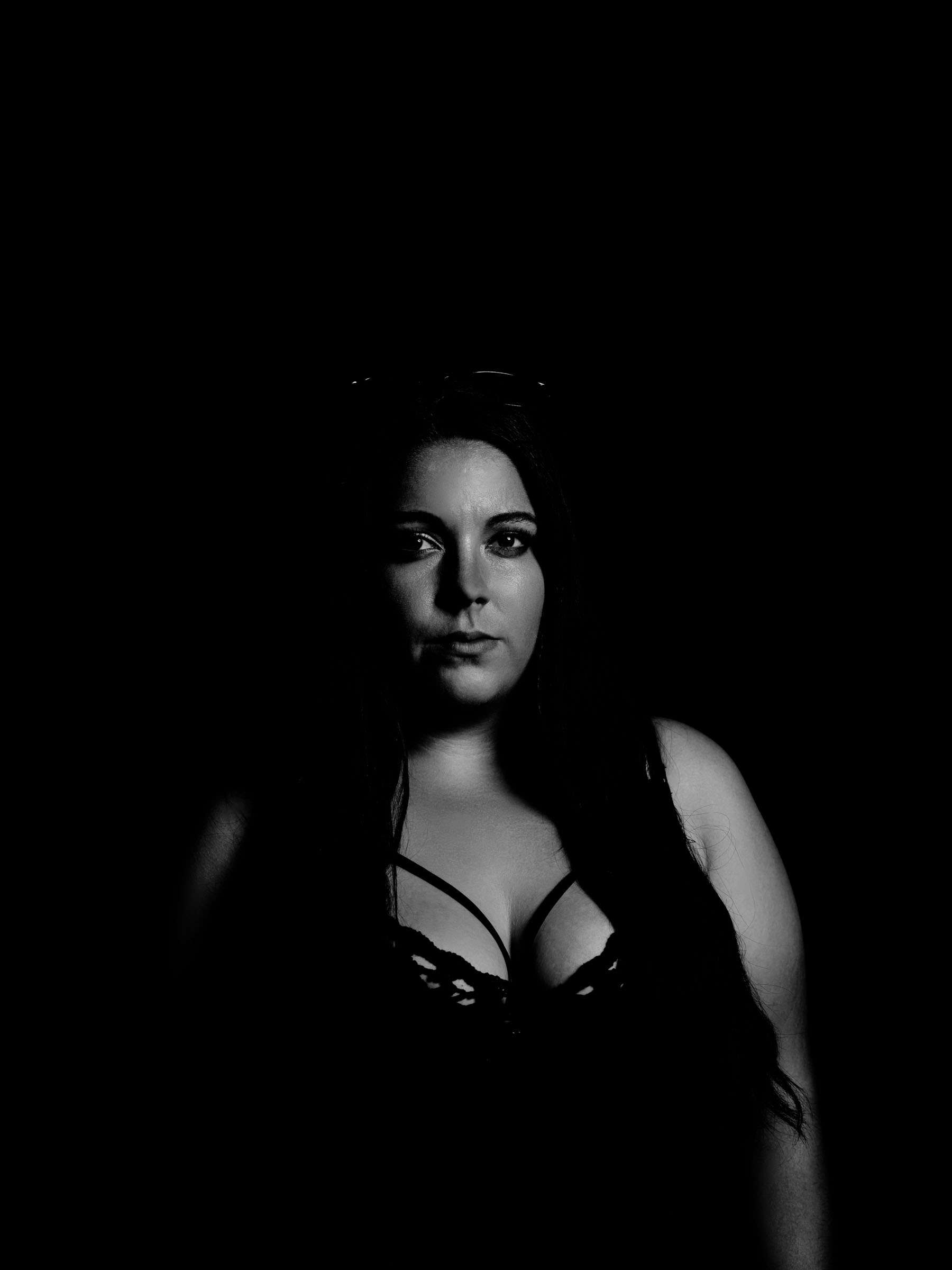 Person lächelt im Dunkeln, Schwarz-Weiß-Fotografie.
