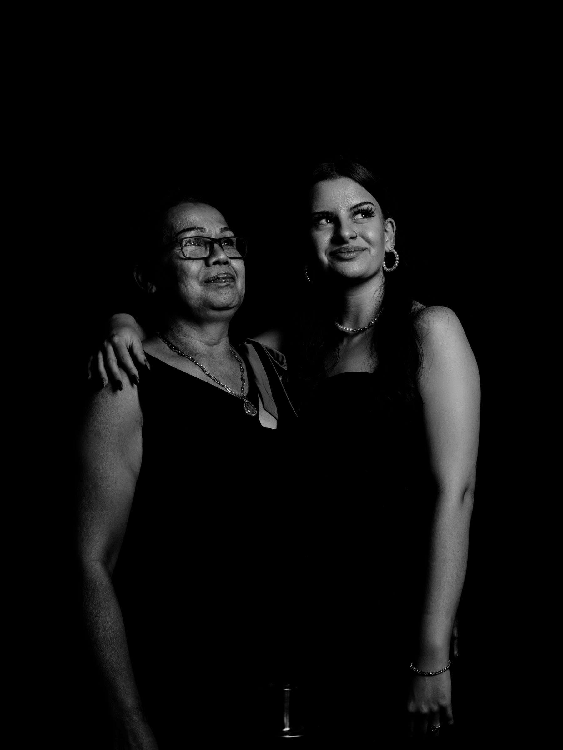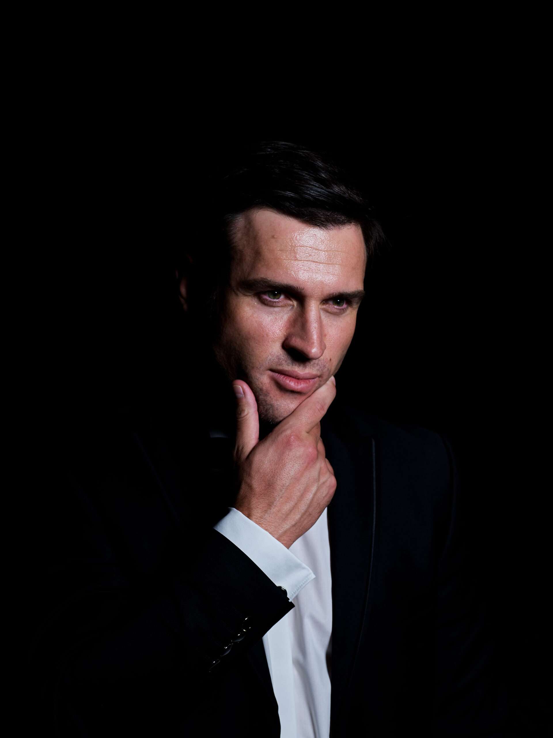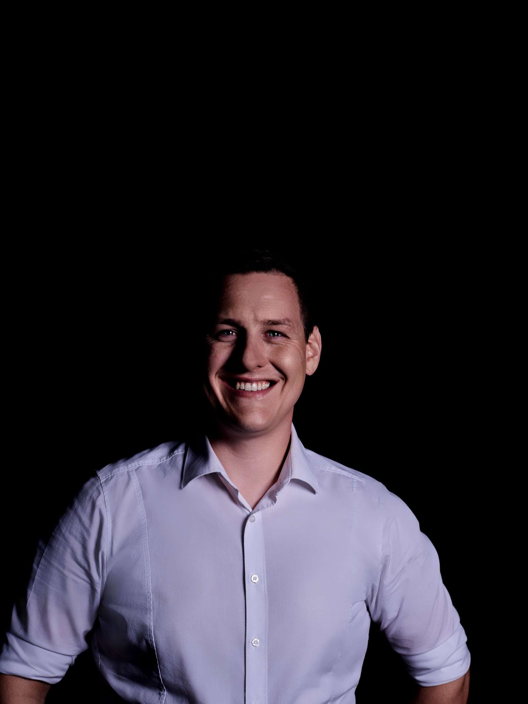 Person lächelt im Dunkeln, Schwarz-Weiß-Fotografie.