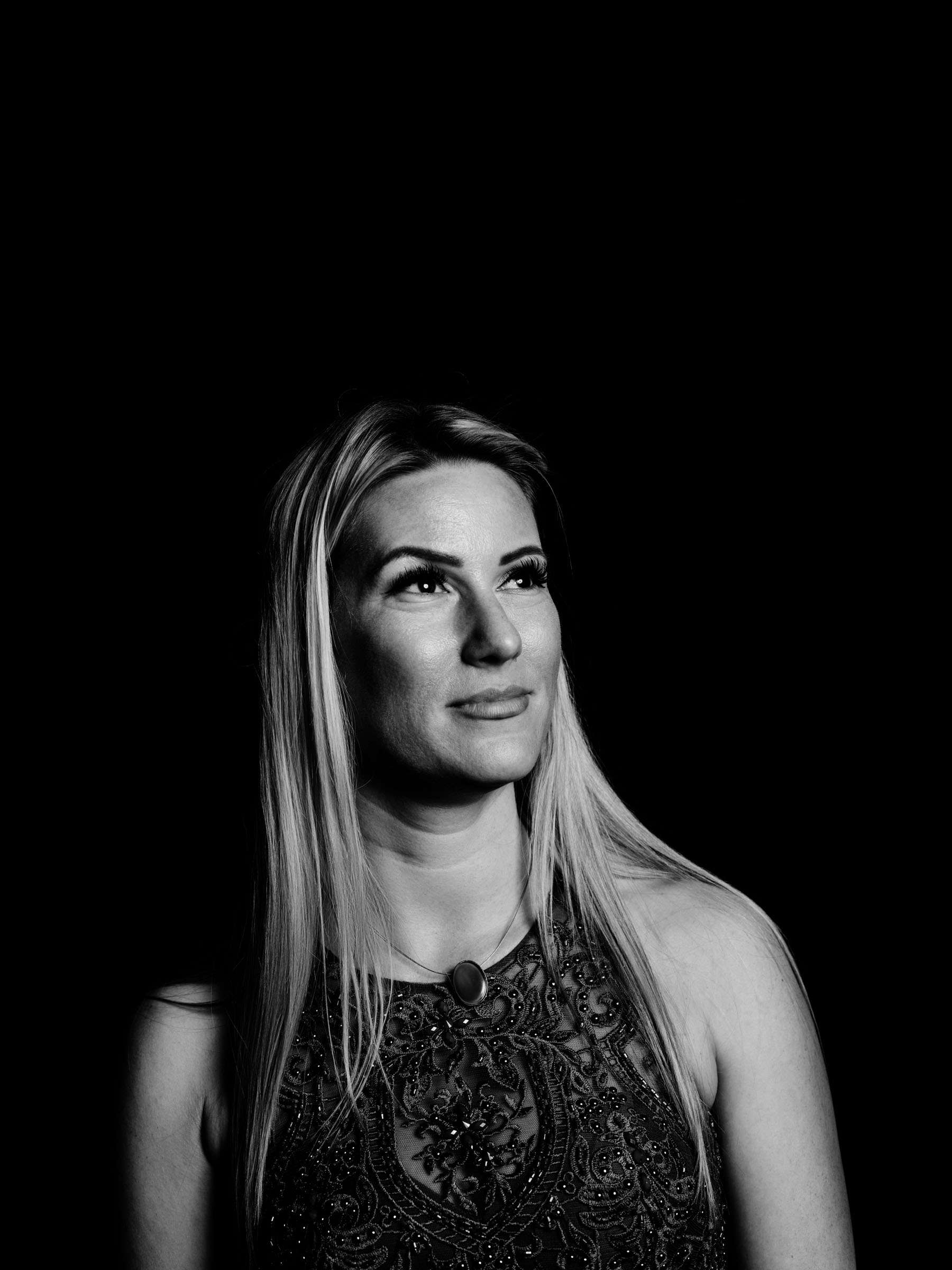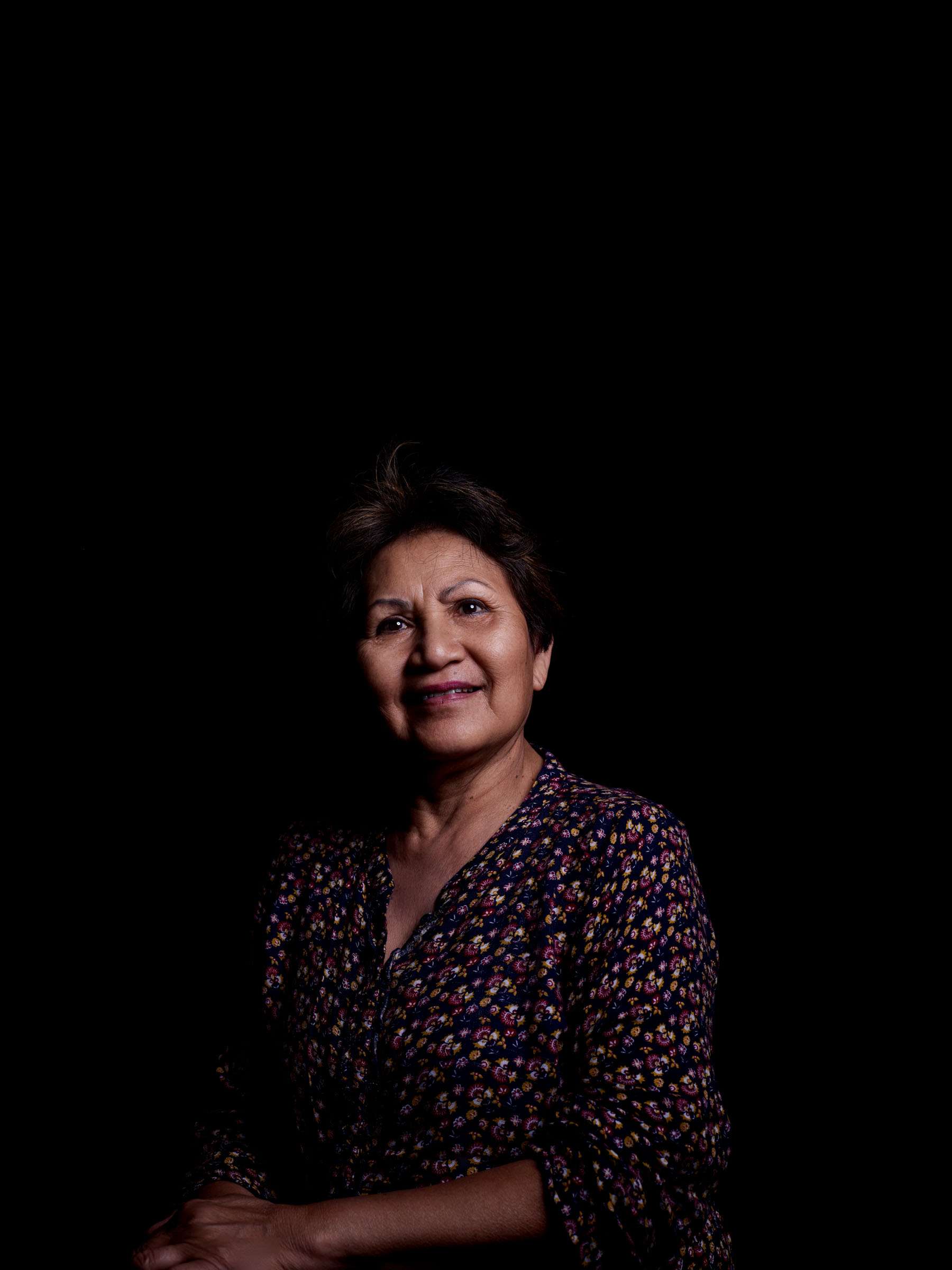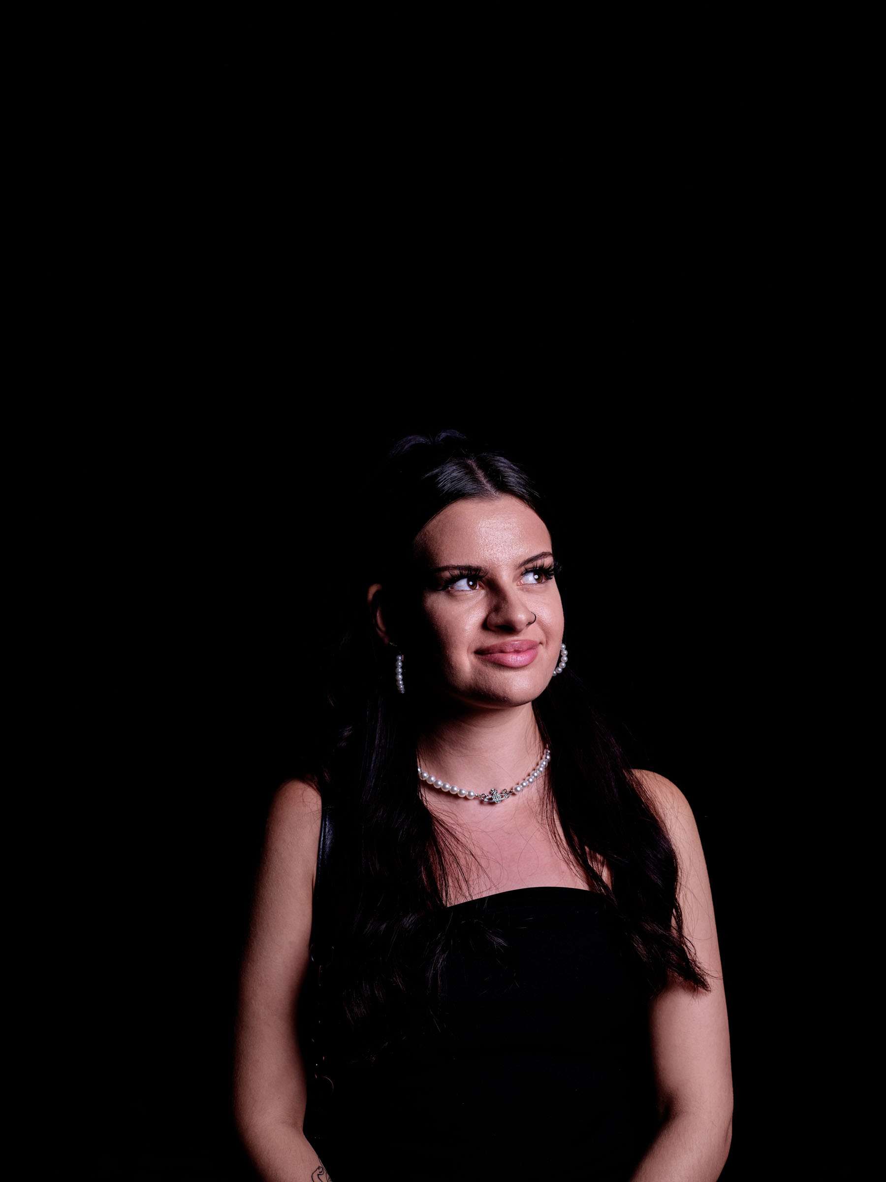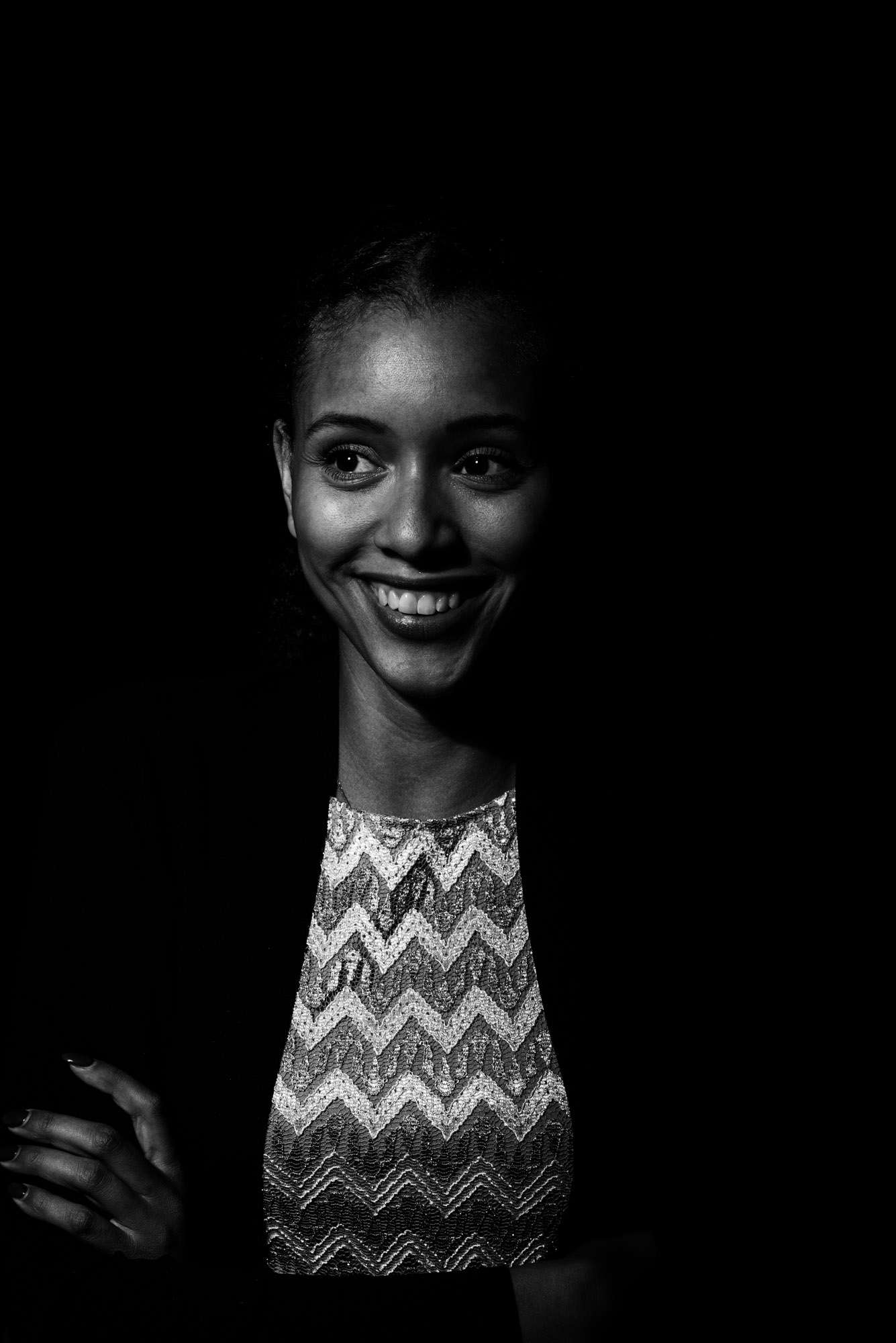 Porträt einer lächelnden Frau vor schwarzem Hintergrund.