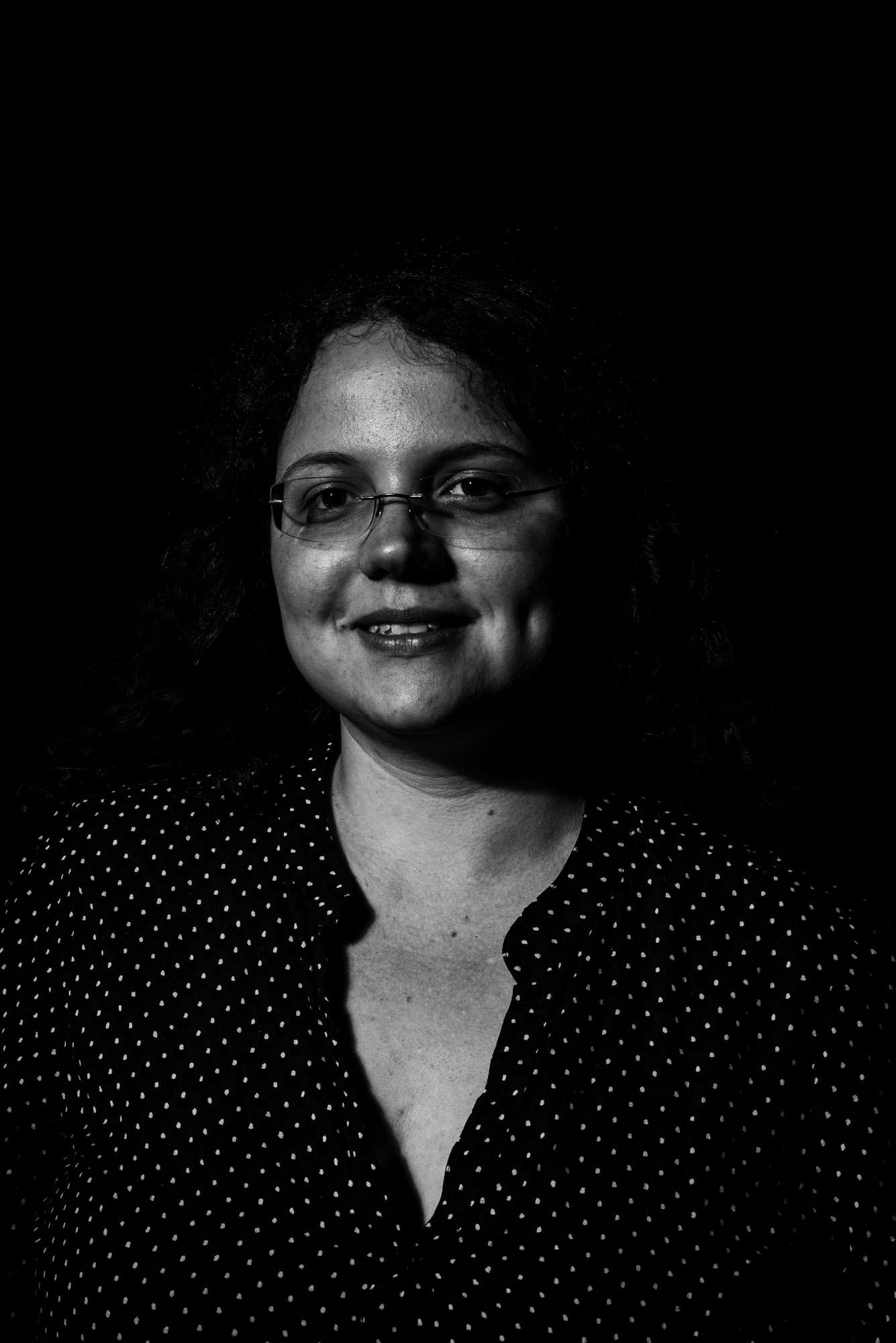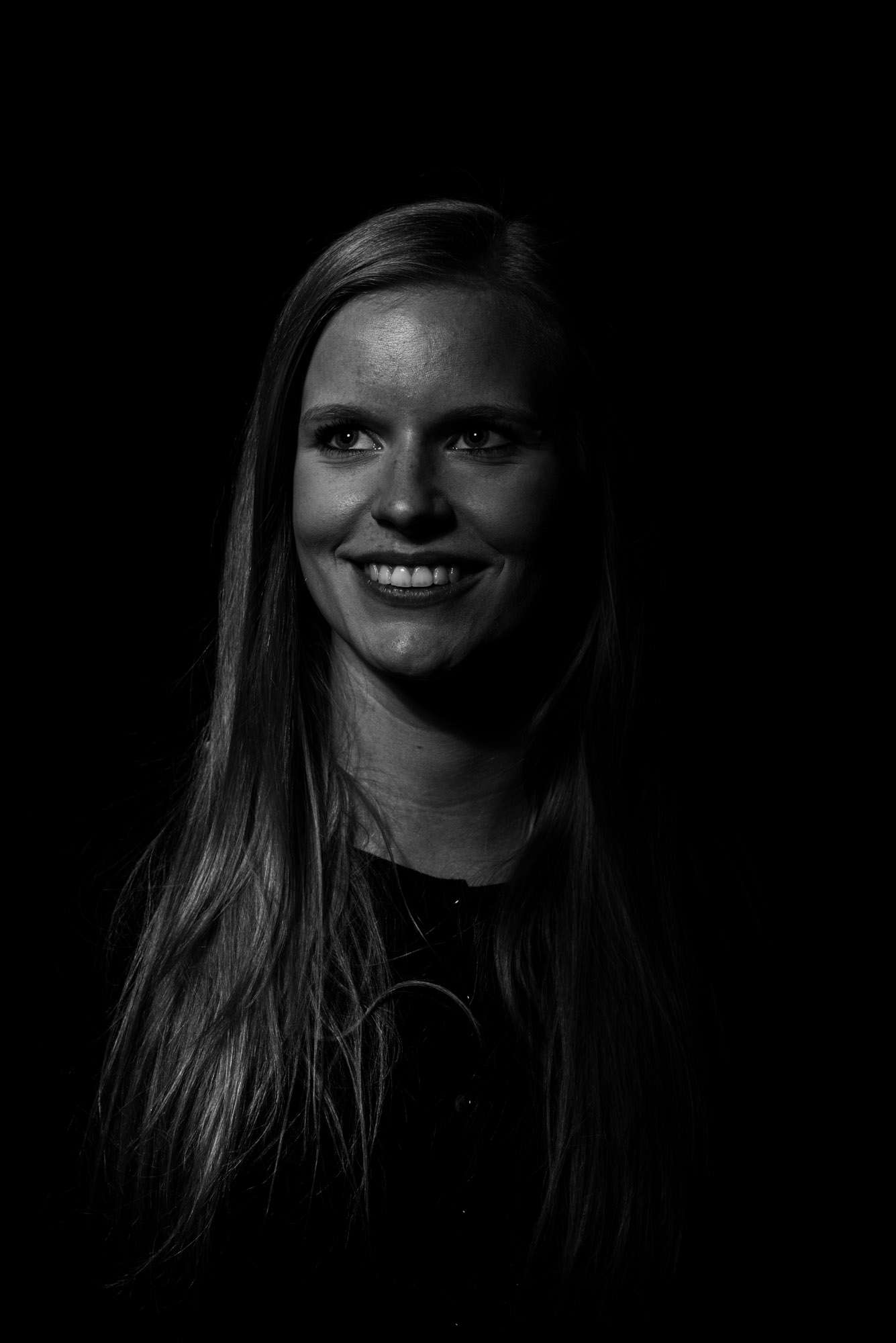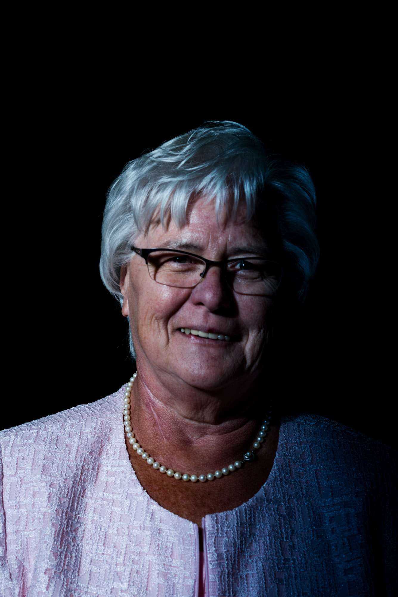 Porträt einer lächelnden Frau vor schwarzem Hintergrund.