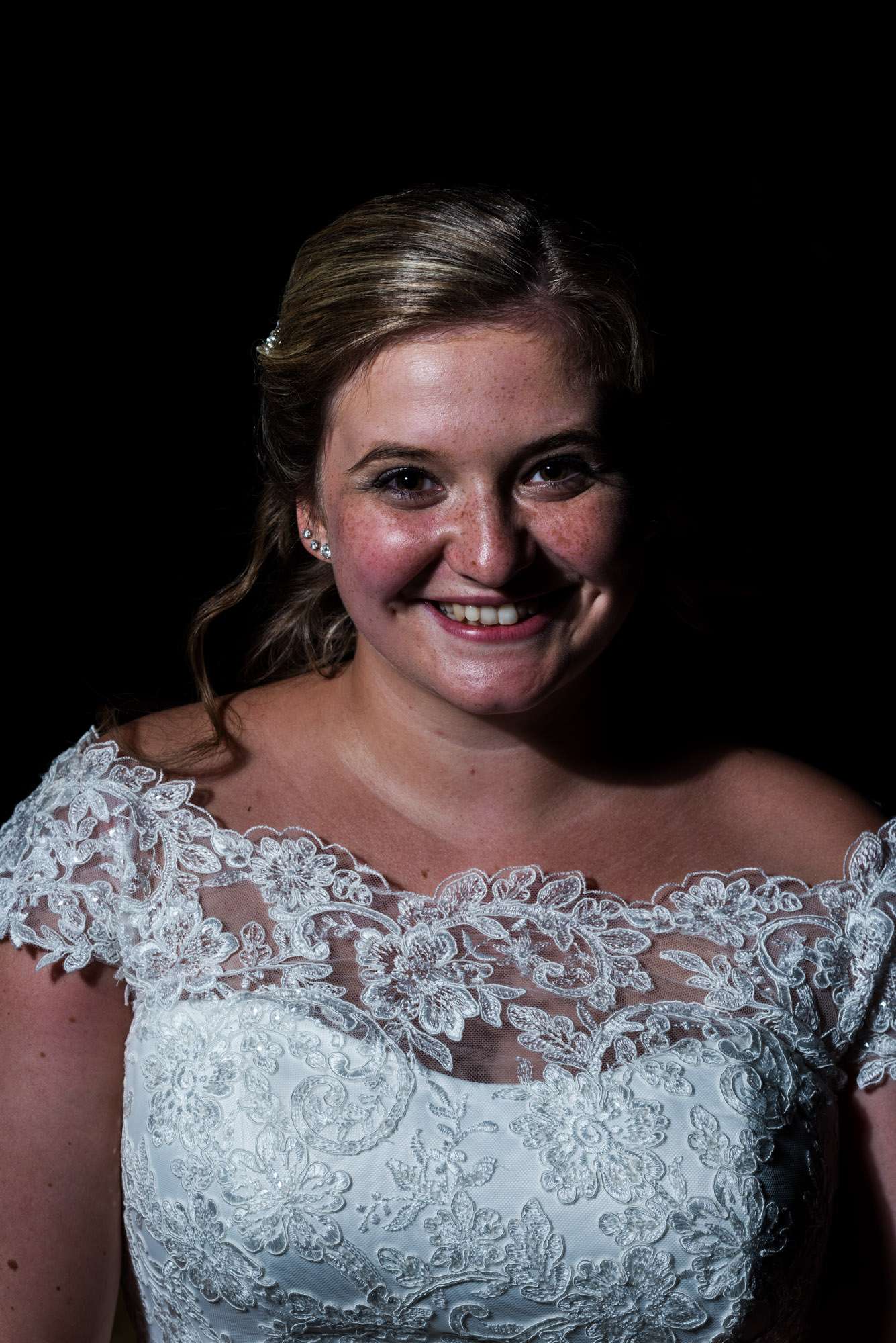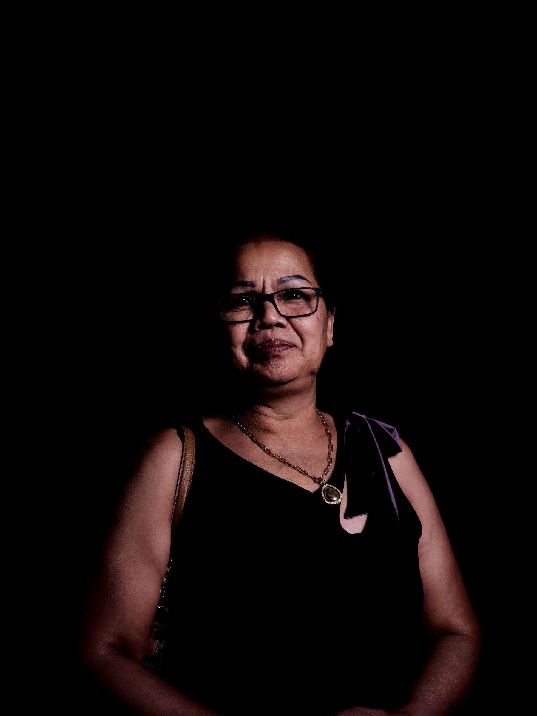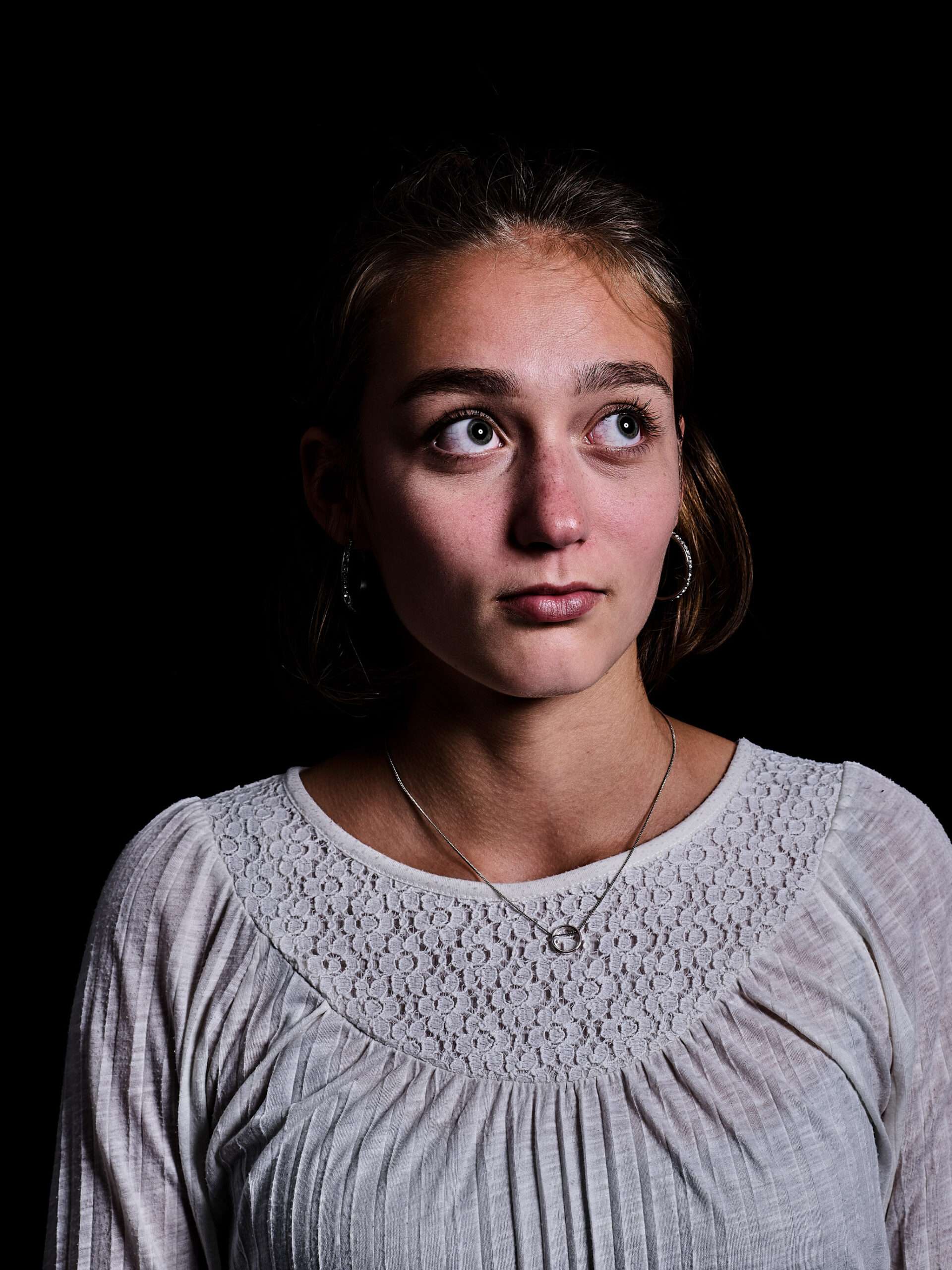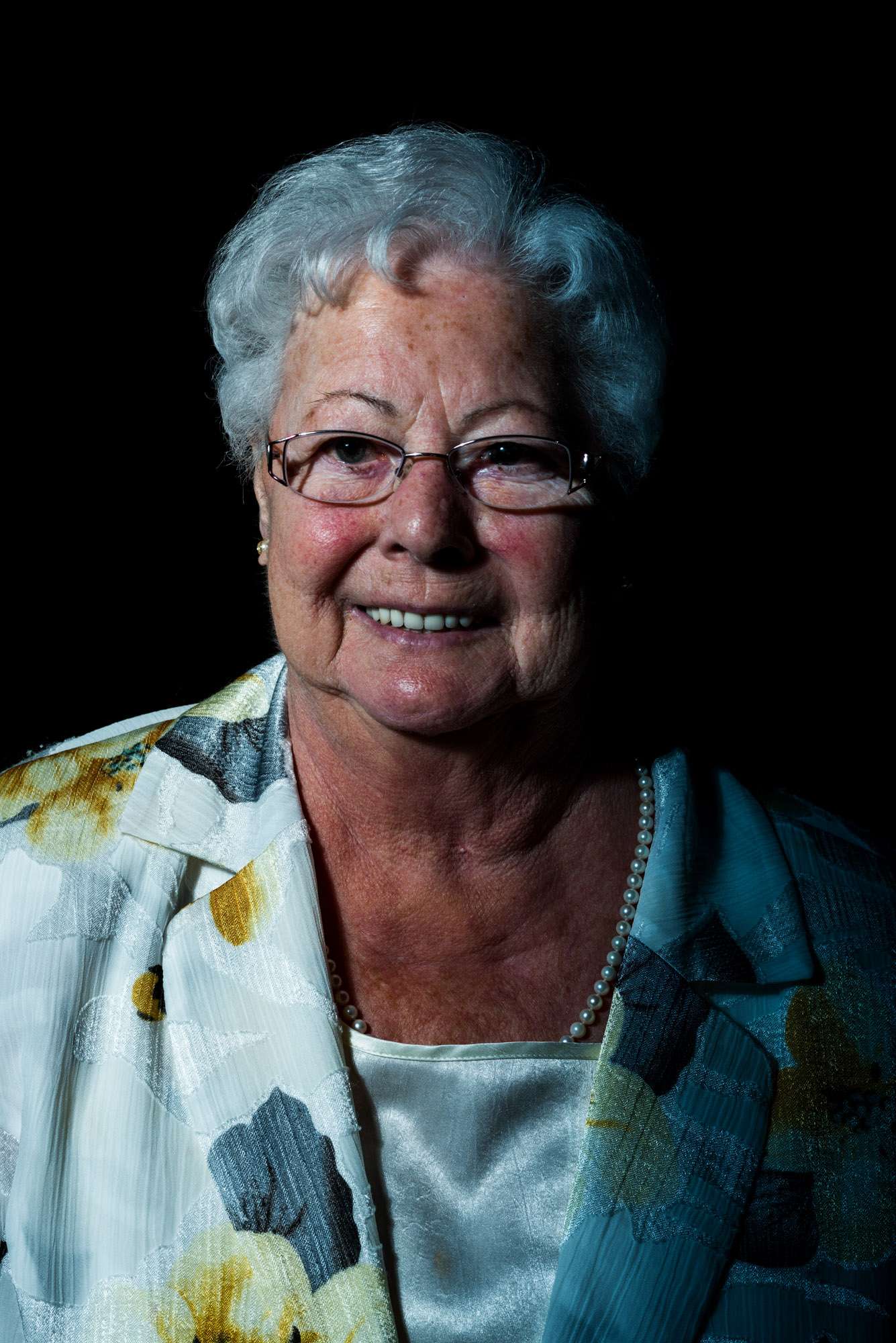 Porträt einer lächelnden Frau vor schwarzem Hintergrund.