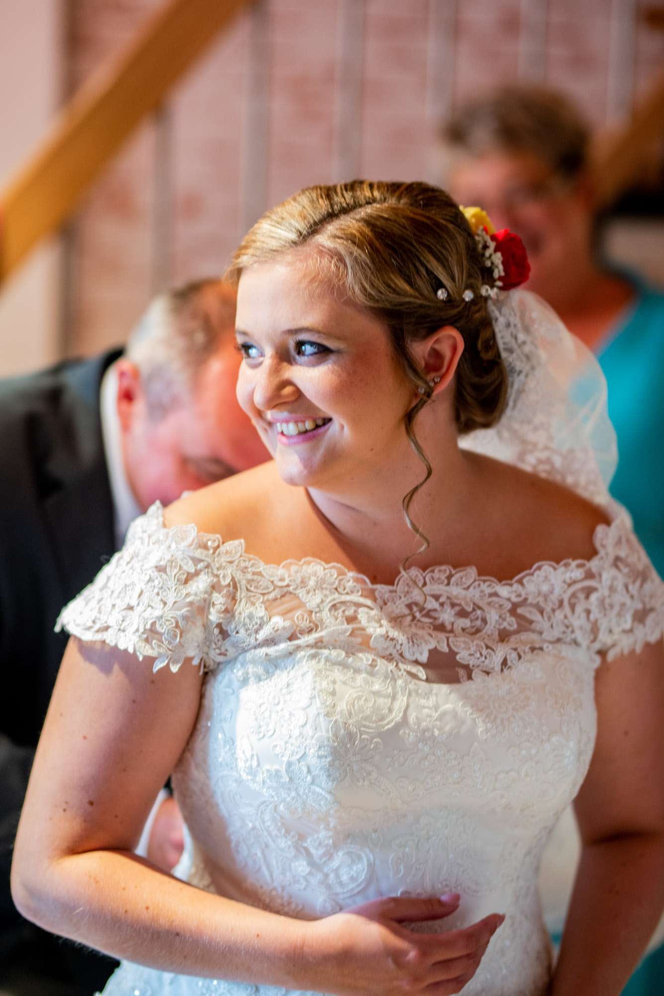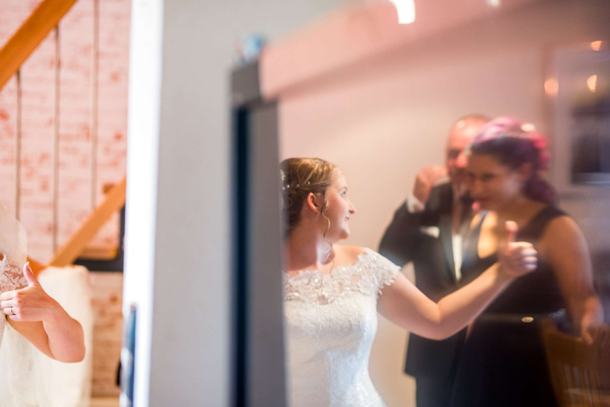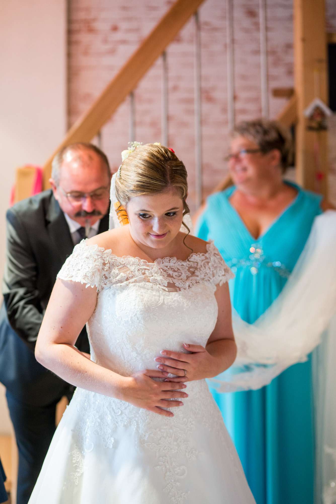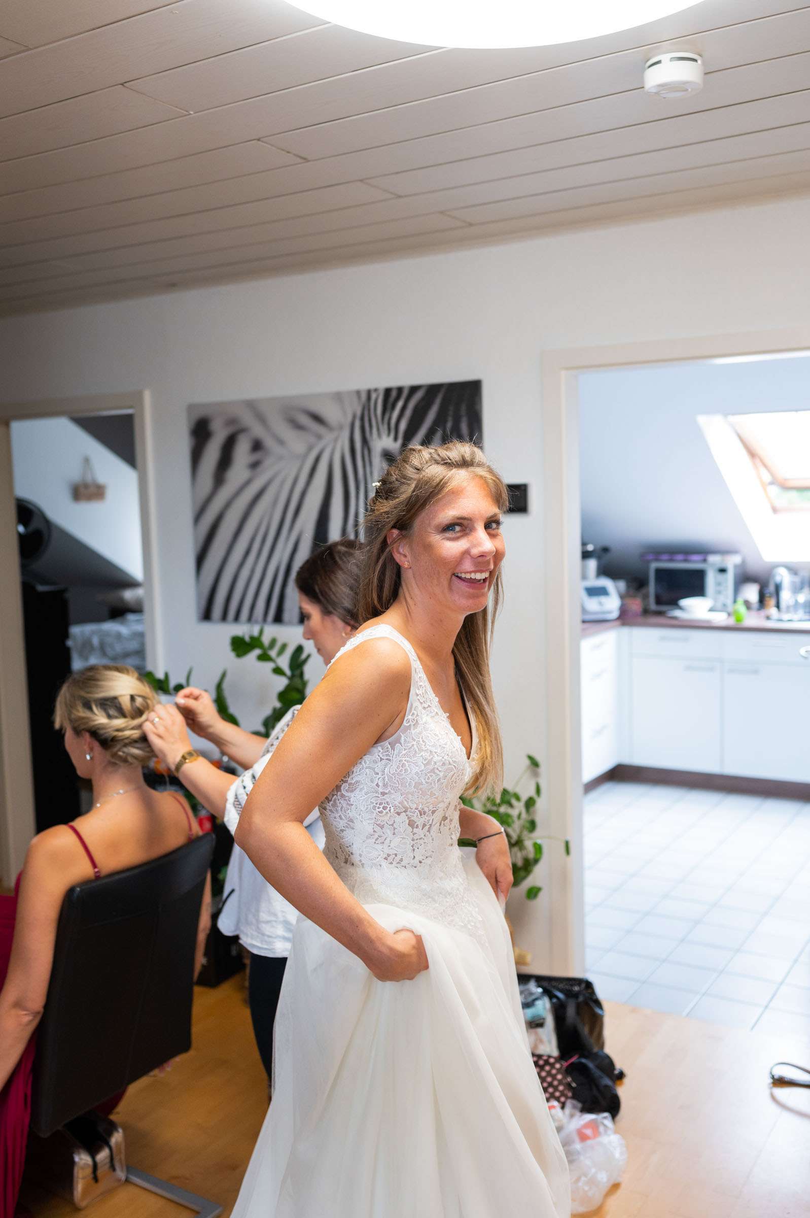 Braut lächelt beim Anziehen des Hochzeitskleides.