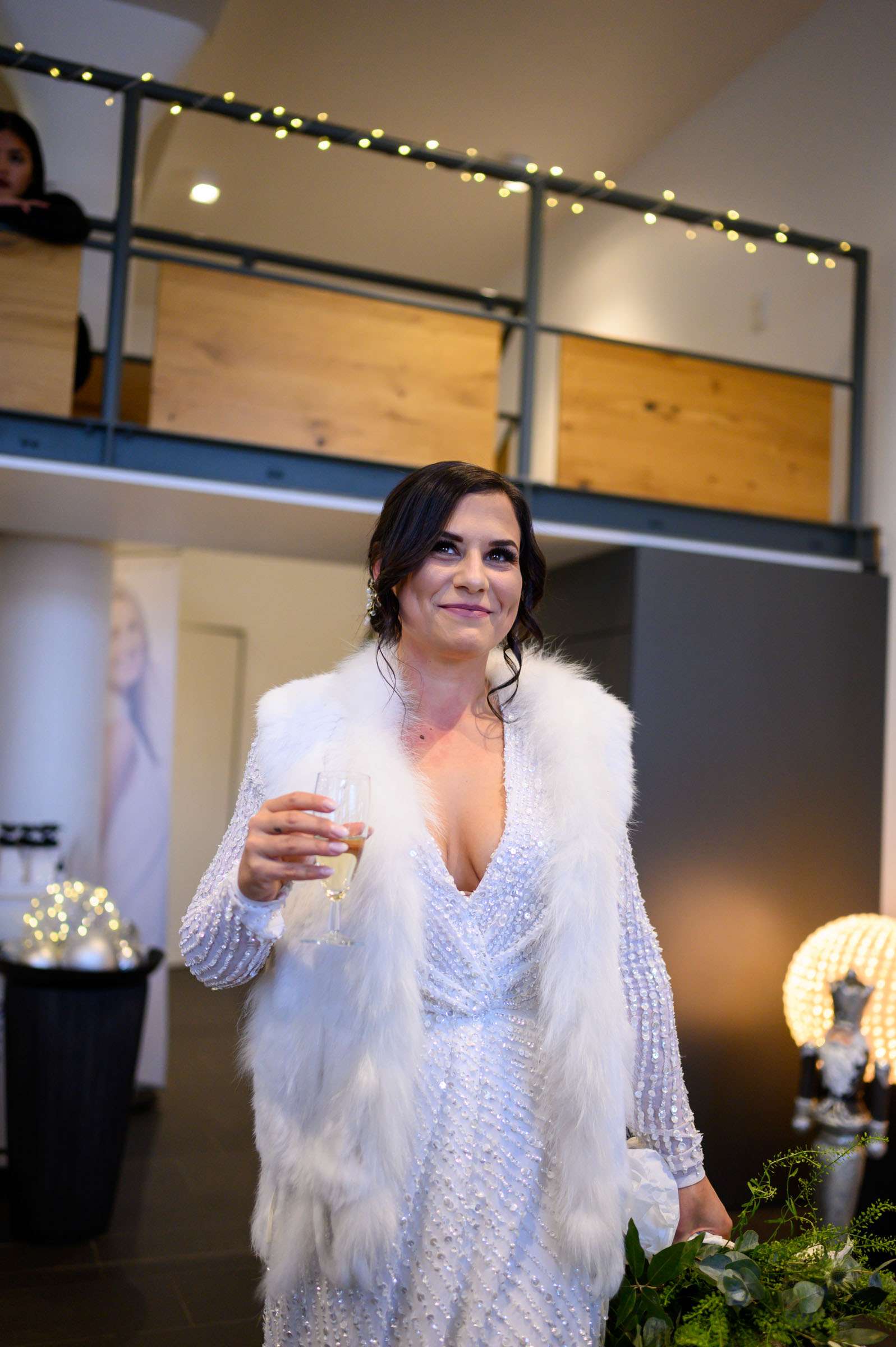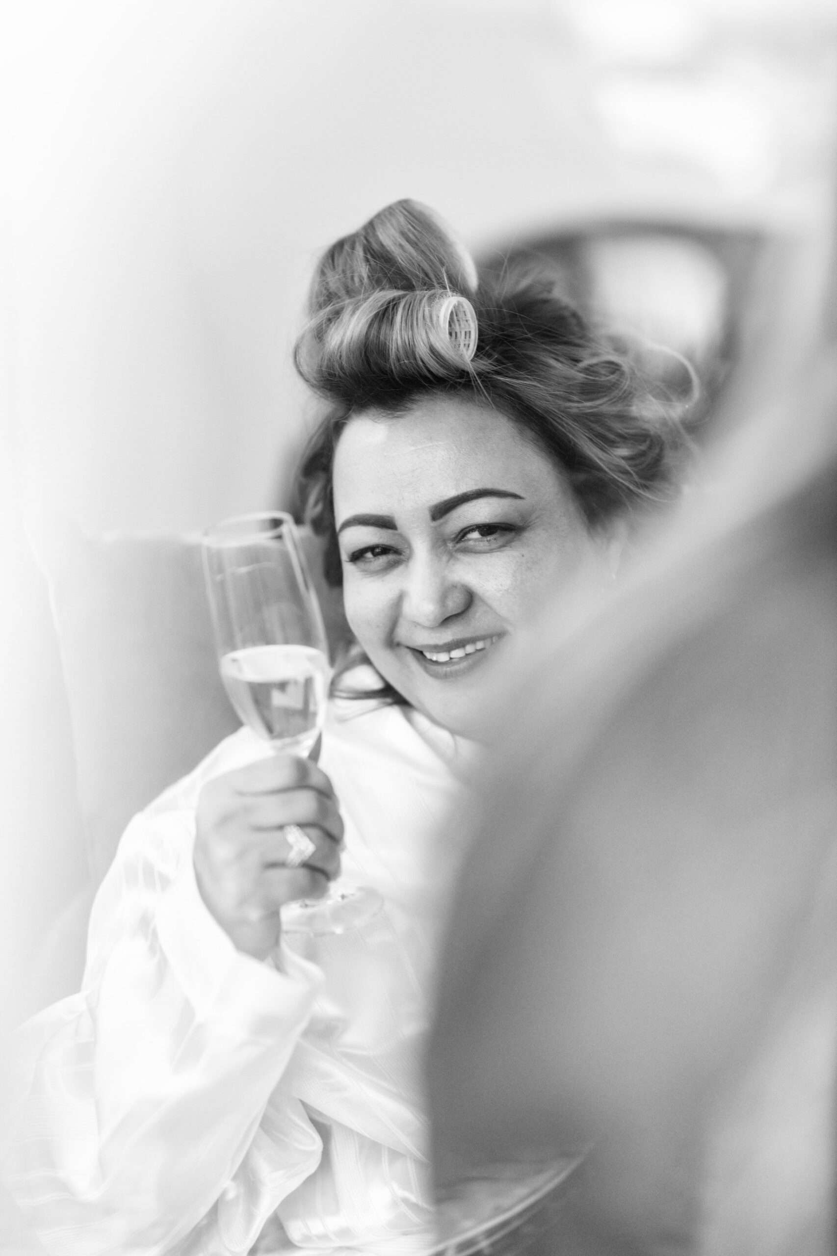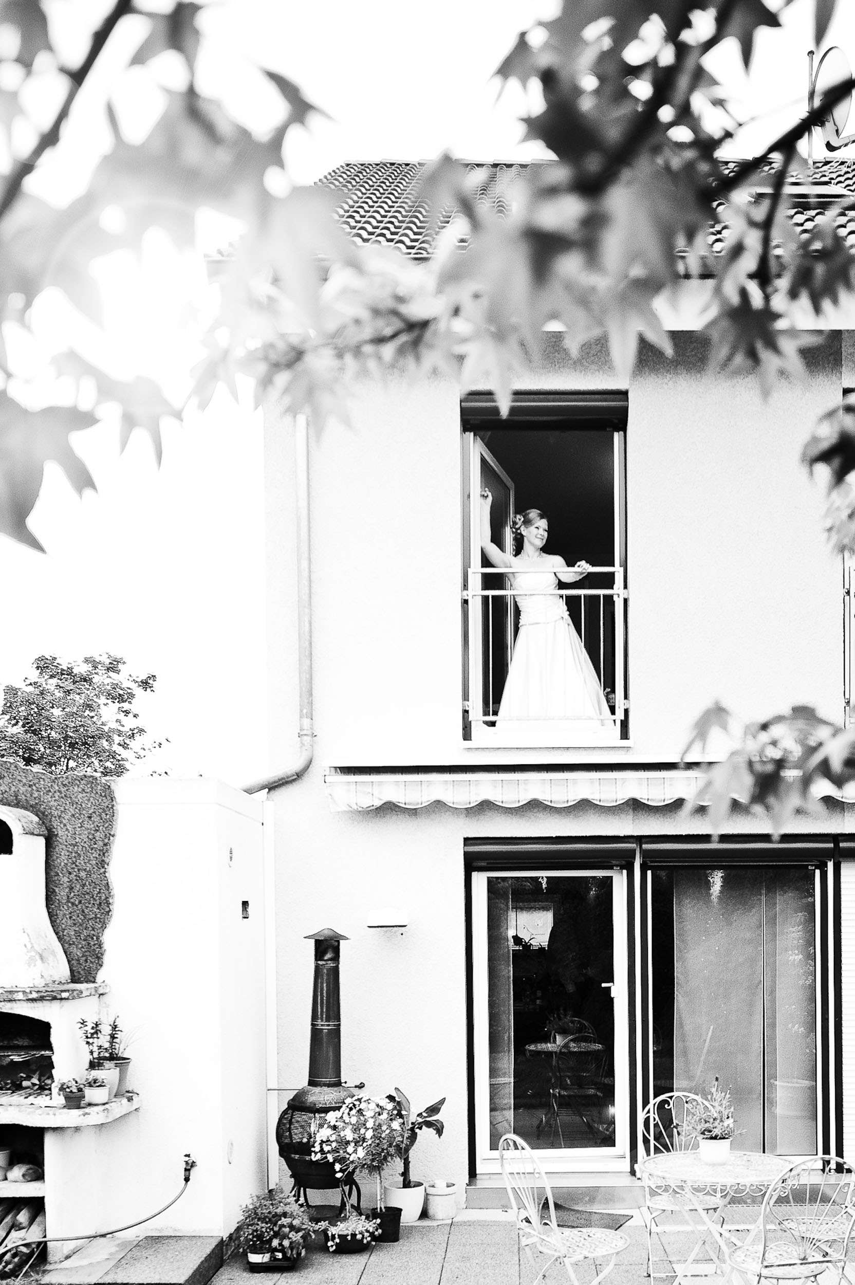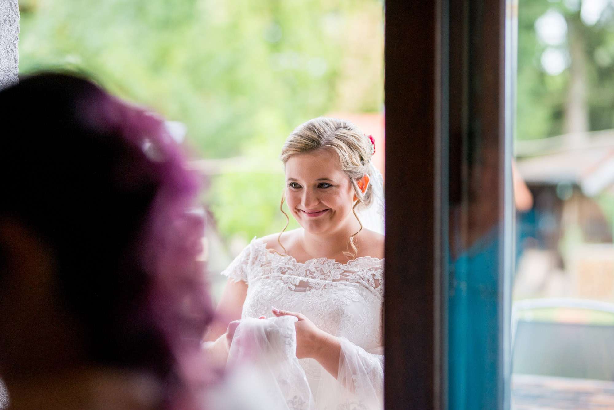 Braut lächelt aus Fenster in Weiß.