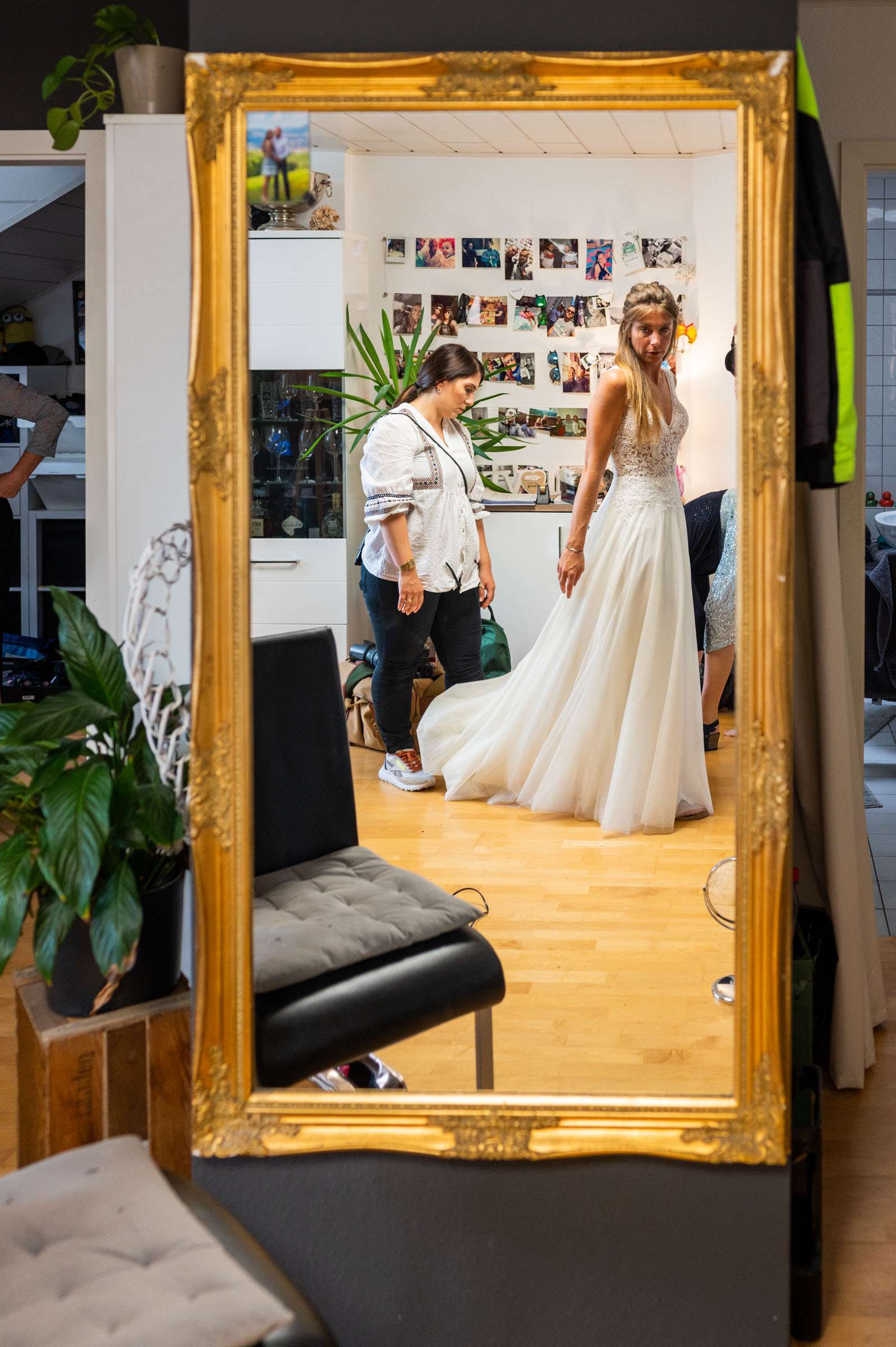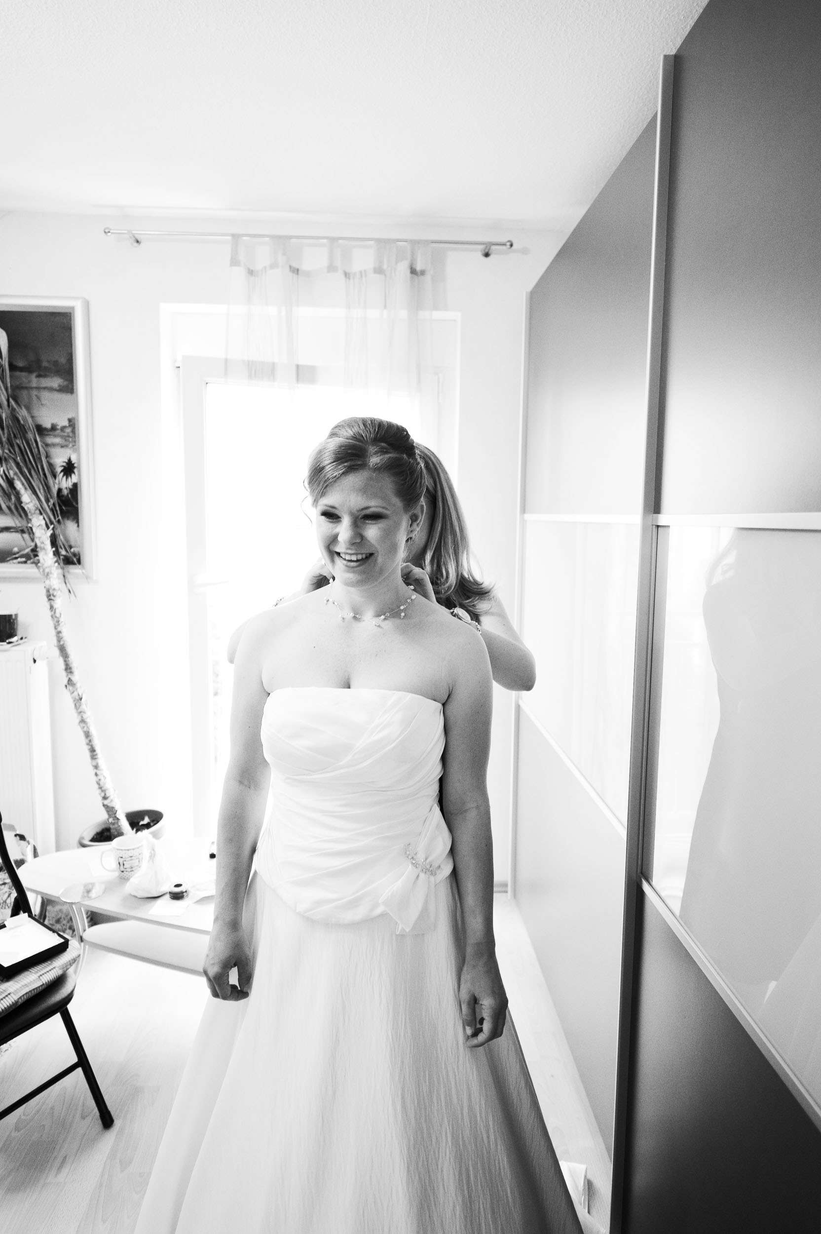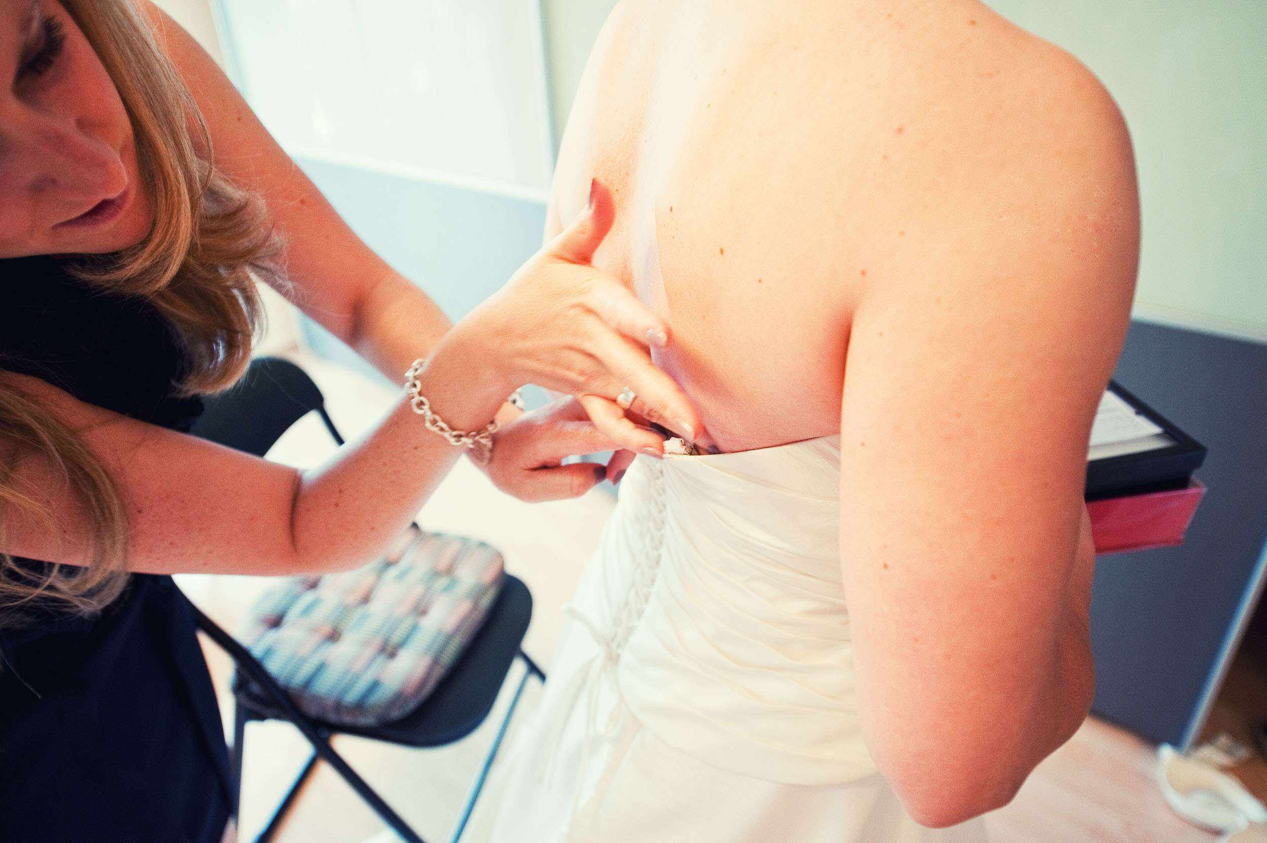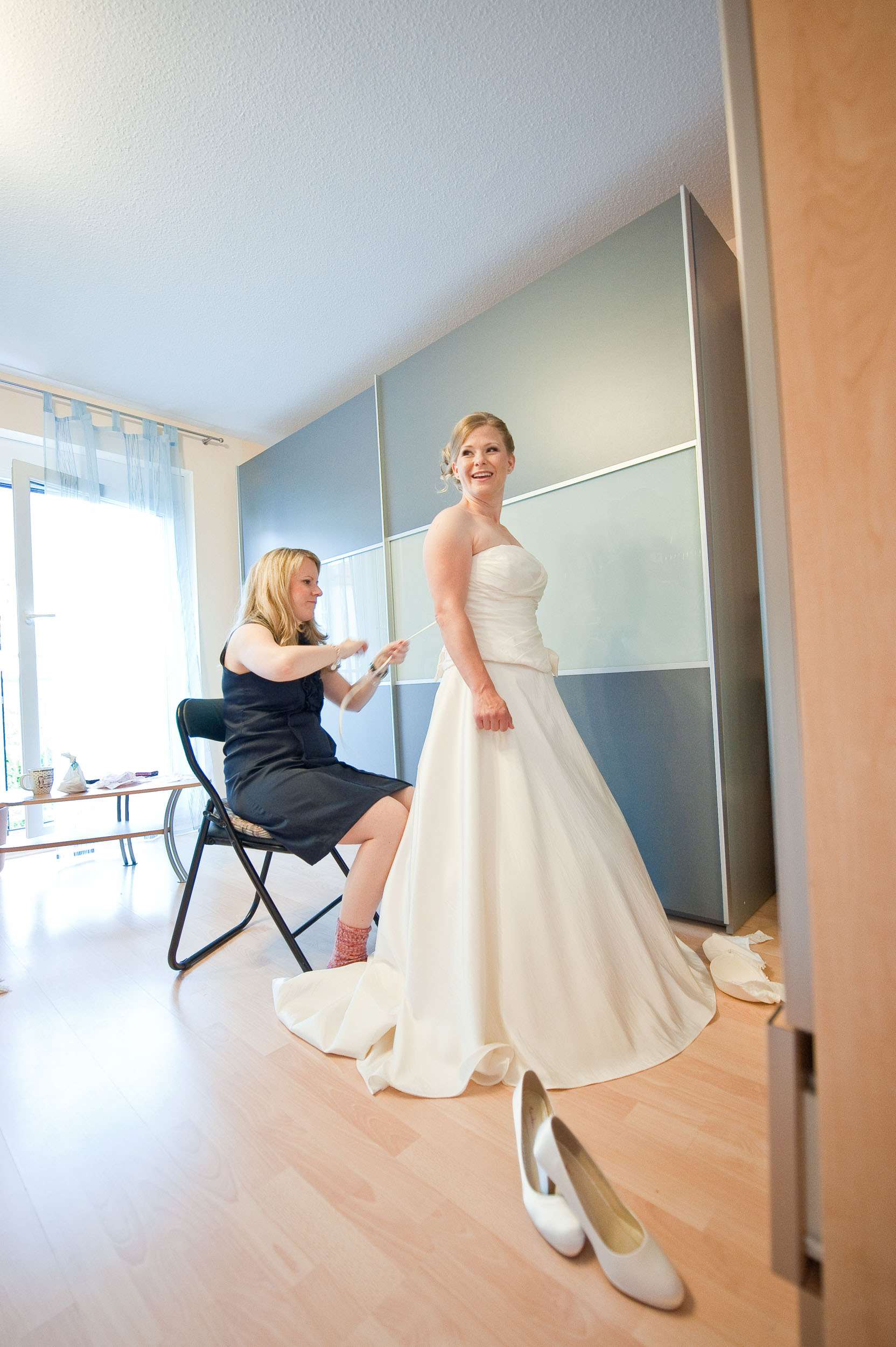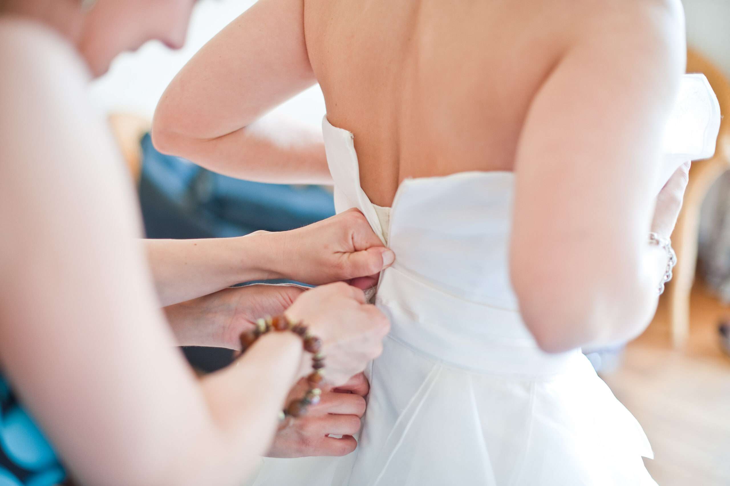 Braut wird von Freundin beim Ankleiden geholfen.