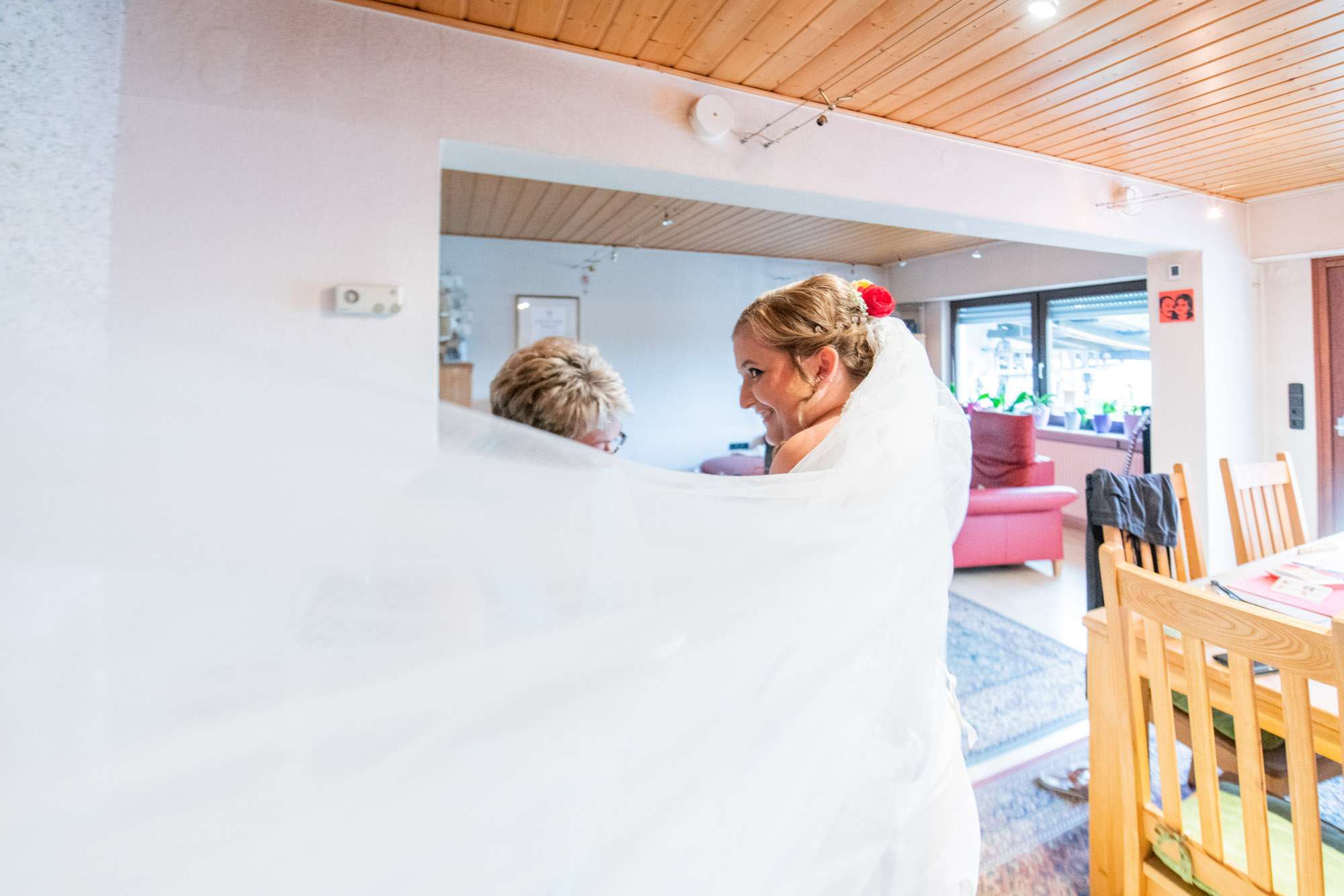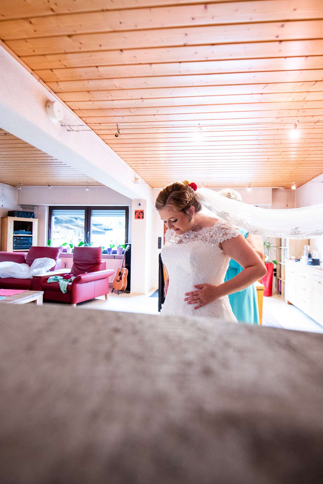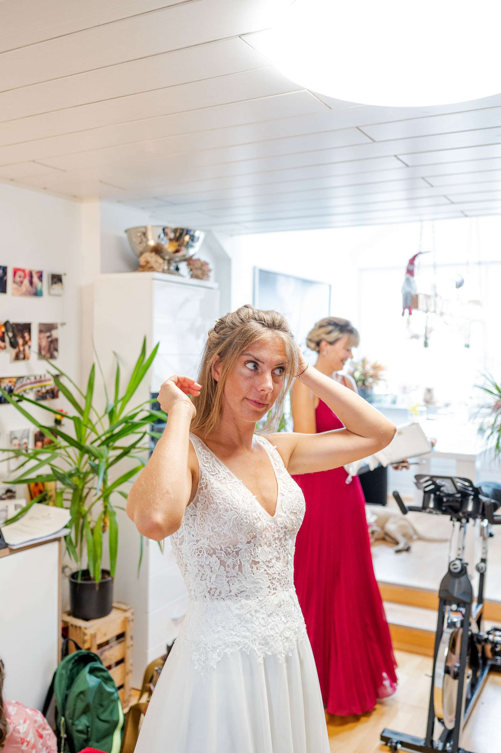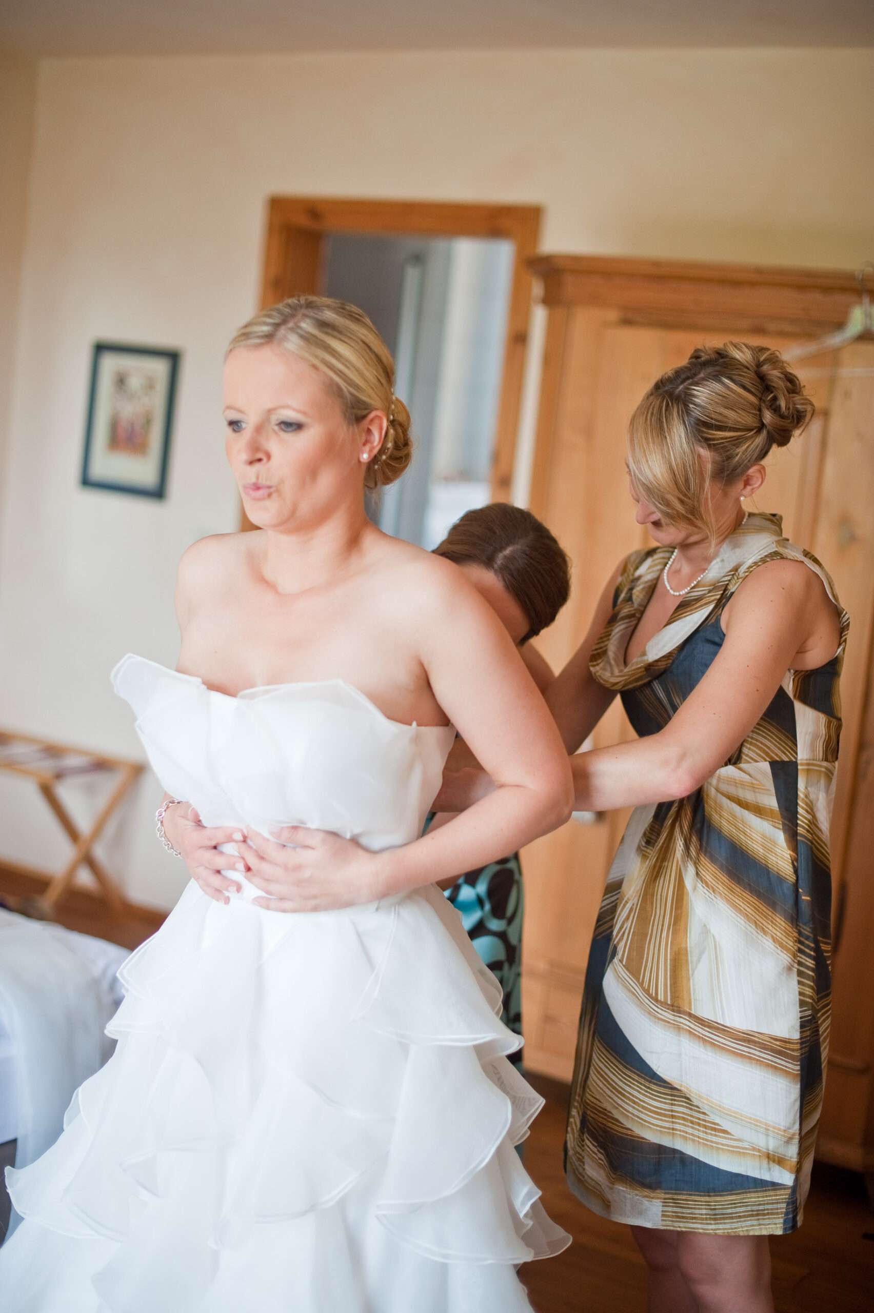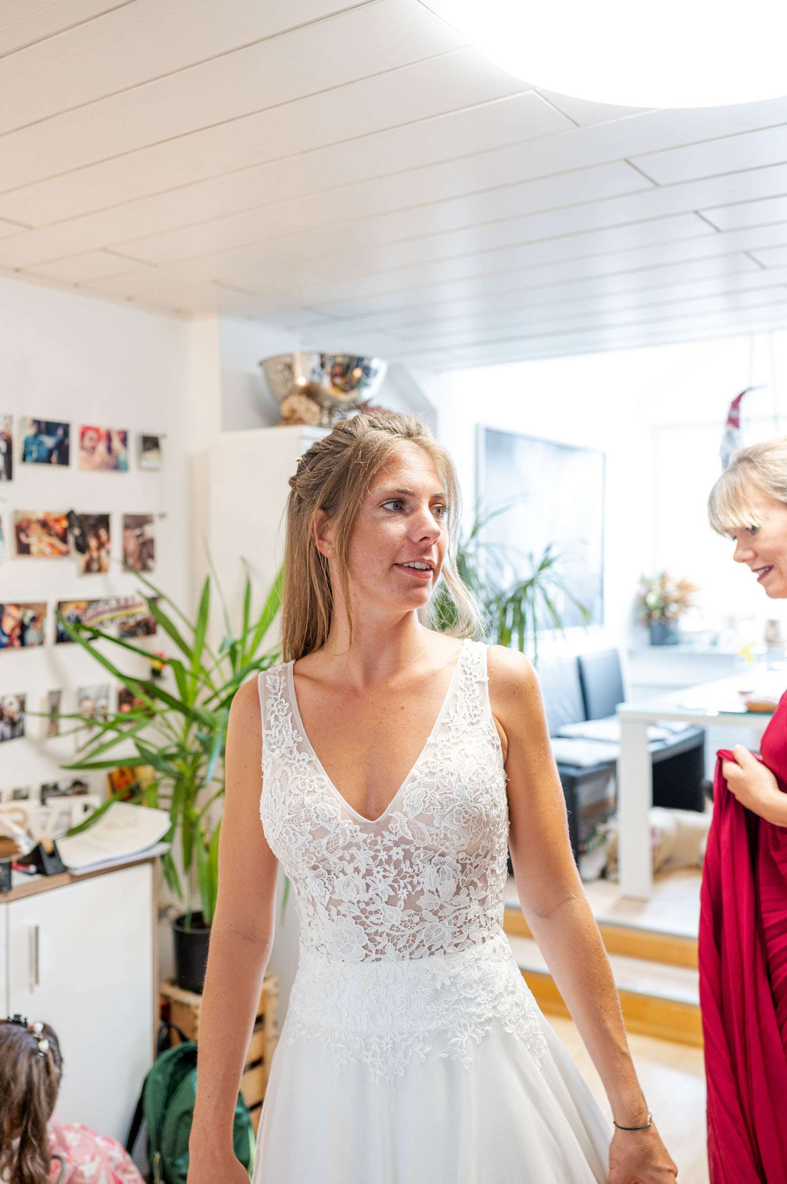 Braut wird von Freundin beim Ankleiden geholfen.