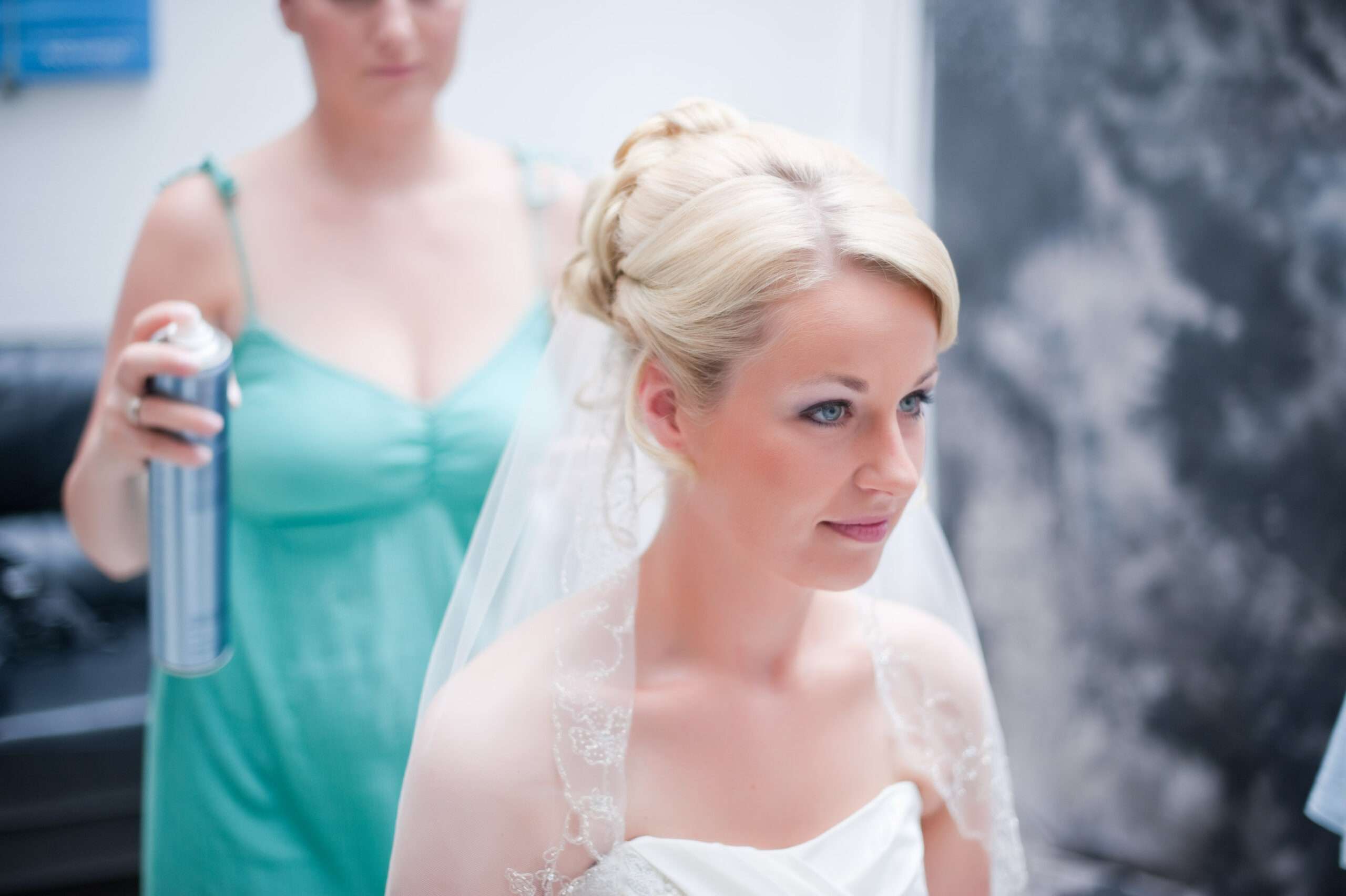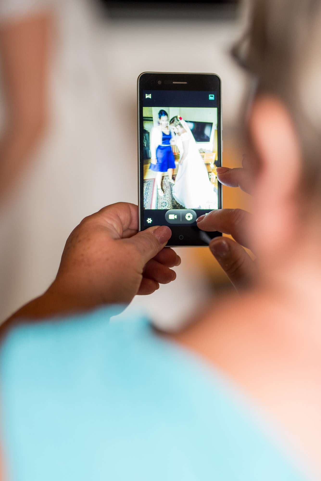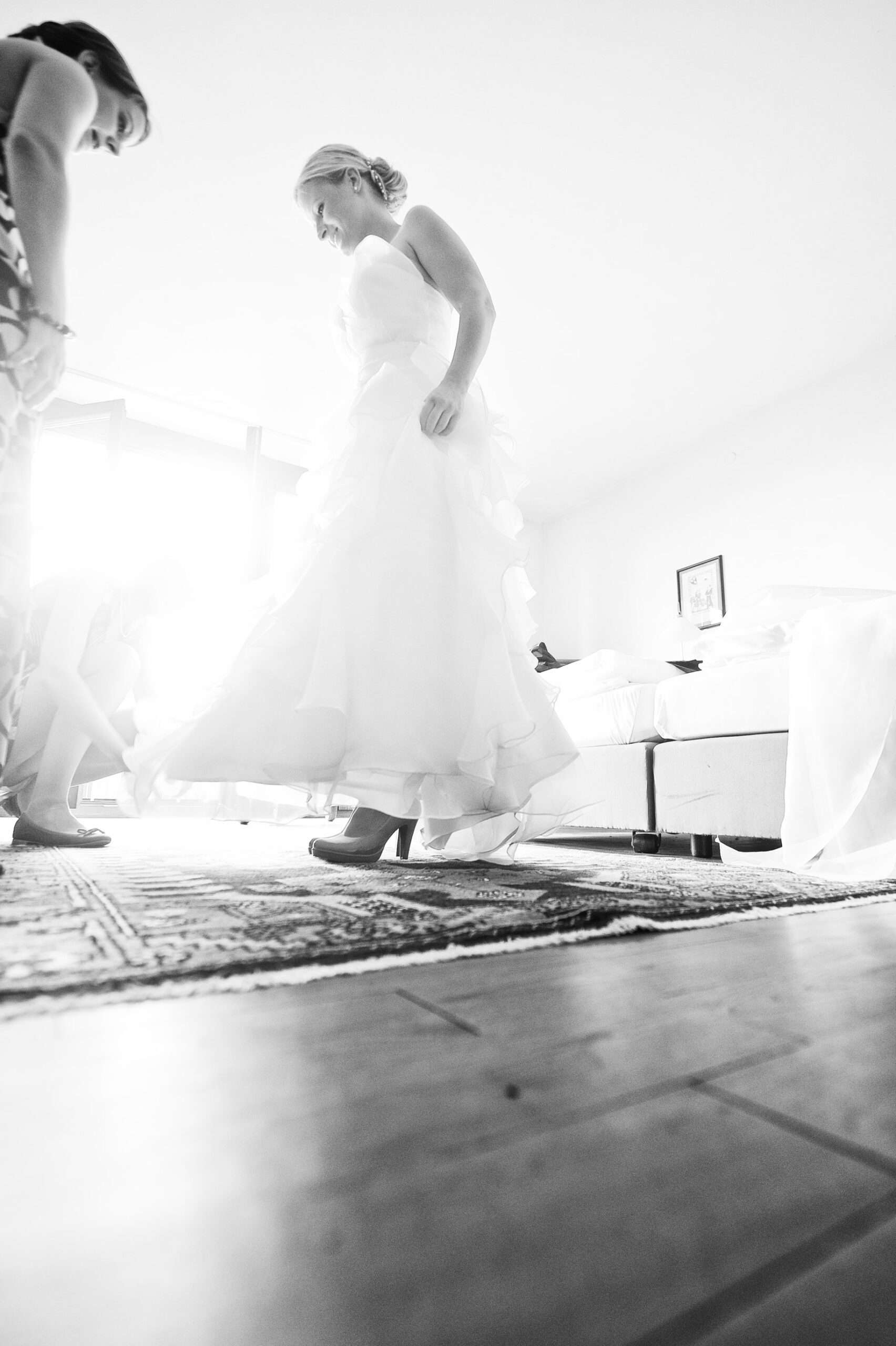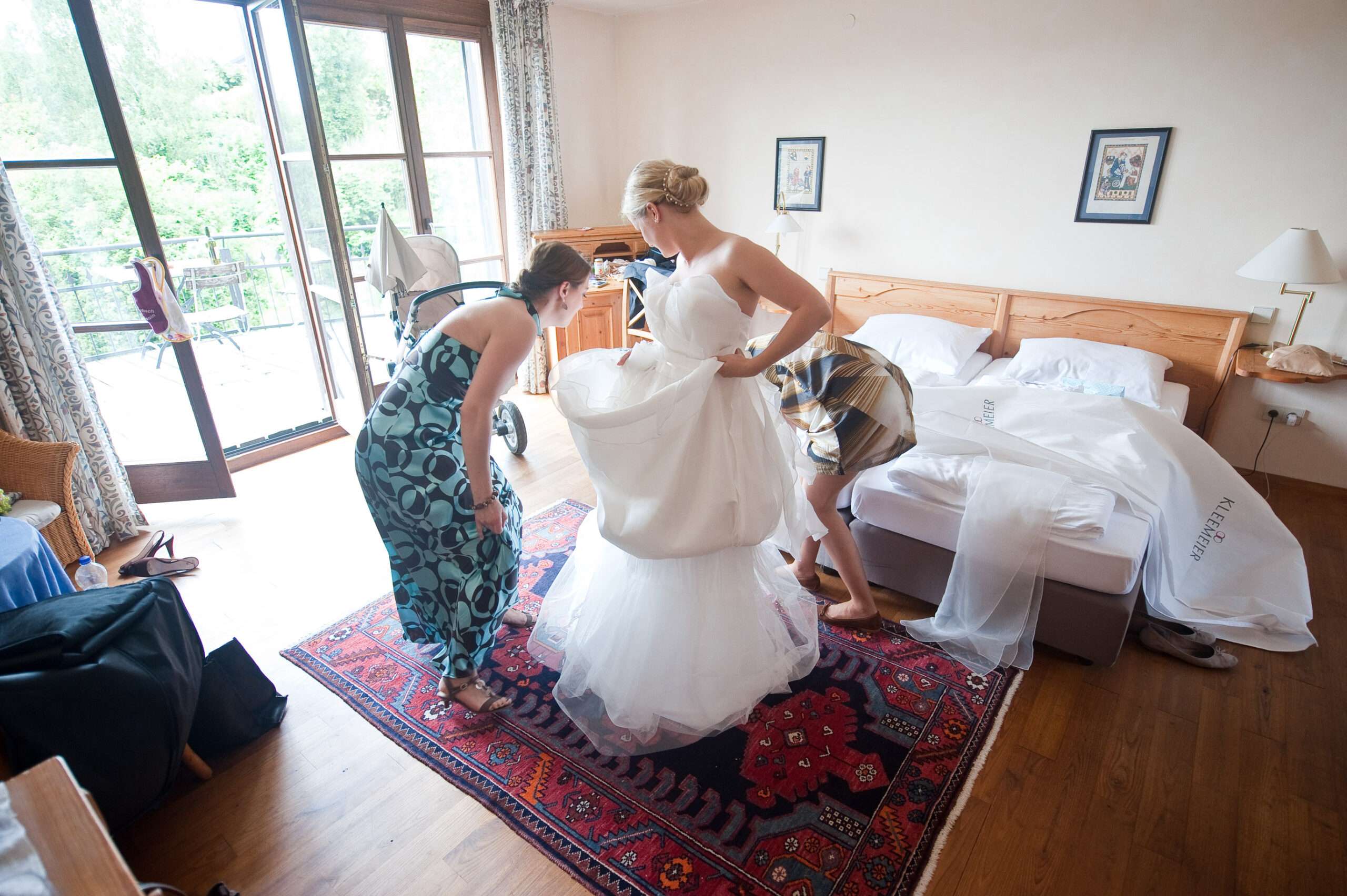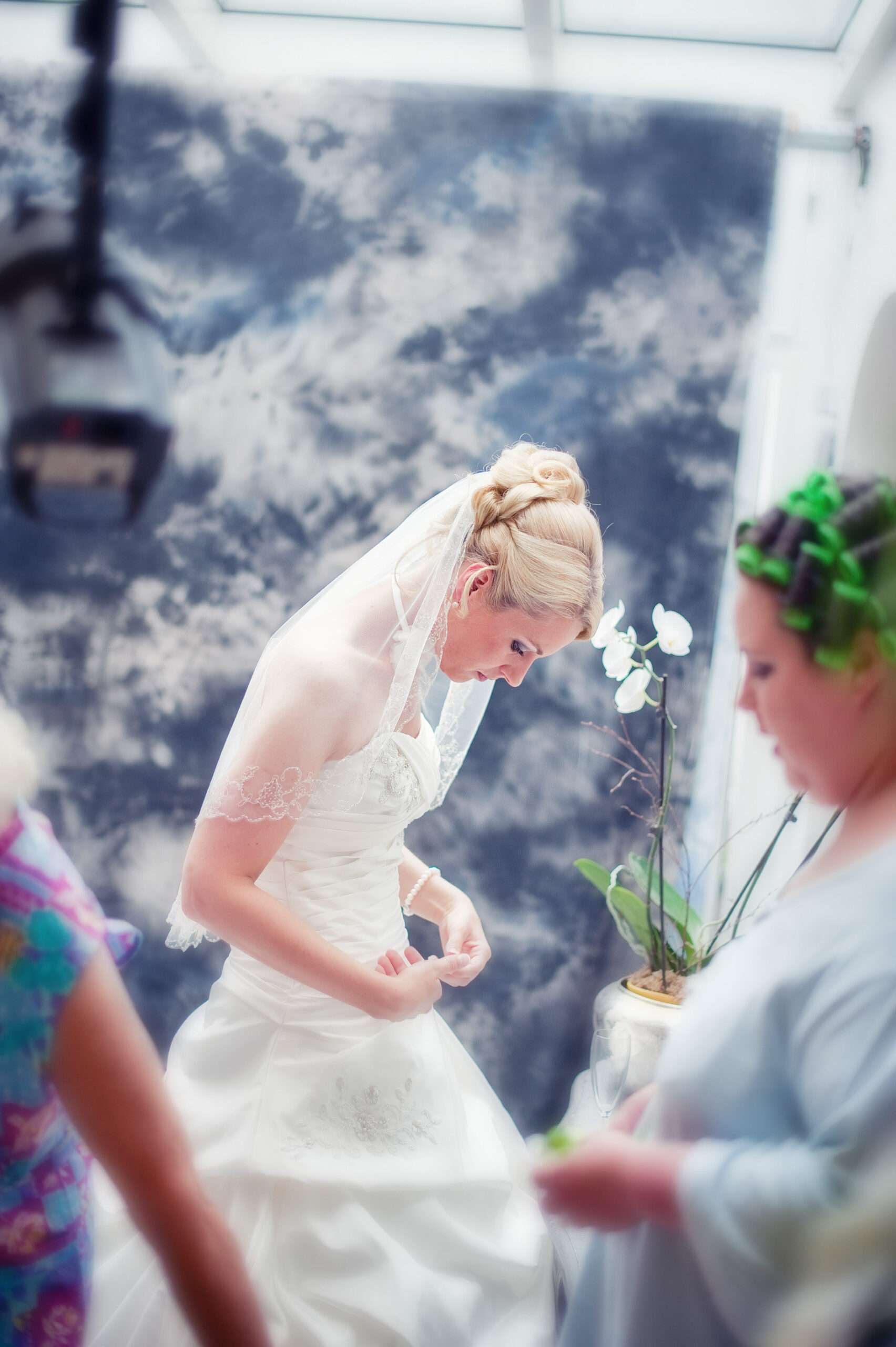 Braut wird von Freundin beim Ankleiden geholfen.