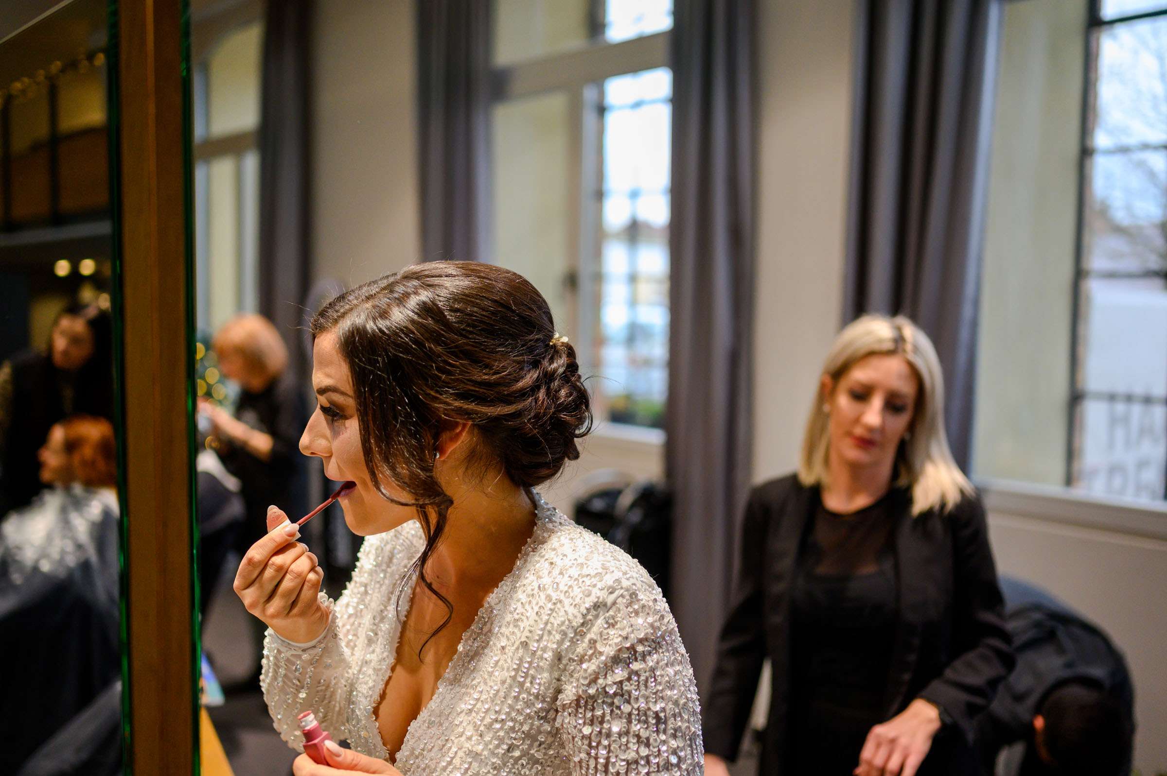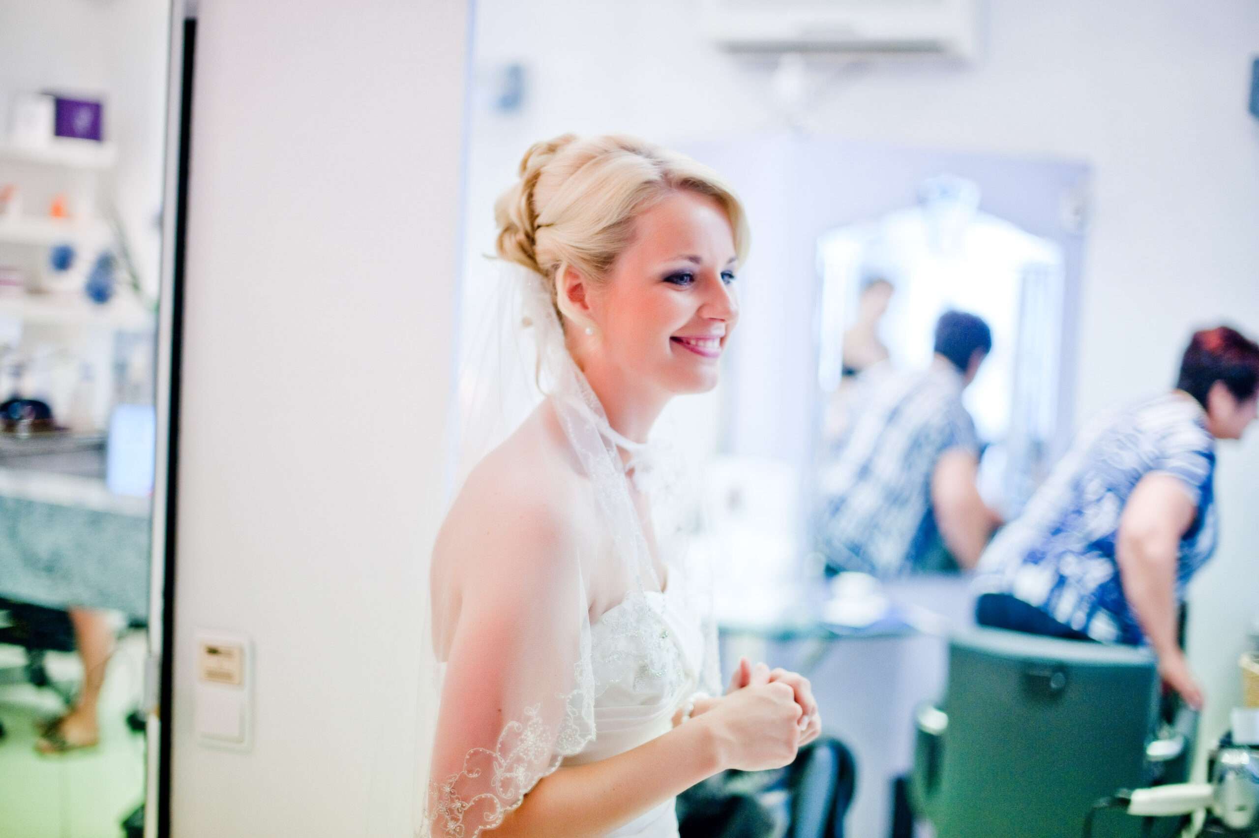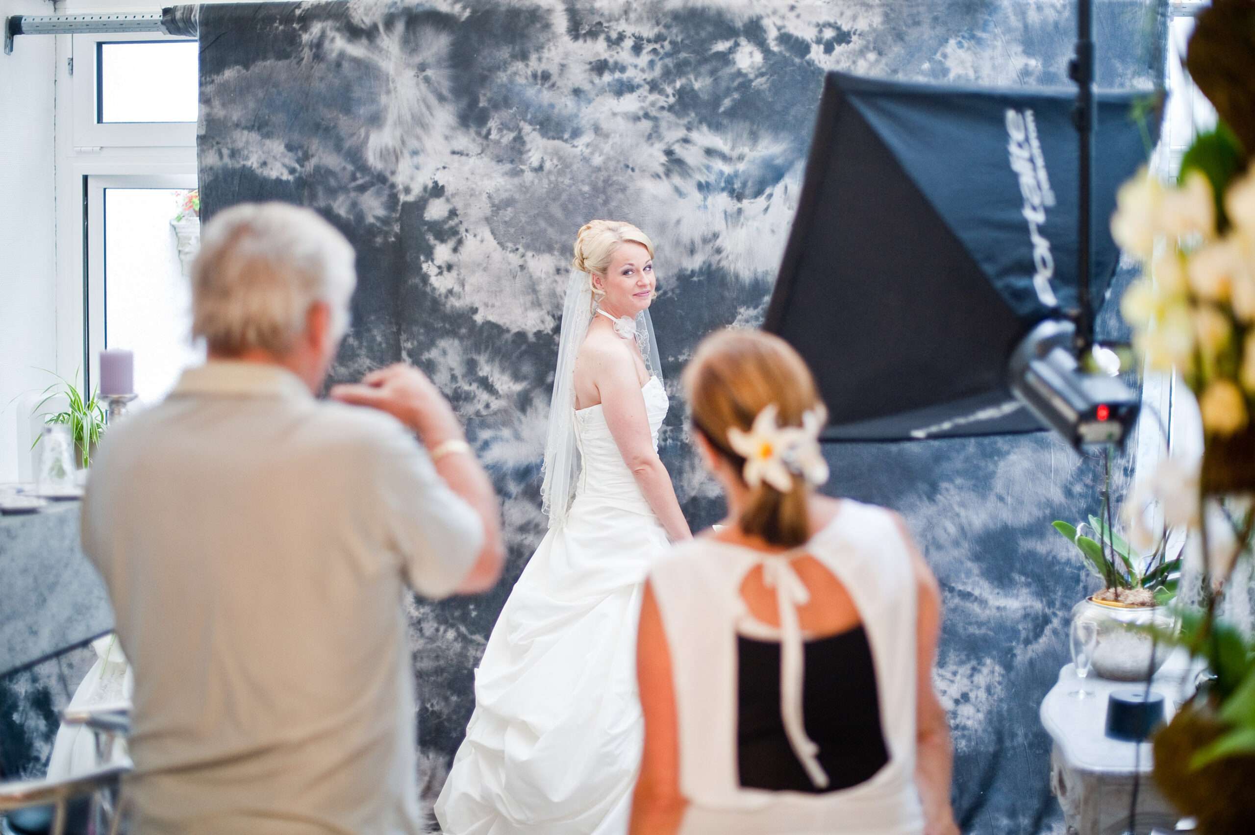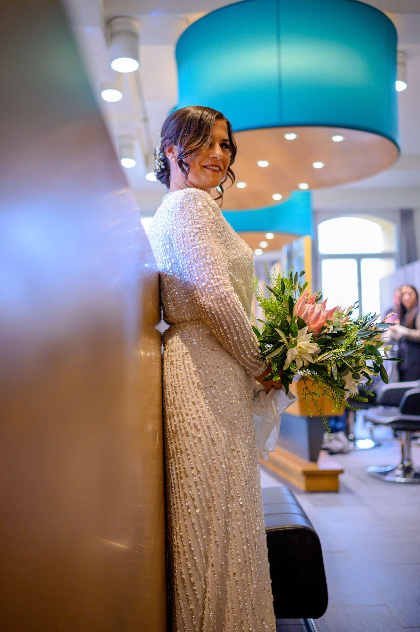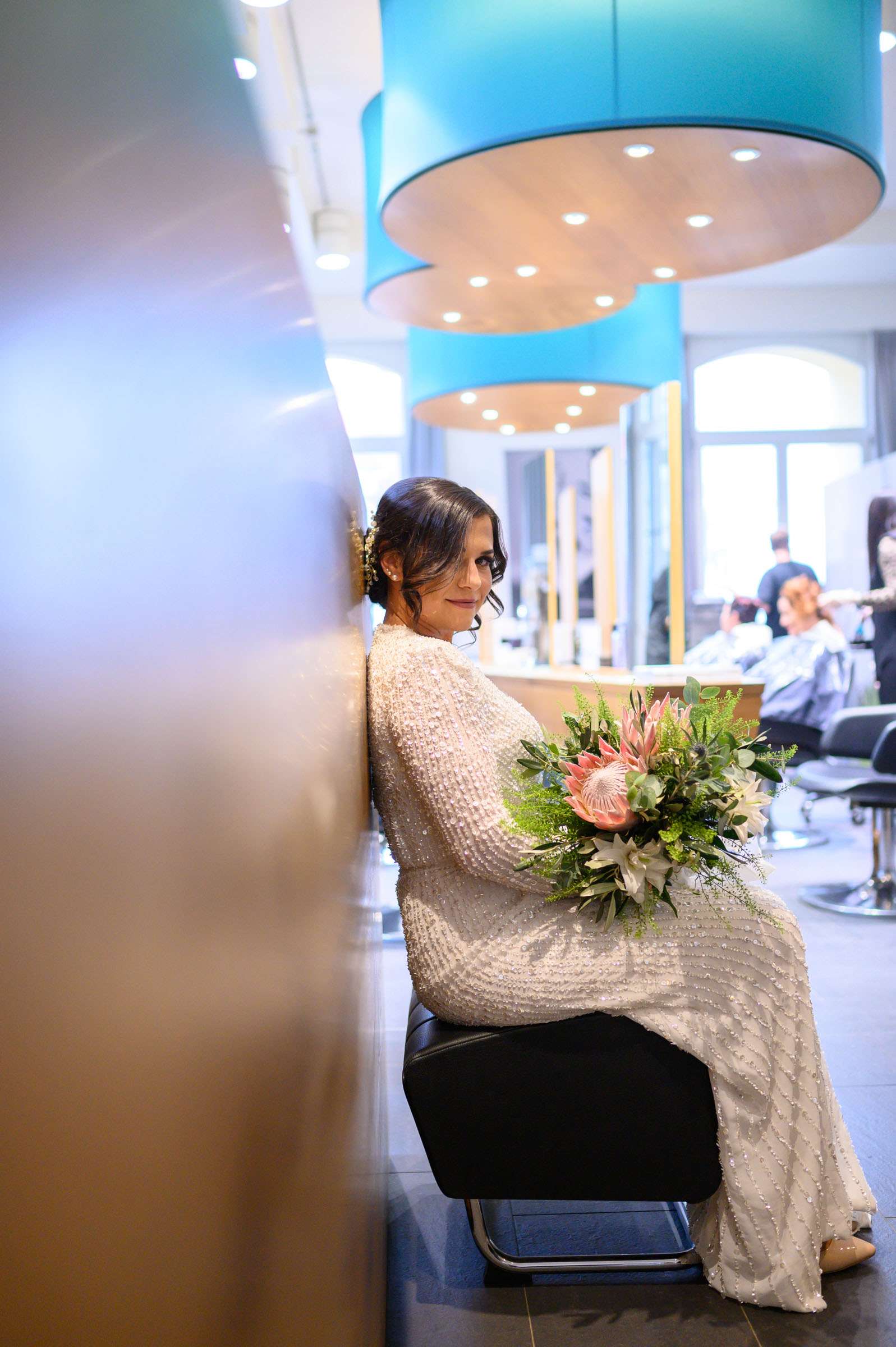 Braut im Salon mit Blumenstrauß