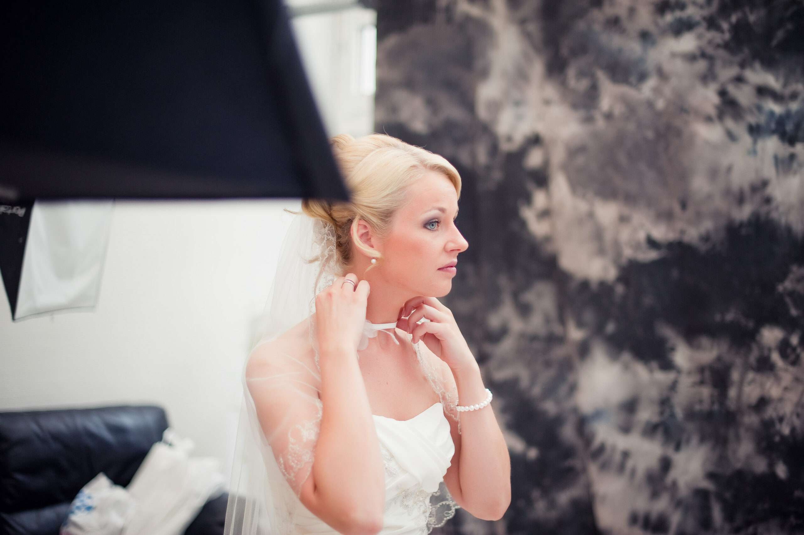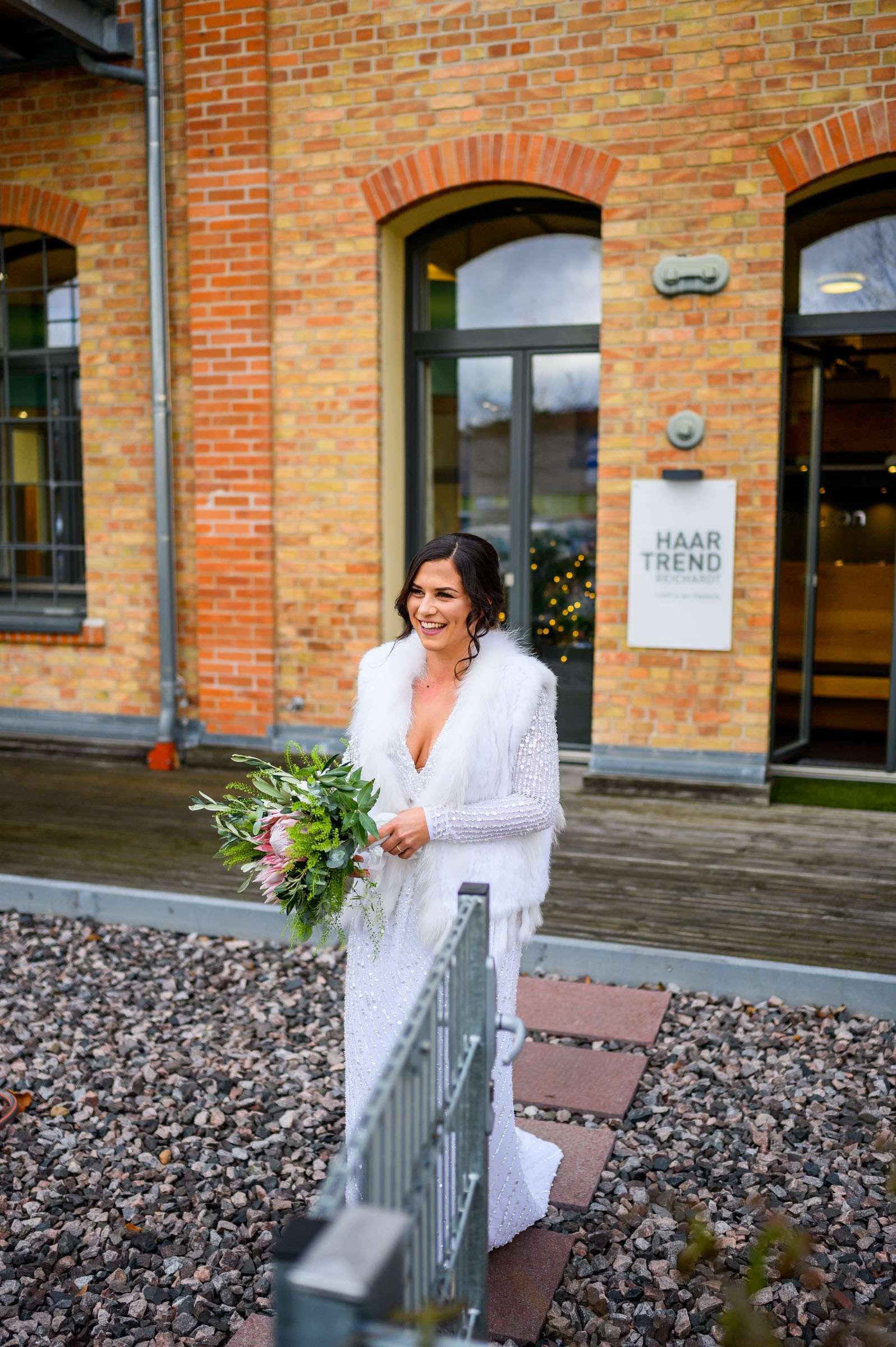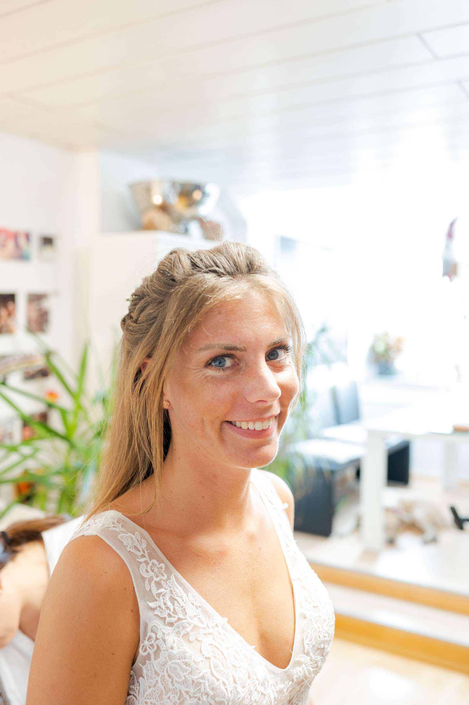 Braut in weißem Kleid lächelt am Fenster