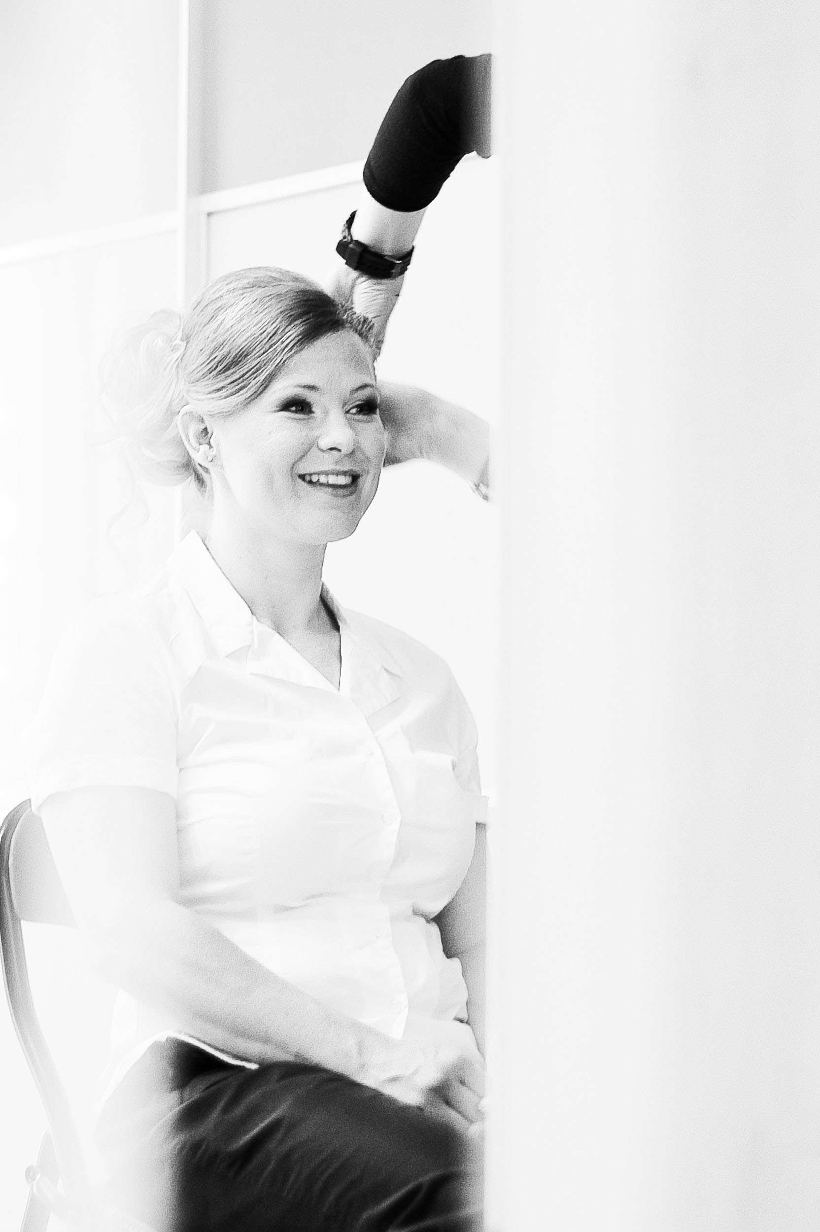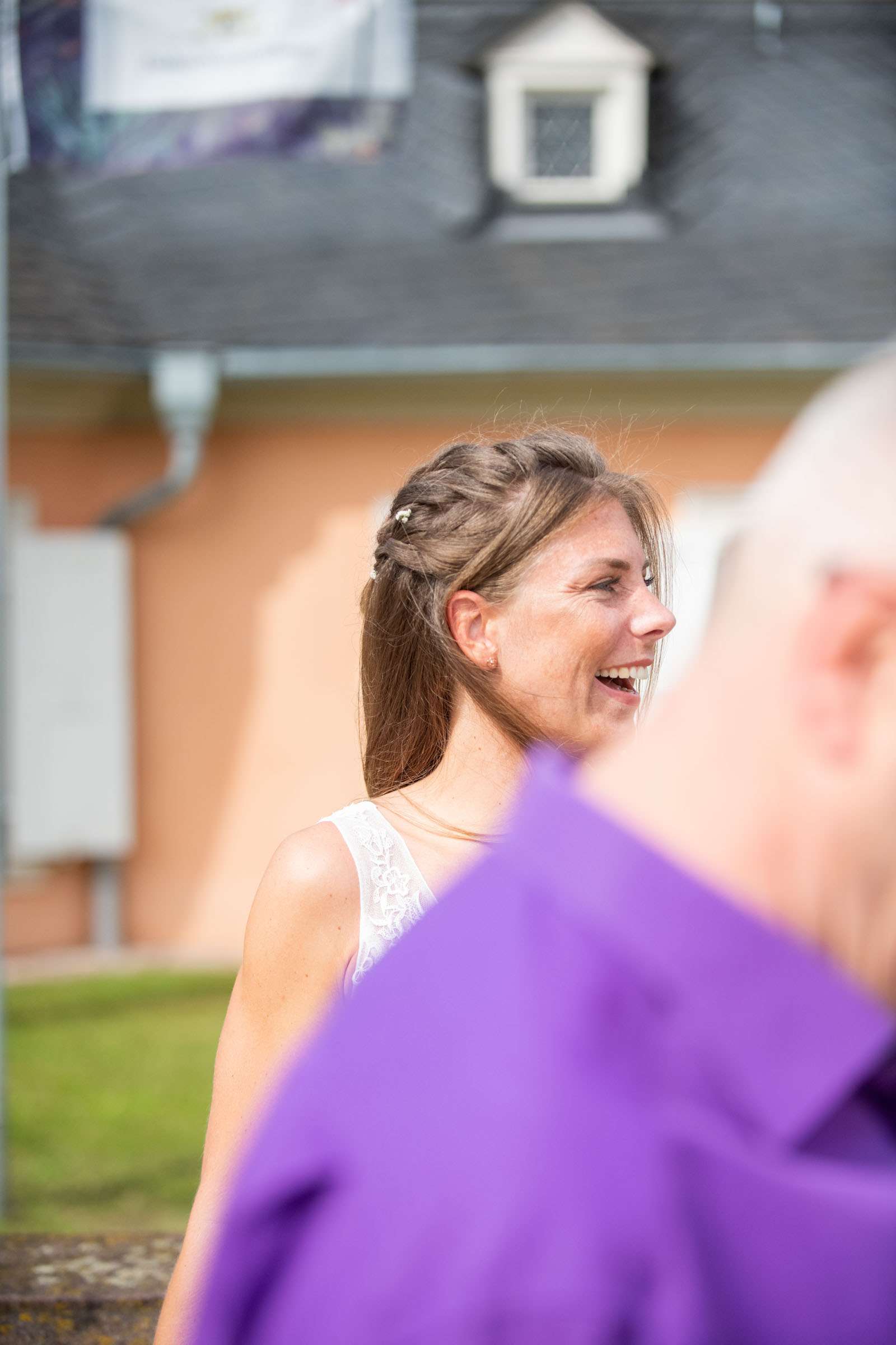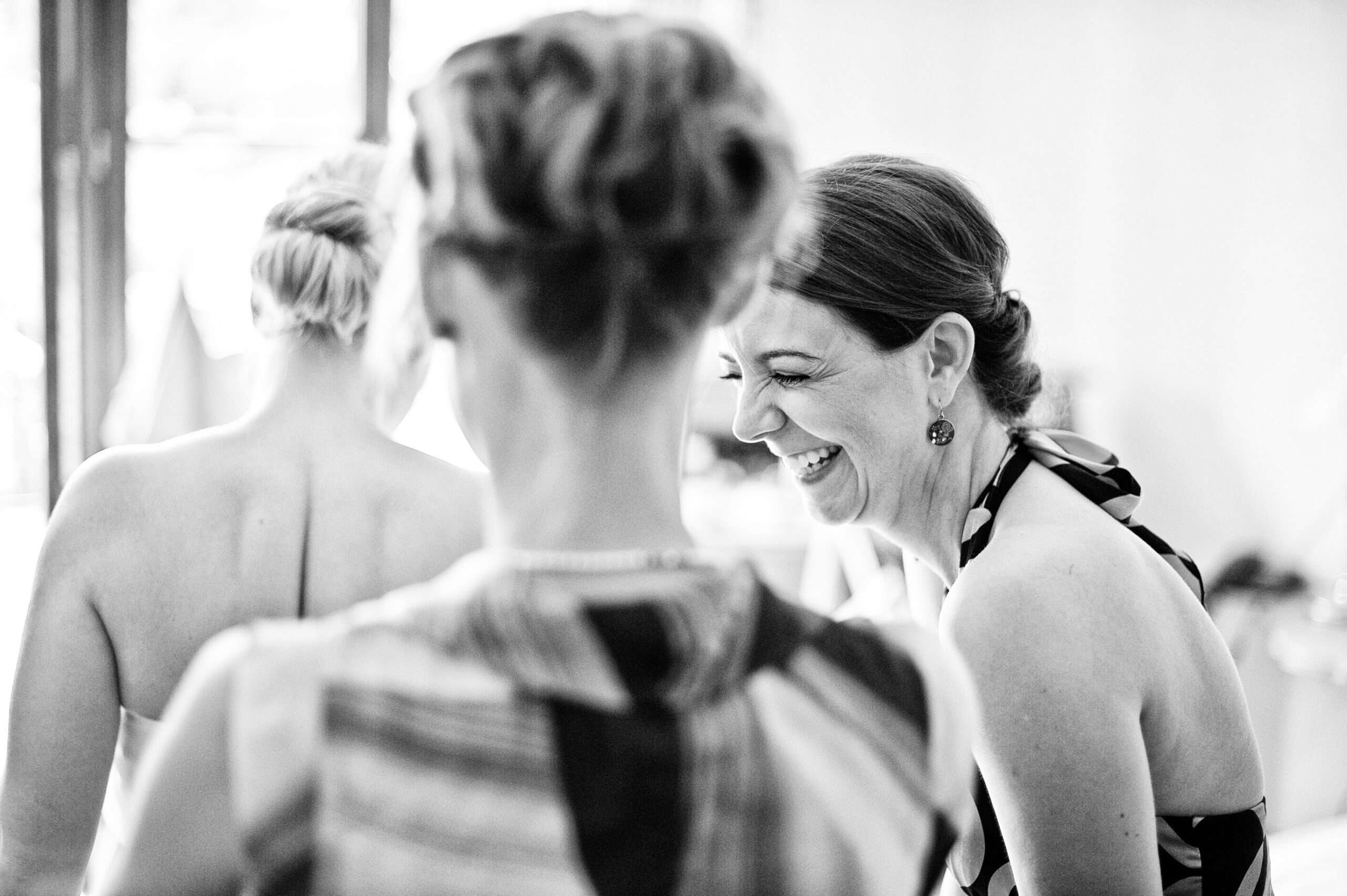 Braut in weißem Kleid lacht im Ankleidezimmer