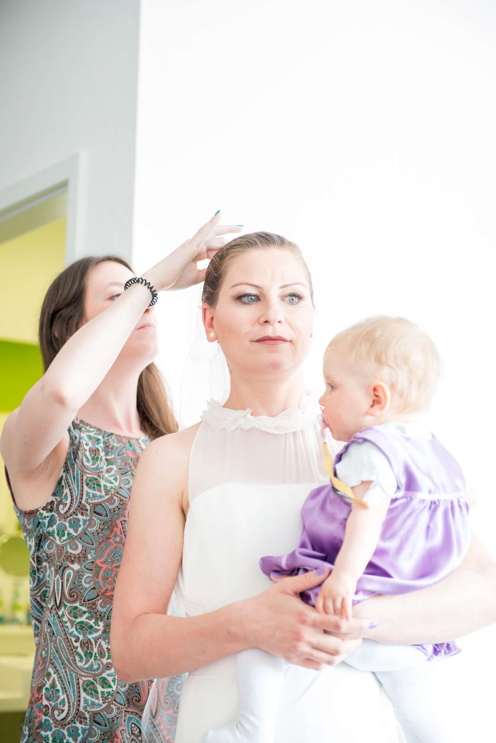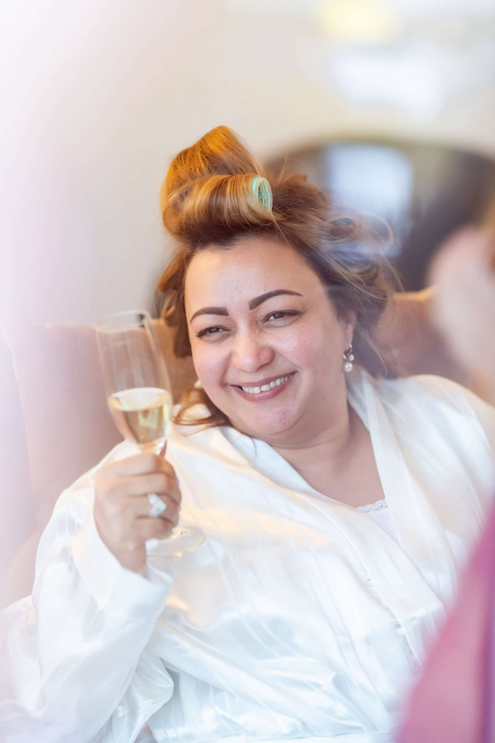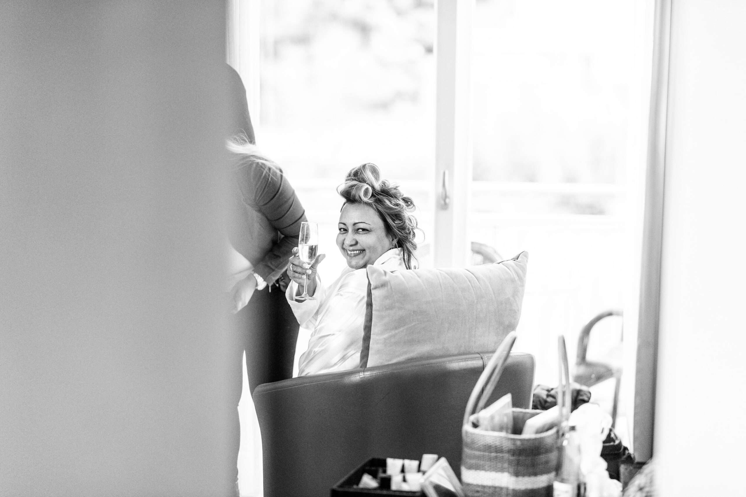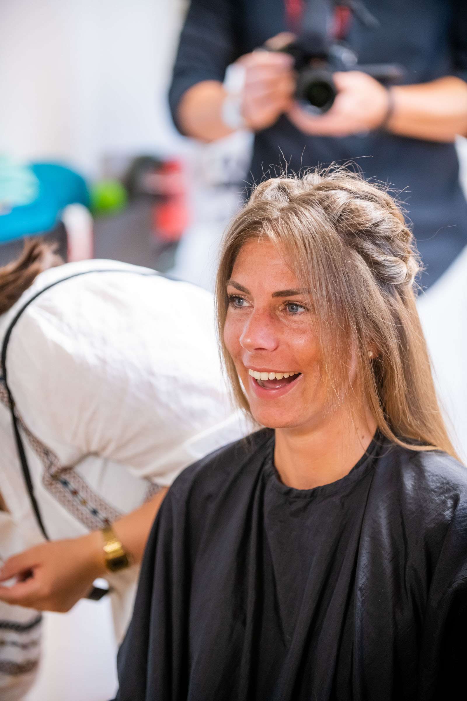 Braut in weißem Kleid lacht im Ankleidezimmer