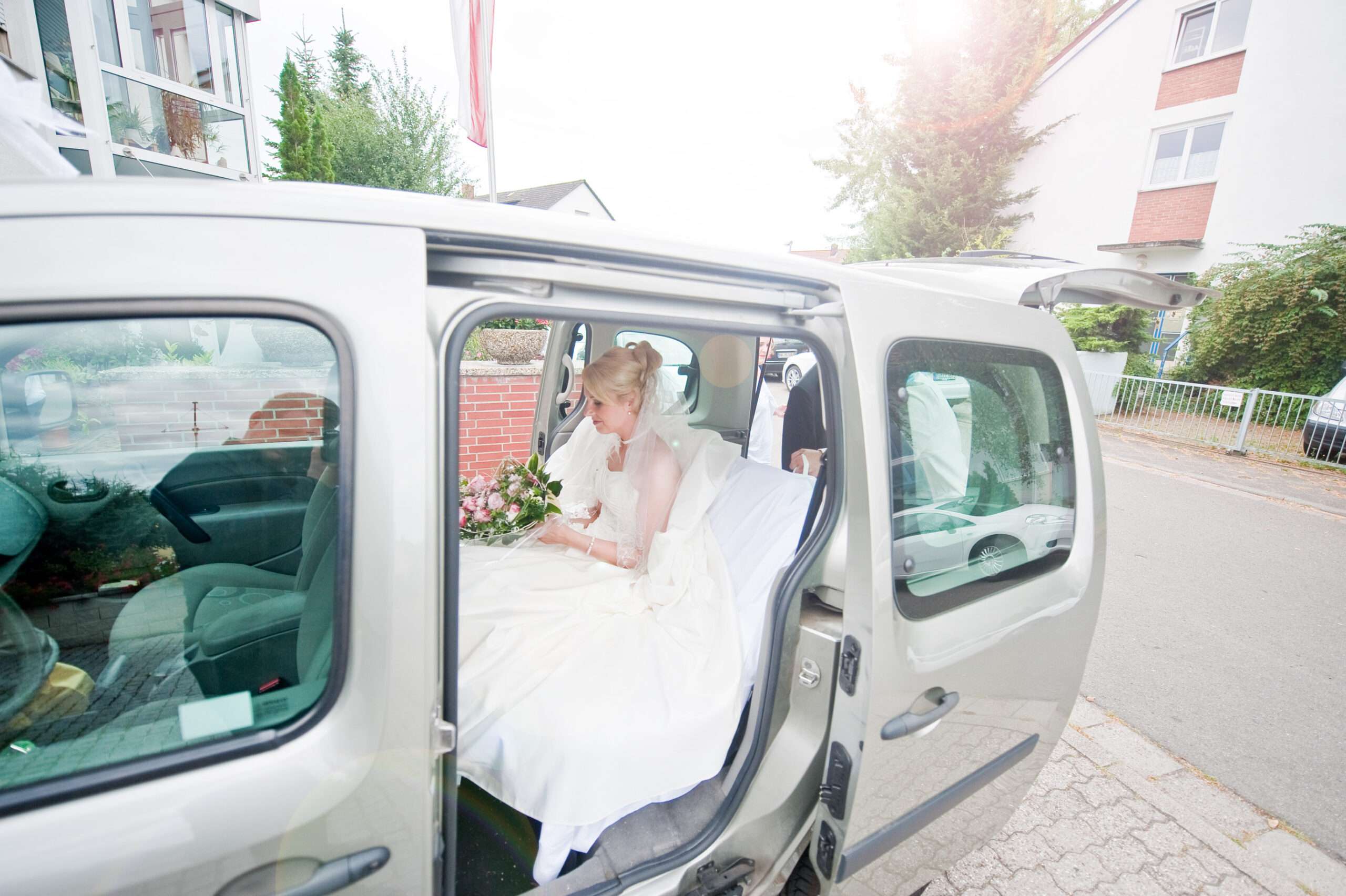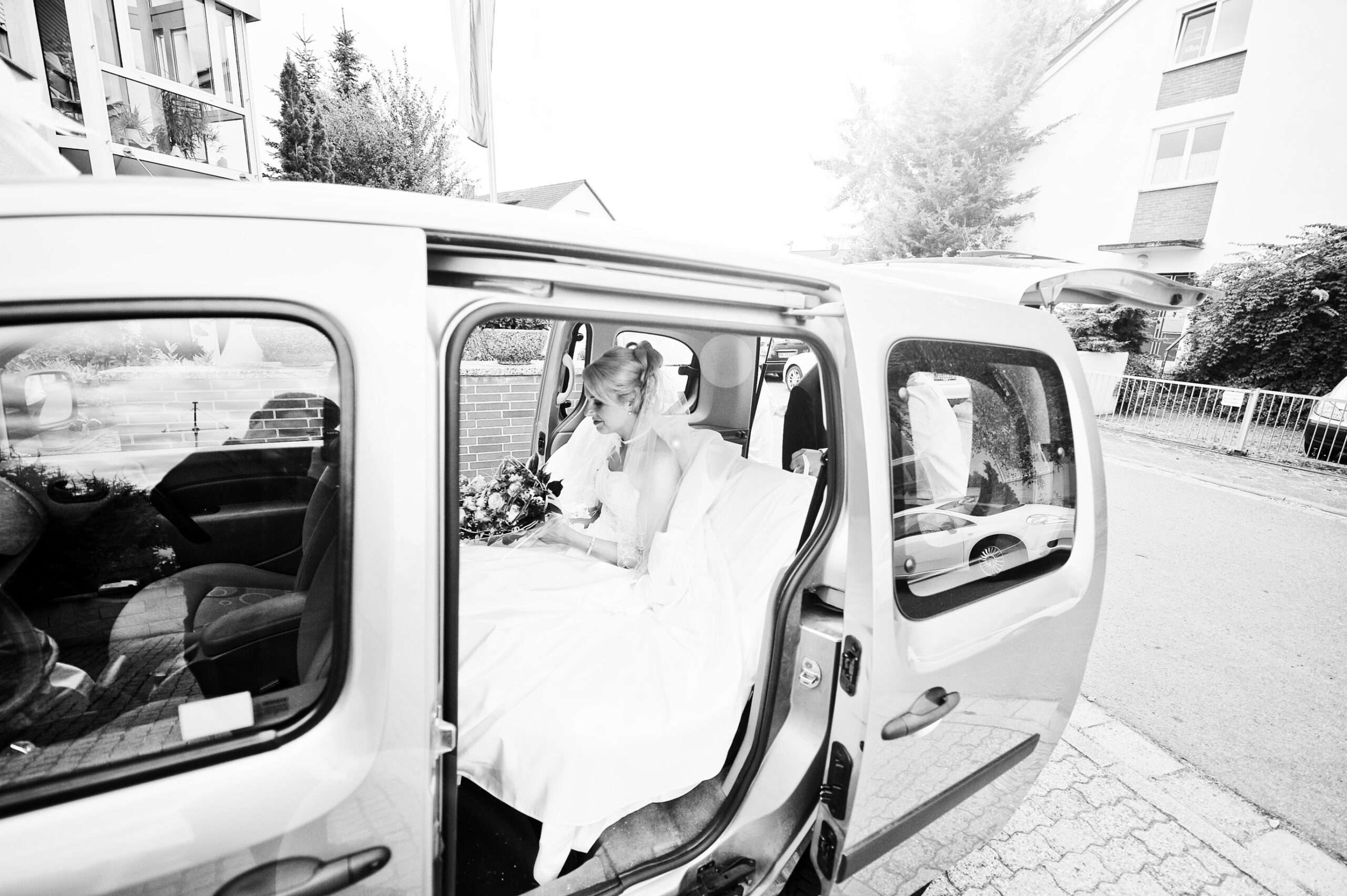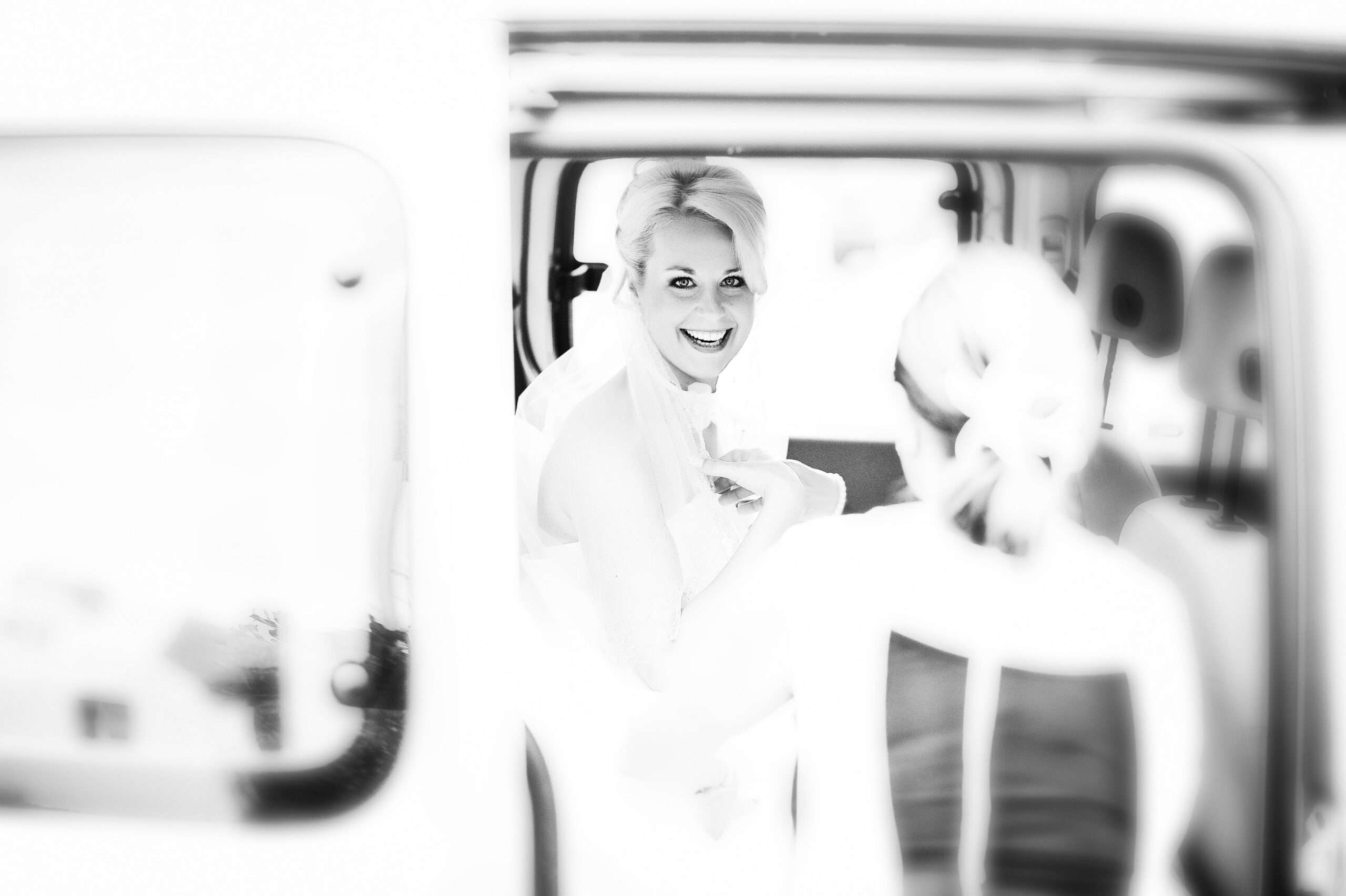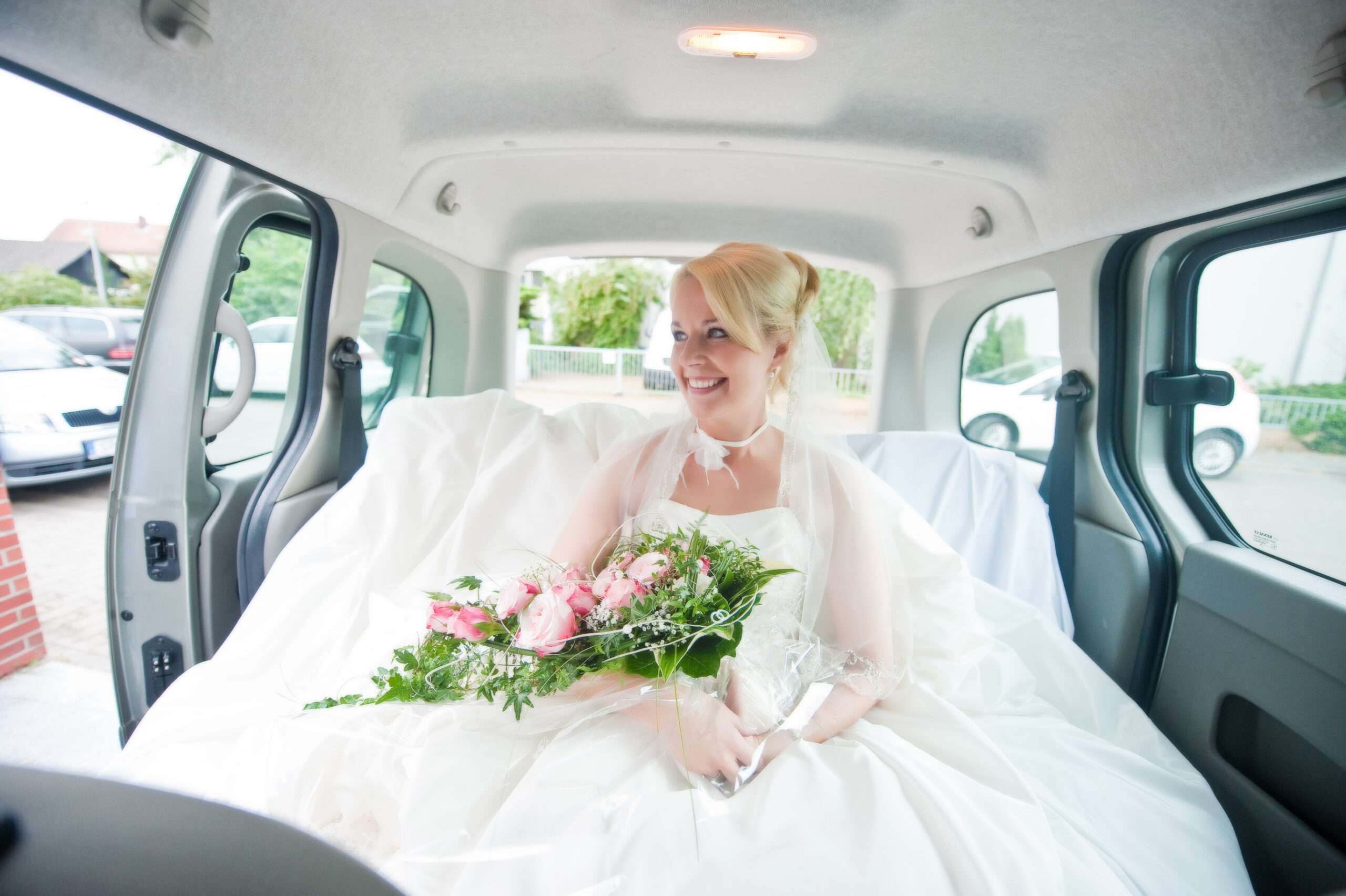 Glückliche Braut im Auto