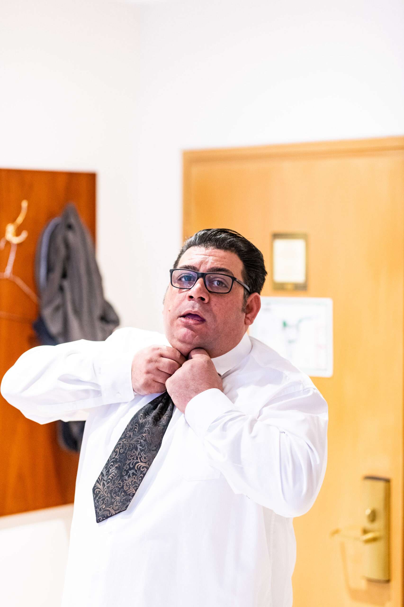 Mann weint in rosa Anzug, Gläser in Hand.