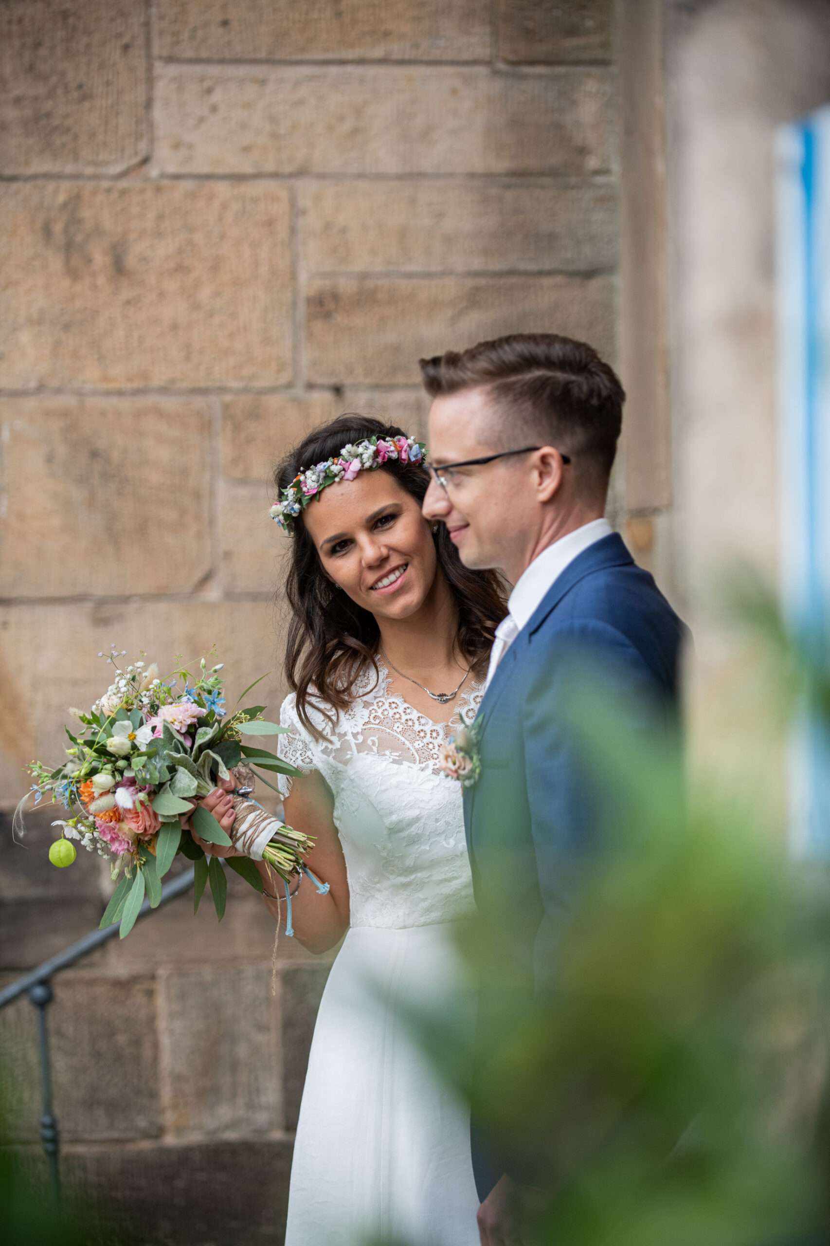 Brautpaar lächelt sich an vor historischer Tür