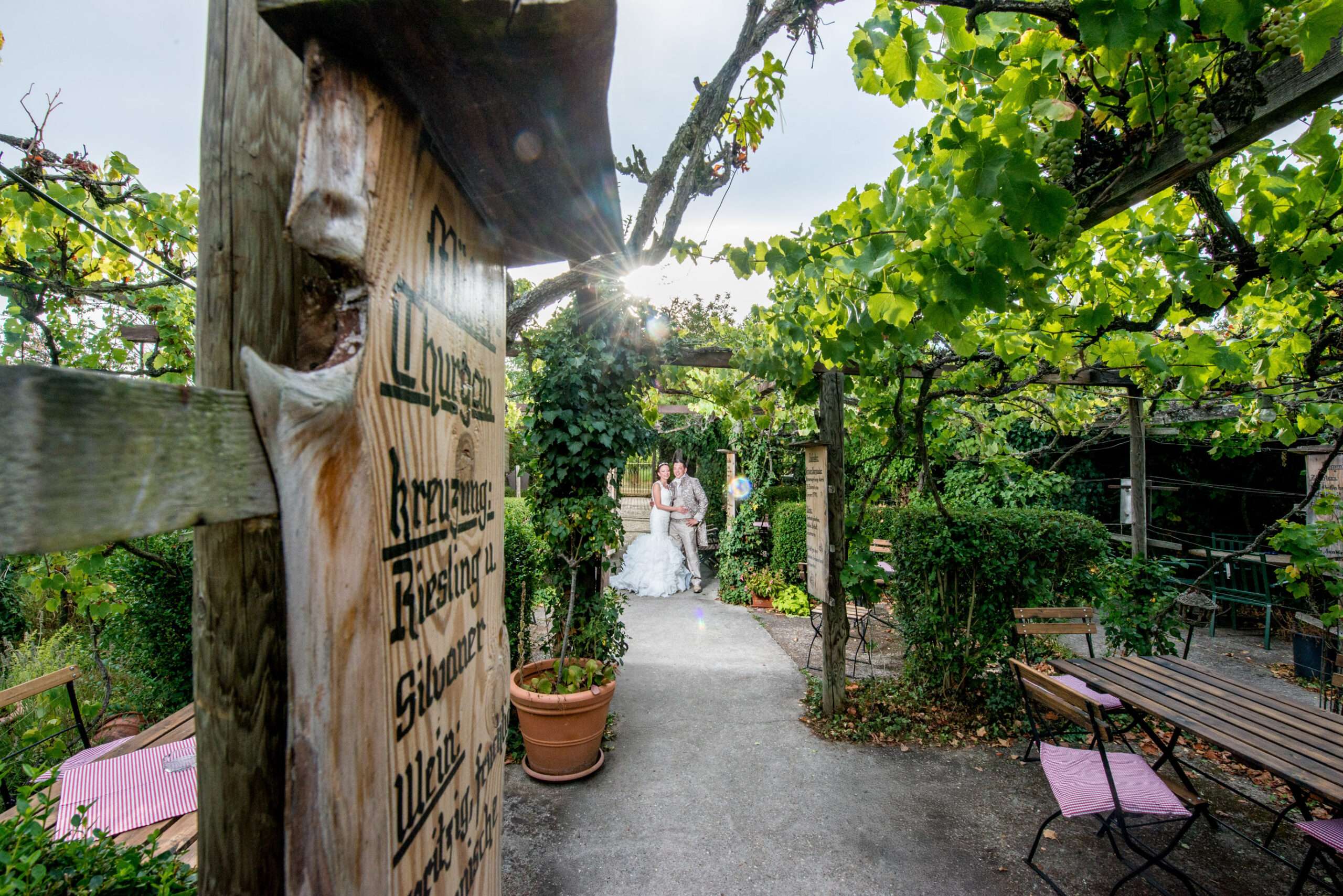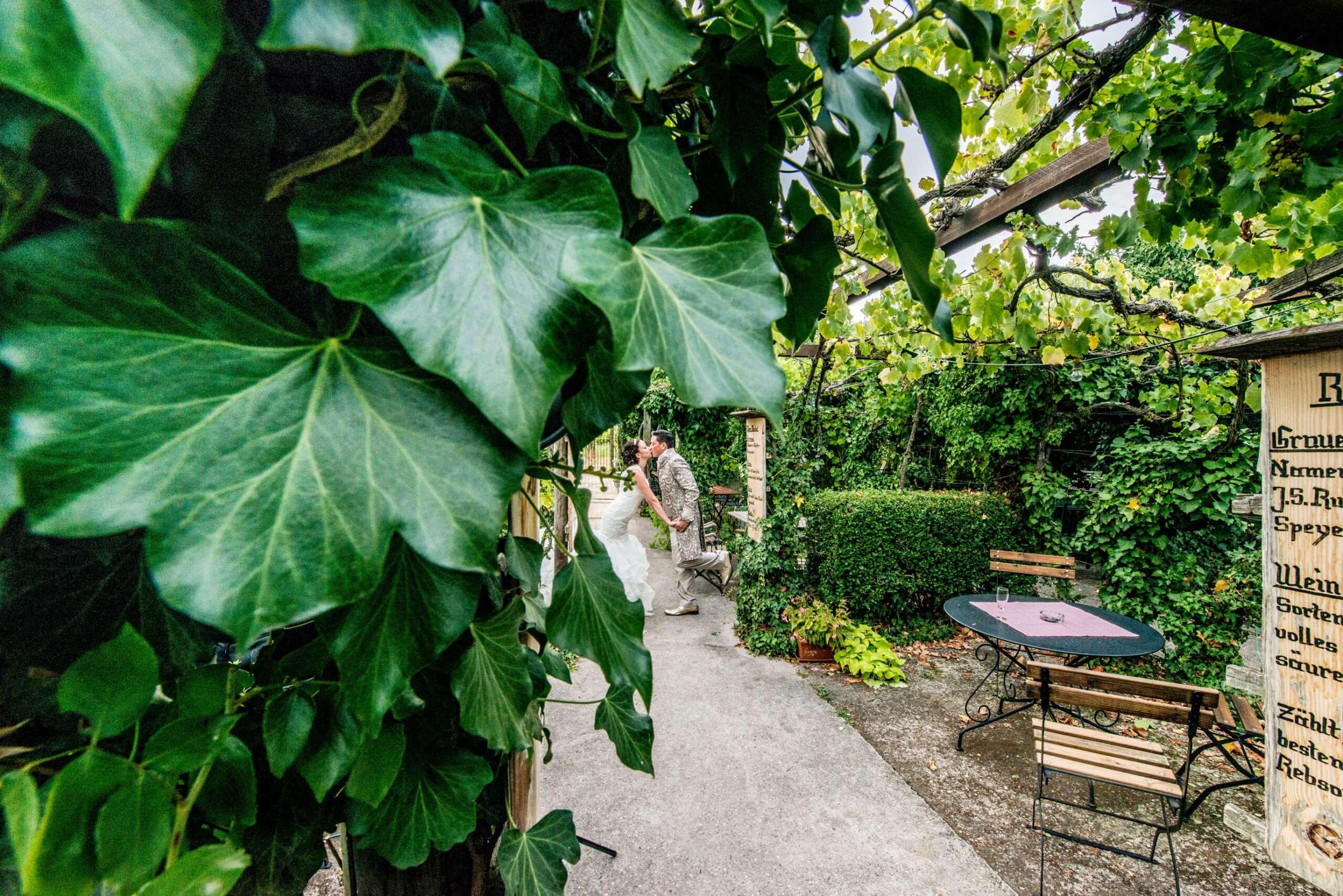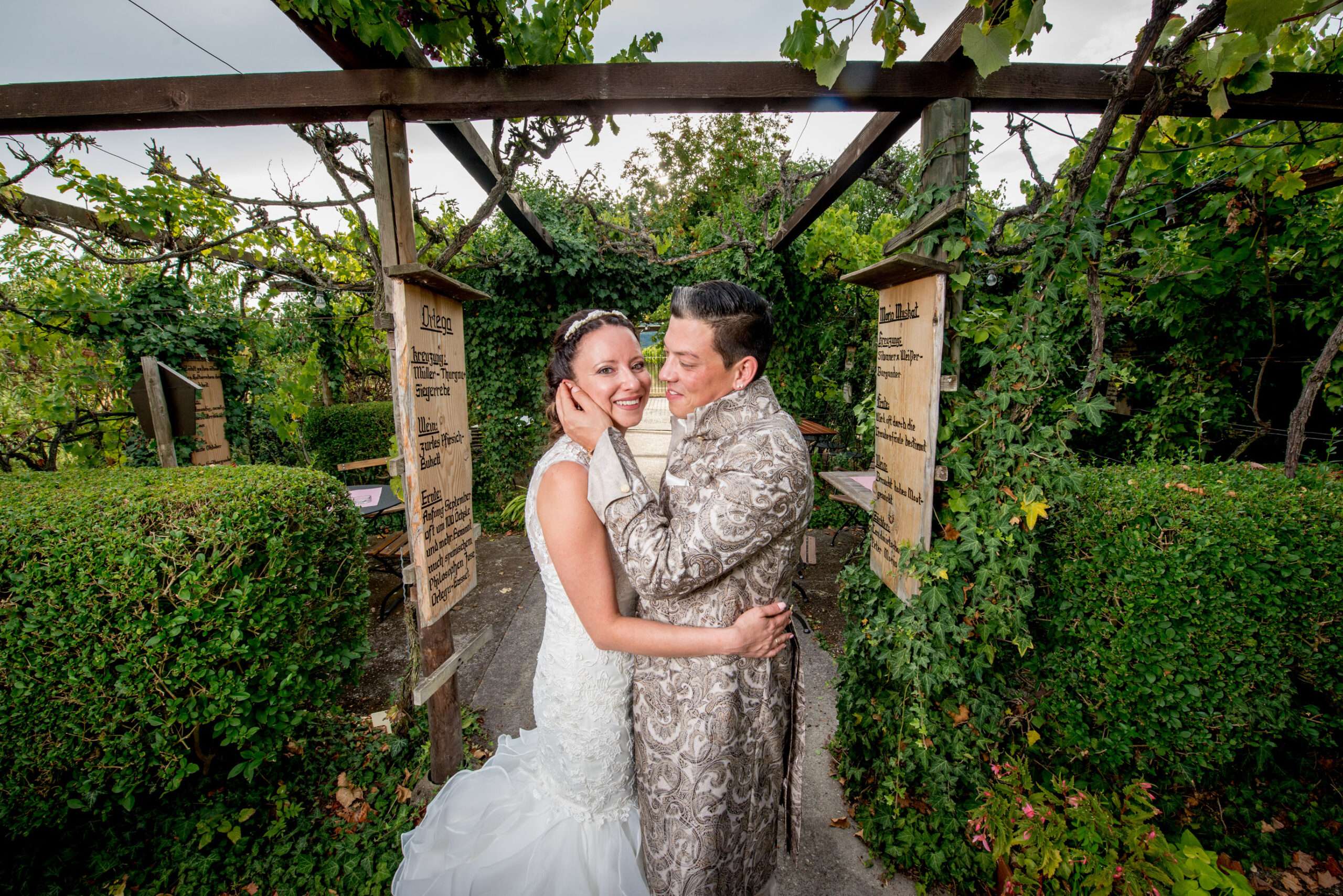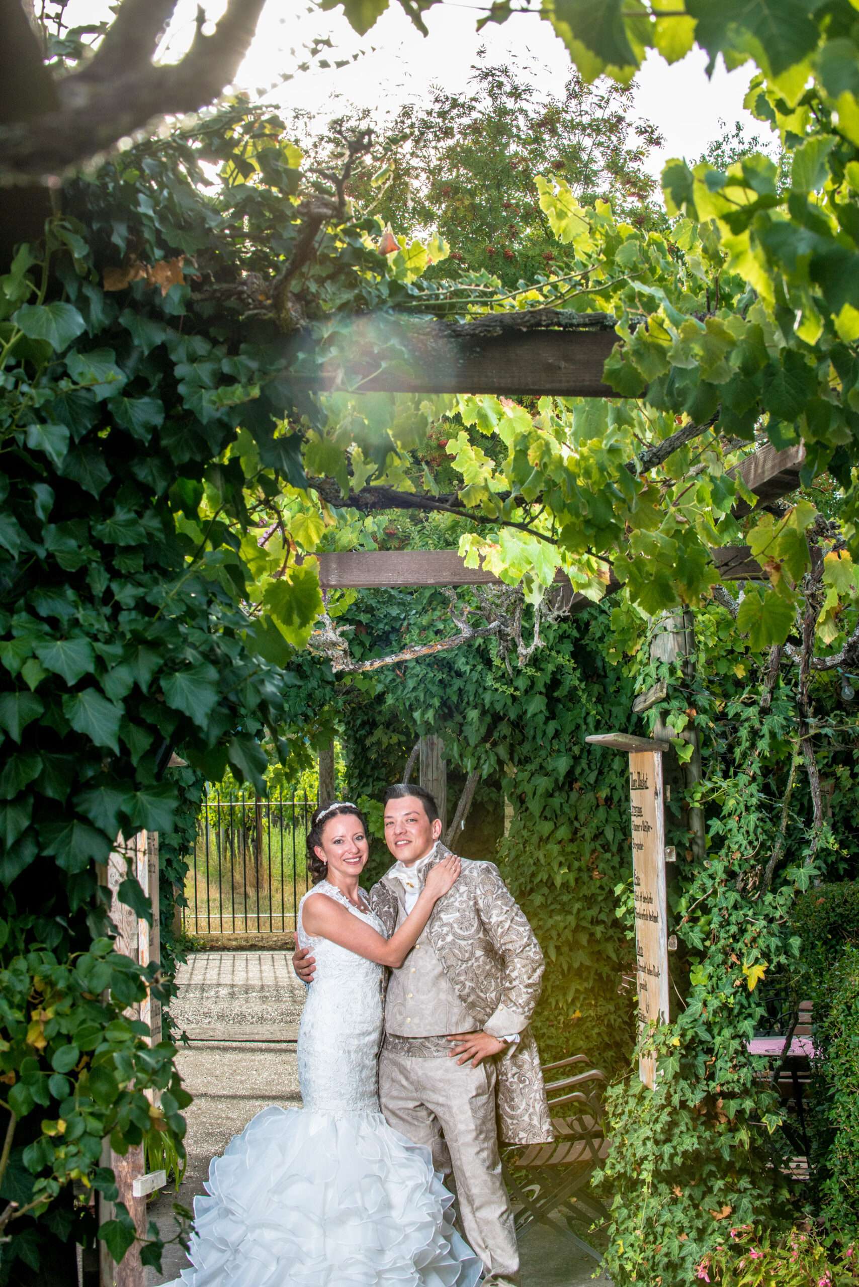 Brautpaar im grünen Gartenbereich mit Holzschild