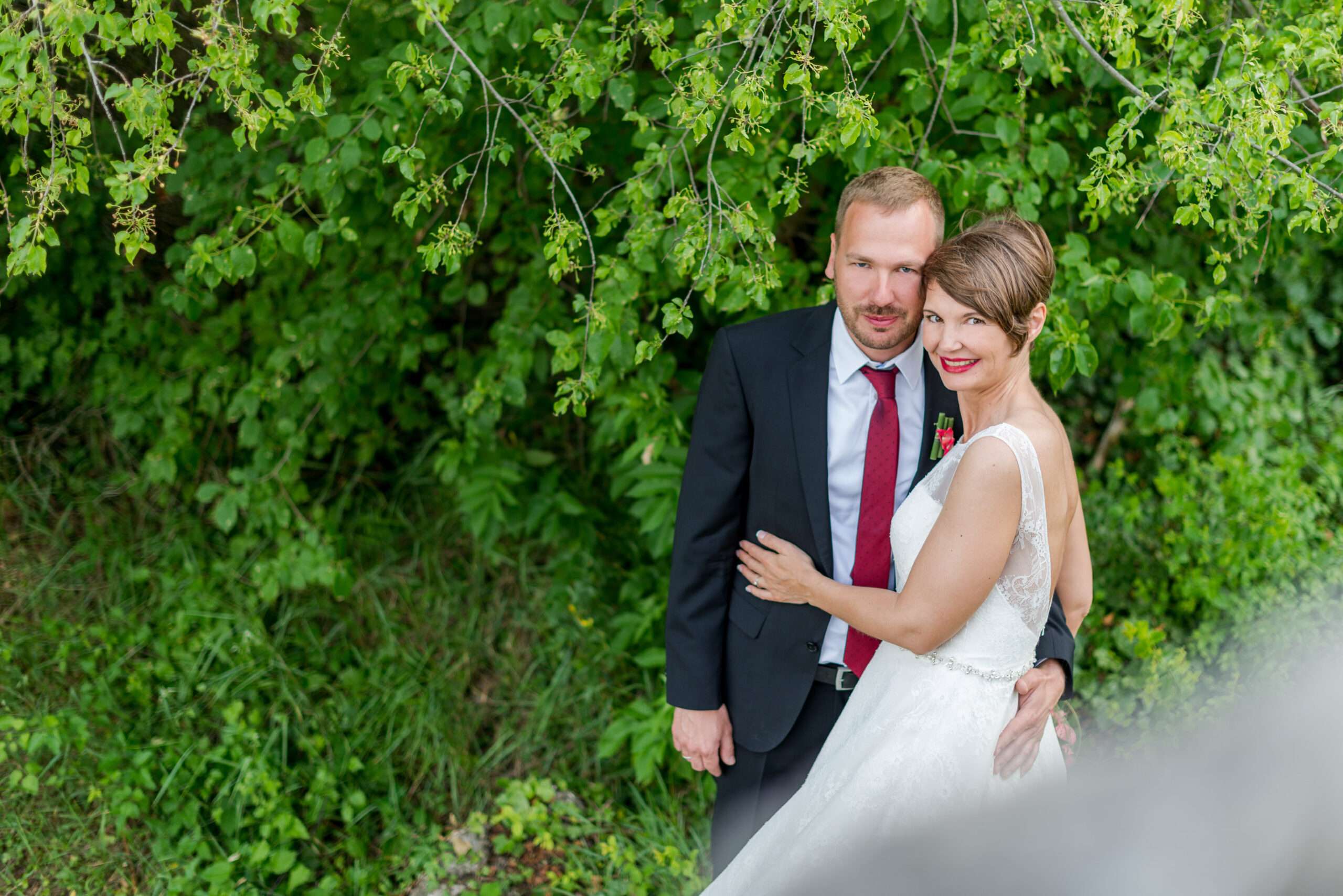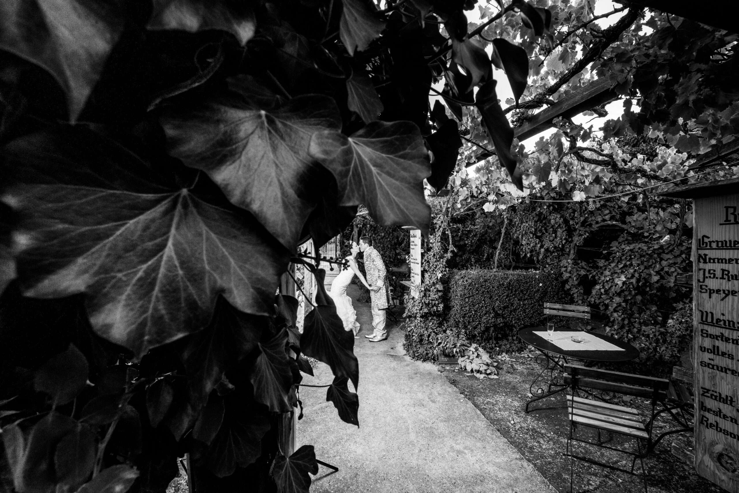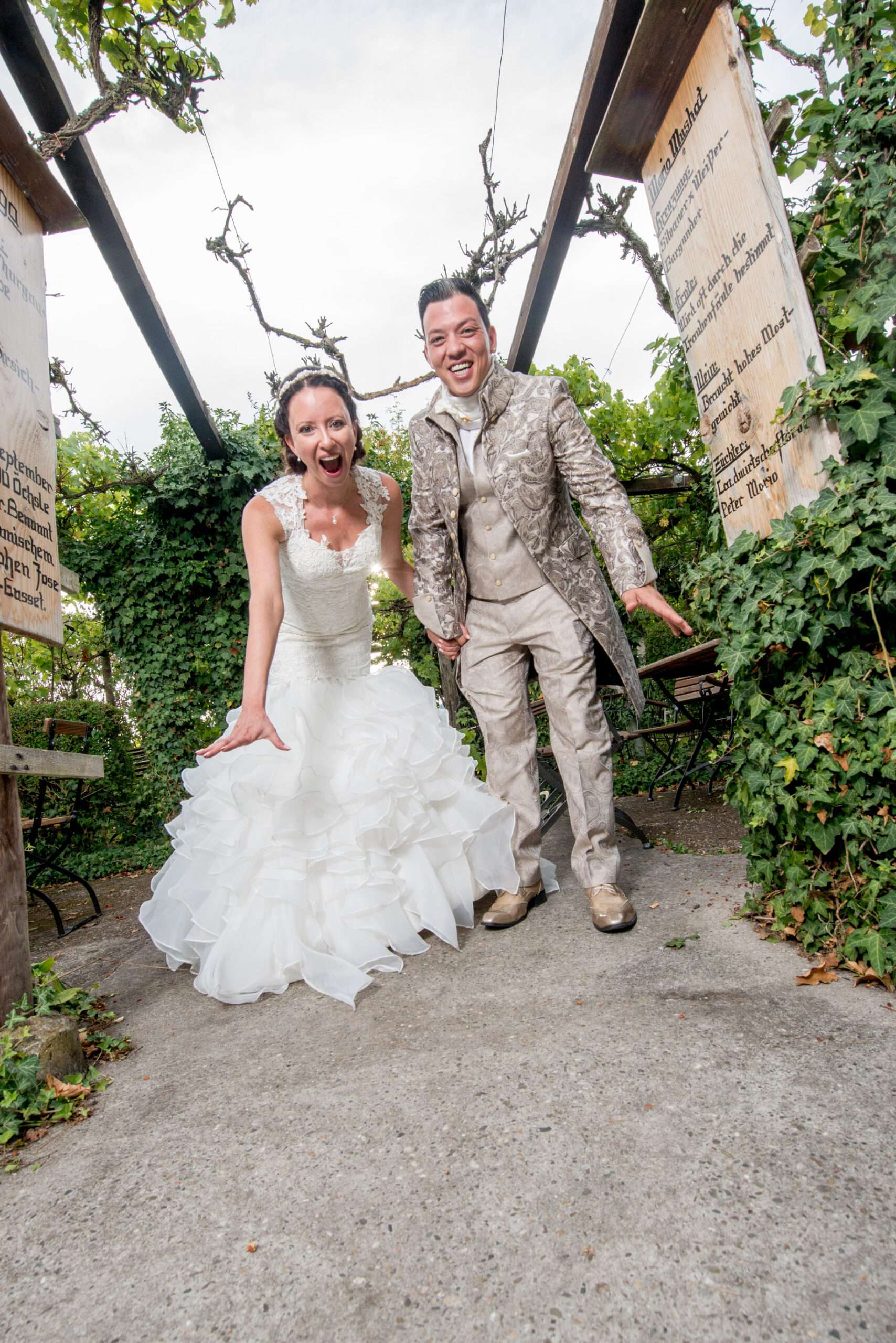 Brautpaar im grünen Gartenbereich mit Holzschild
