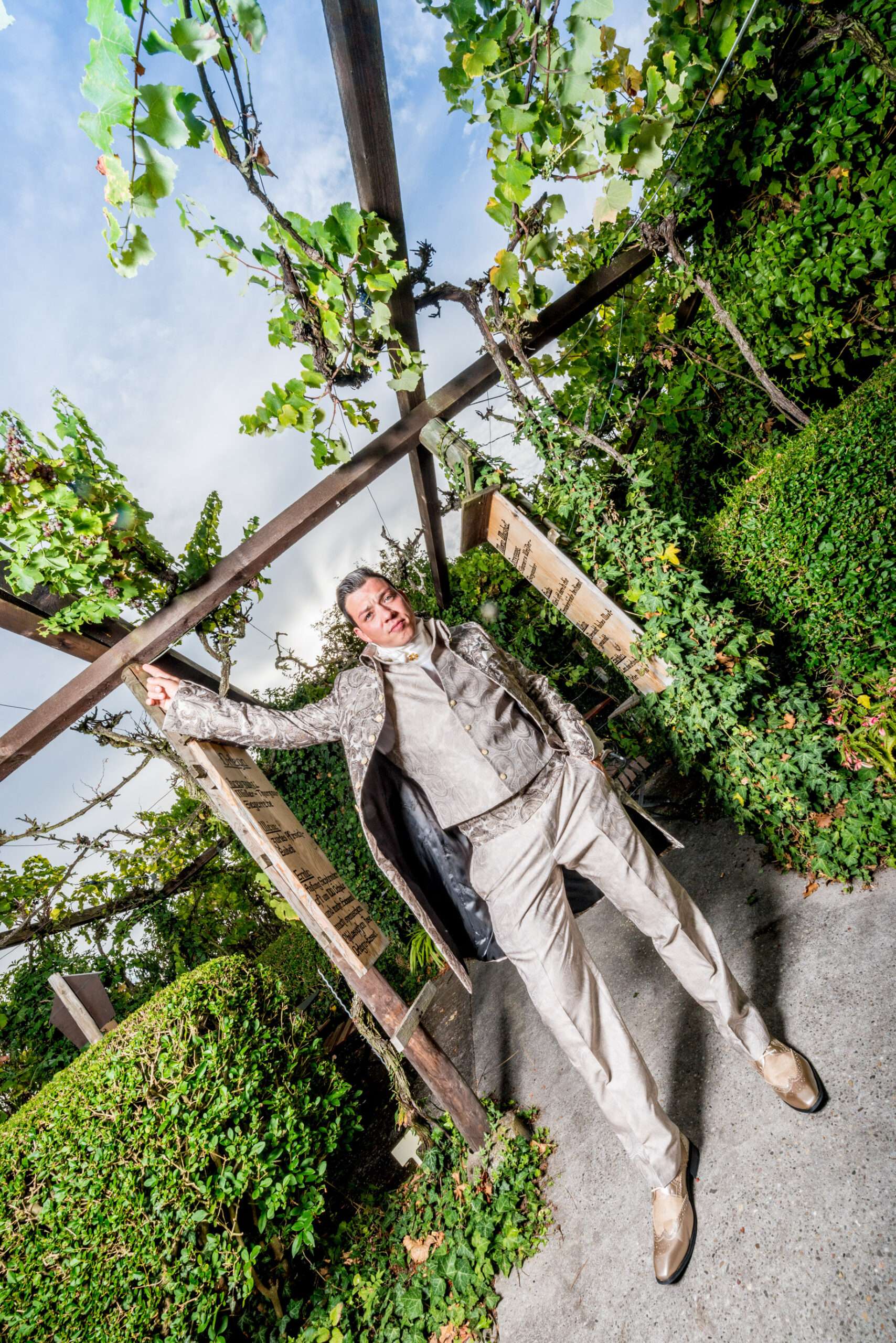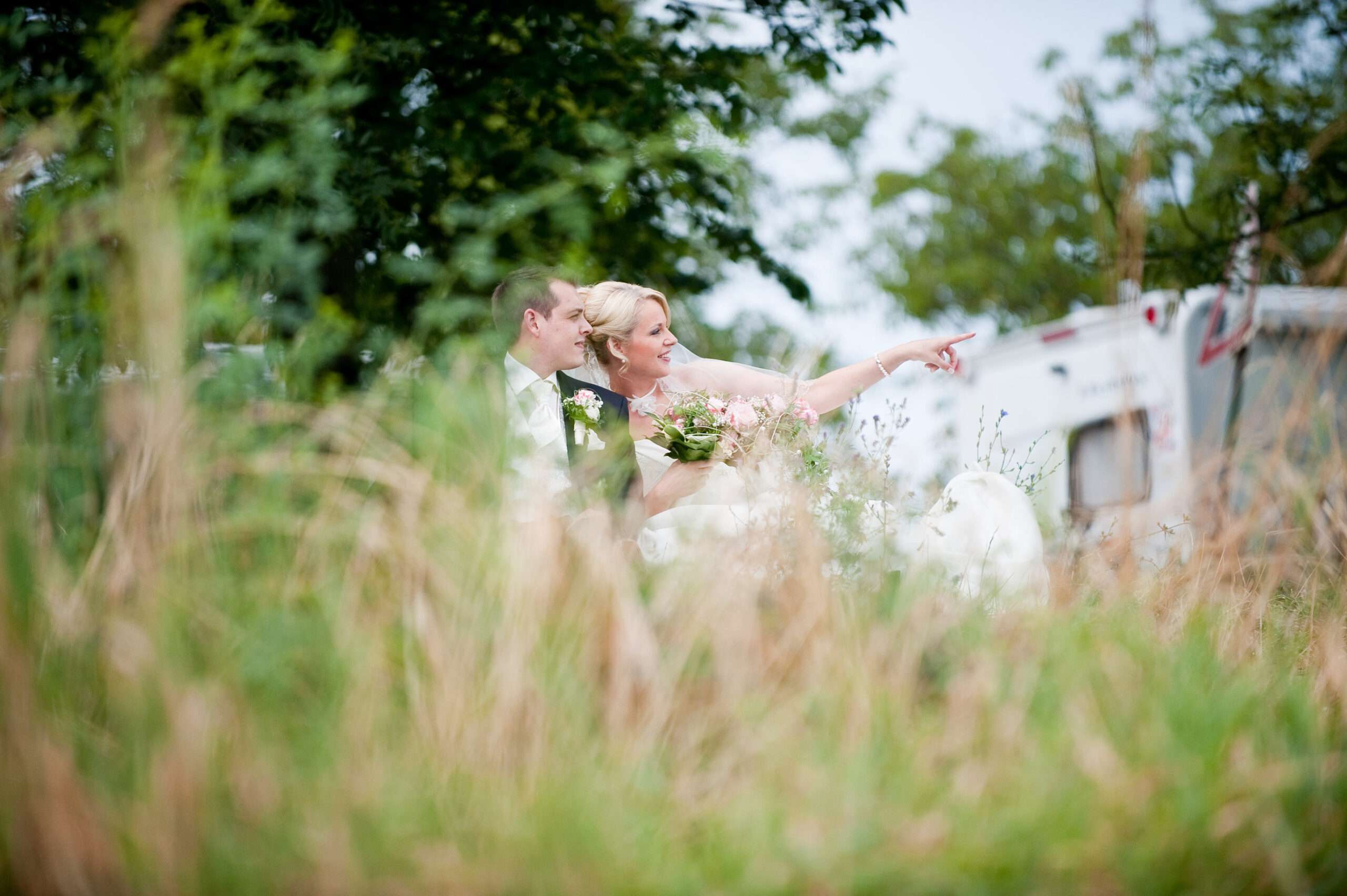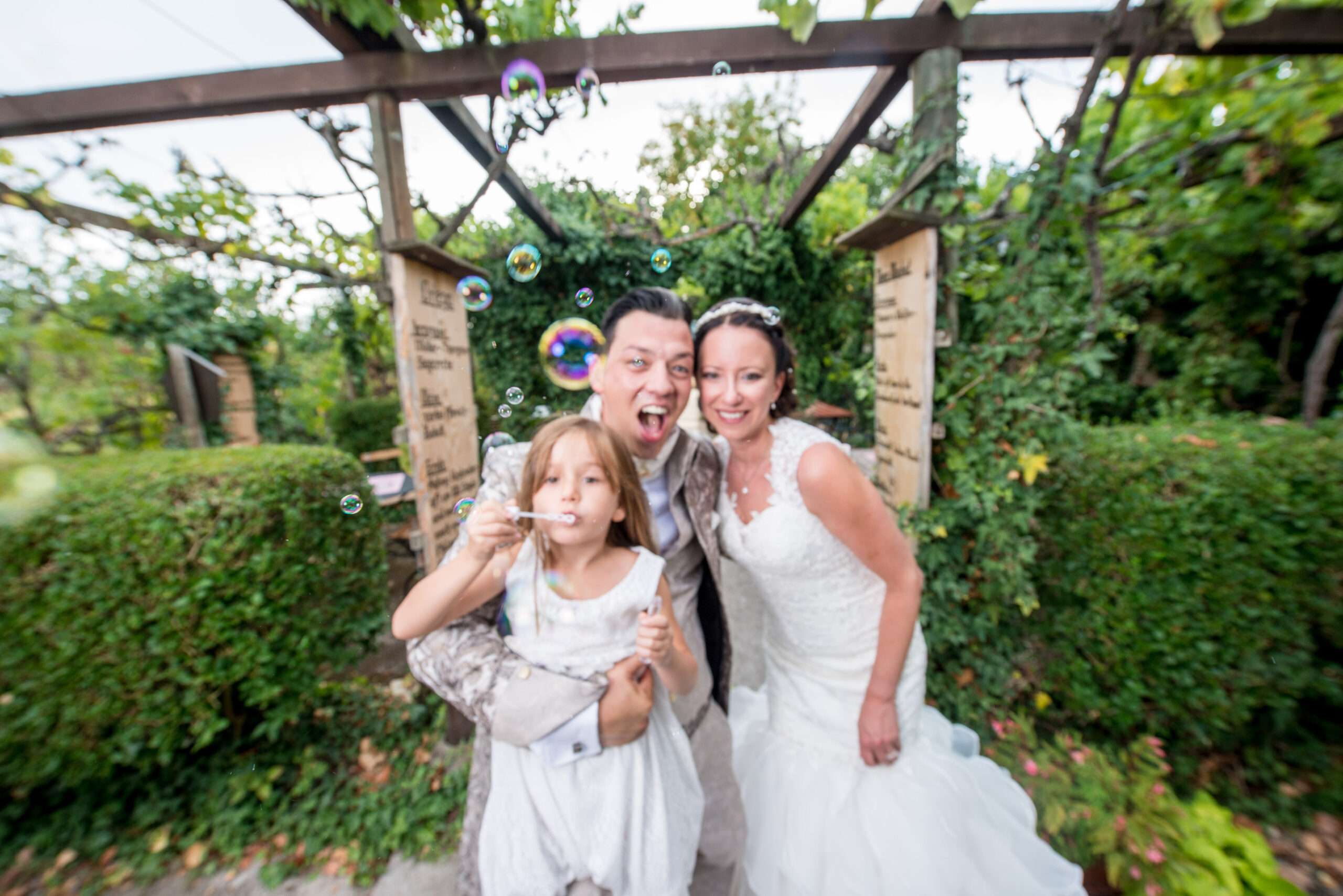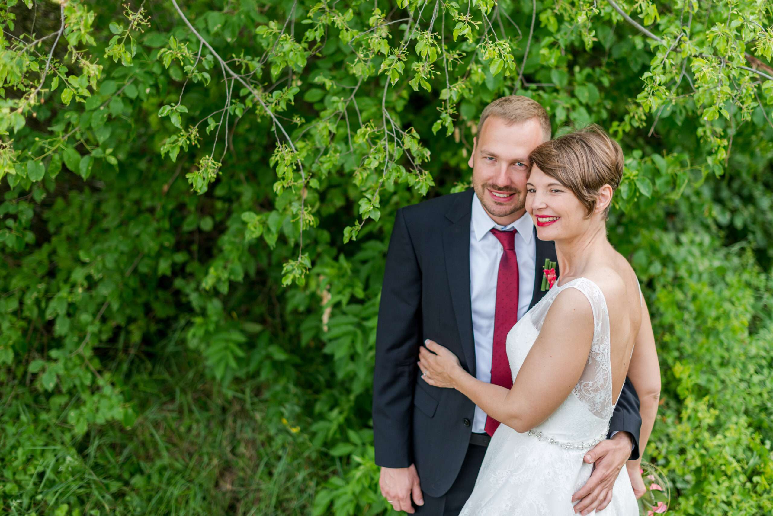 Brautpaar im grünen Gartenbereich mit Holzschild