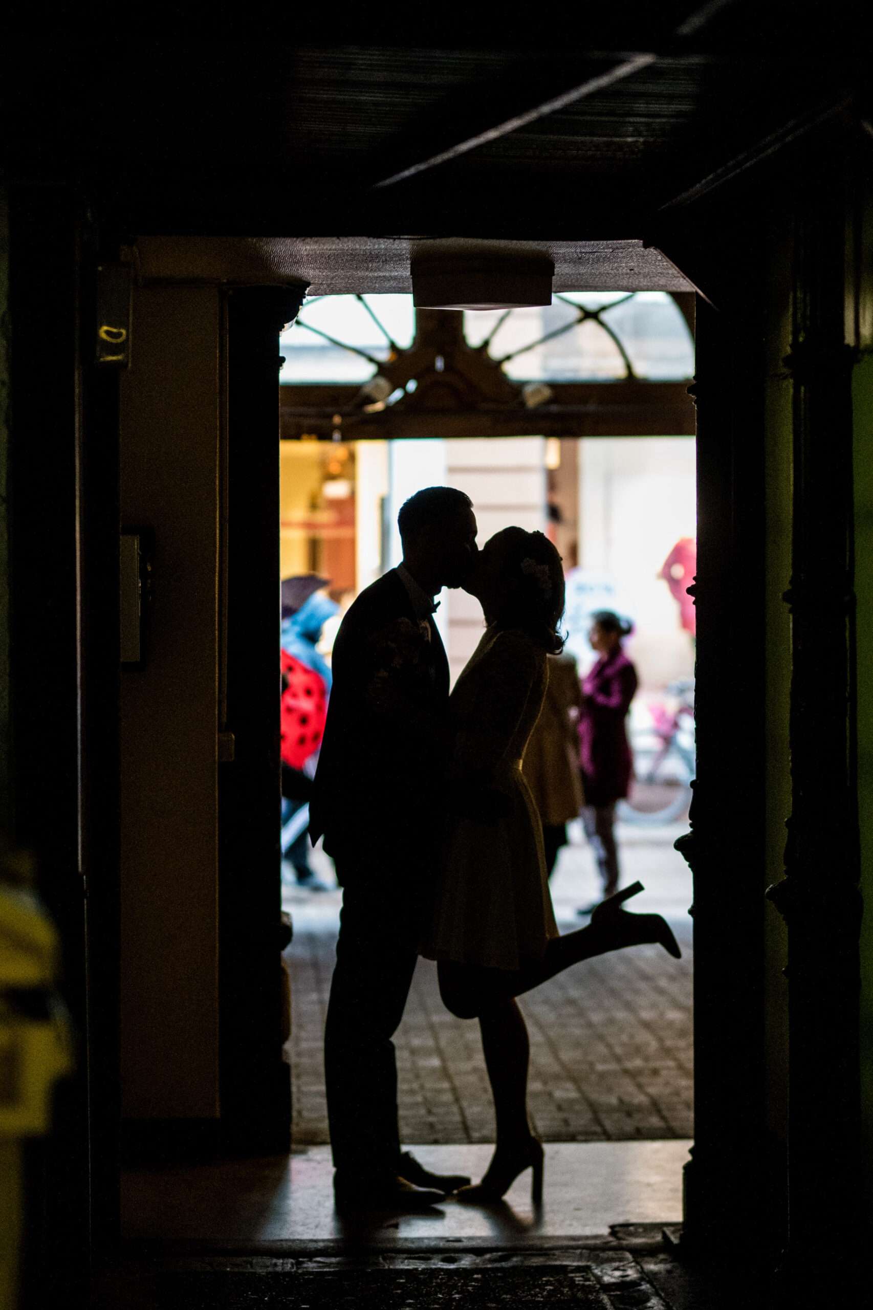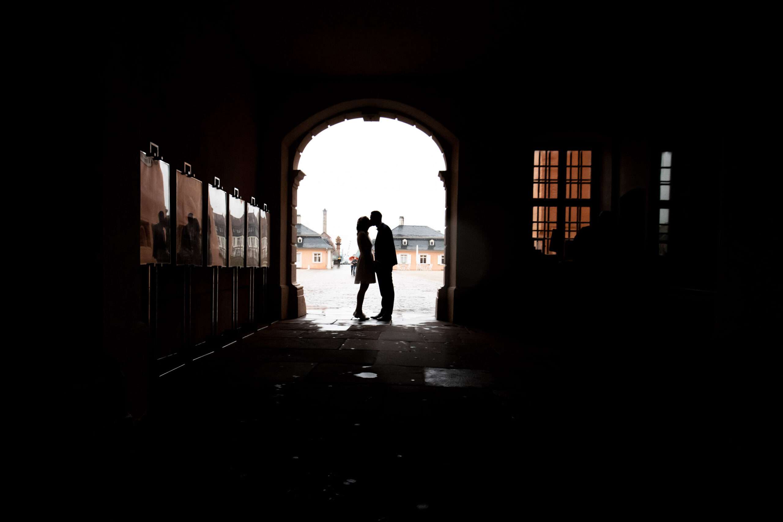 Silhouette eines küssenden Paares im Torbogen