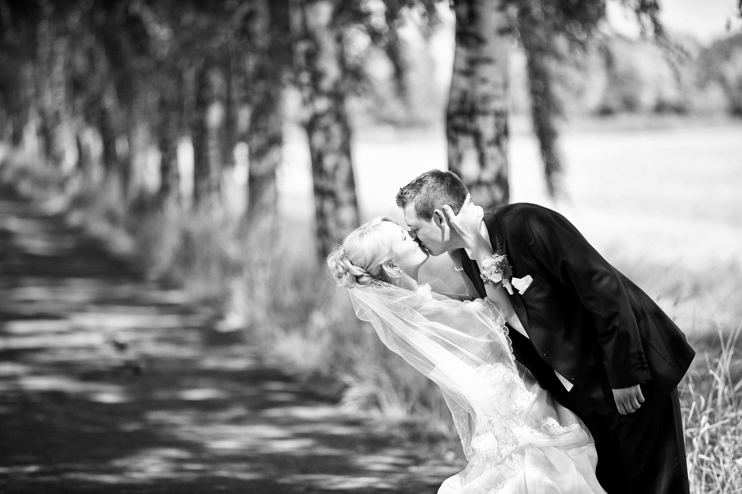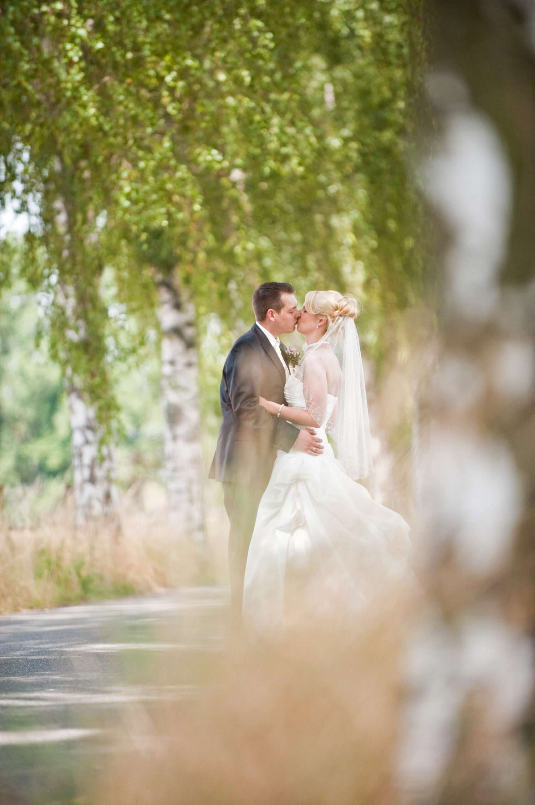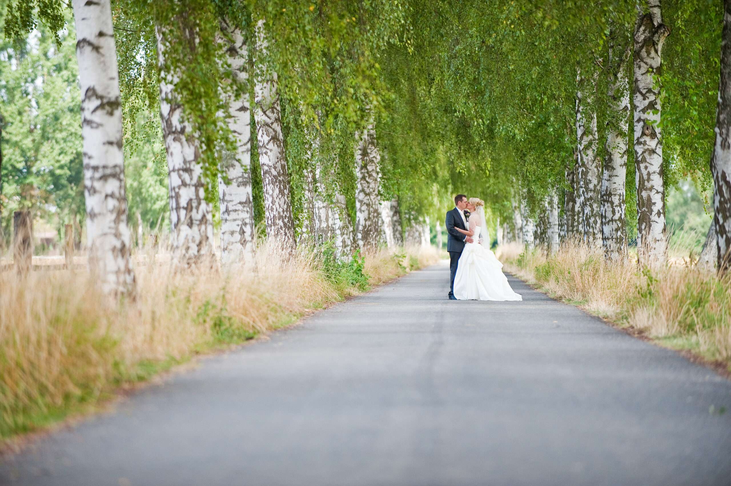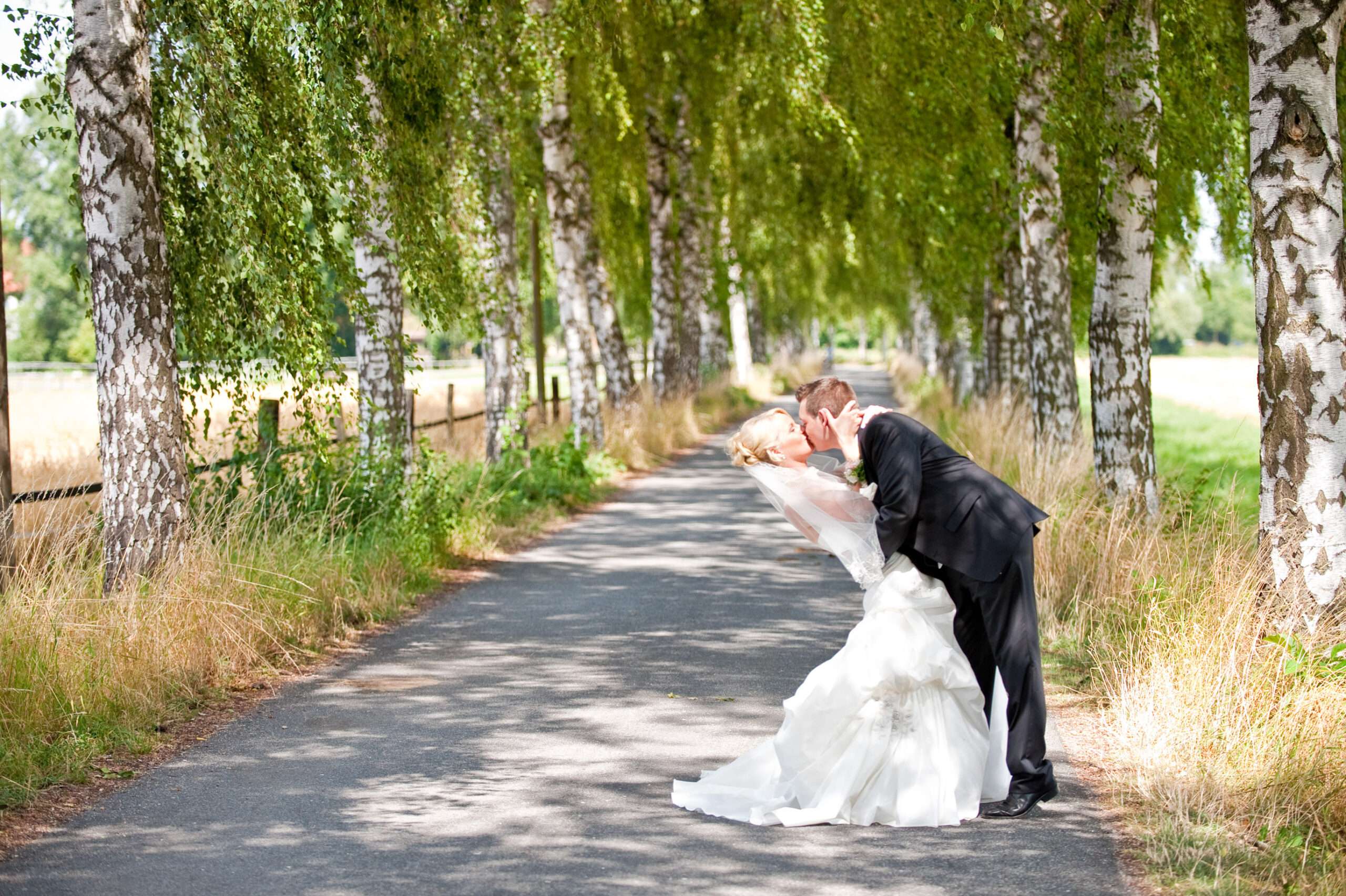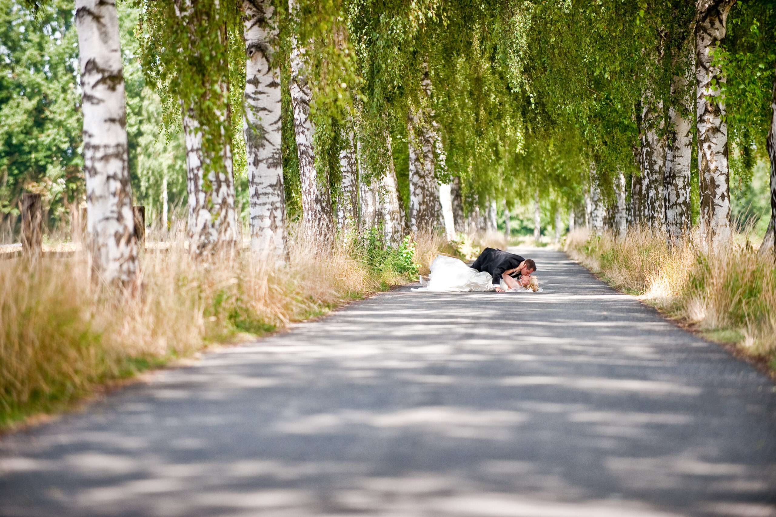 Brautpaar unter Birkenallee am Hochzeitstag