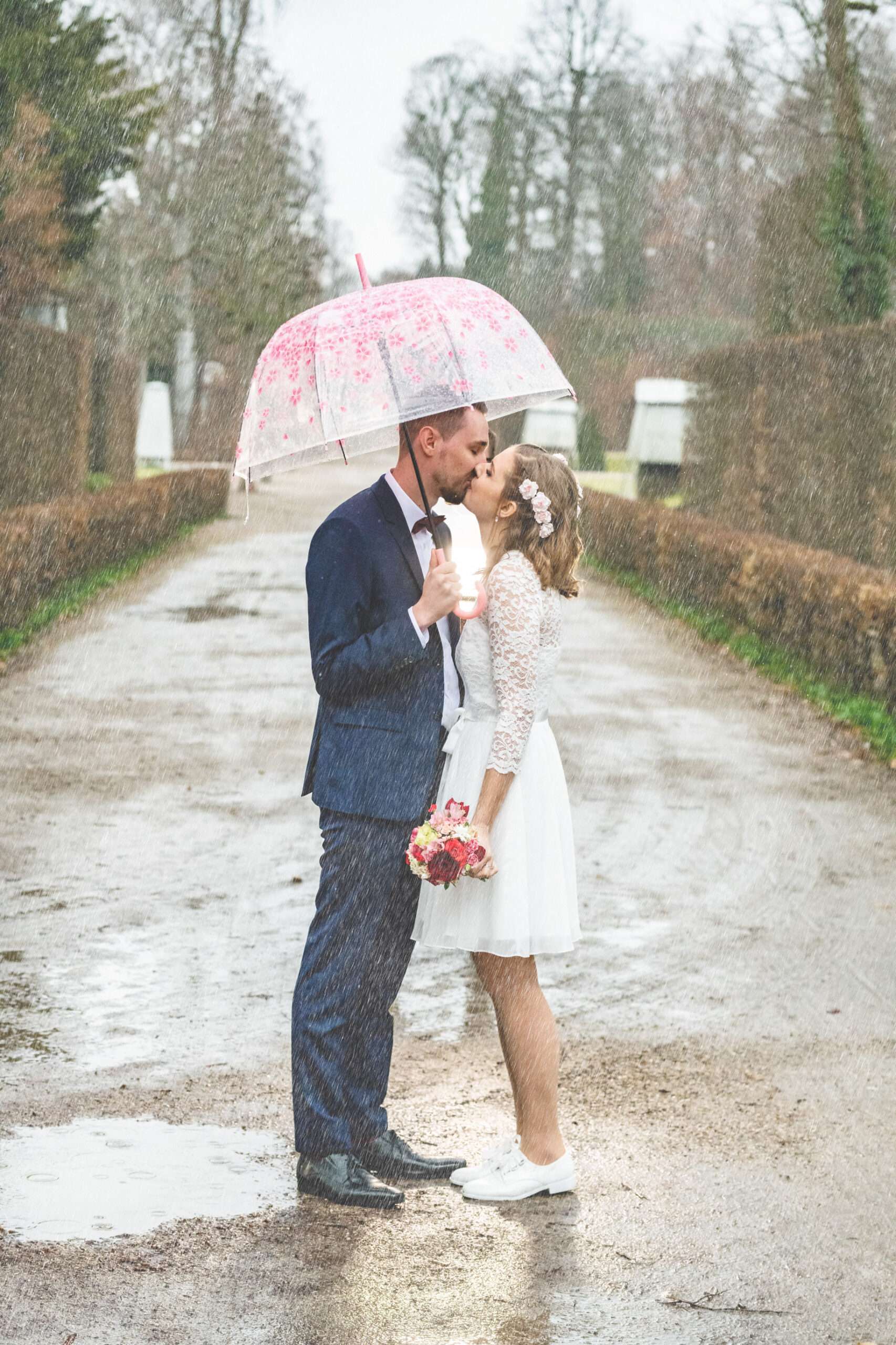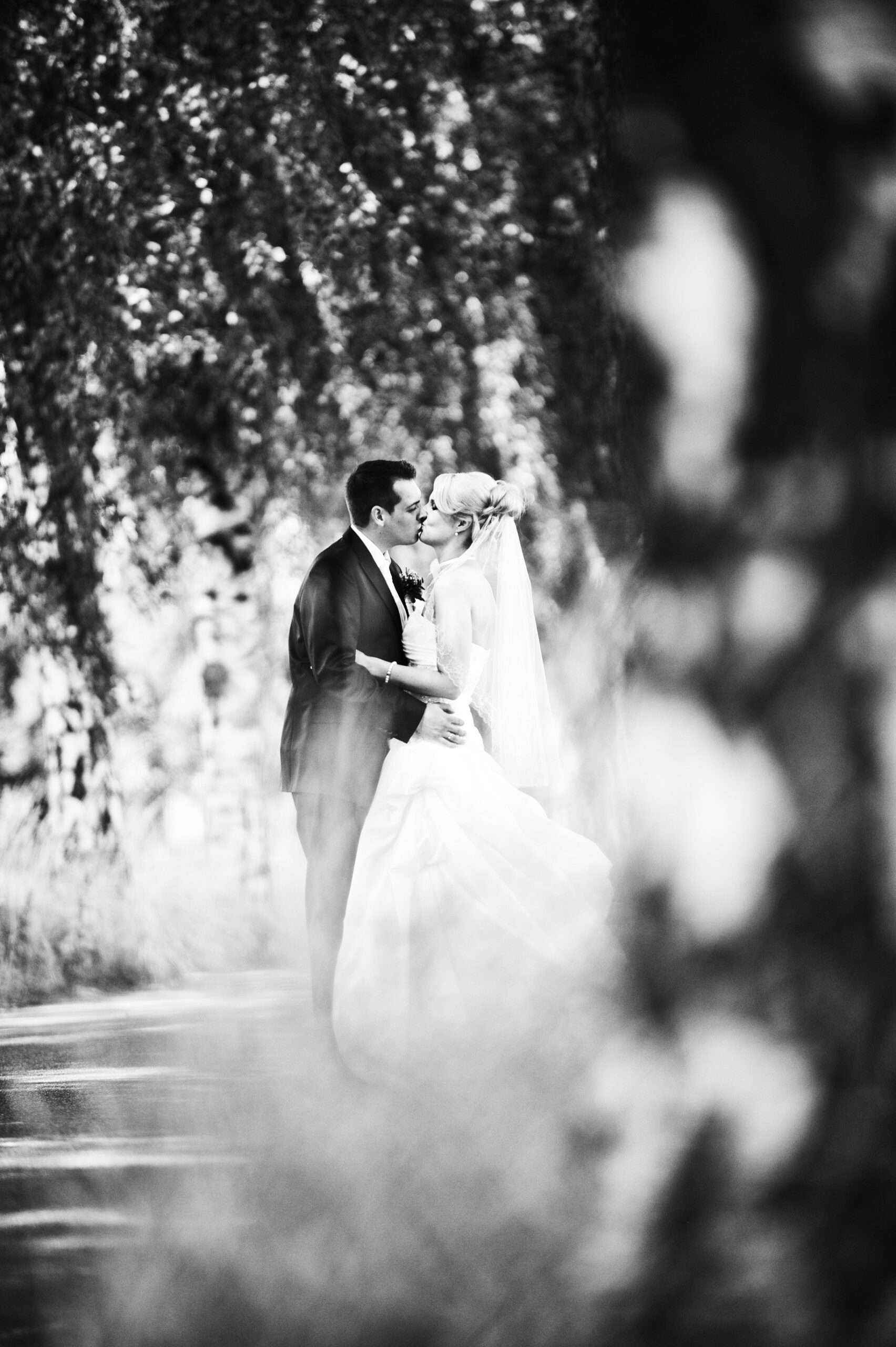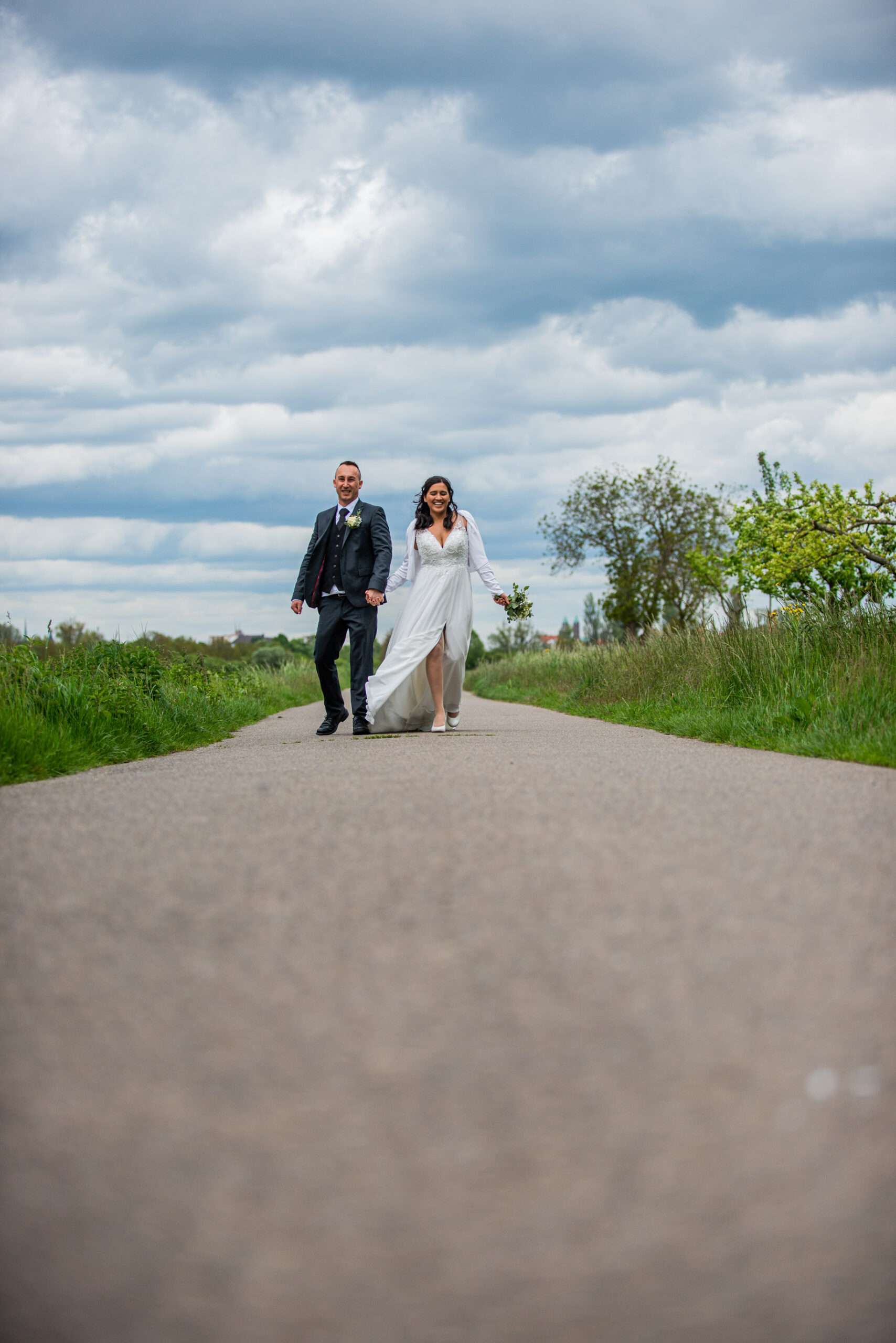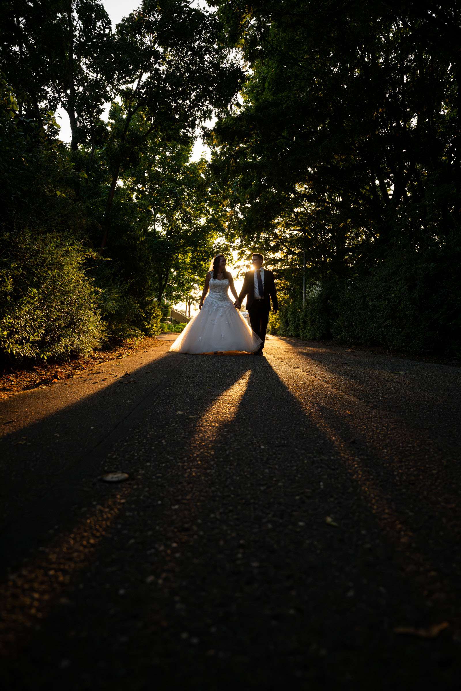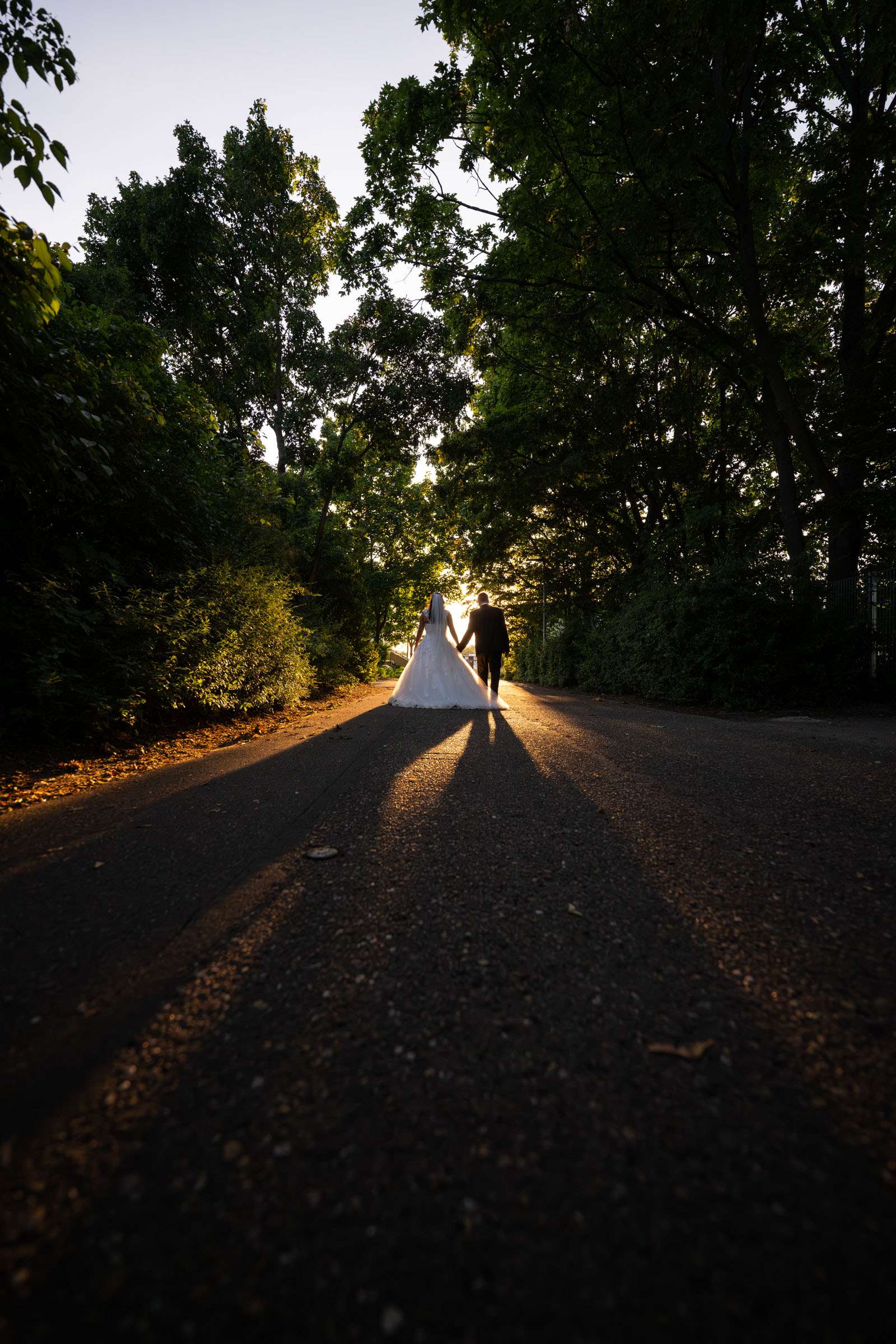 Brautpaar unter Birkenallee am Hochzeitstag