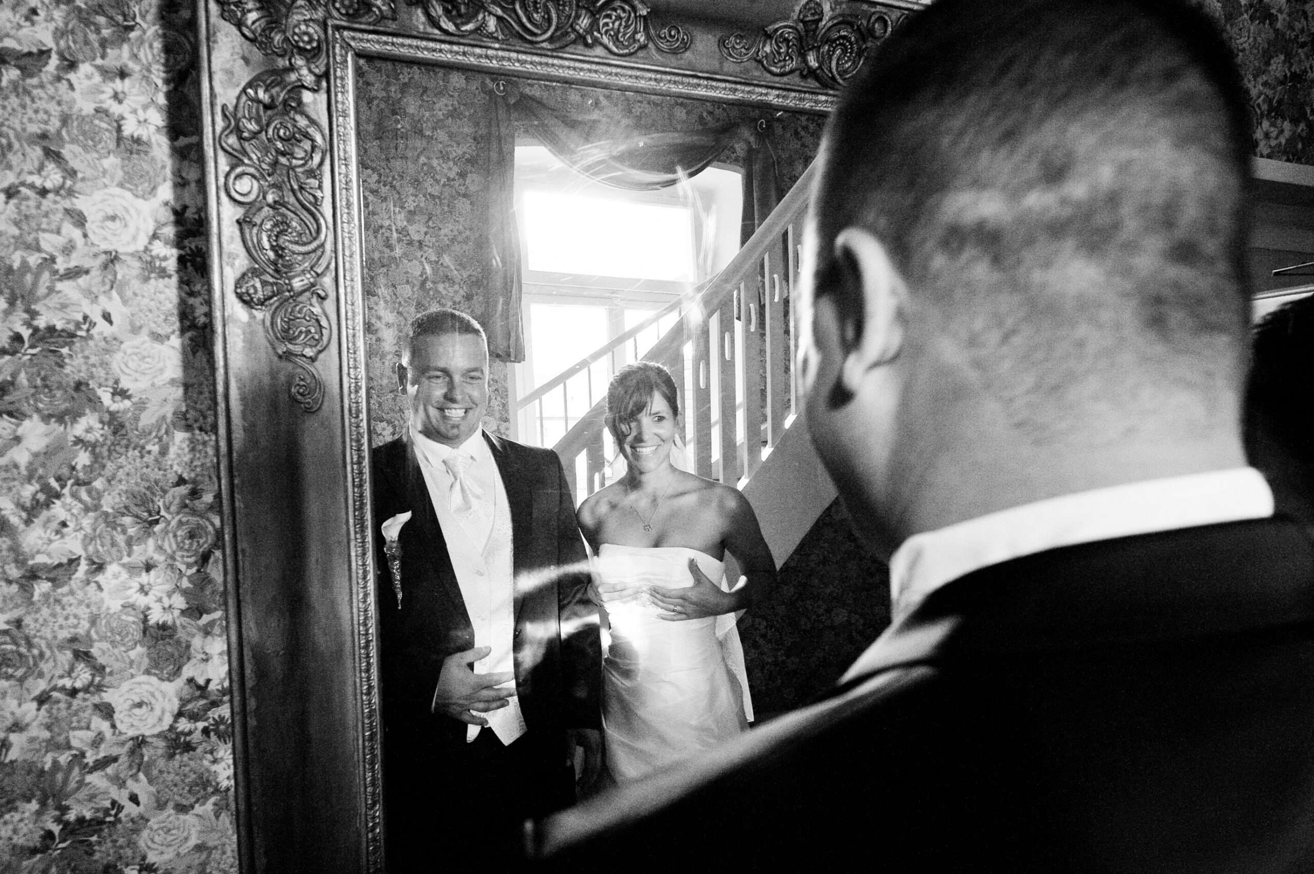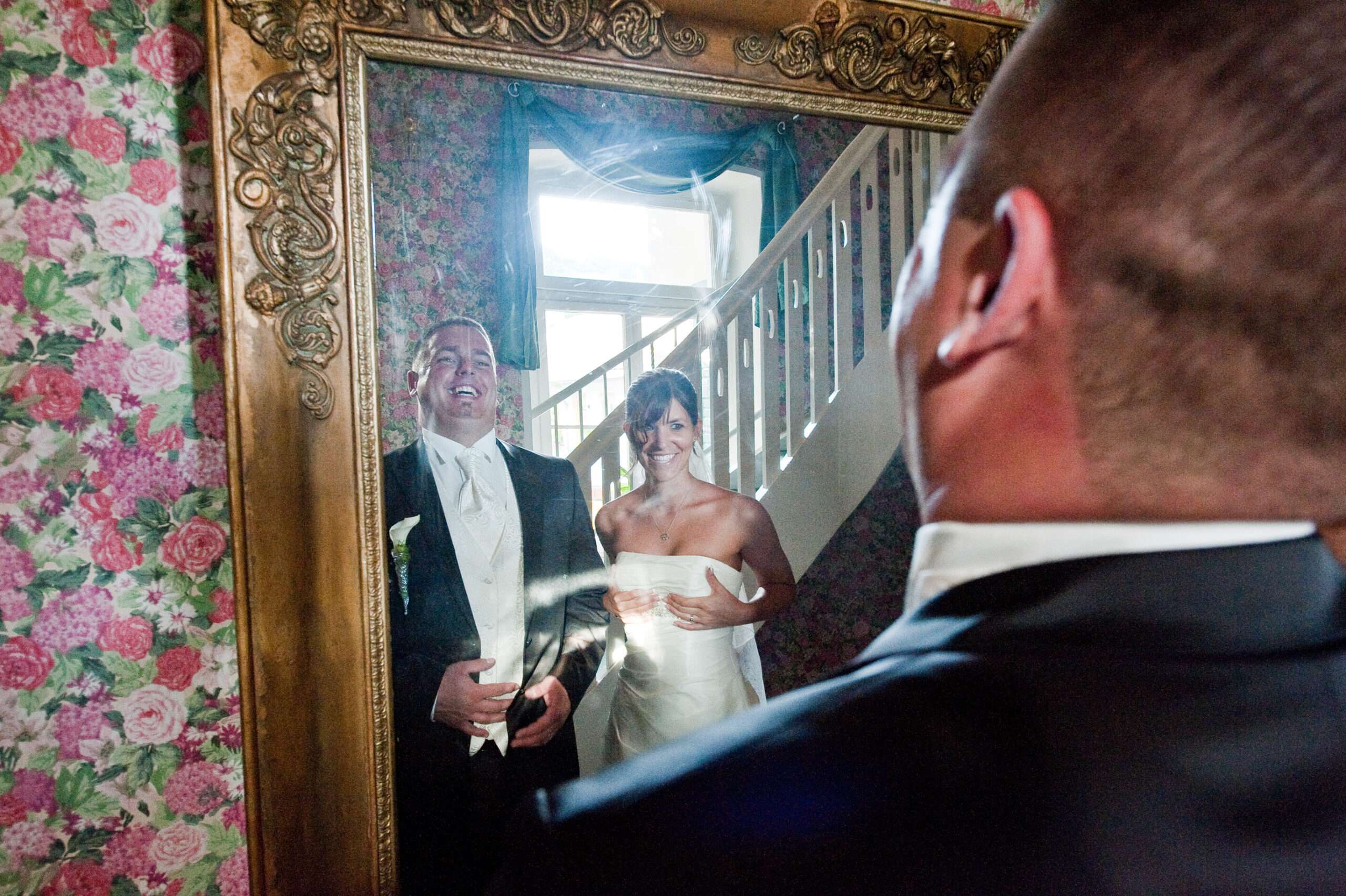 Lachendes Paar vor einem großen Spiegel