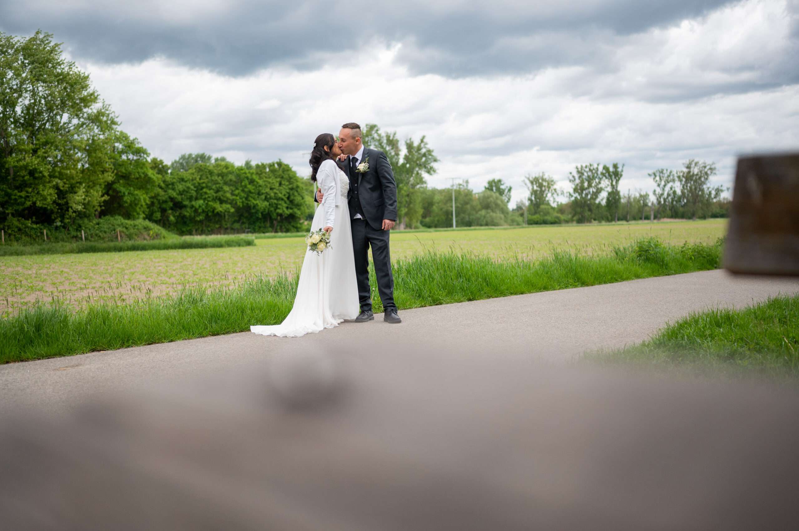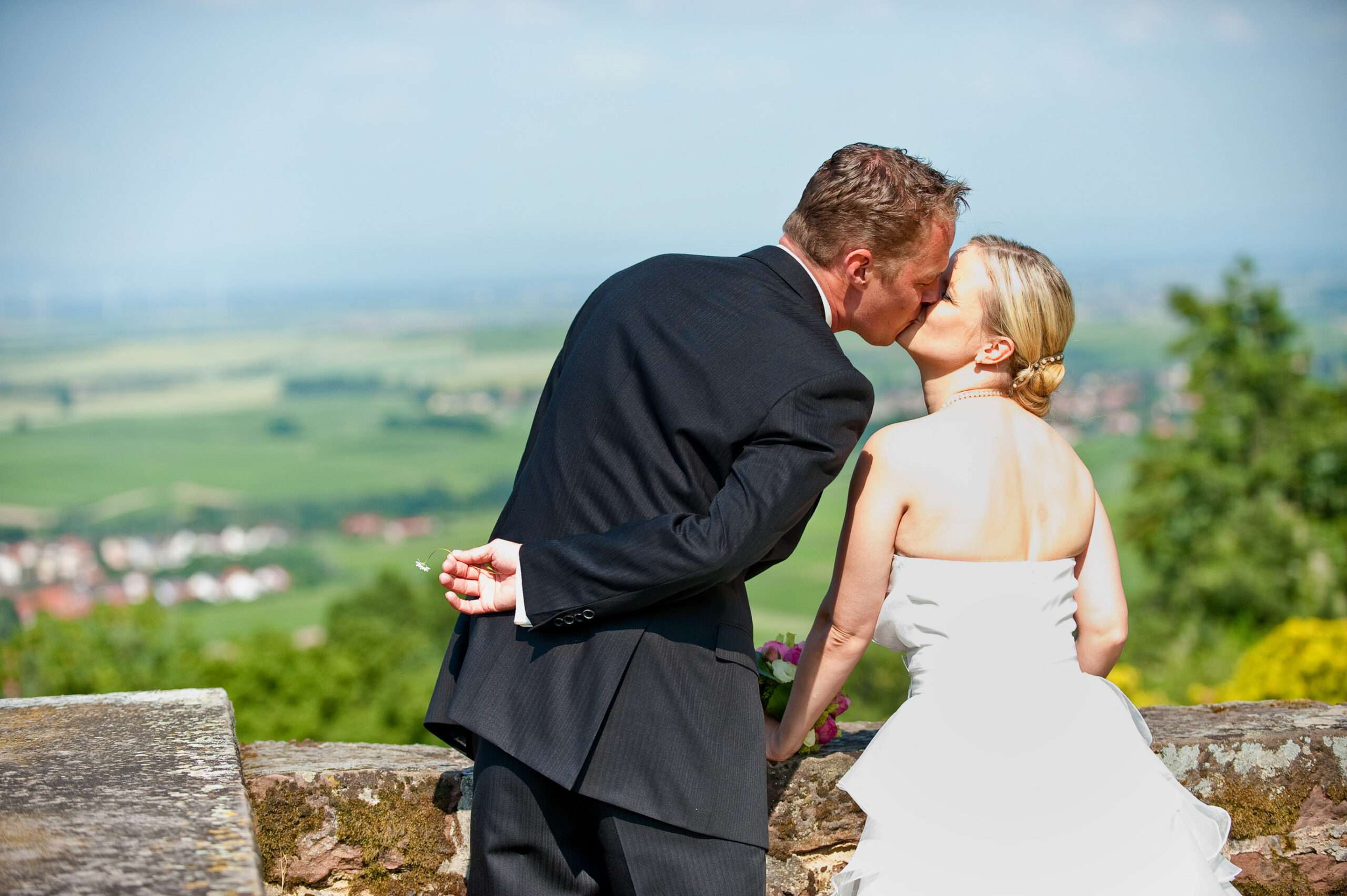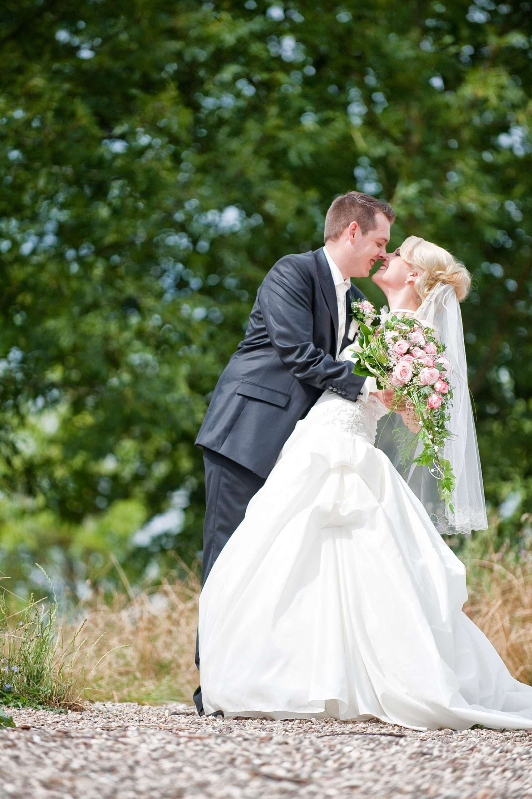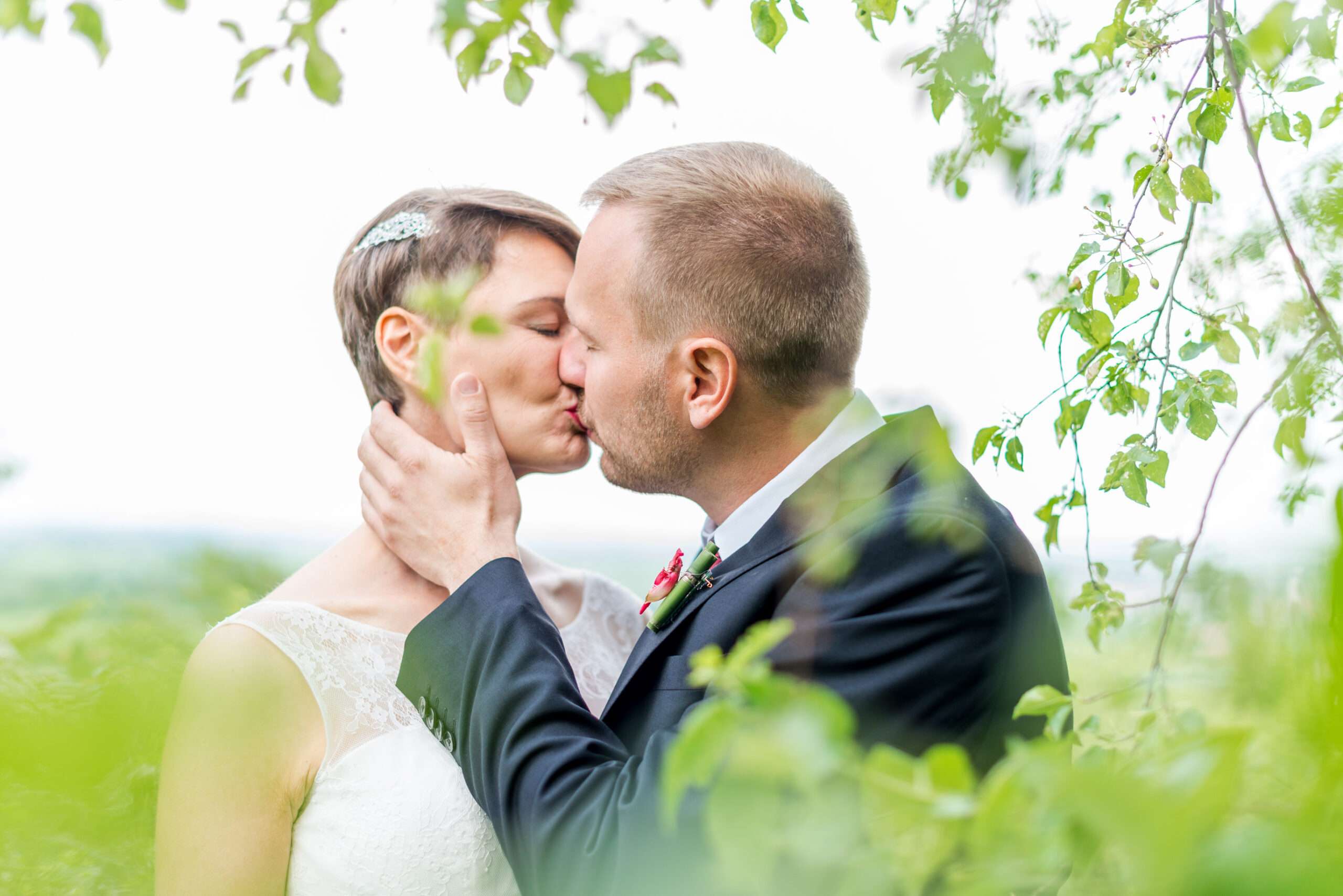 Brautpaar küsst sich in romantischer Landschaft