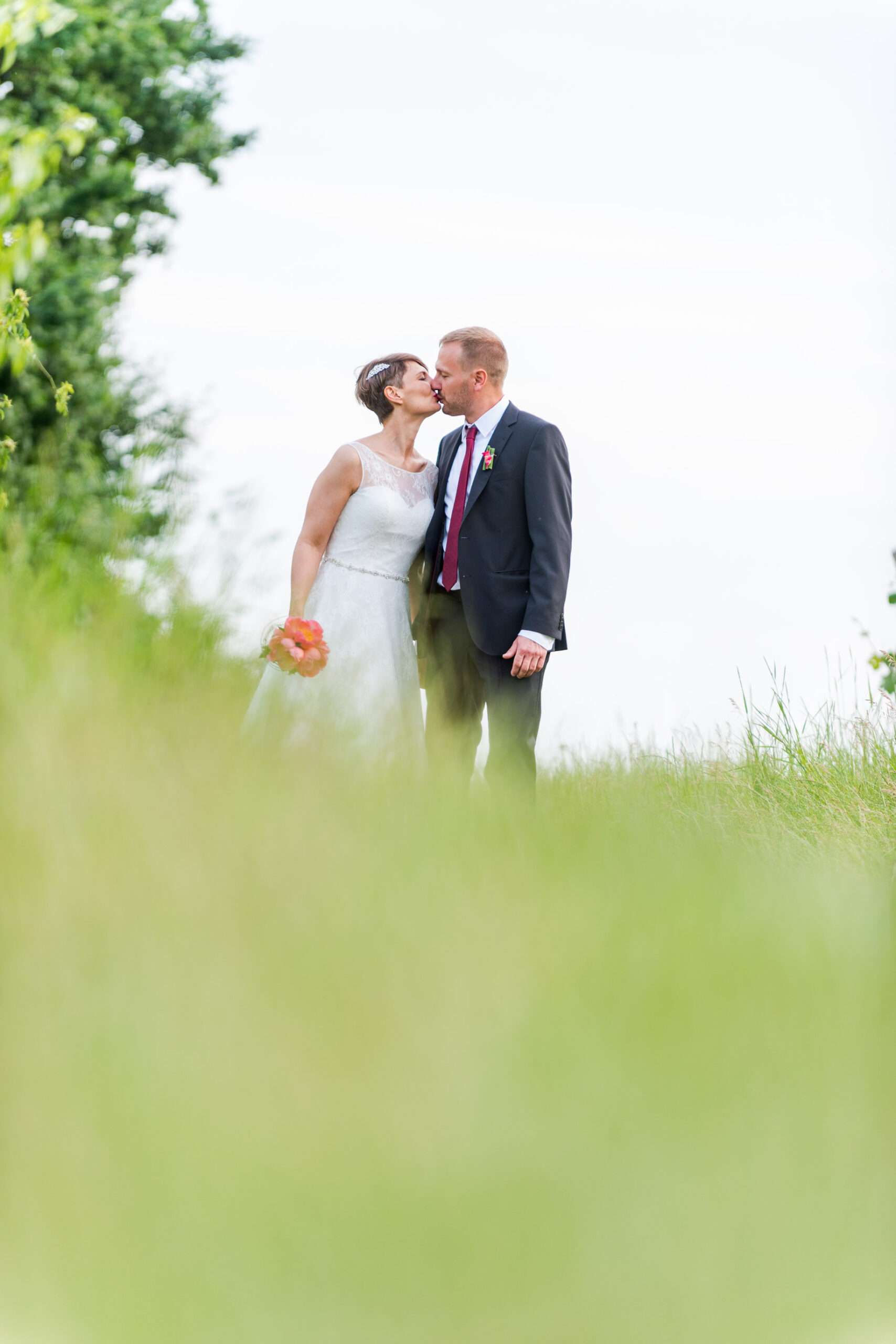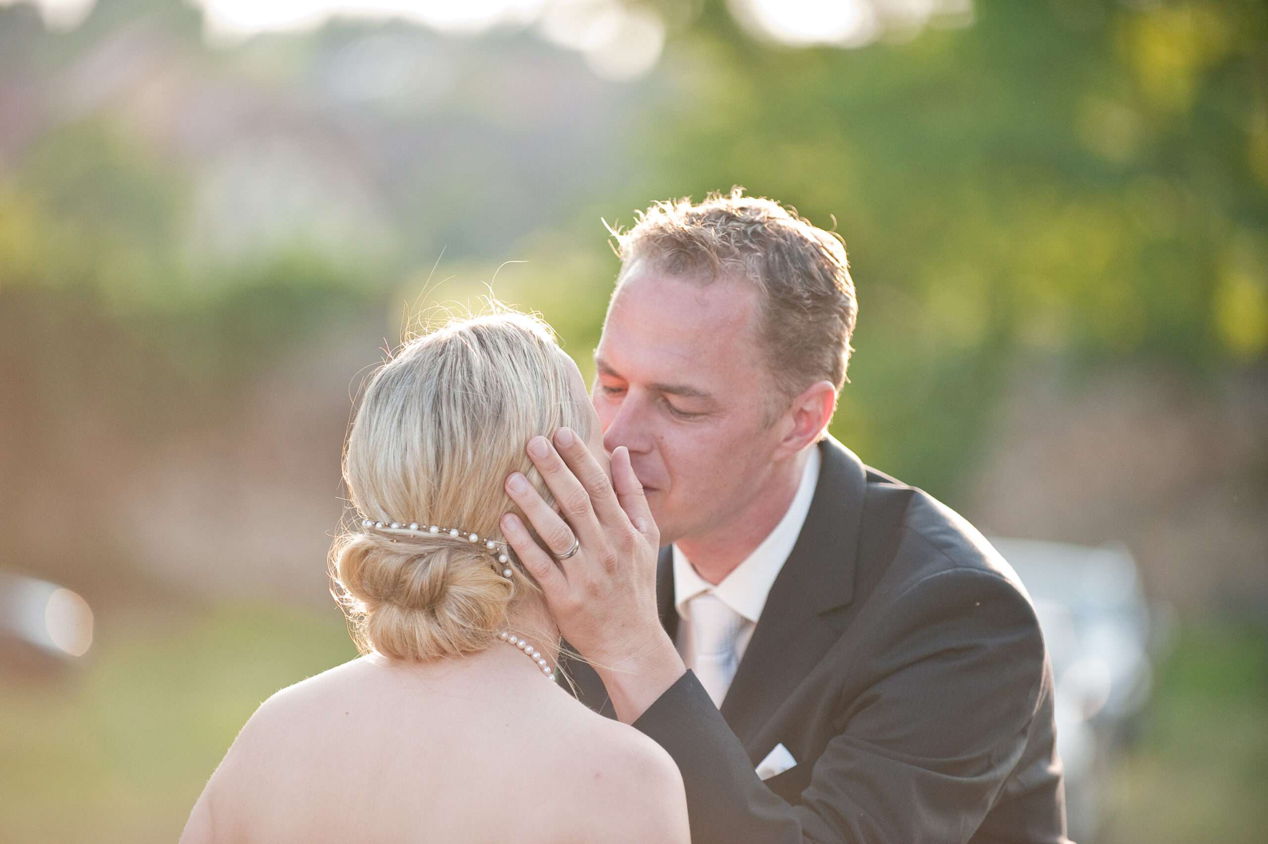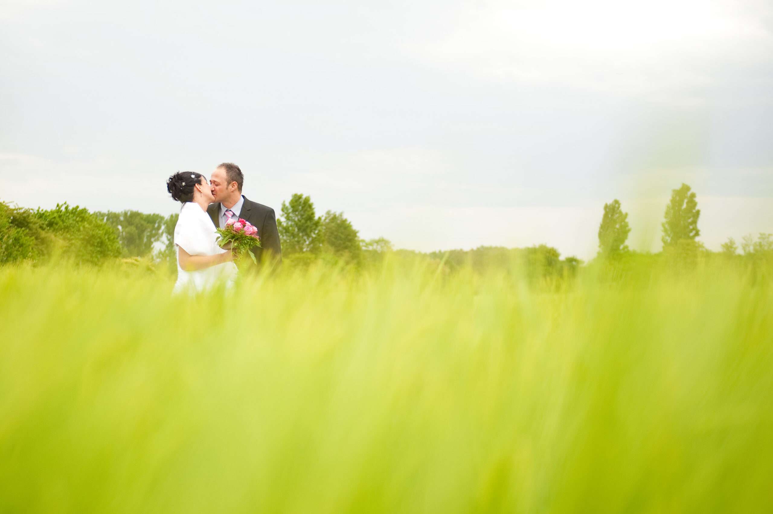 Brautpaar küsst sich in romantischer Landschaft