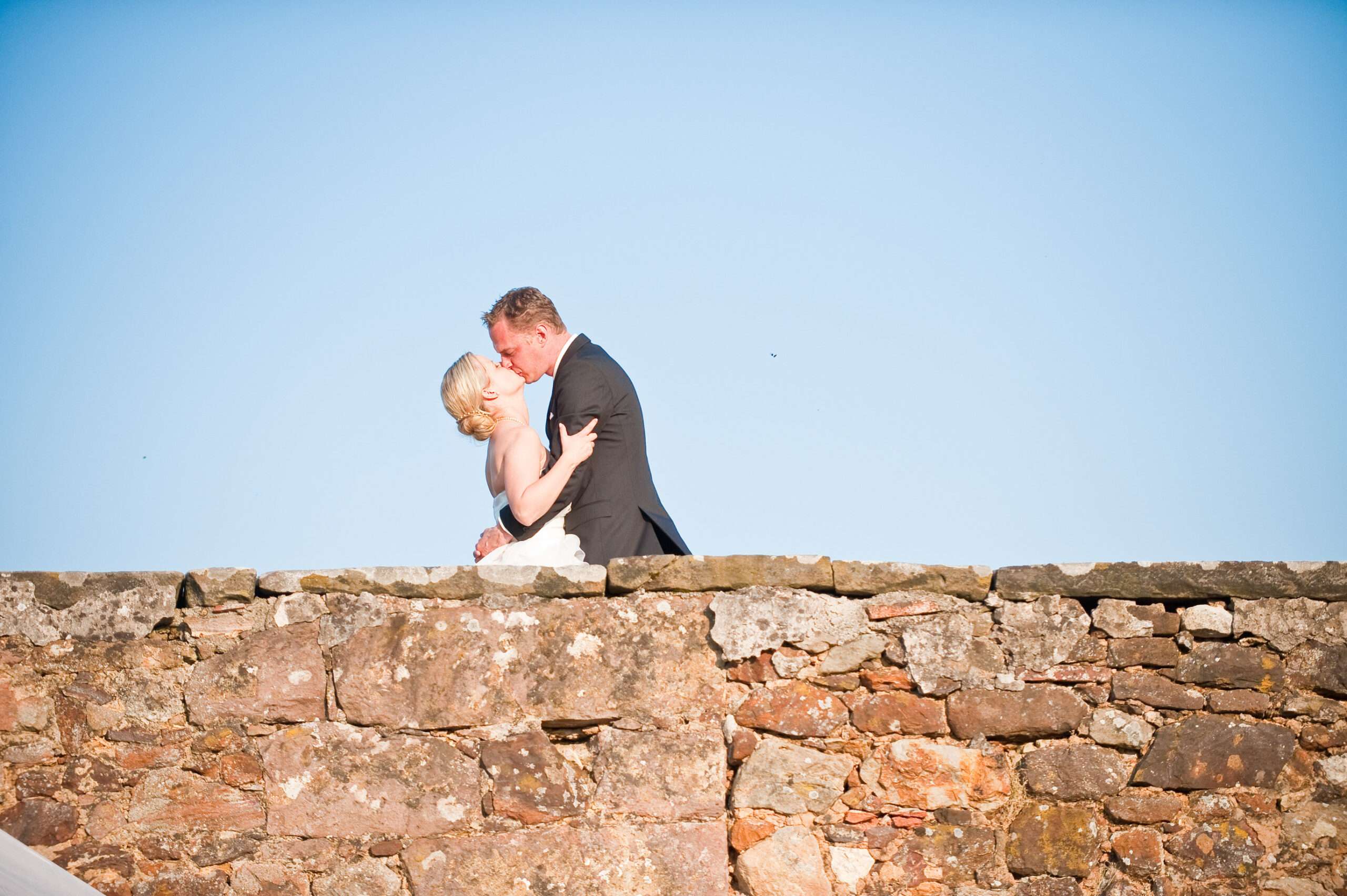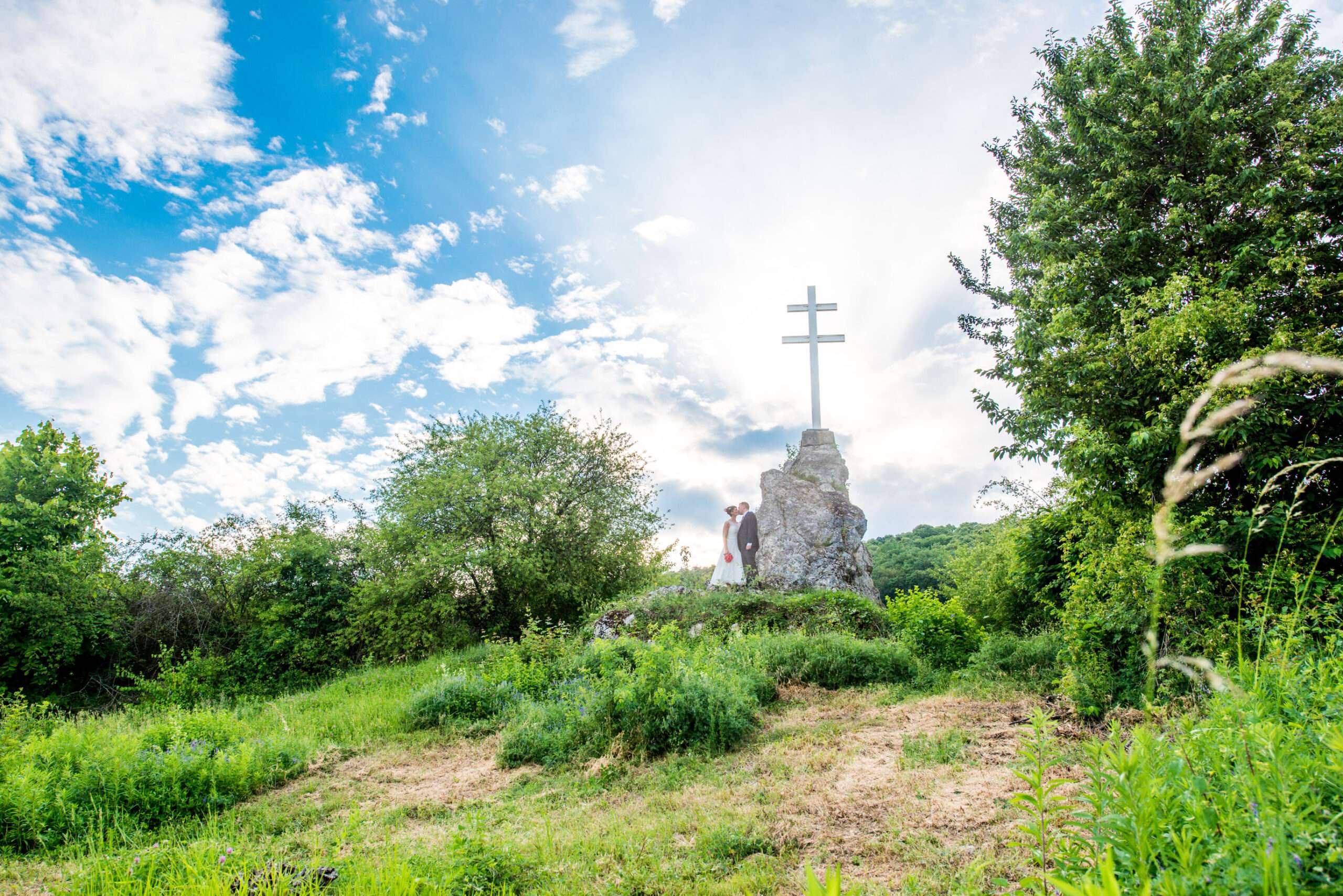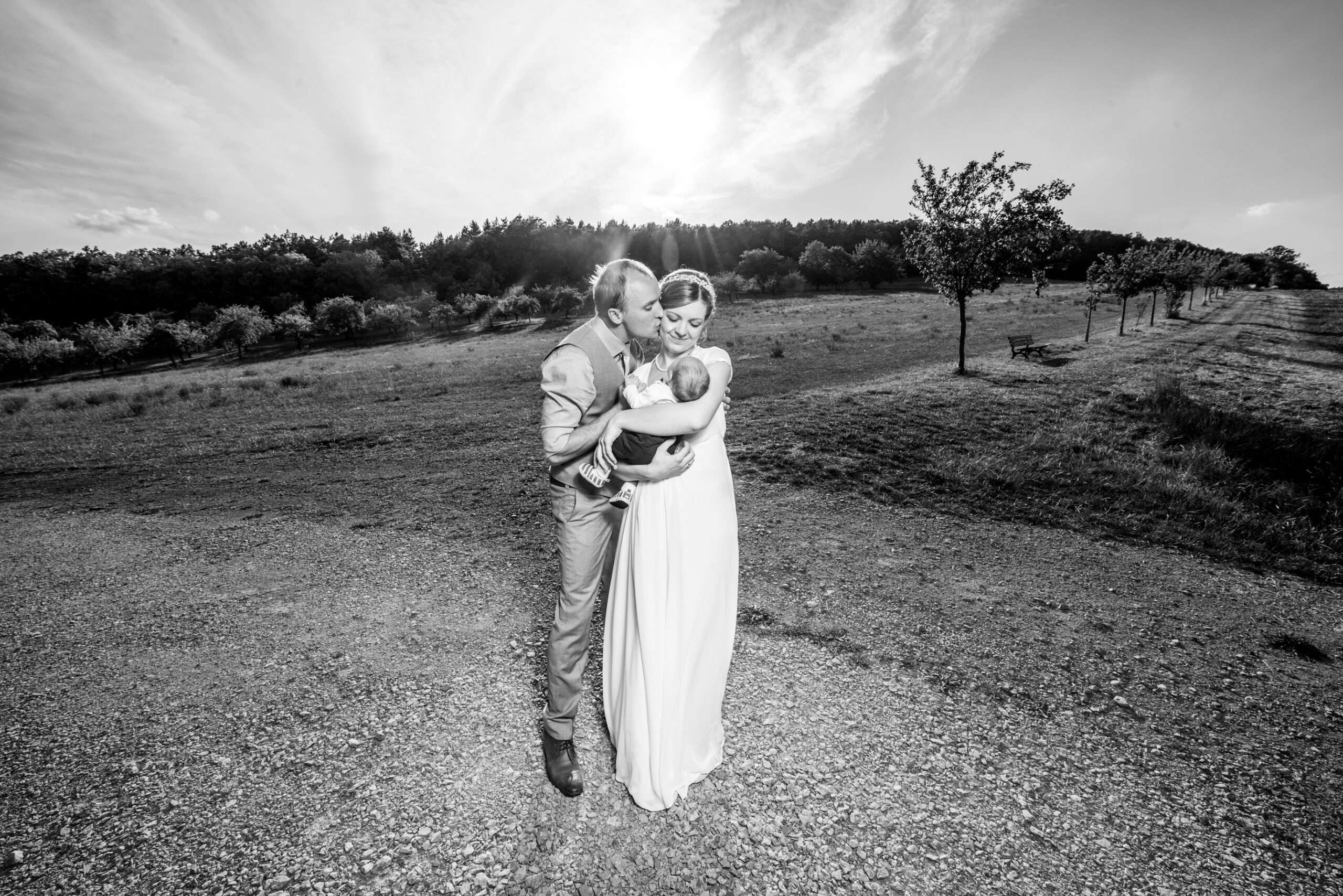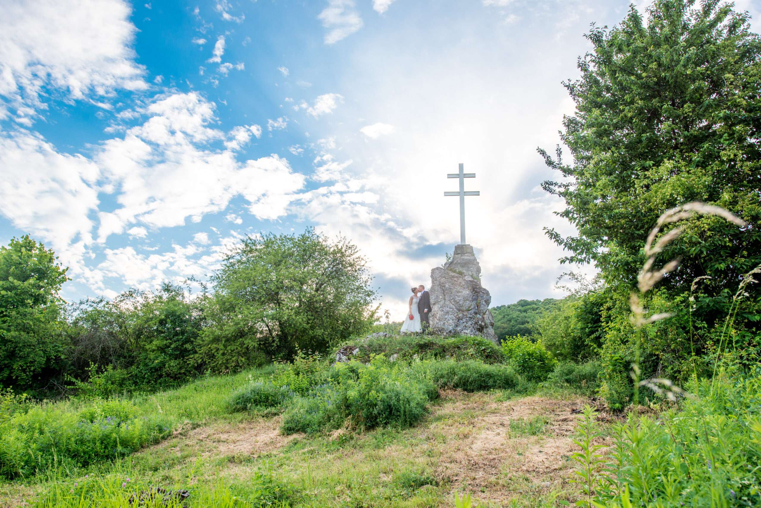 Brautpaar küsst sich in romantischer Landschaft
