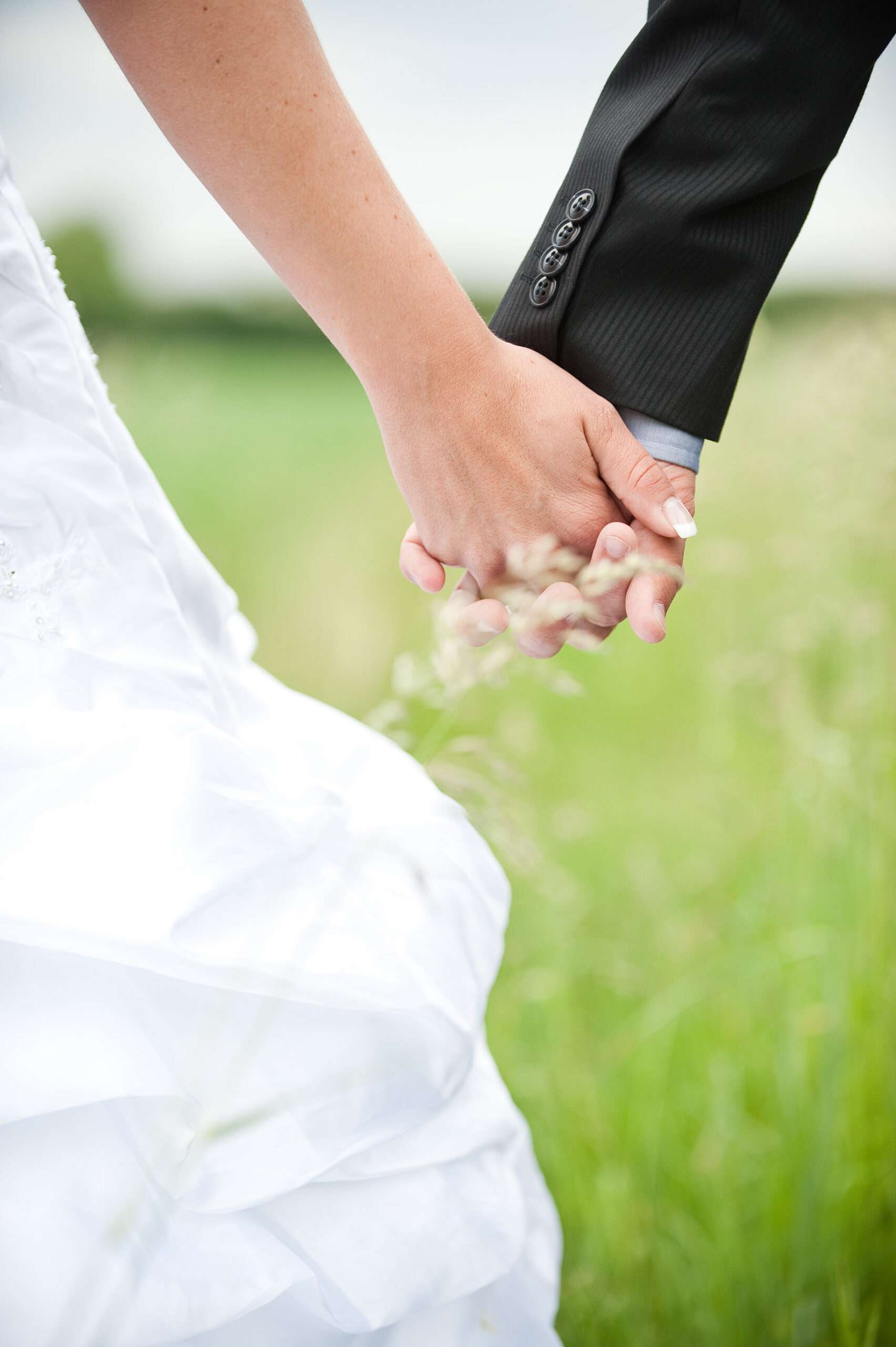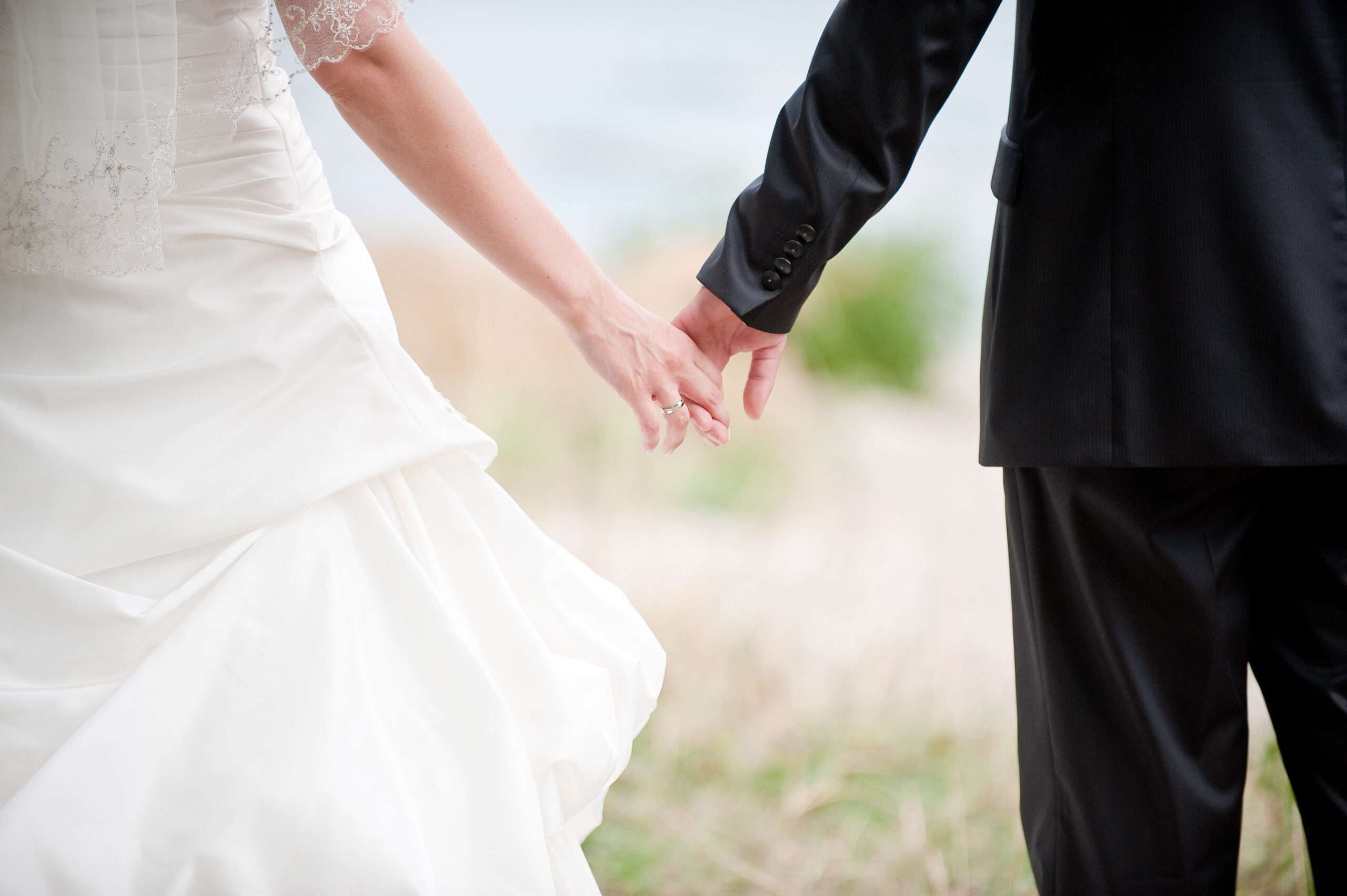 Brautpaar hält sich an der Wand die Hand