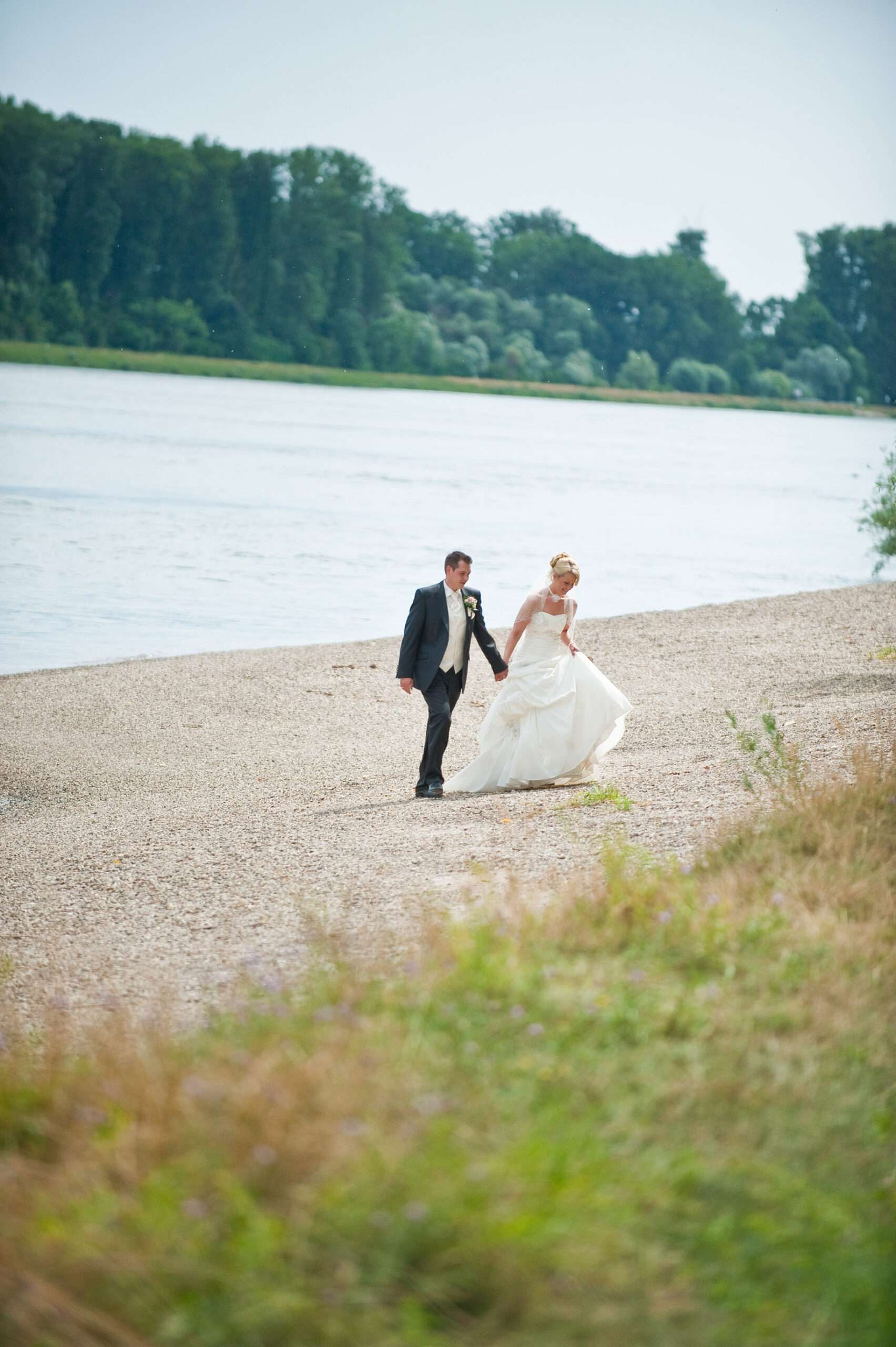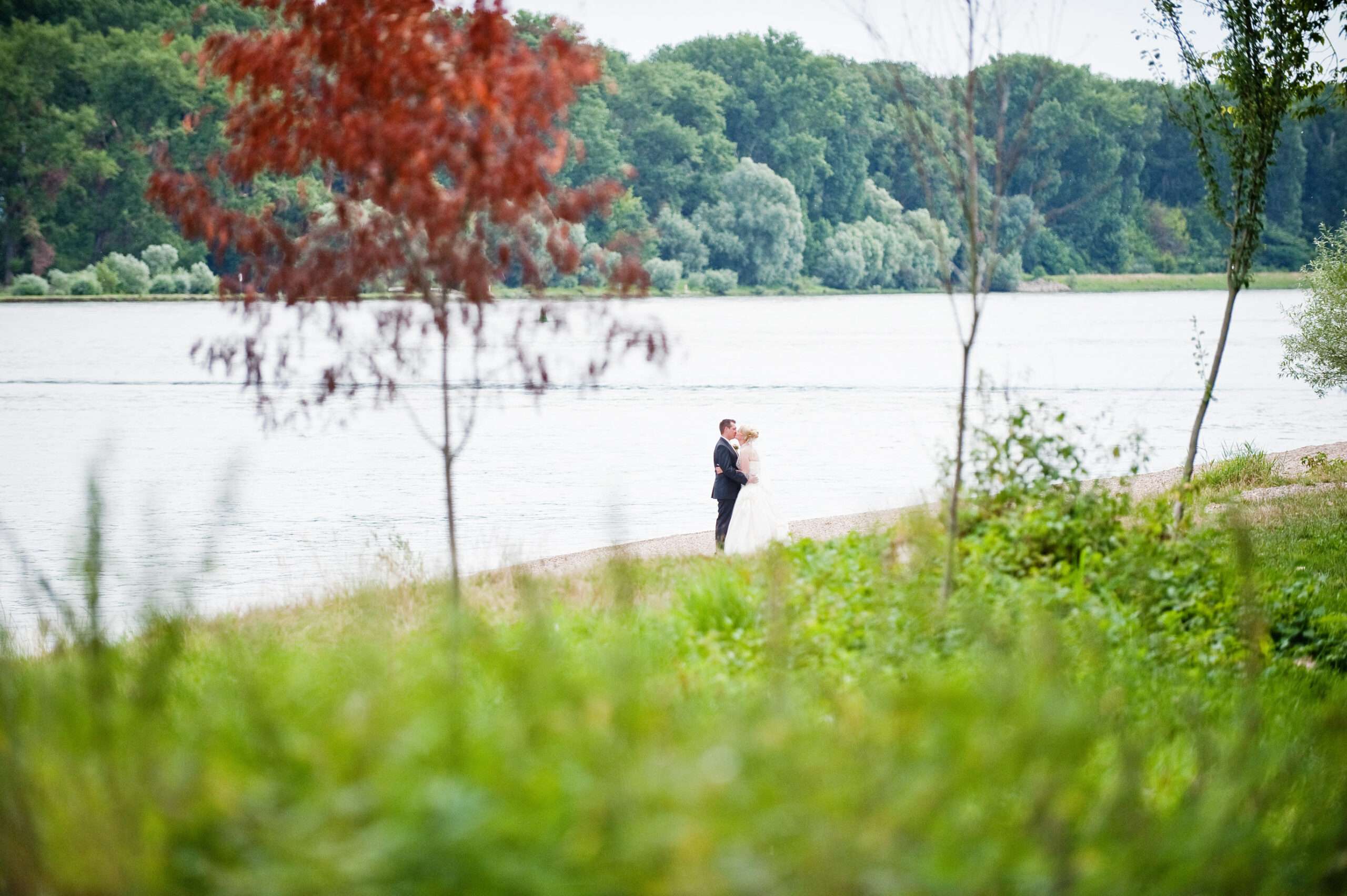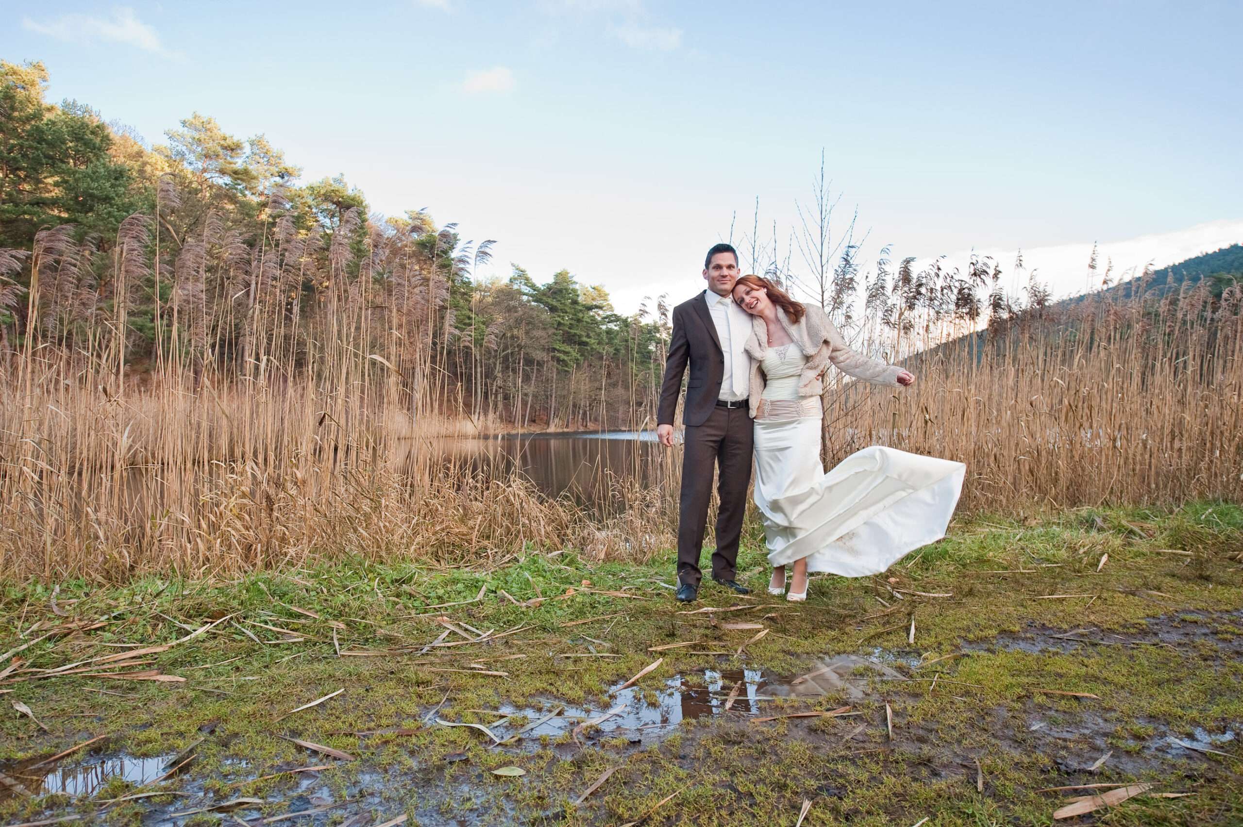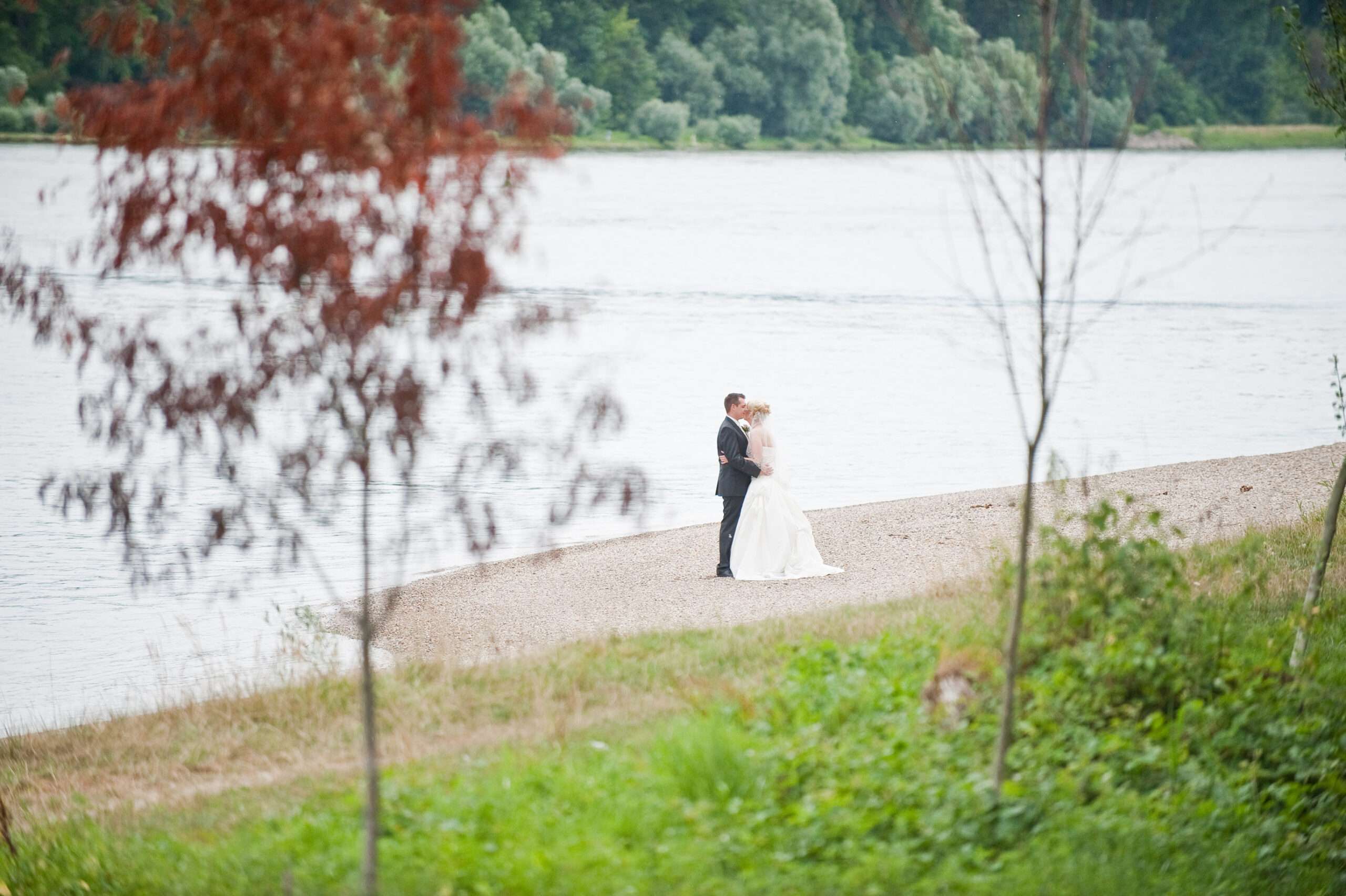 Paar in Hochzeitskleidung am Seeufer