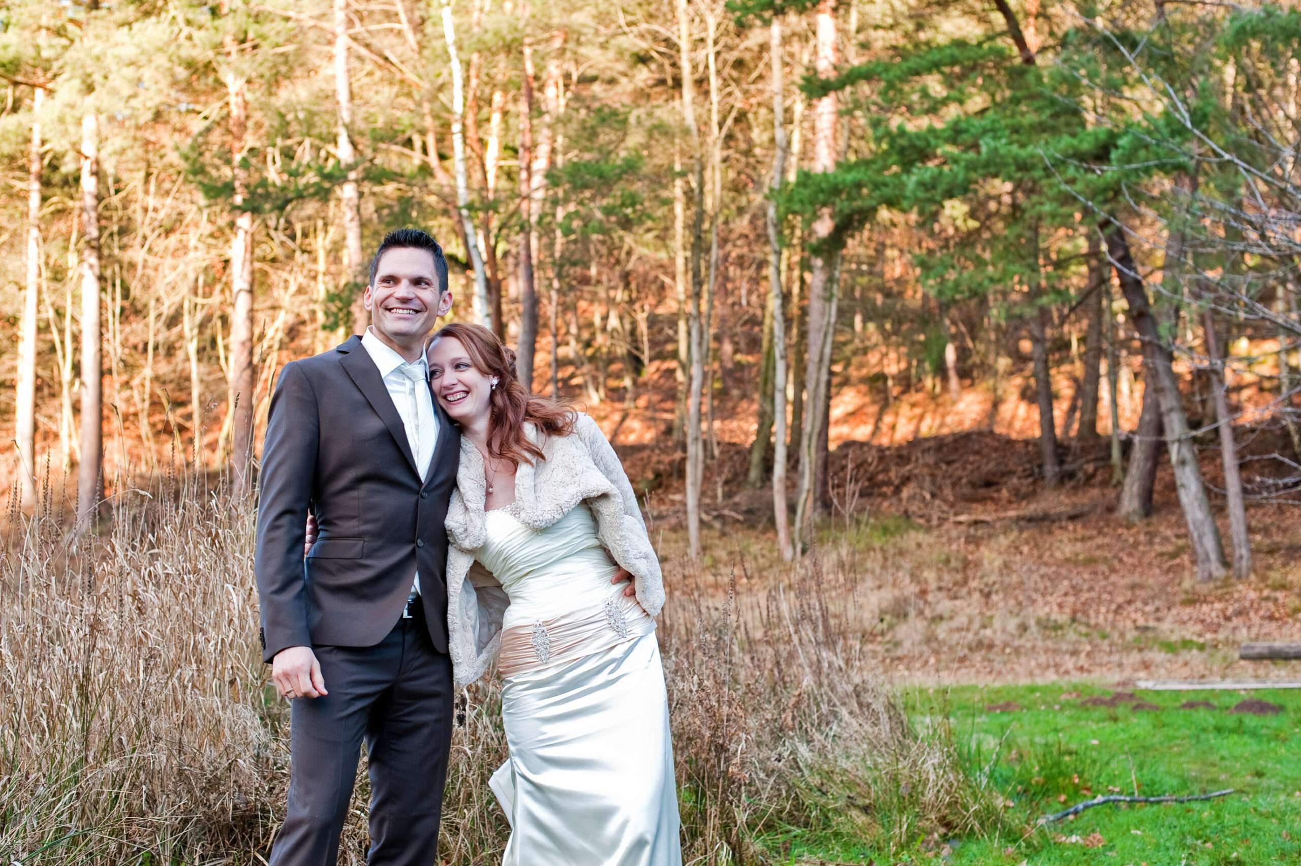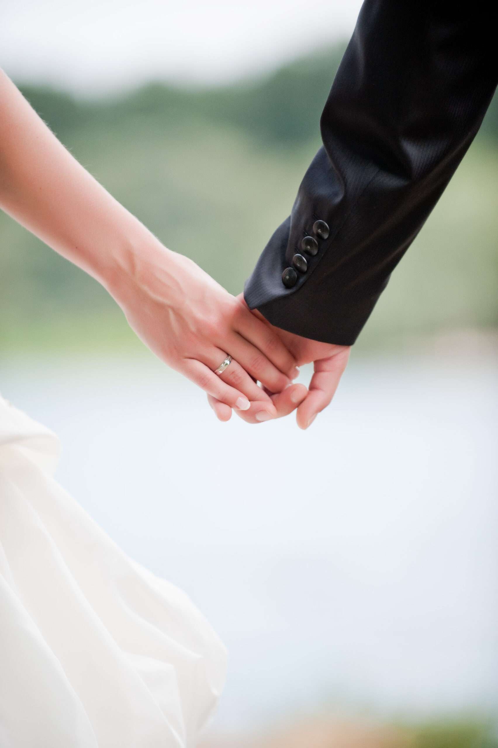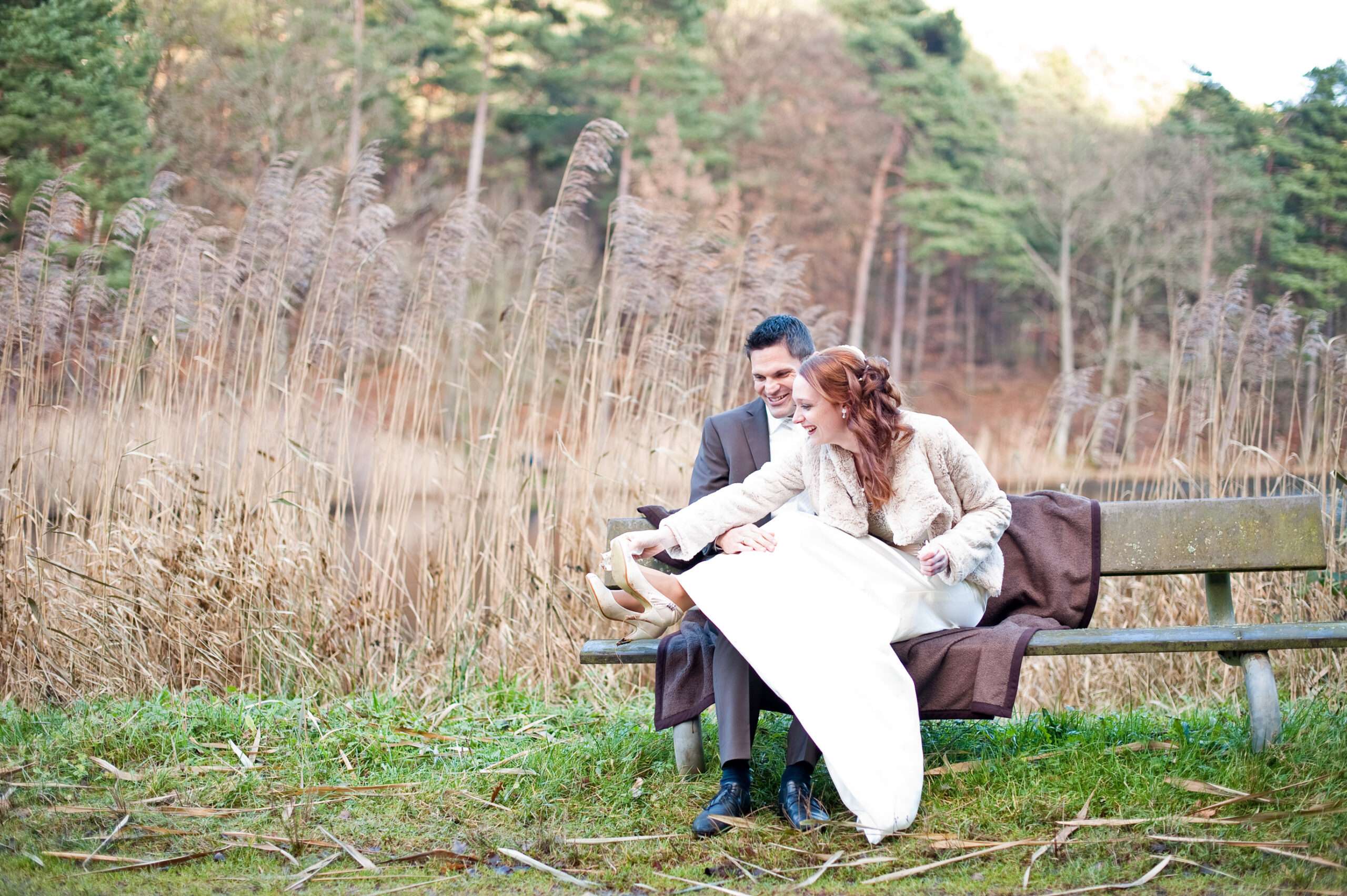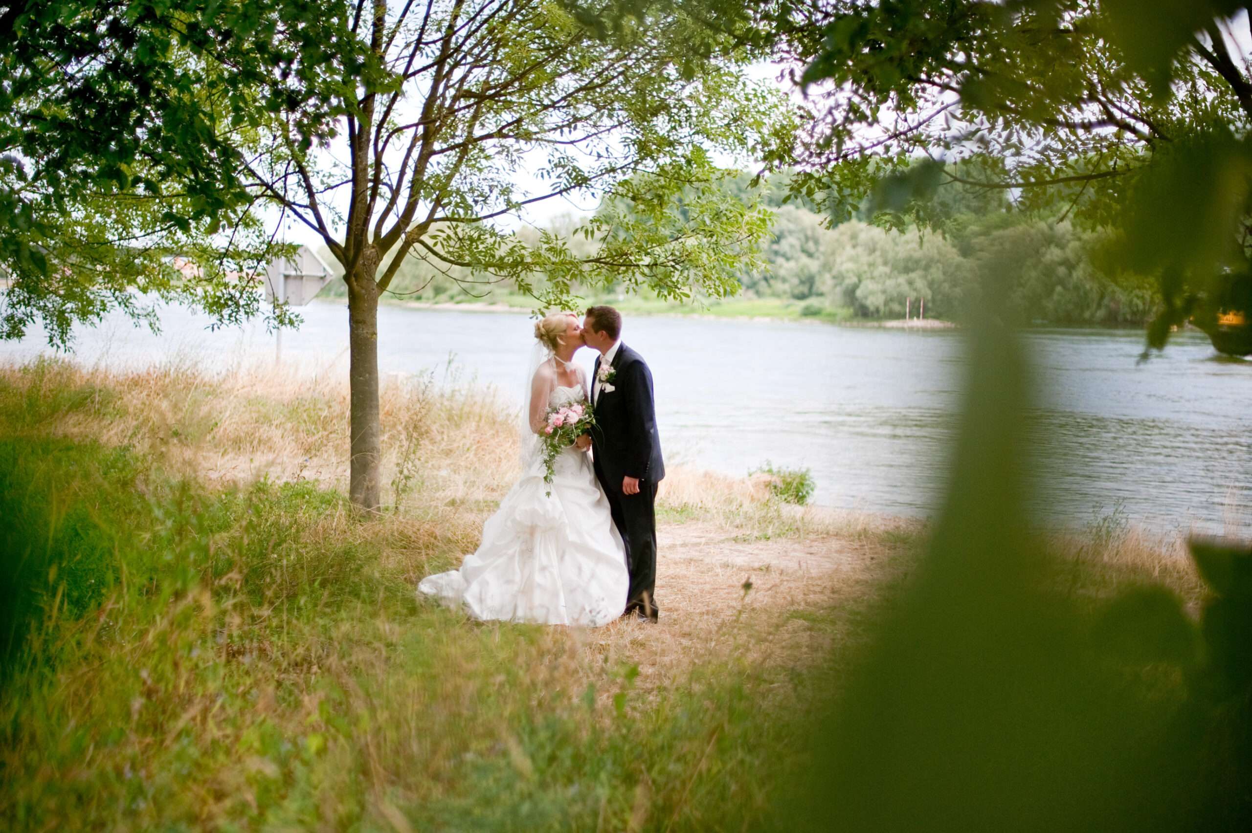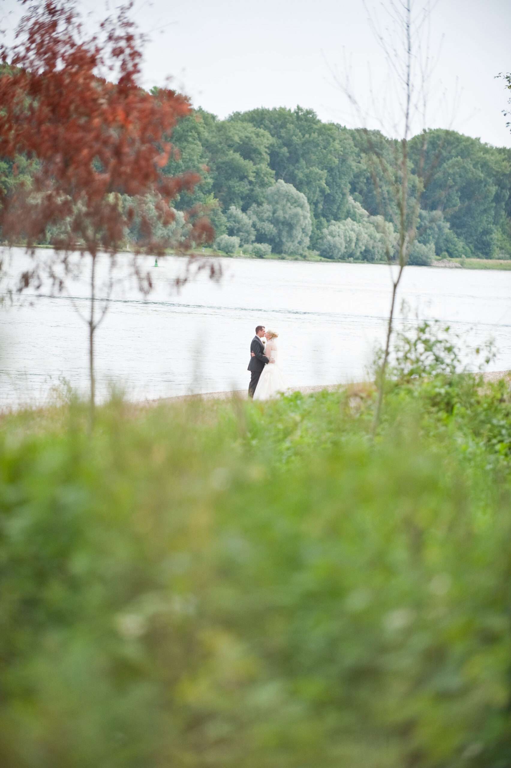 Paar in Hochzeitskleidung am Seeufer