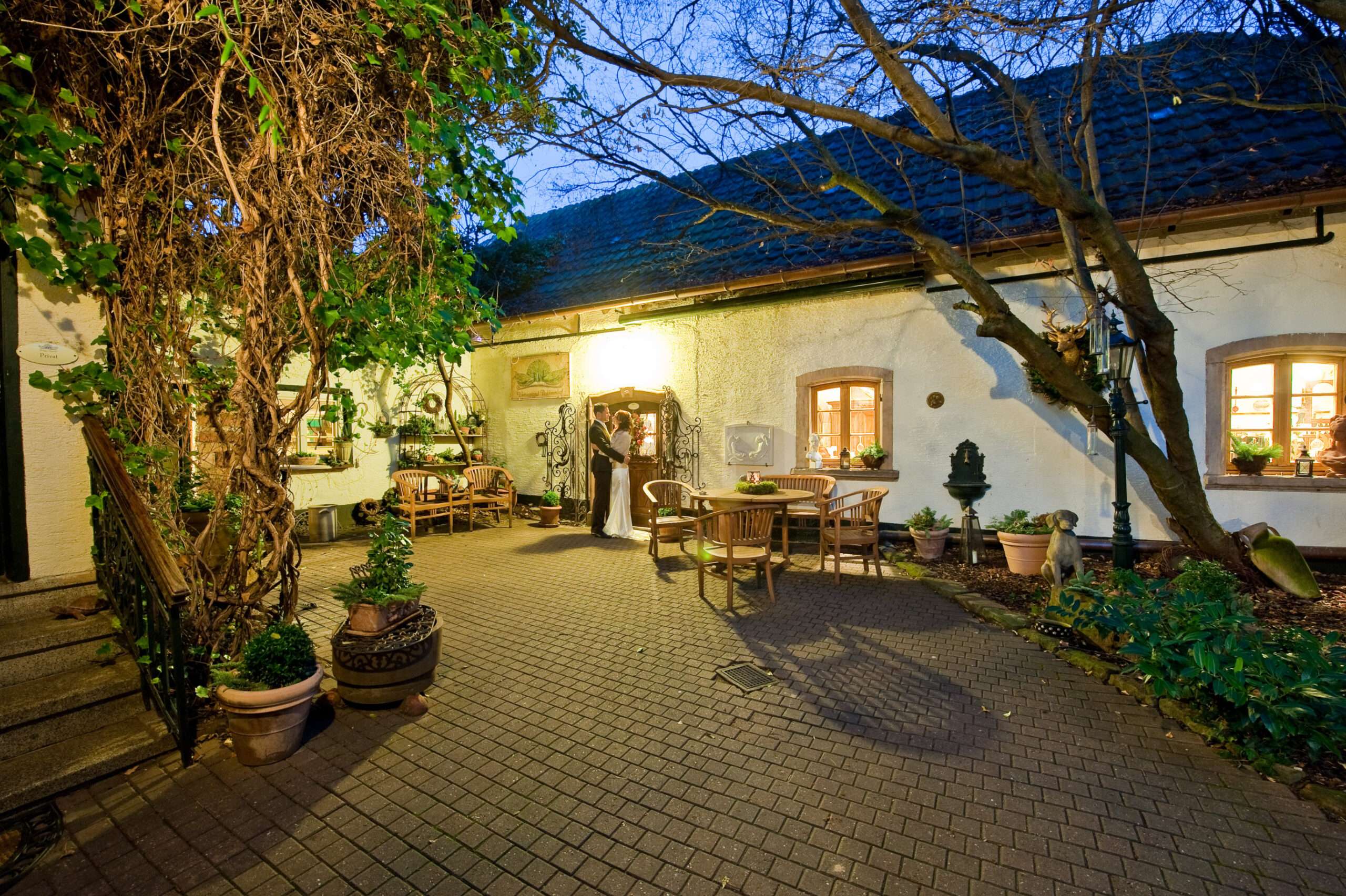 Paar im Garten bei Sonnenuntergang