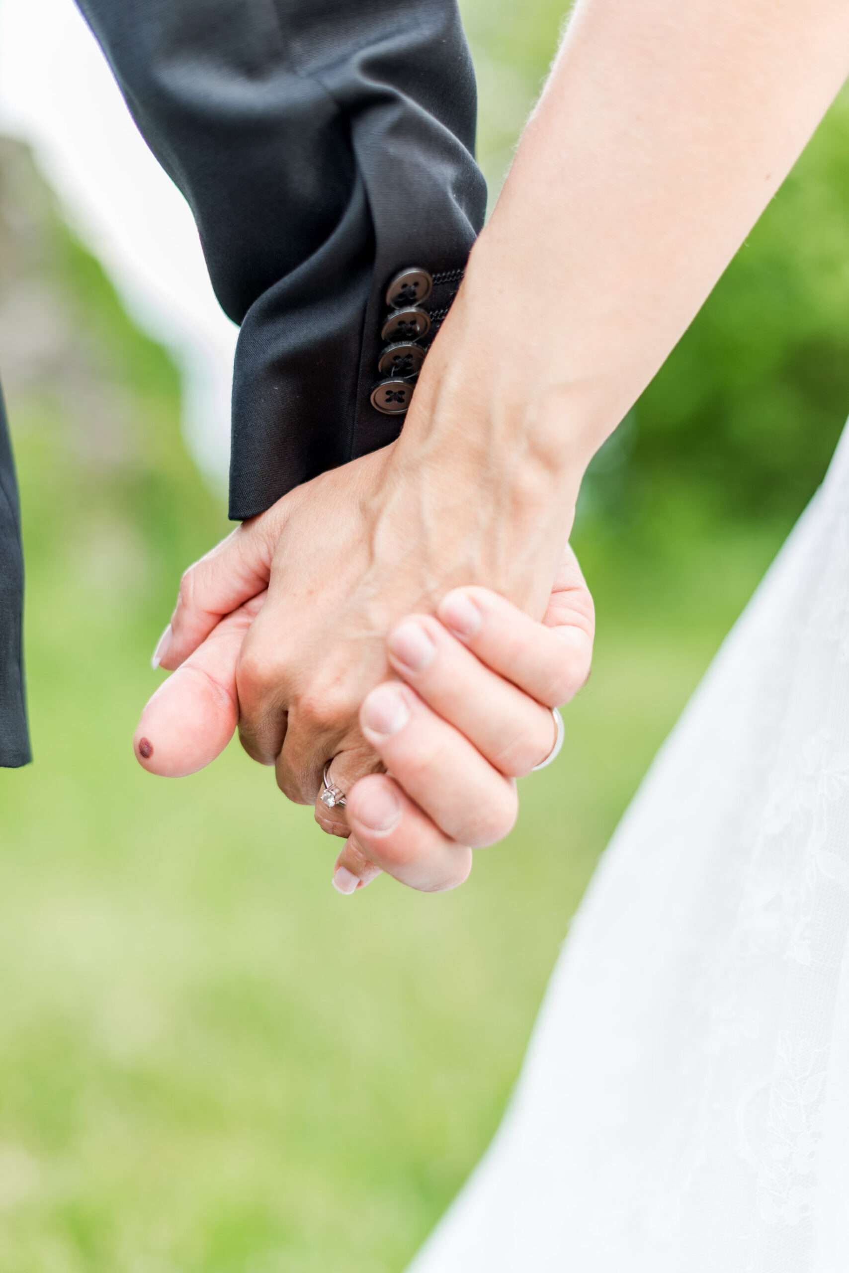Zwei Hände halten sich in einem Garten.