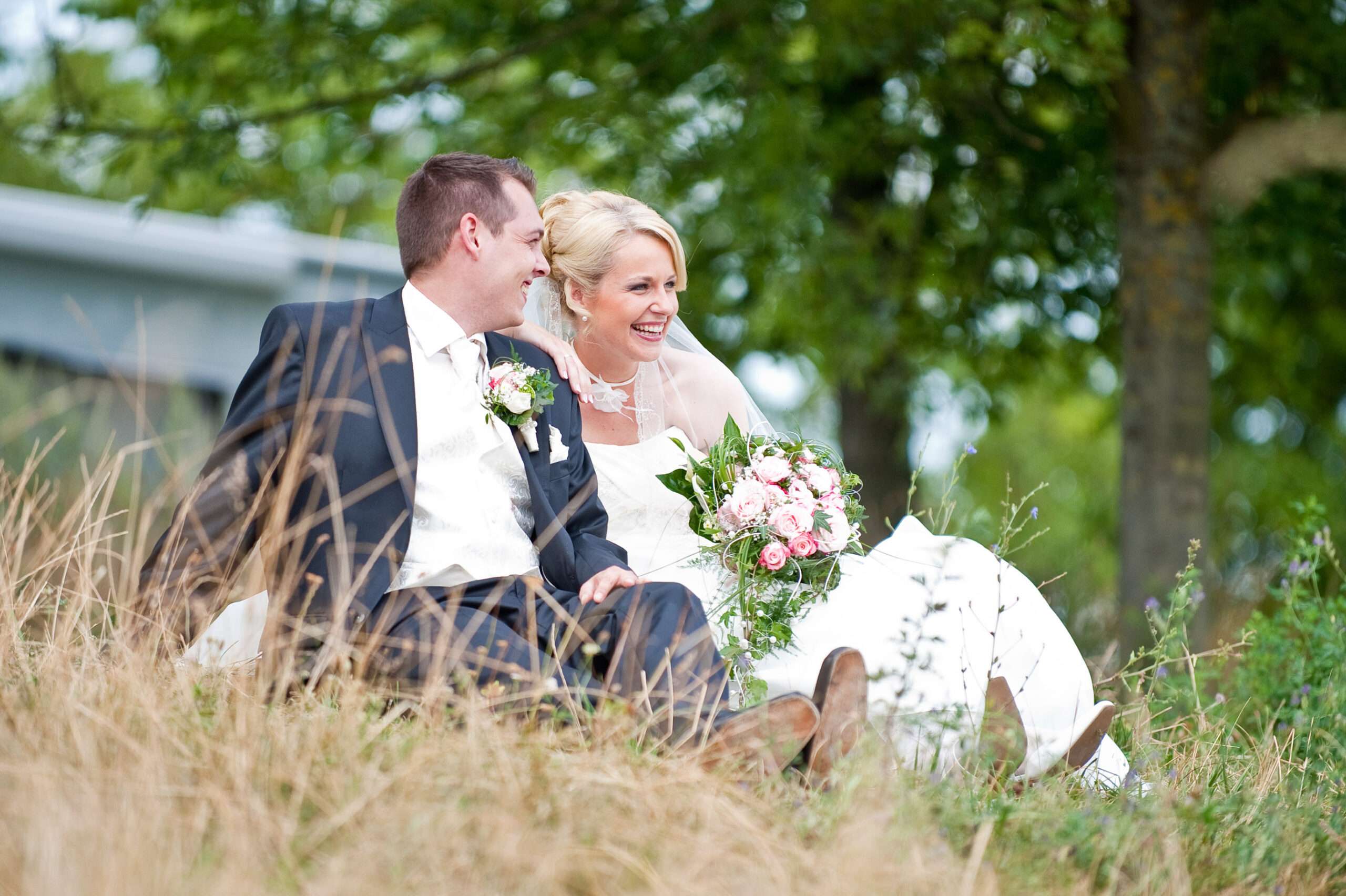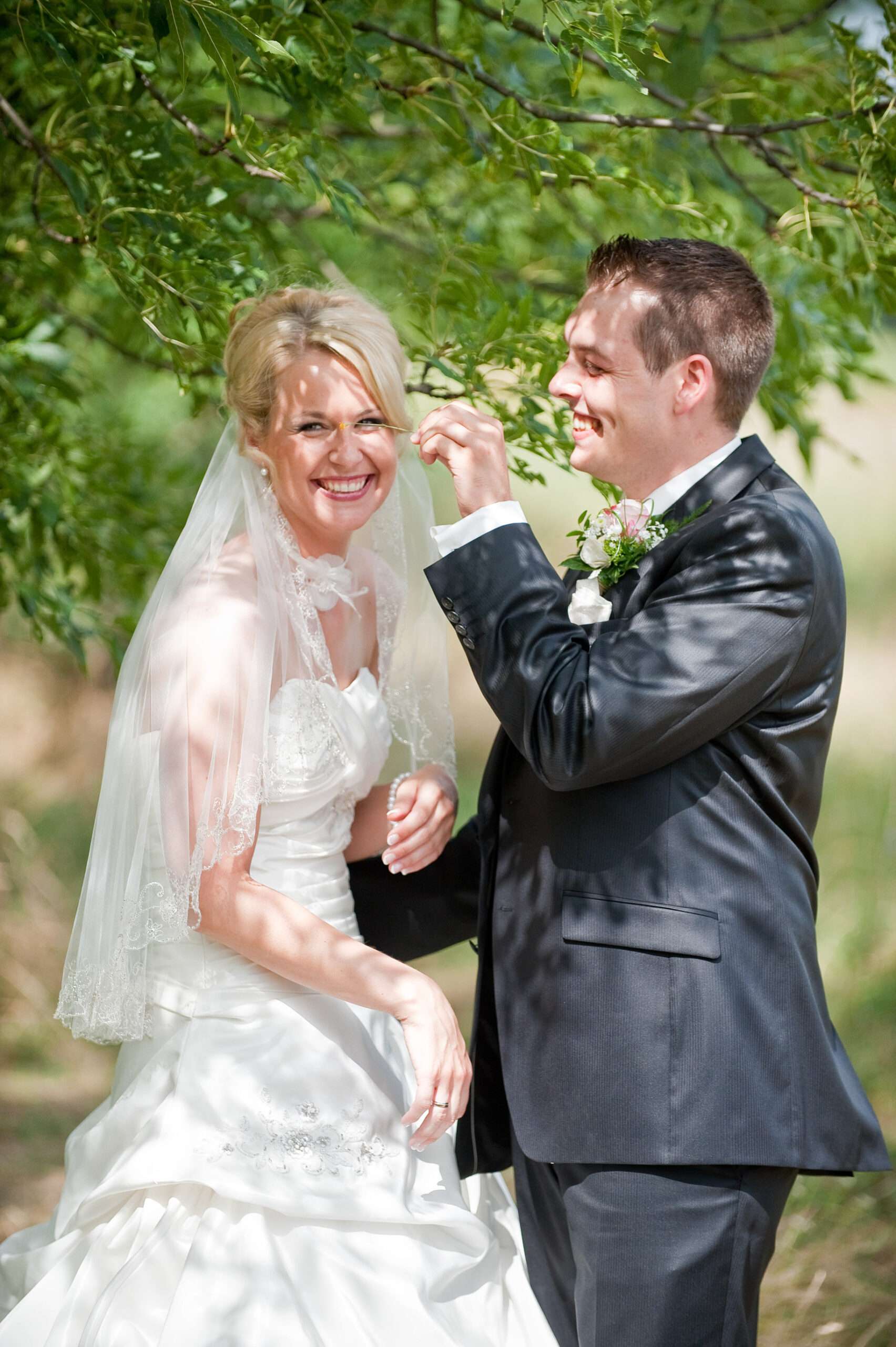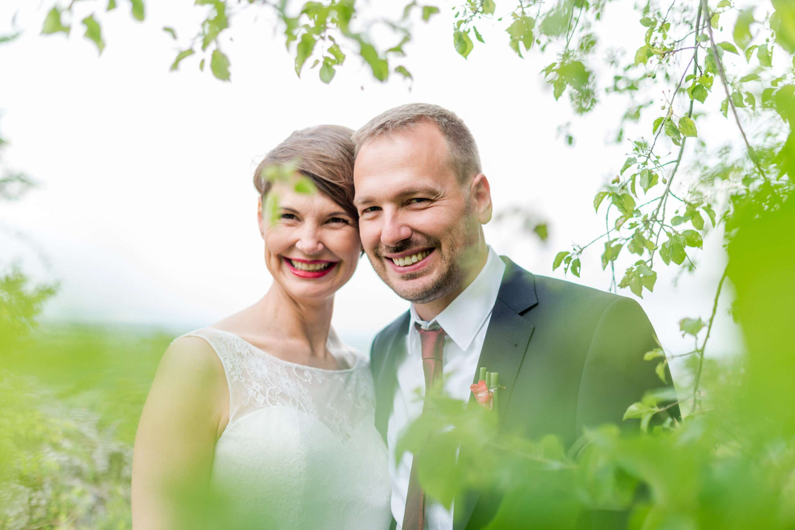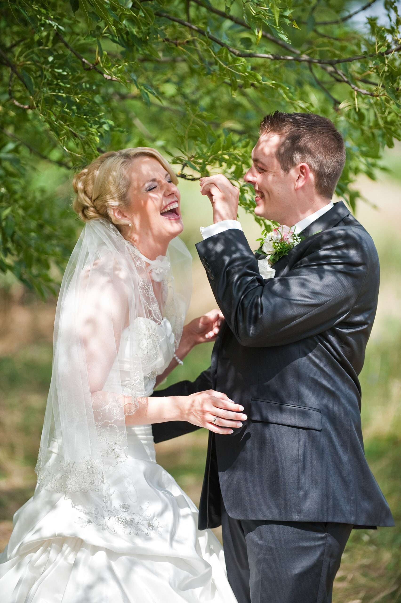 Lachendes Brautpaar im grünen Garten