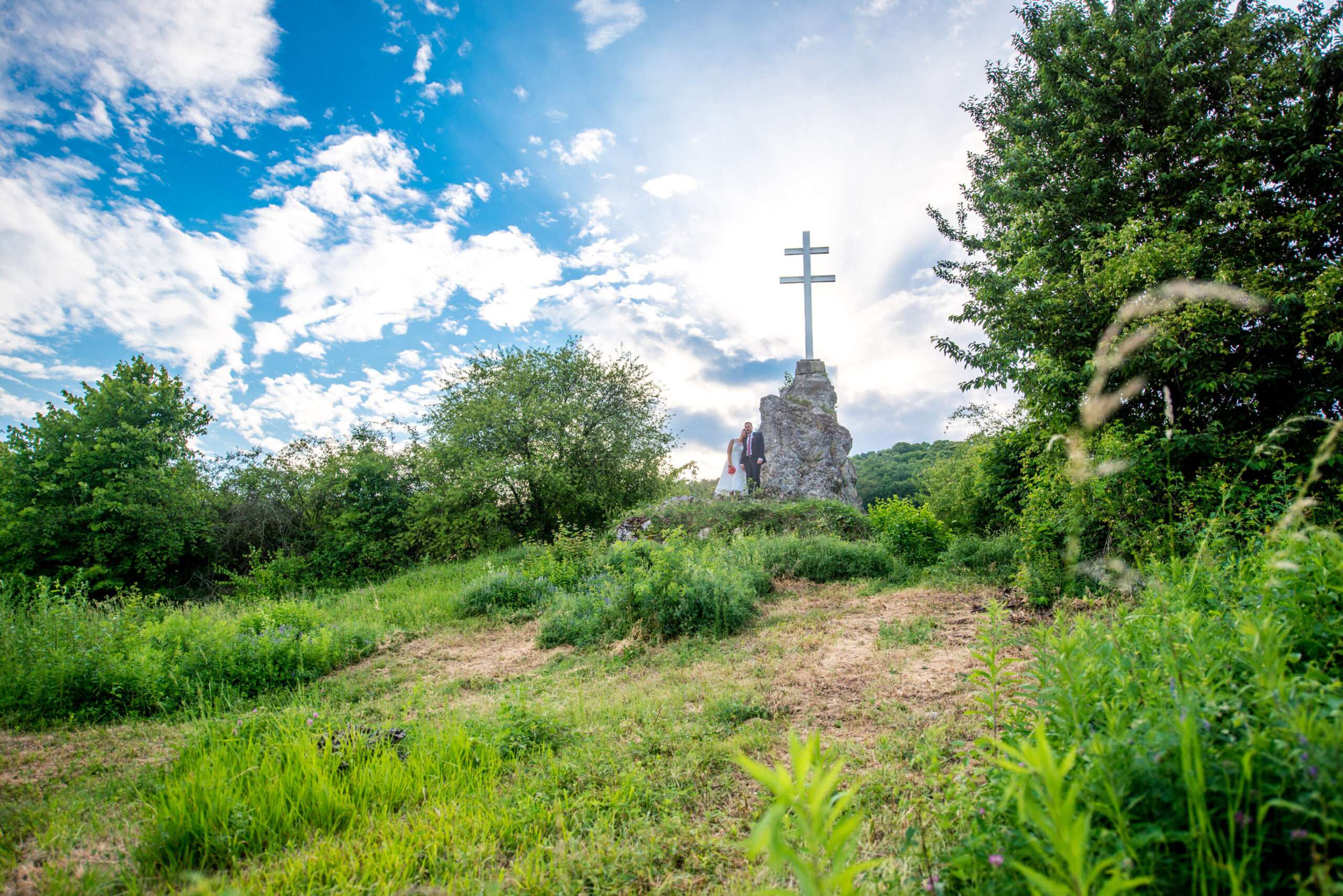 Paar in Landschaft mit grünen Hügeln