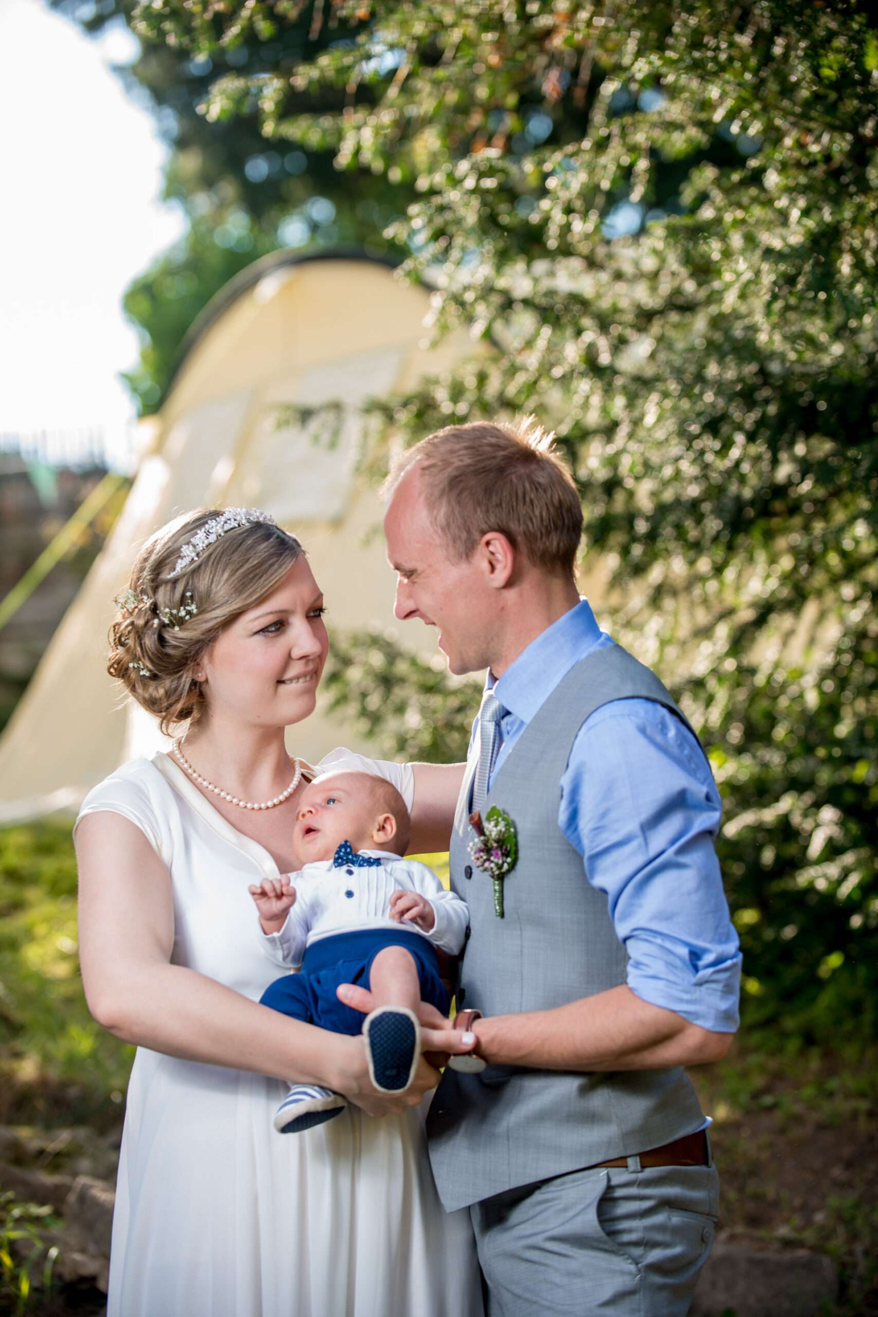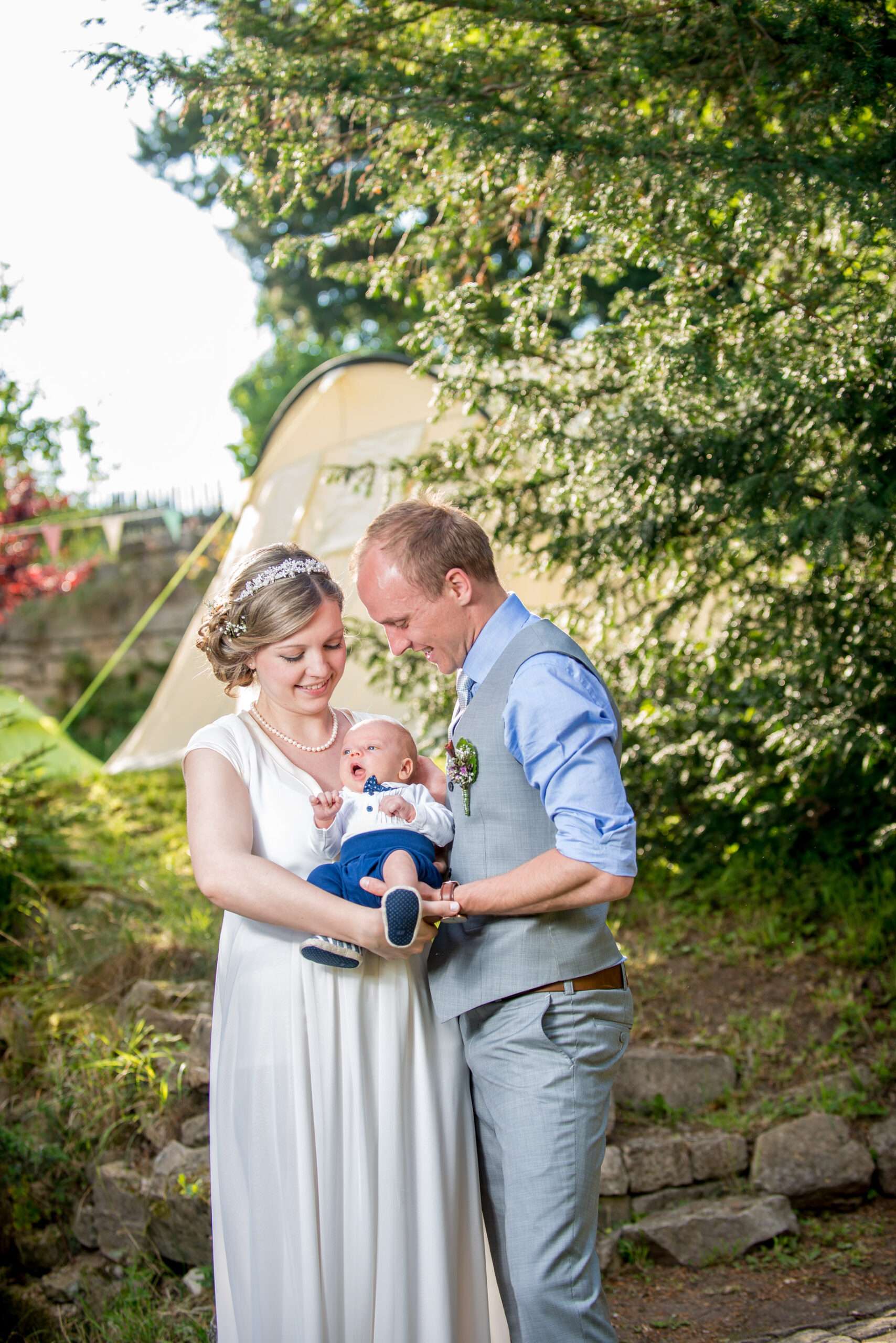 Sonnige Hochzeit im Freien mit Gästen