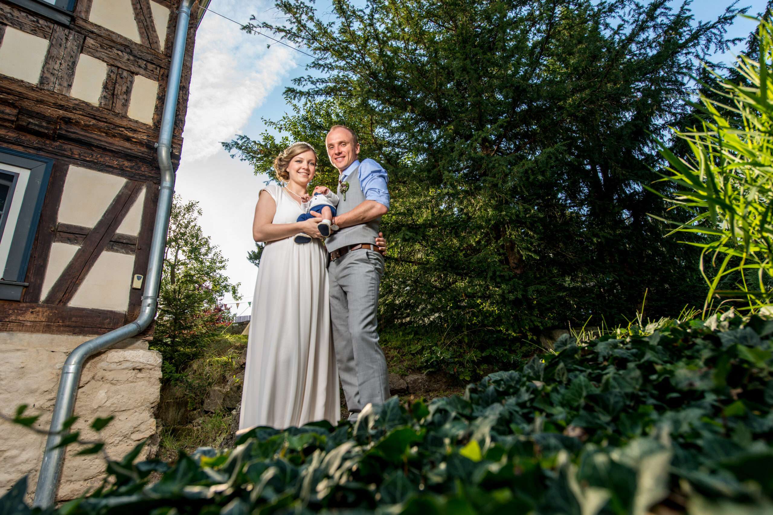 Familie vor einem Fachwerkhaus im Freien