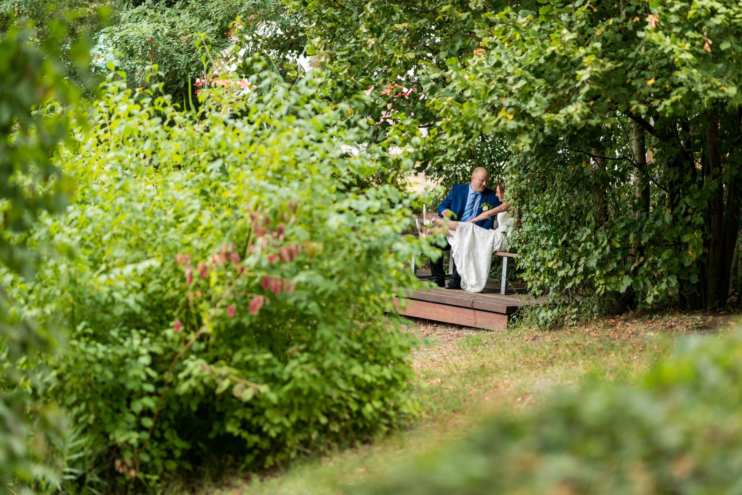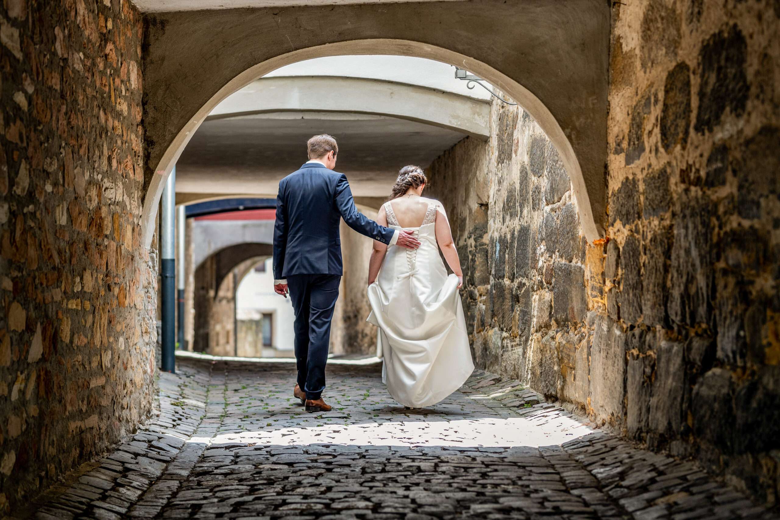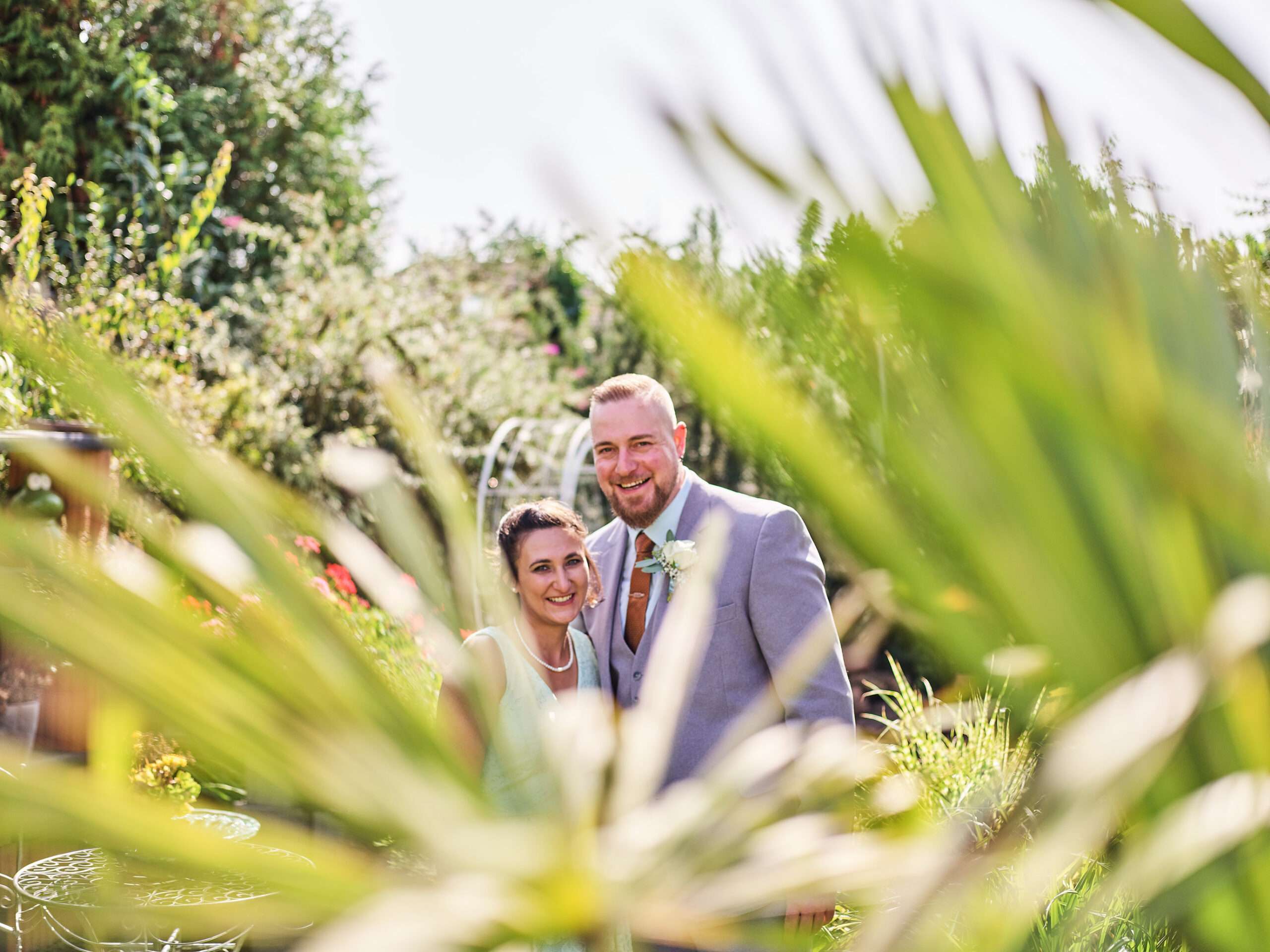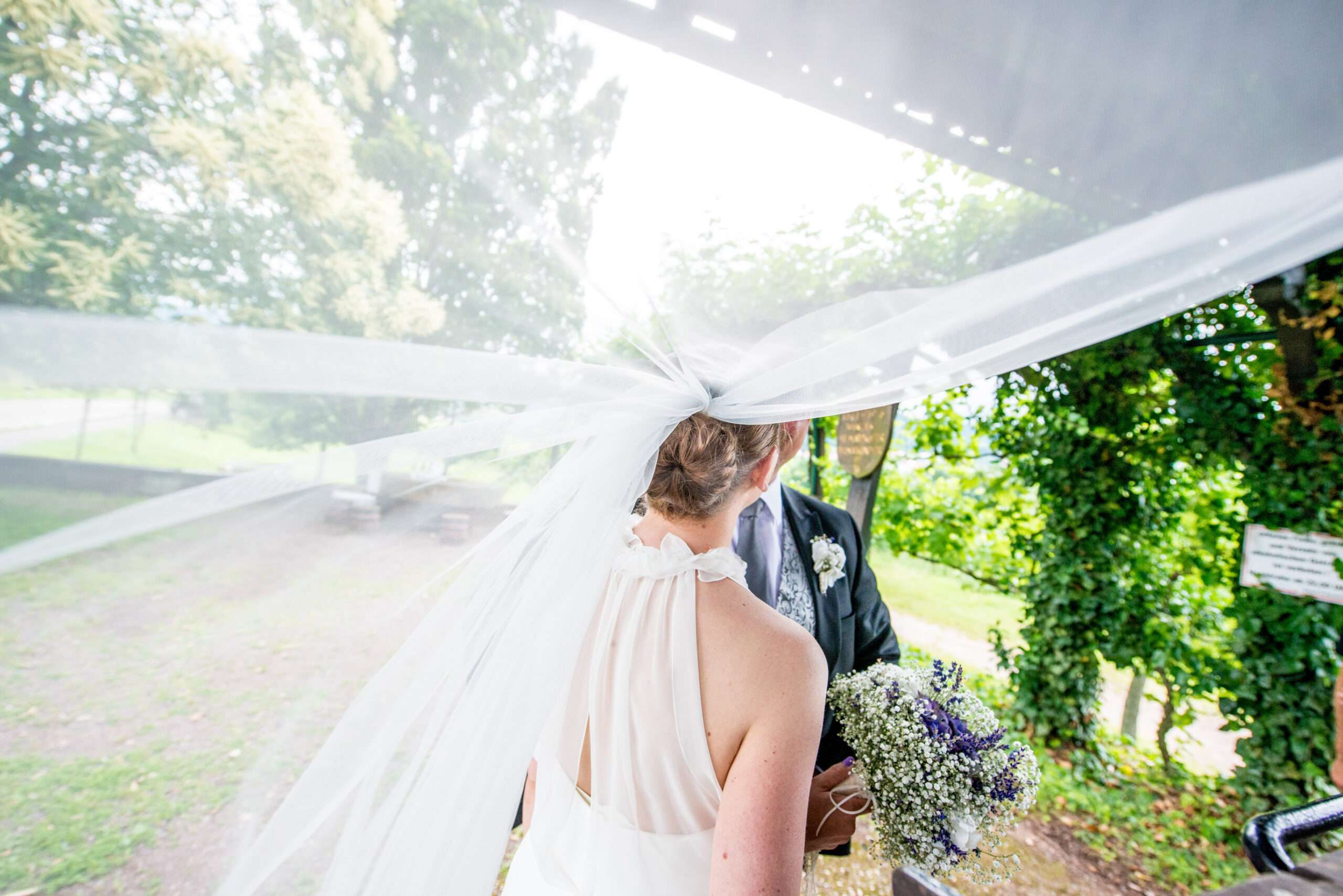 Brautpaar geht durch Tür, Sommerhochzeit.