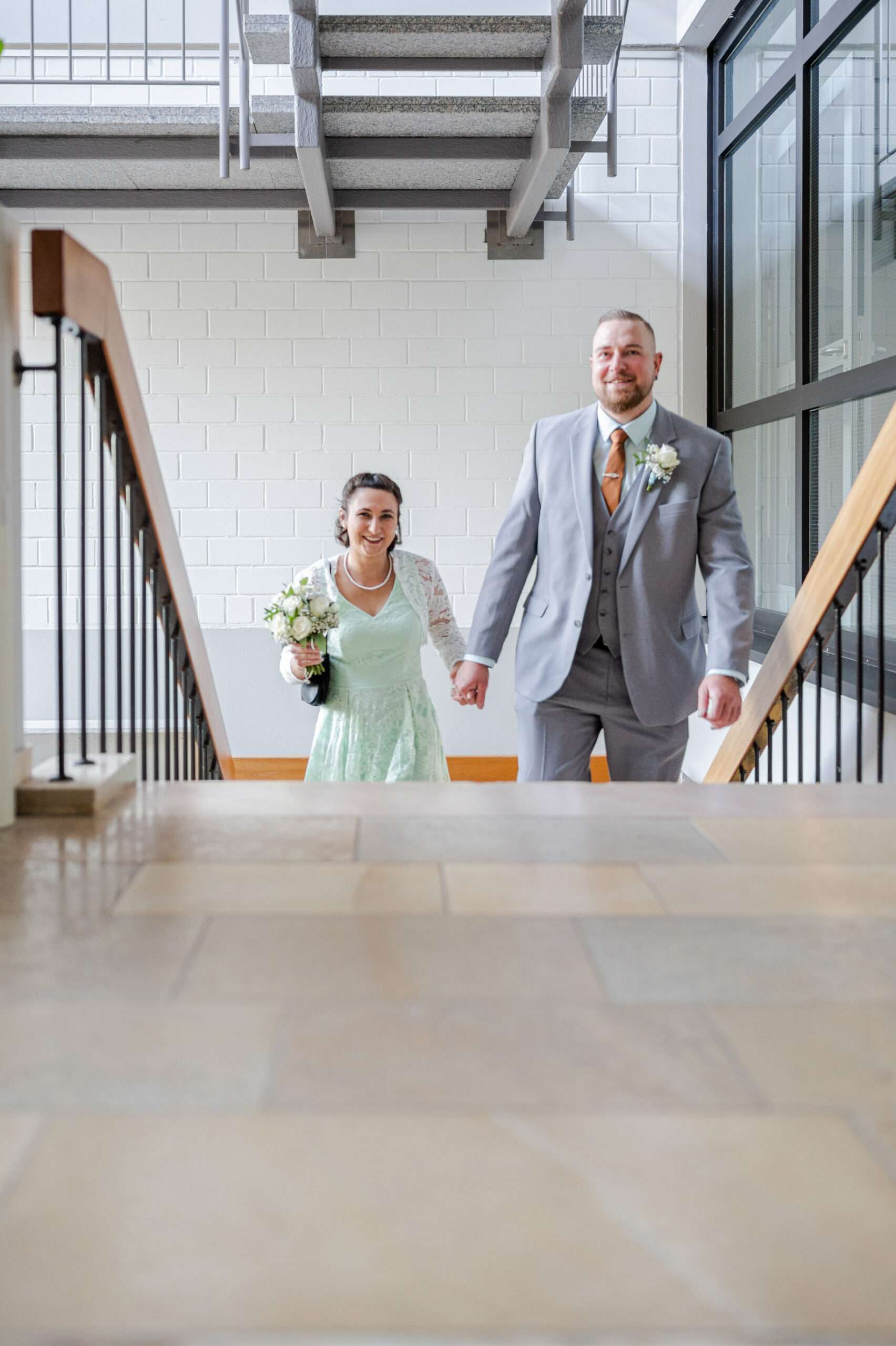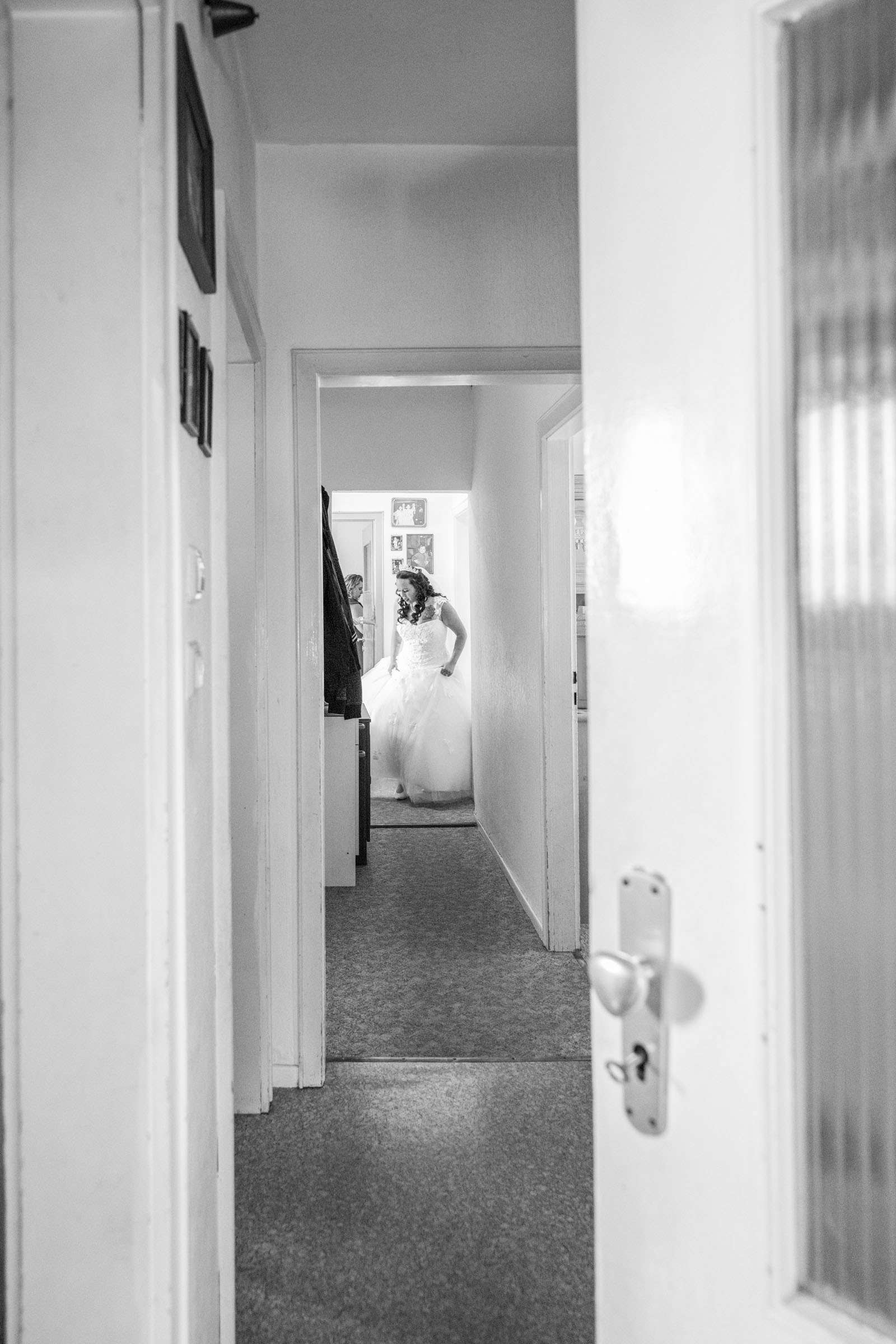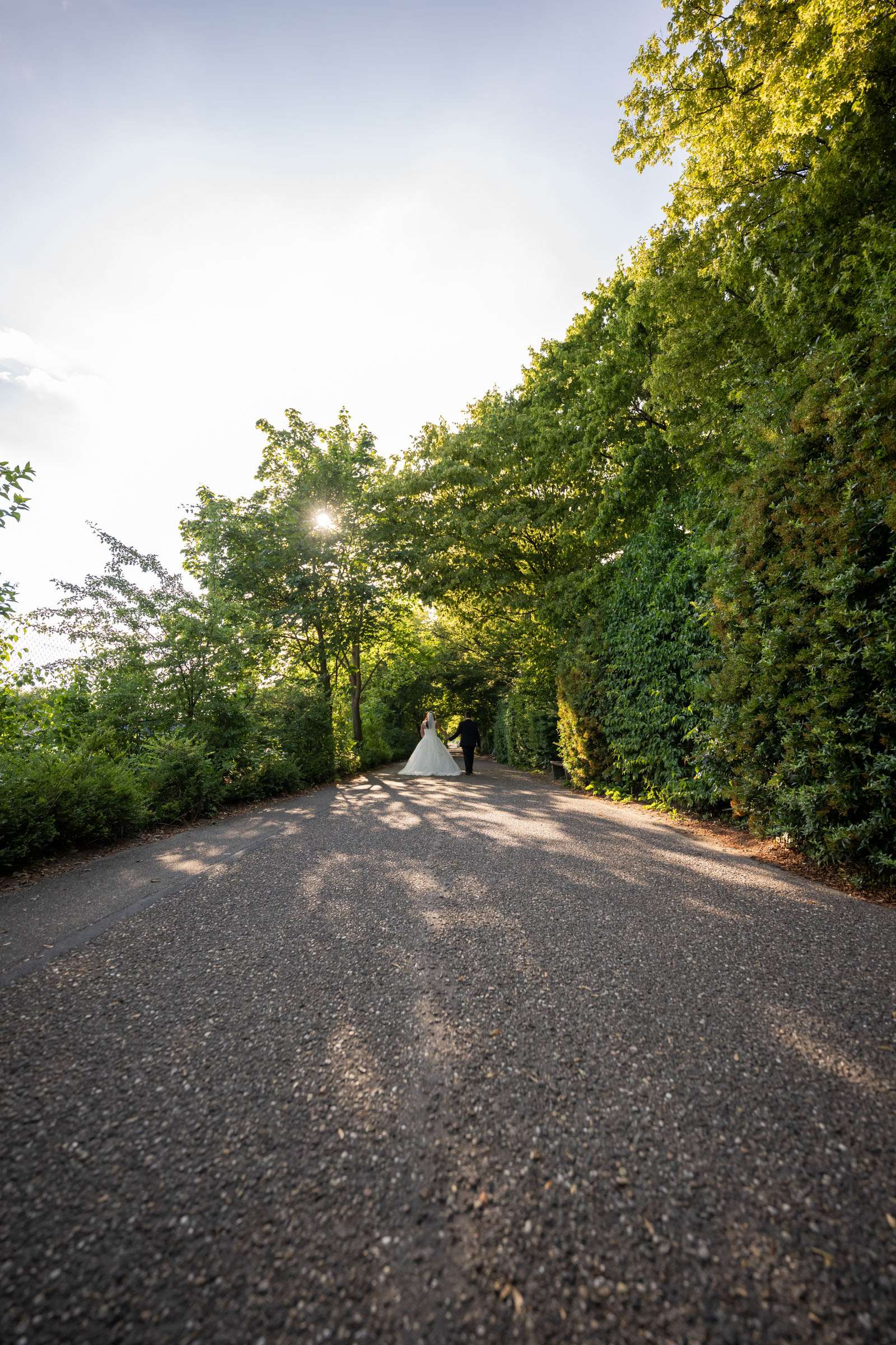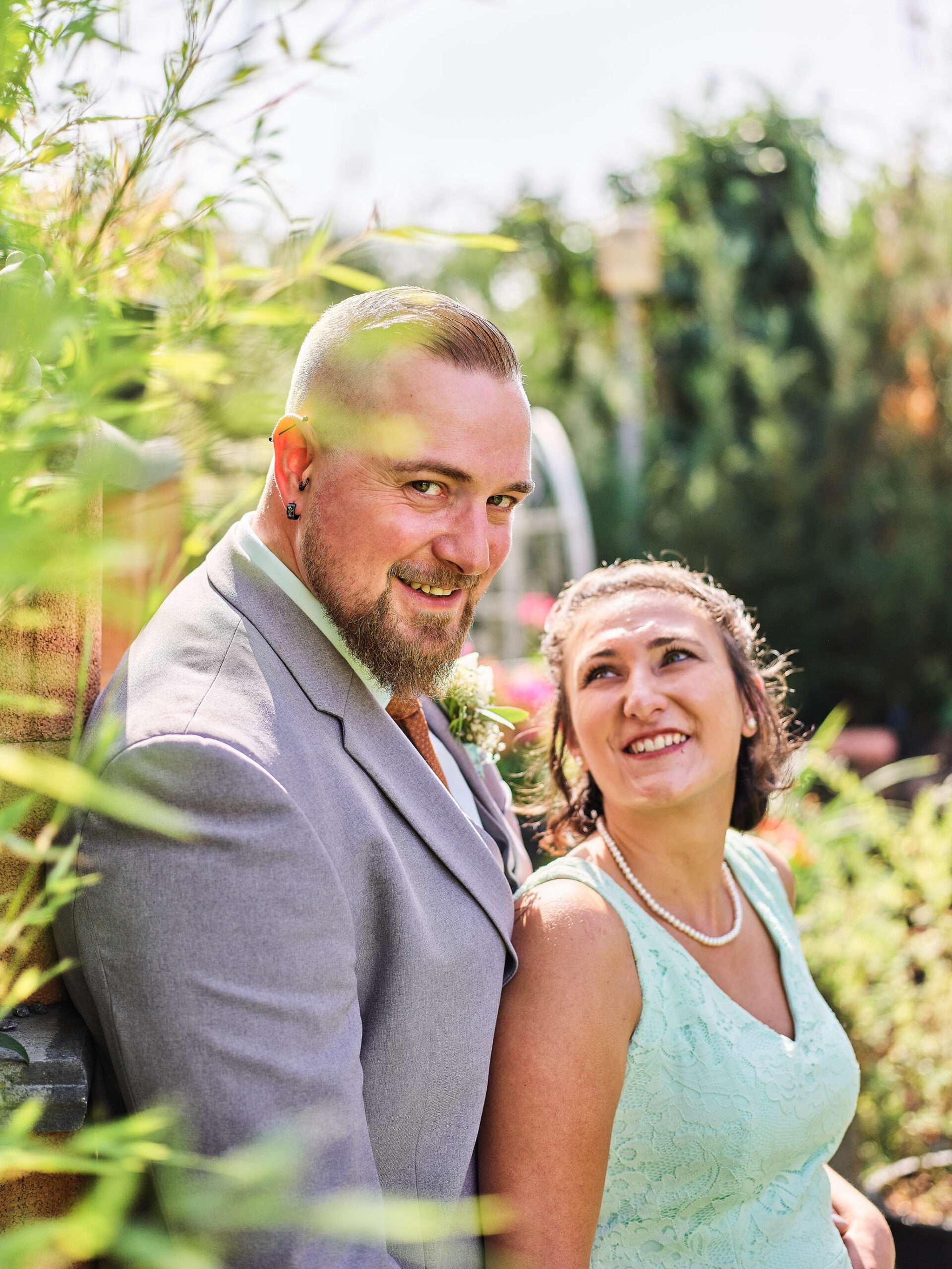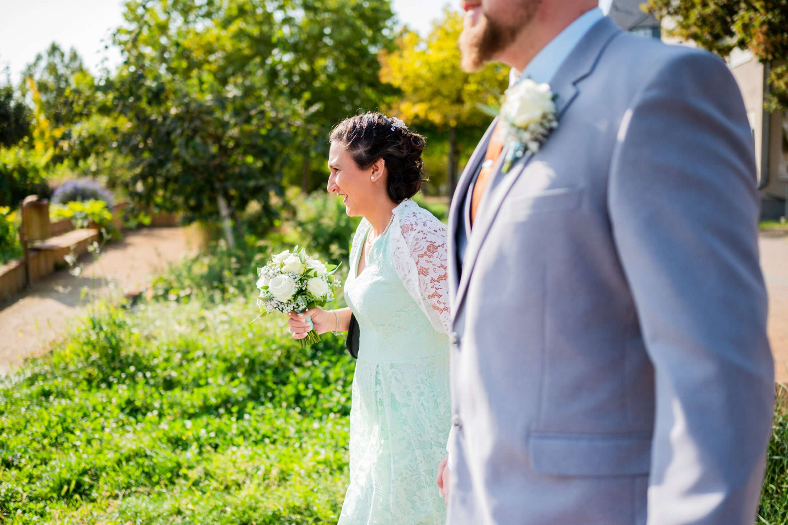 Brautpaar geht durch Tür, Sommerhochzeit.