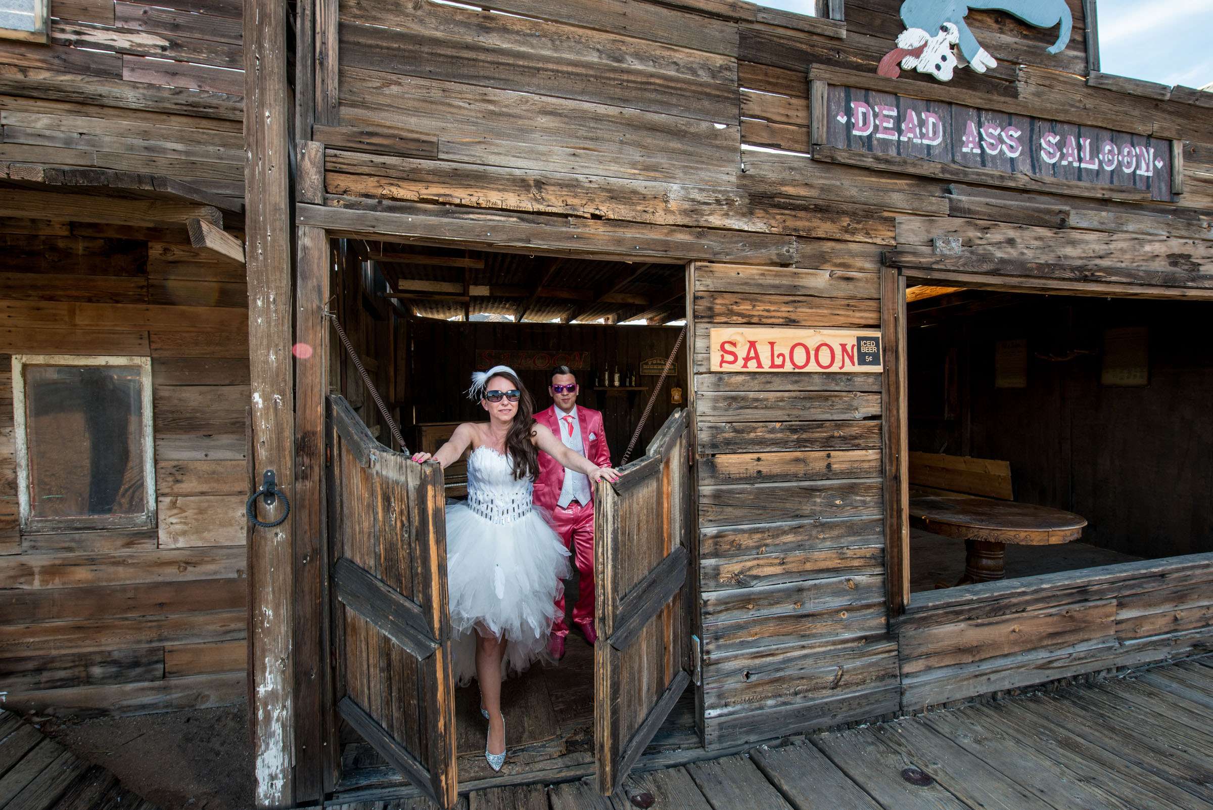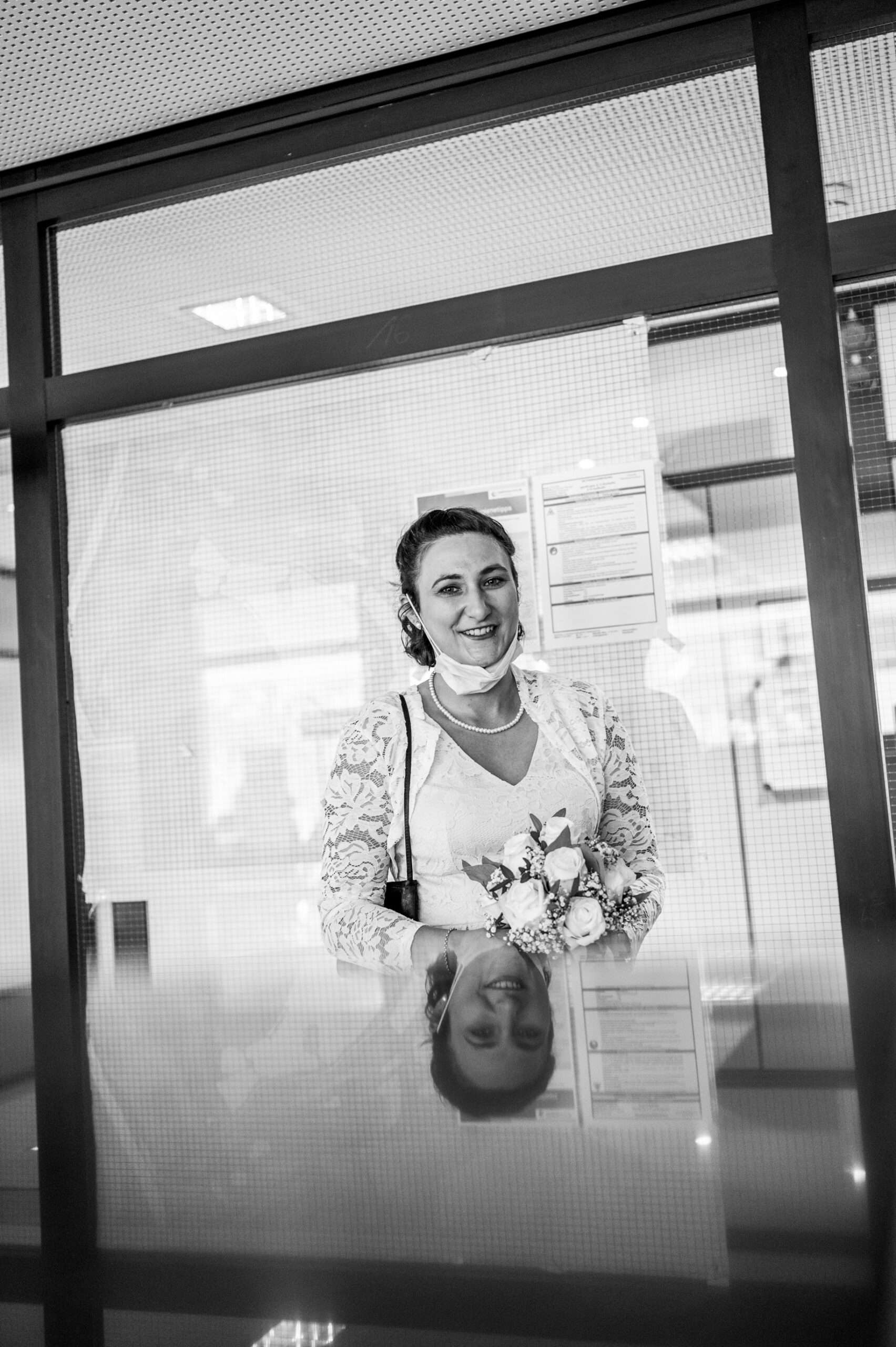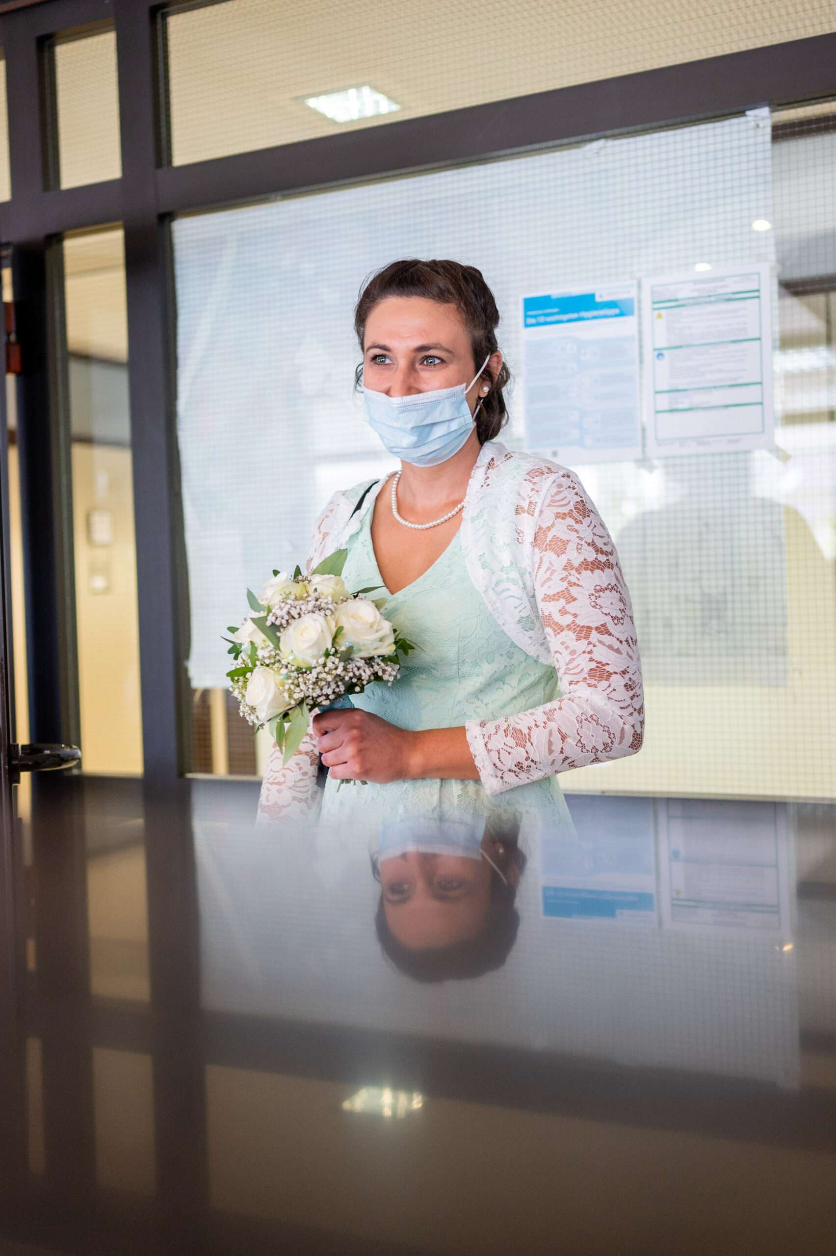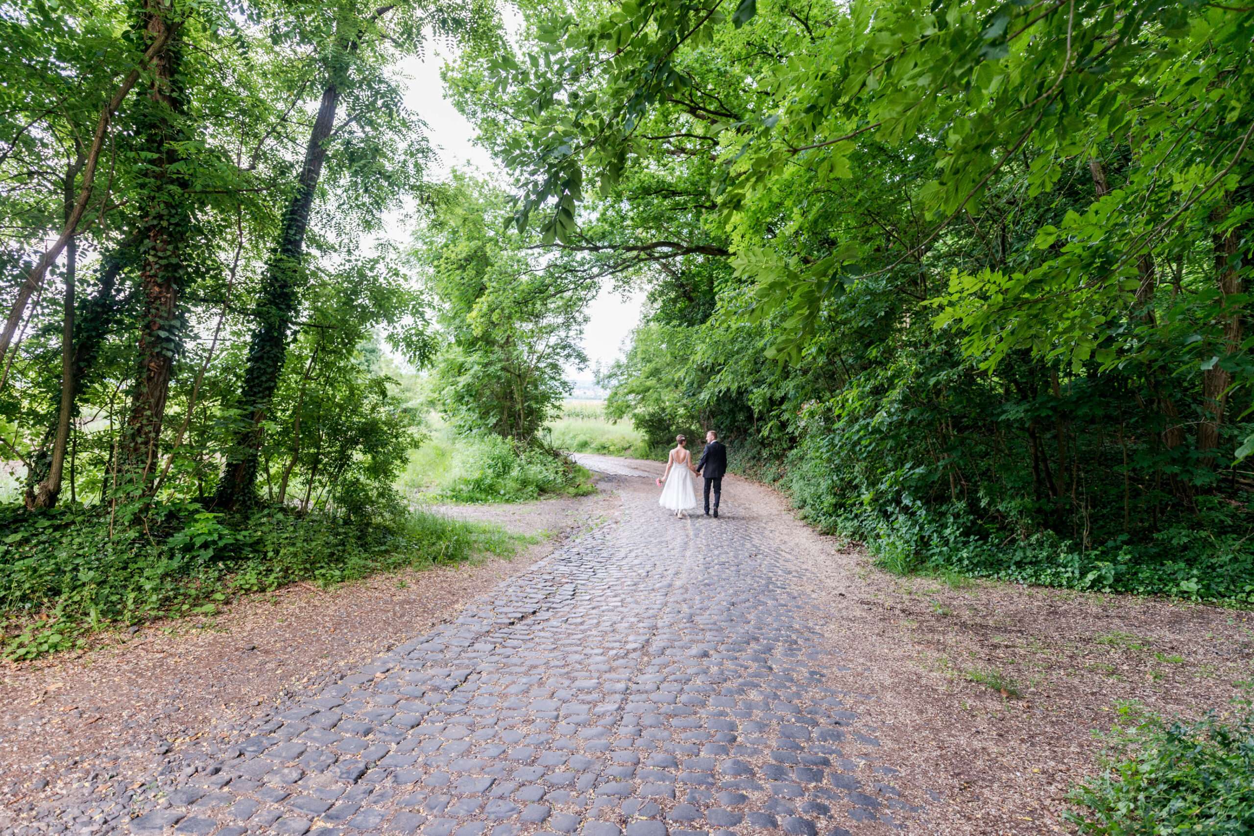 Brautpaar geht durch Tür, Sommerhochzeit.