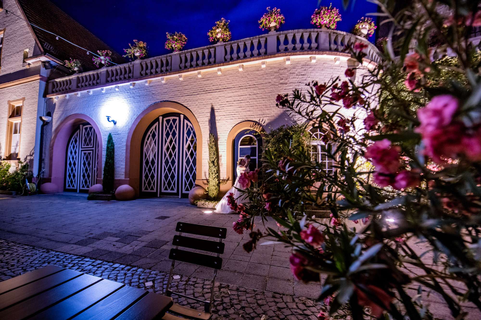 Romantisches Paar im beleuchteten Innenhof bei Nacht