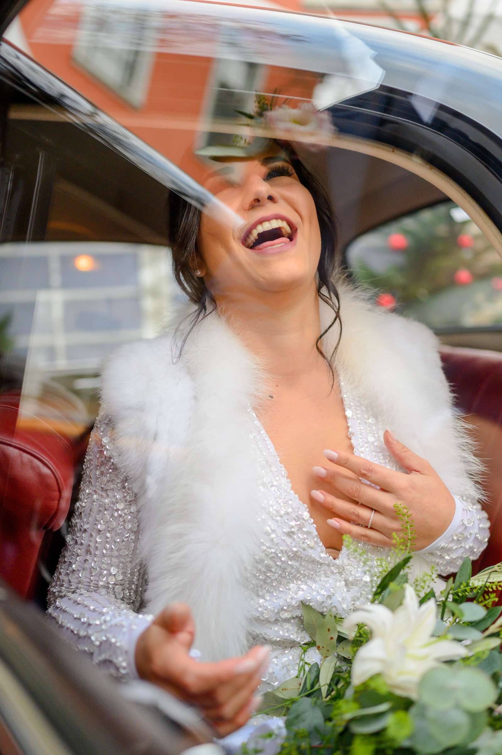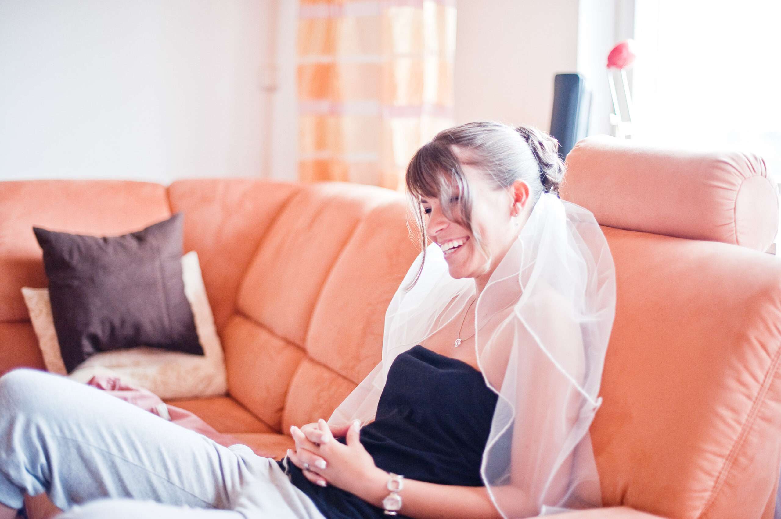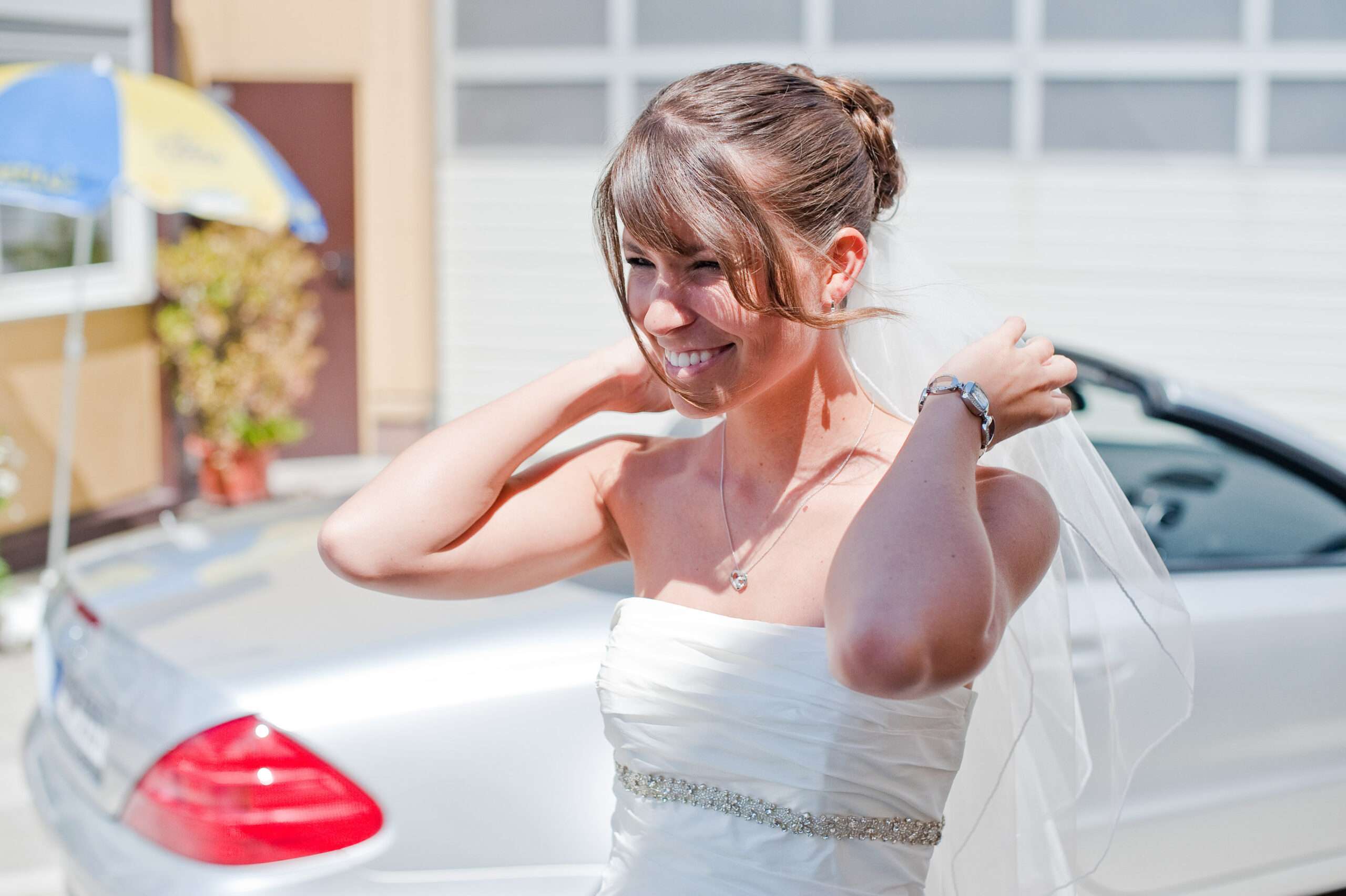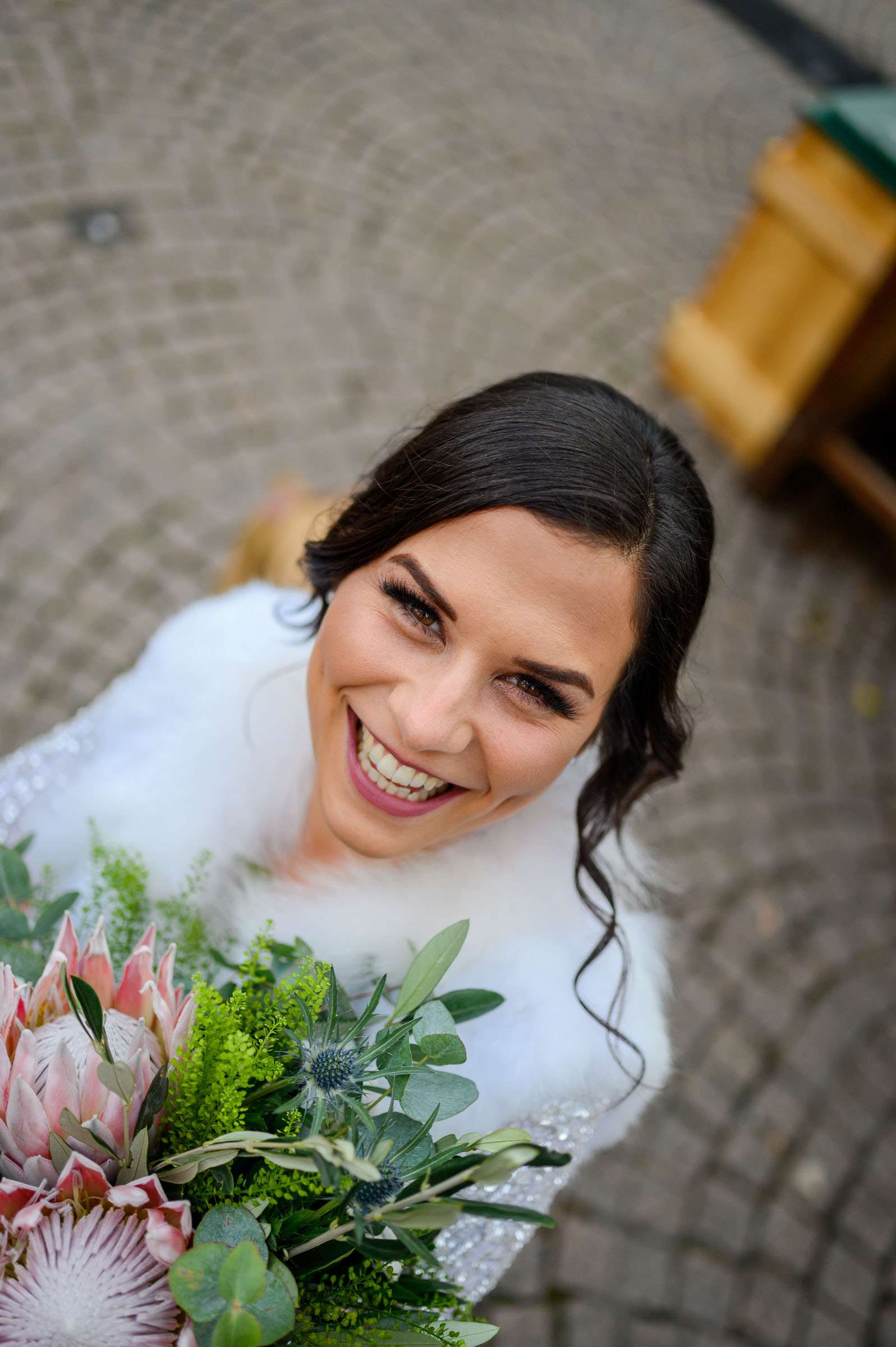 Lachende Braut mit Blumenstrauß bei Hochzeit.