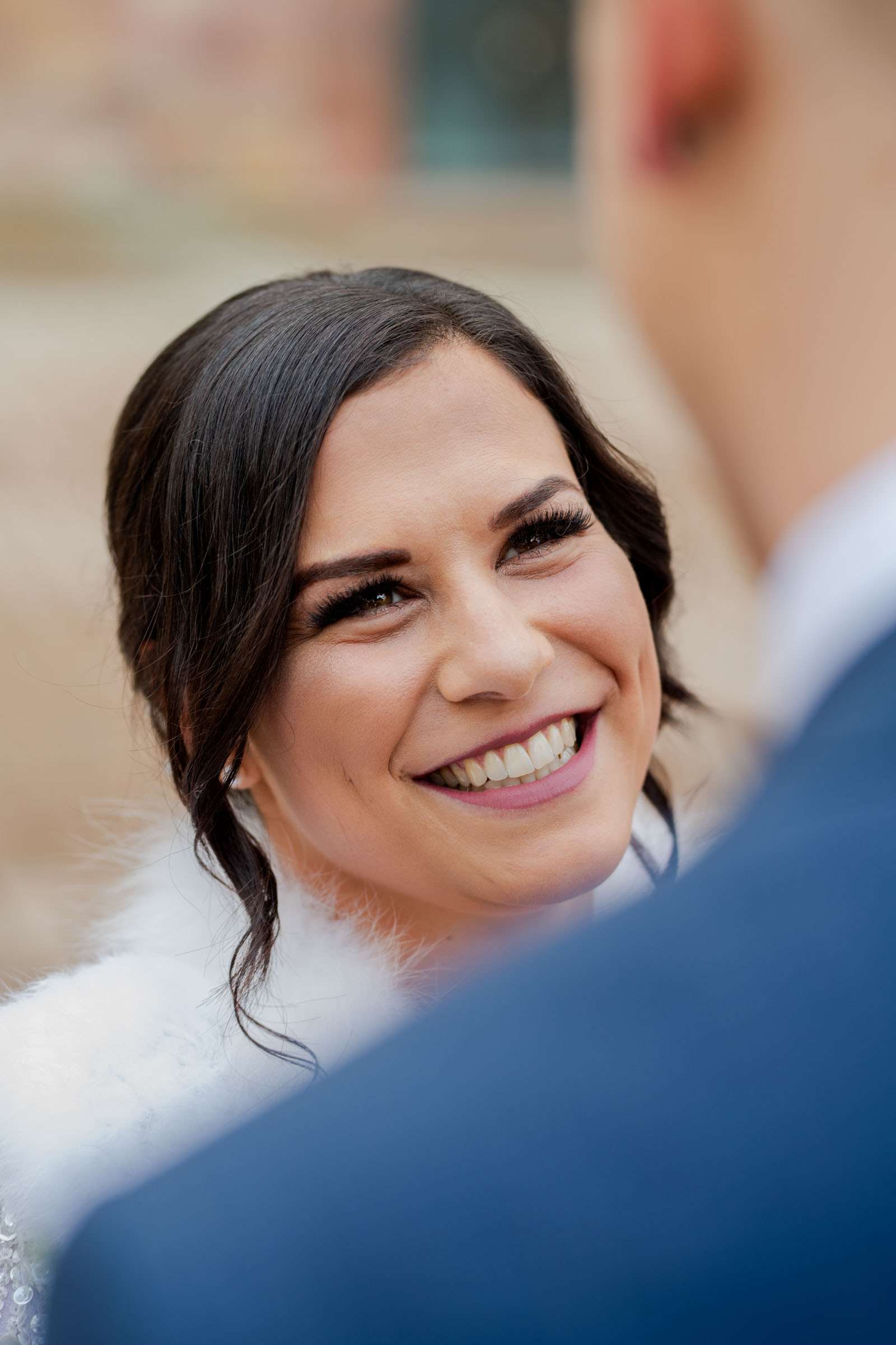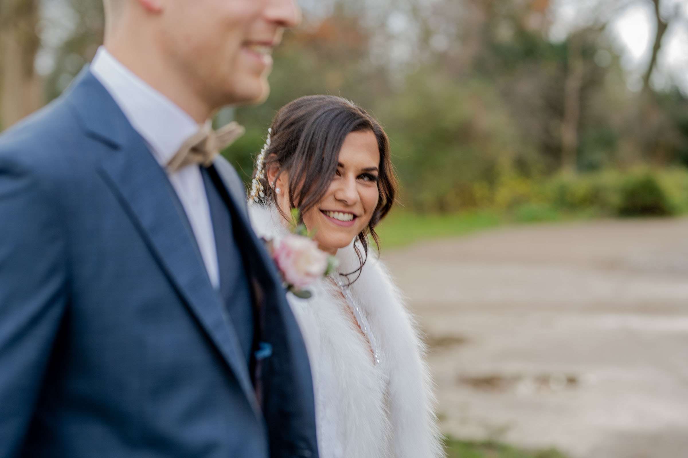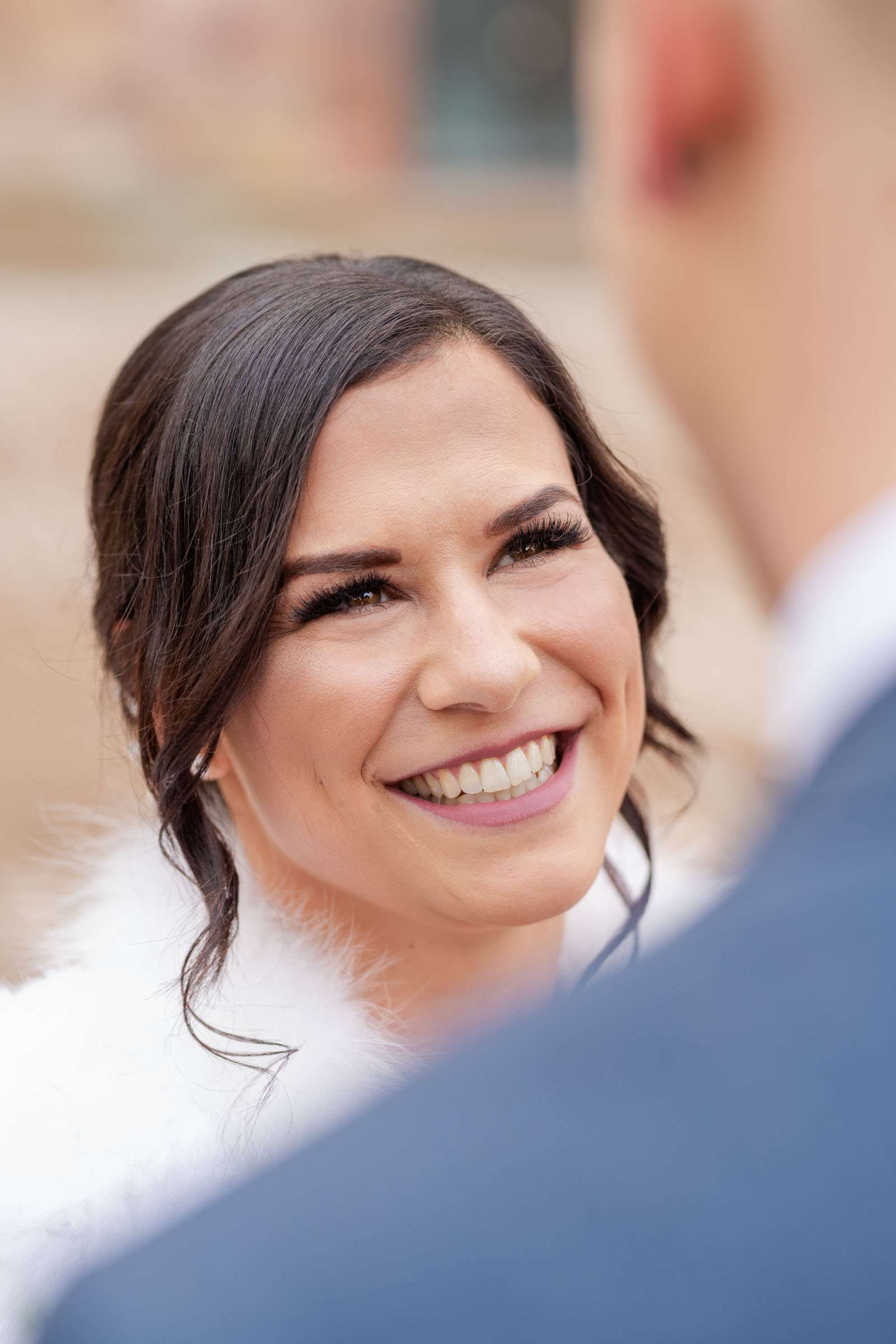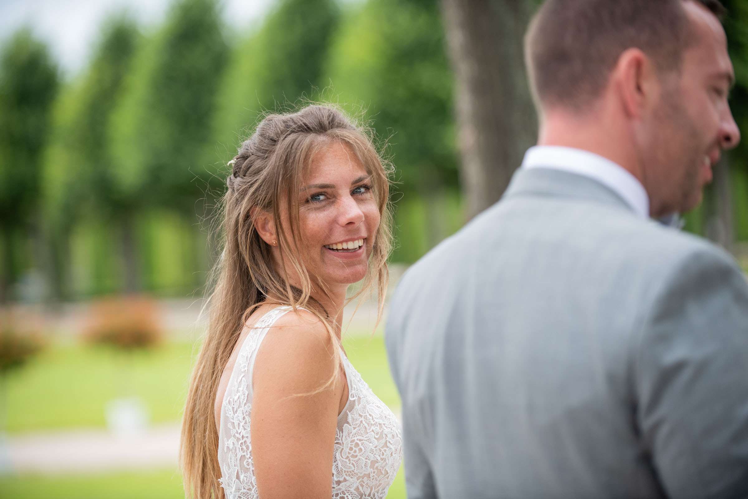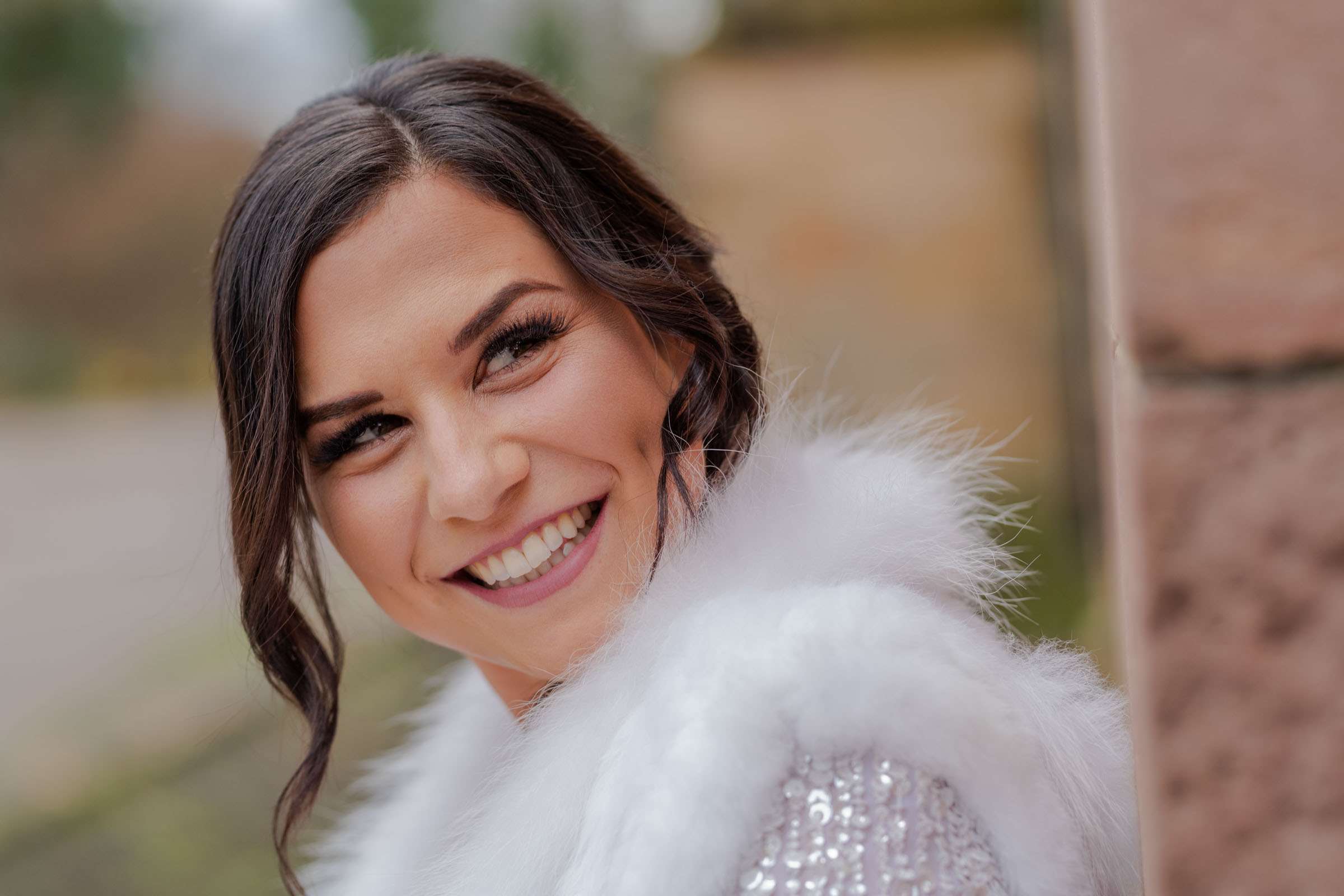 Lachende Braut mit Blumenstrauß bei Hochzeit.