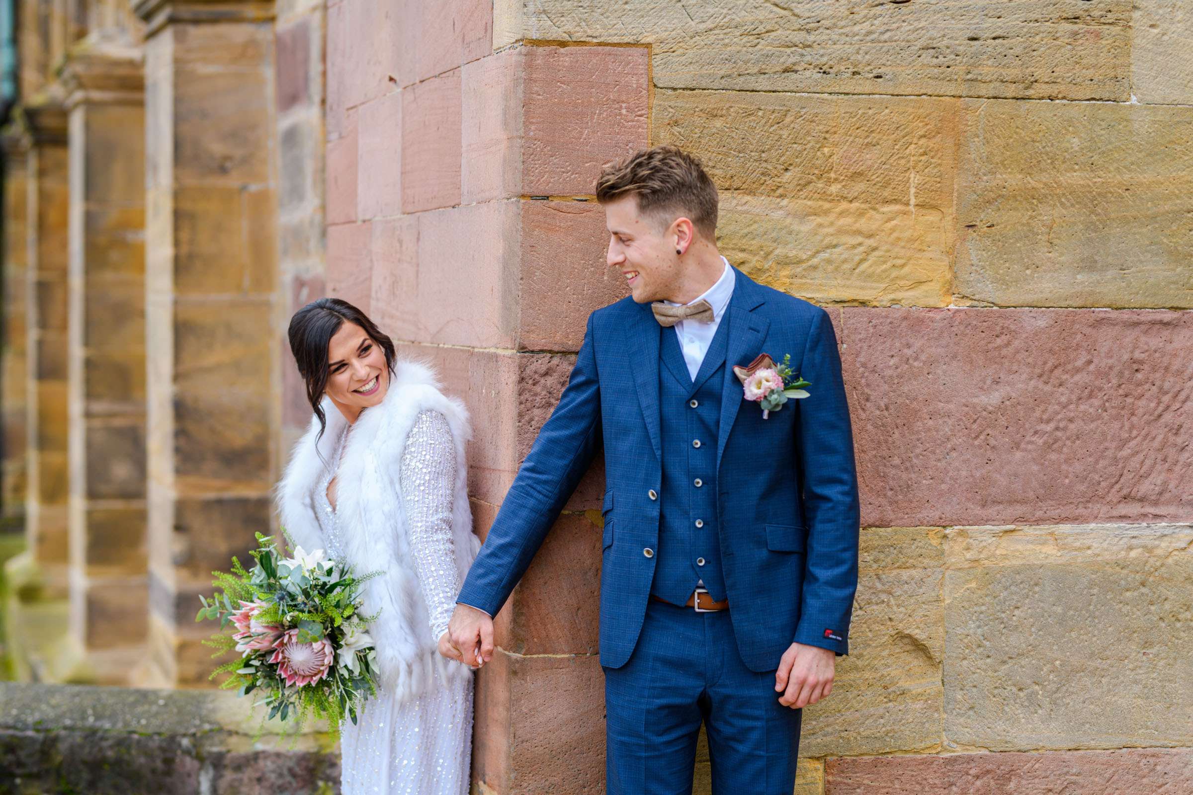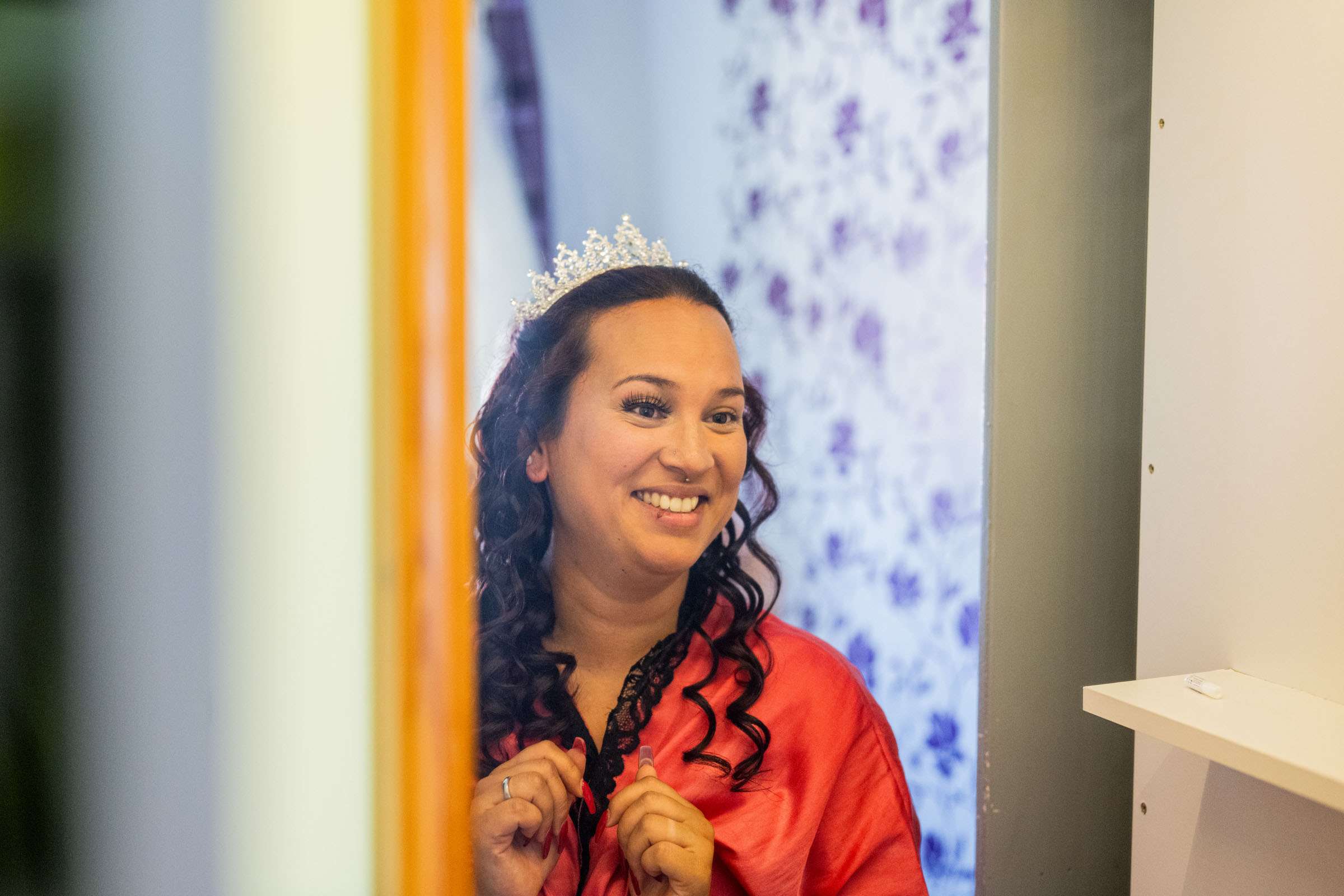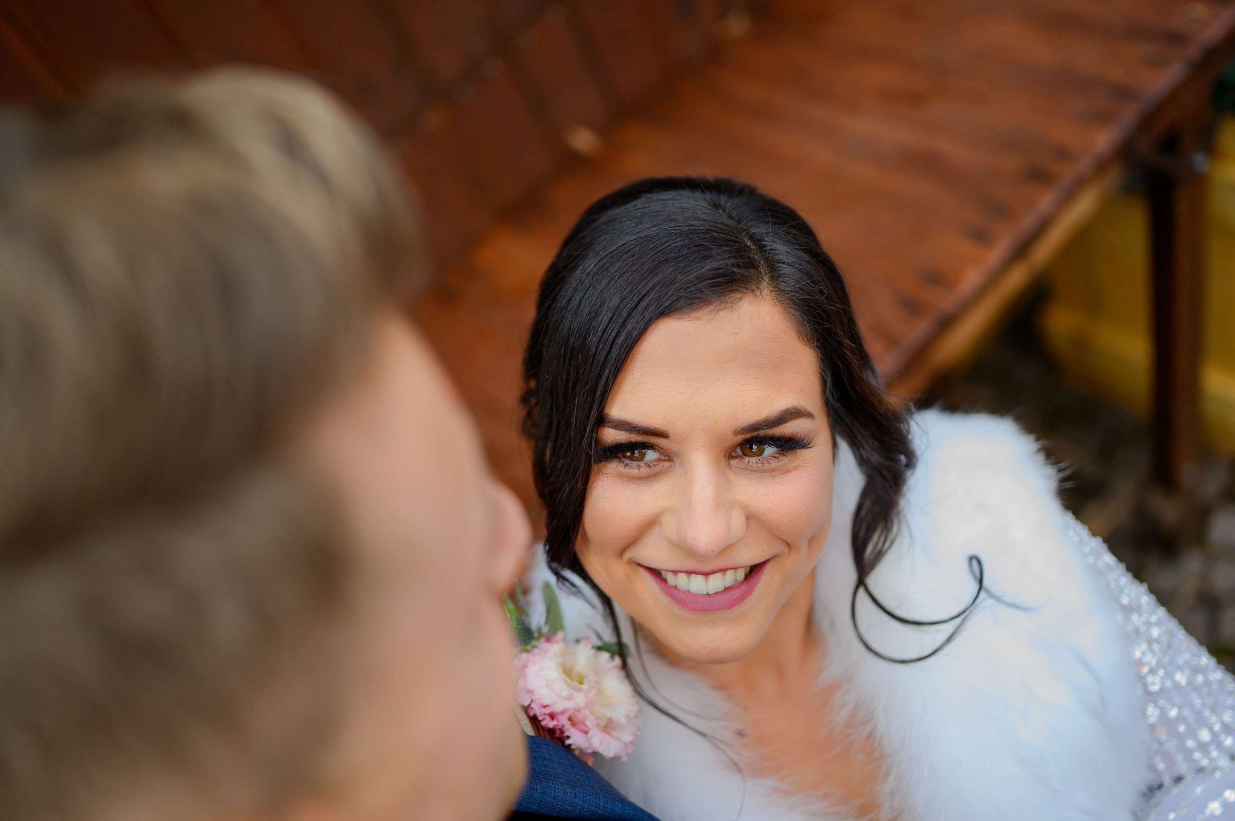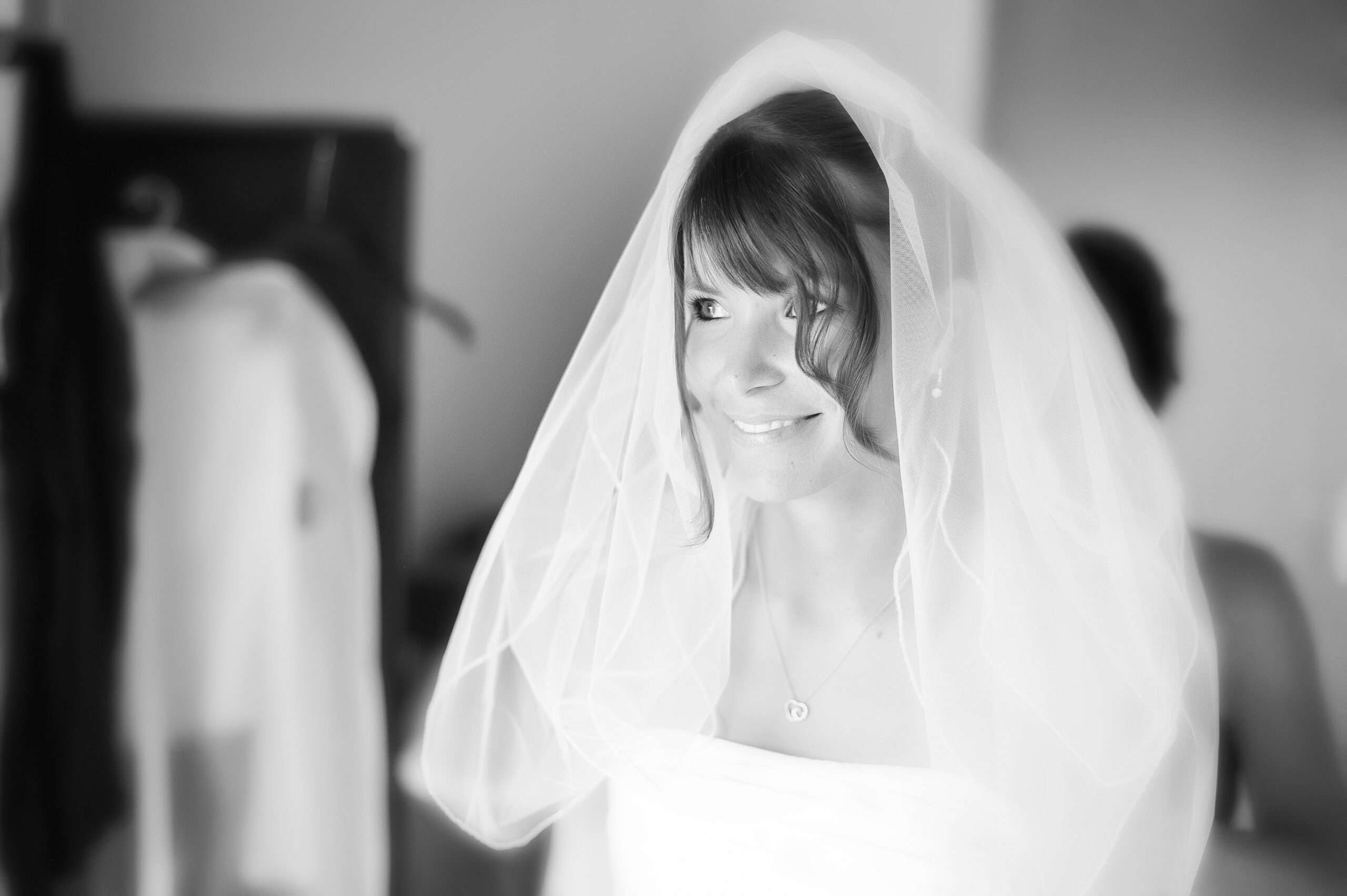 Lachende Braut mit Blumenstrauß bei Hochzeit.