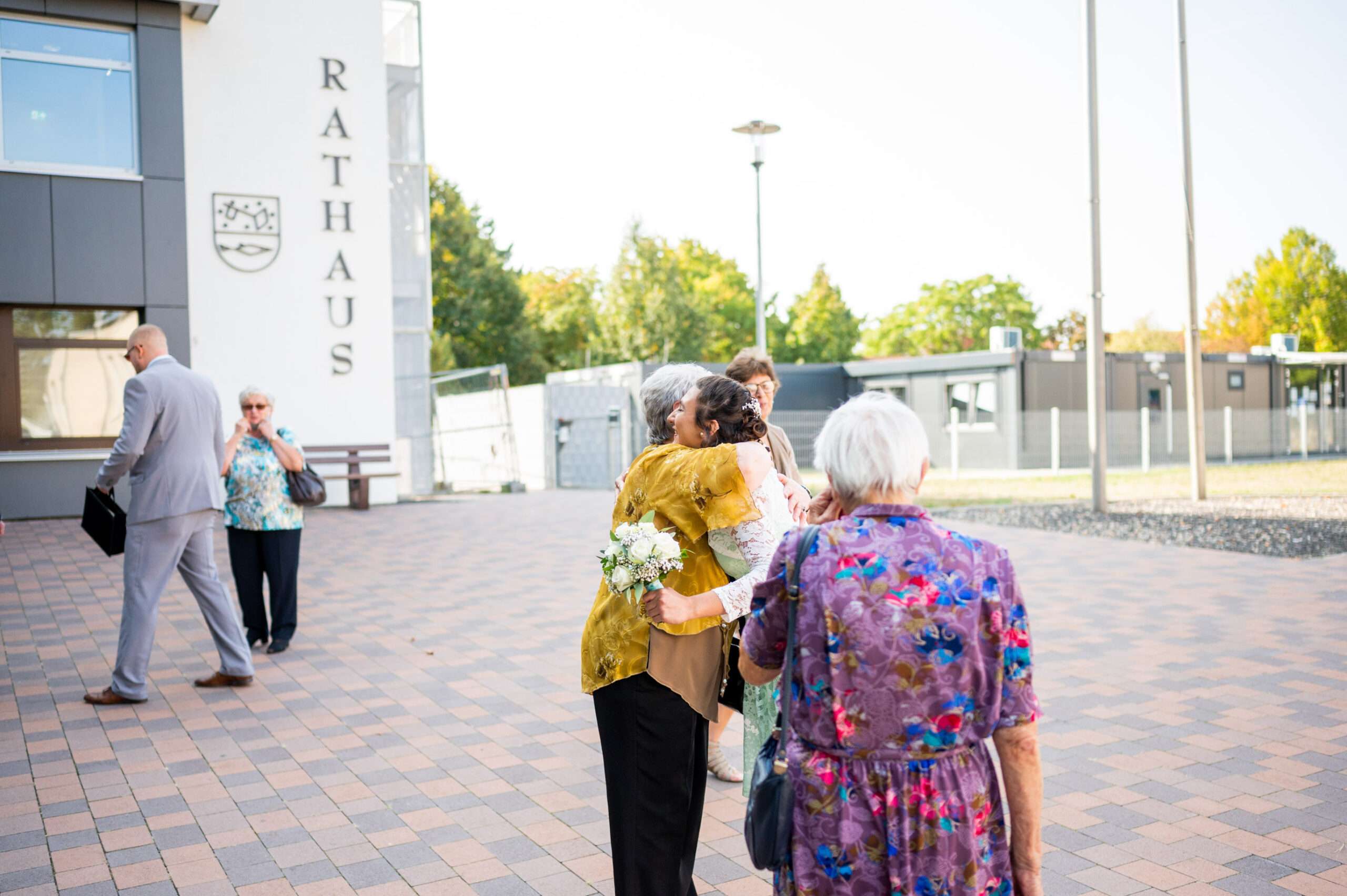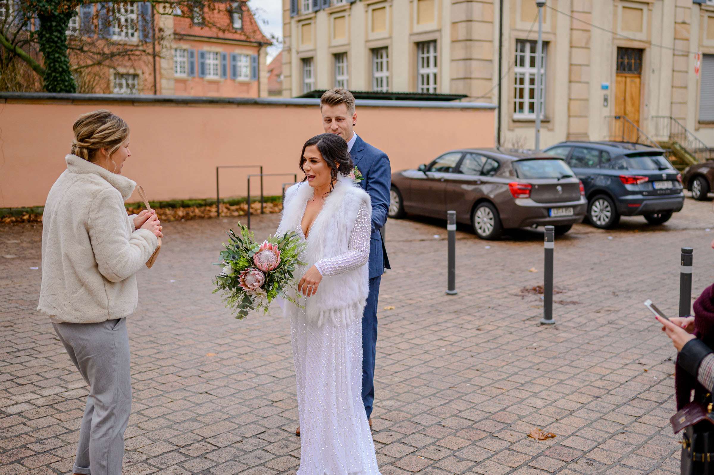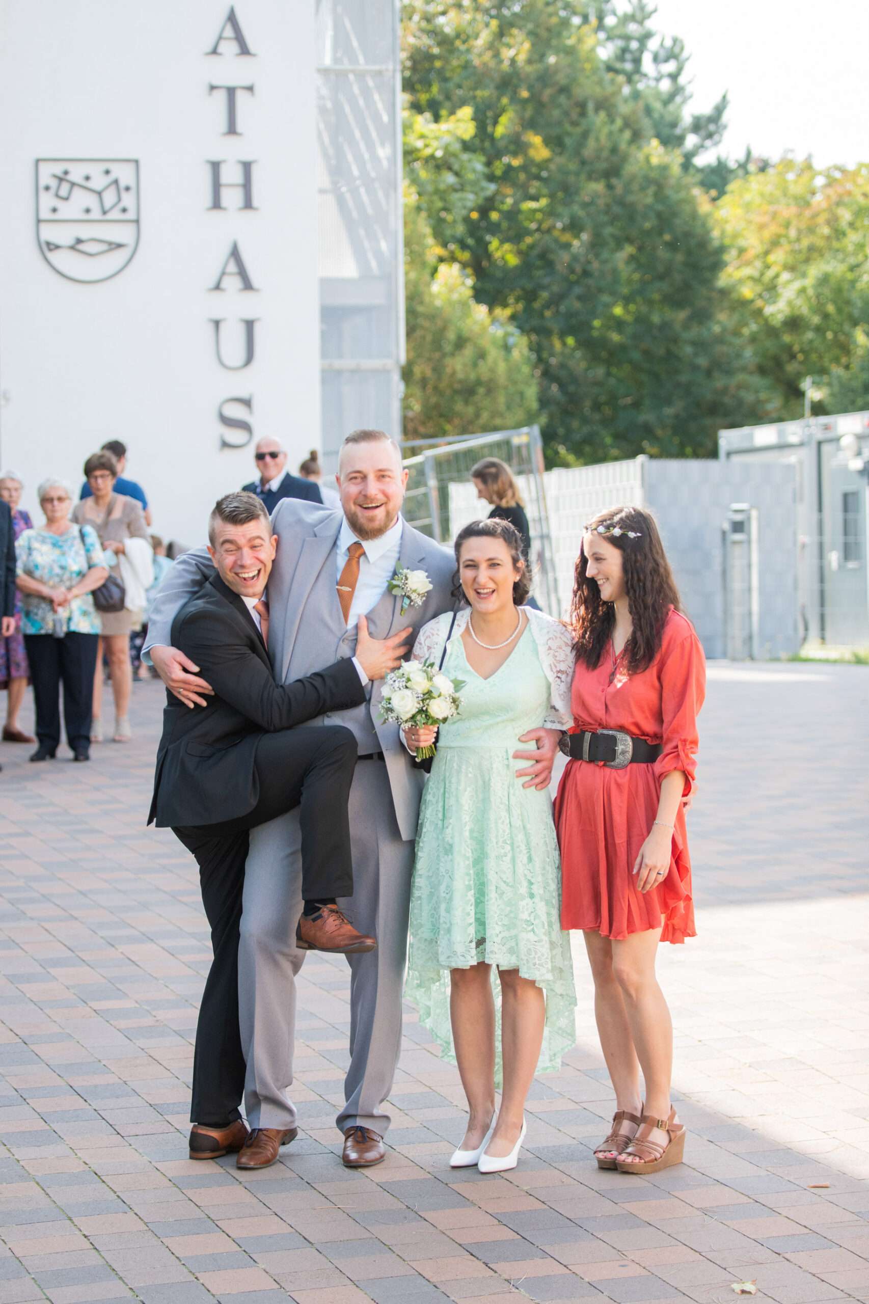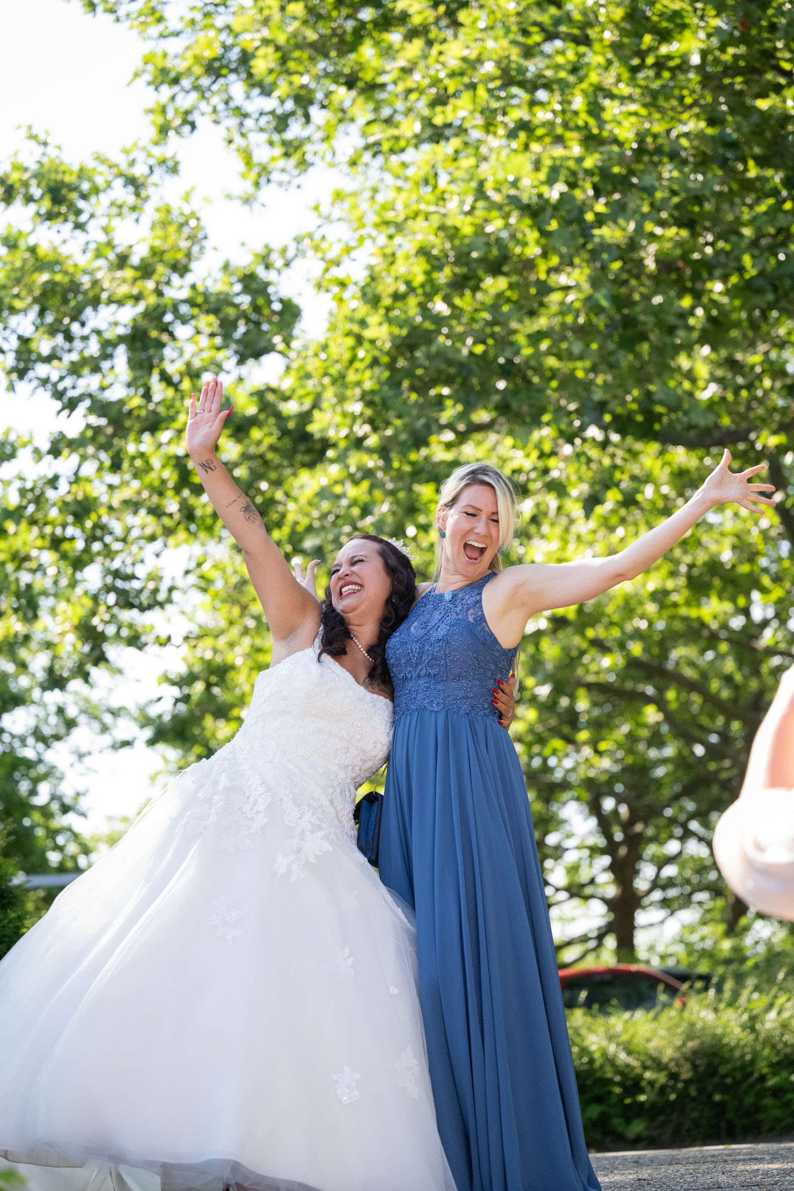 Braut wirft Blumenstrauß, Gäste jubeln.