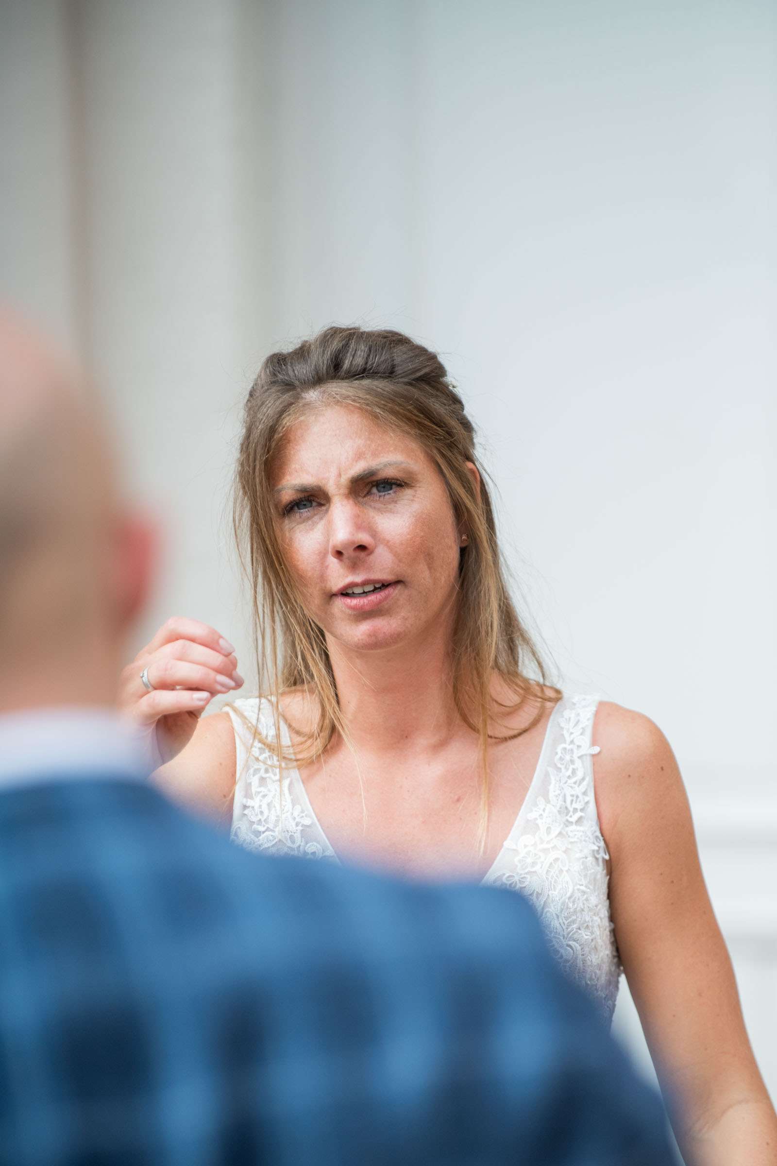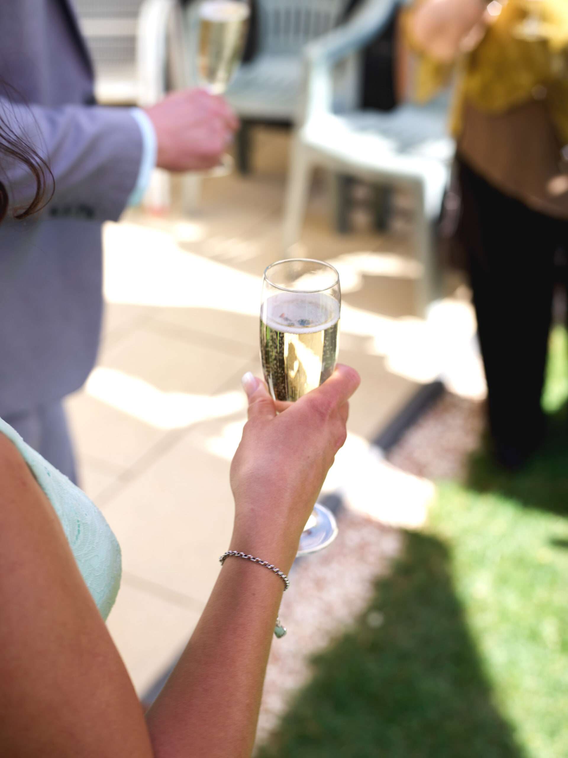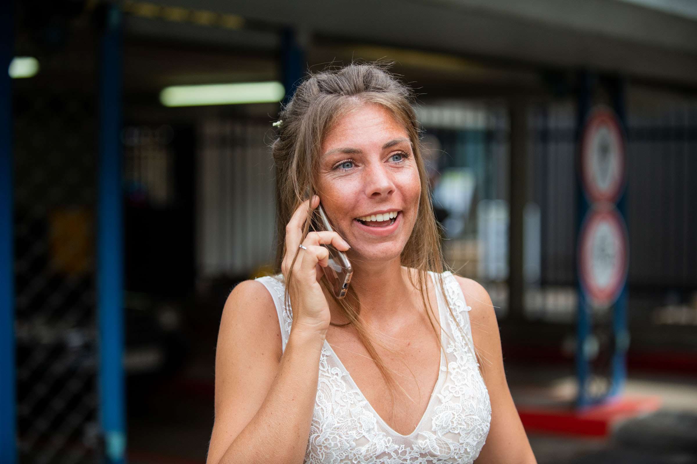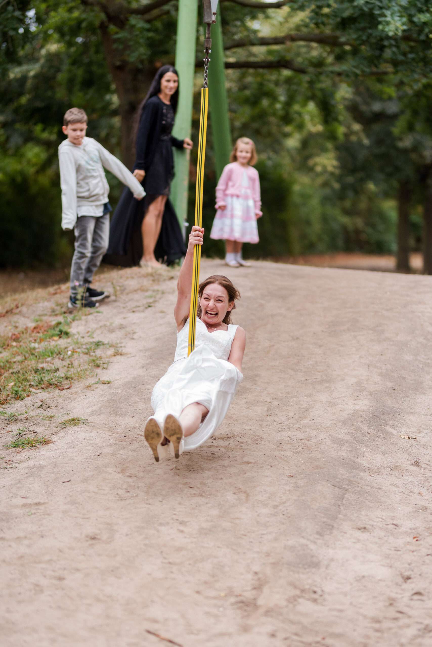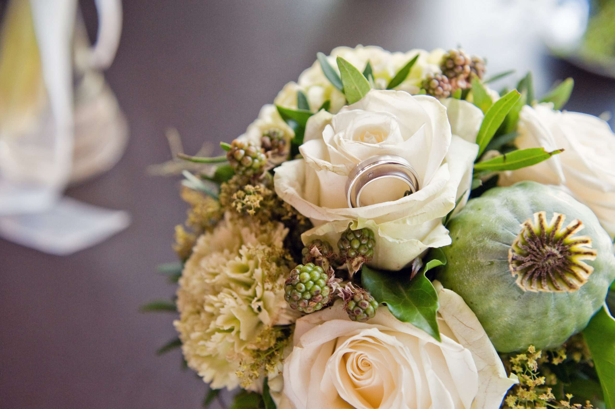 Braut wirft Blumenstrauß, Gäste jubeln.