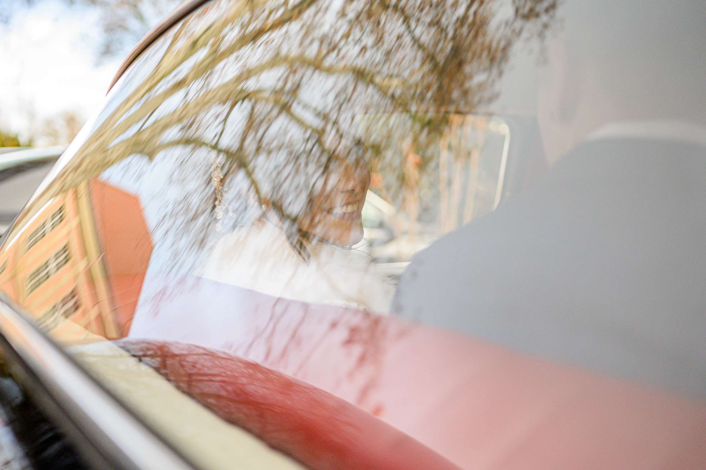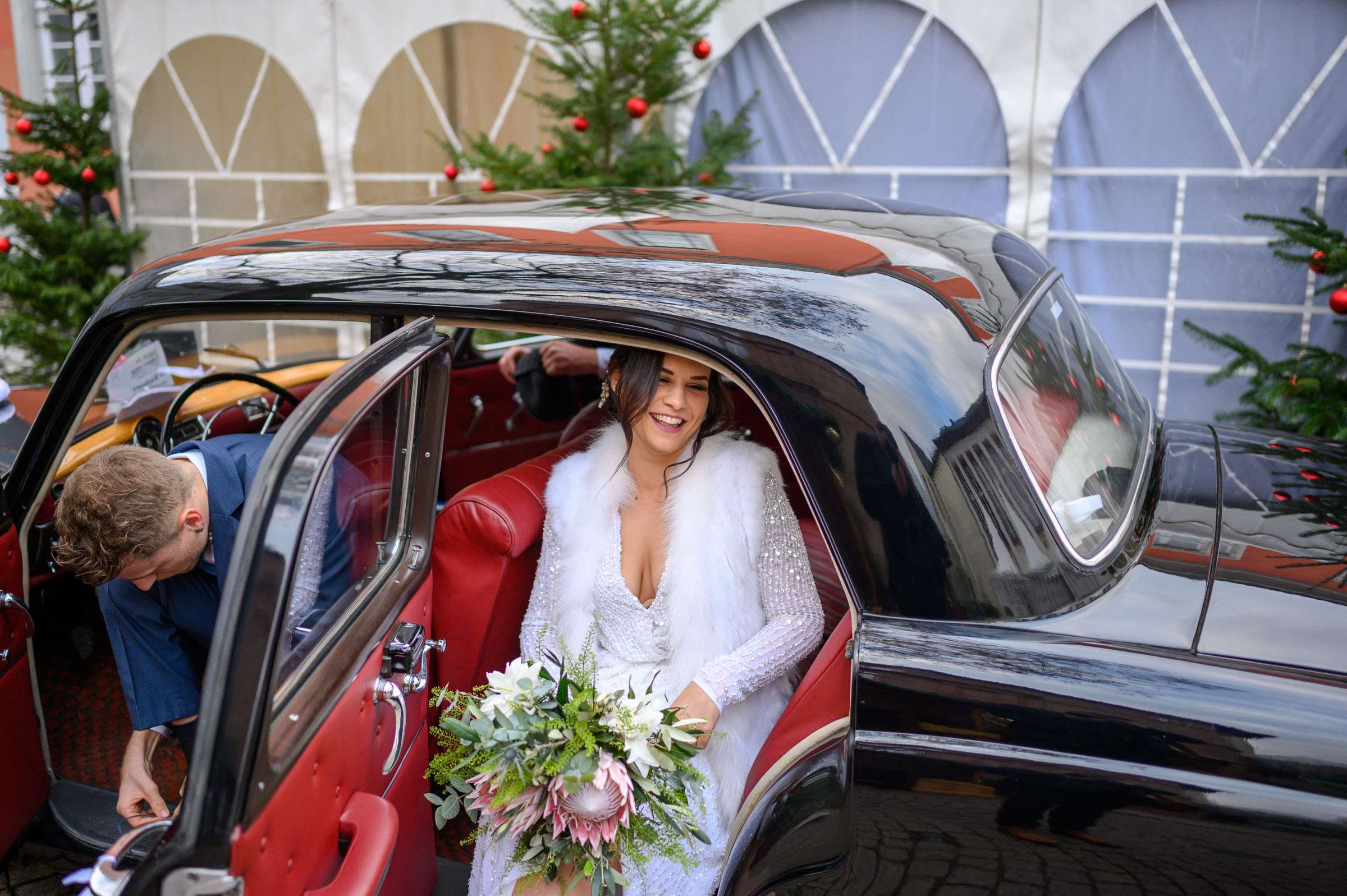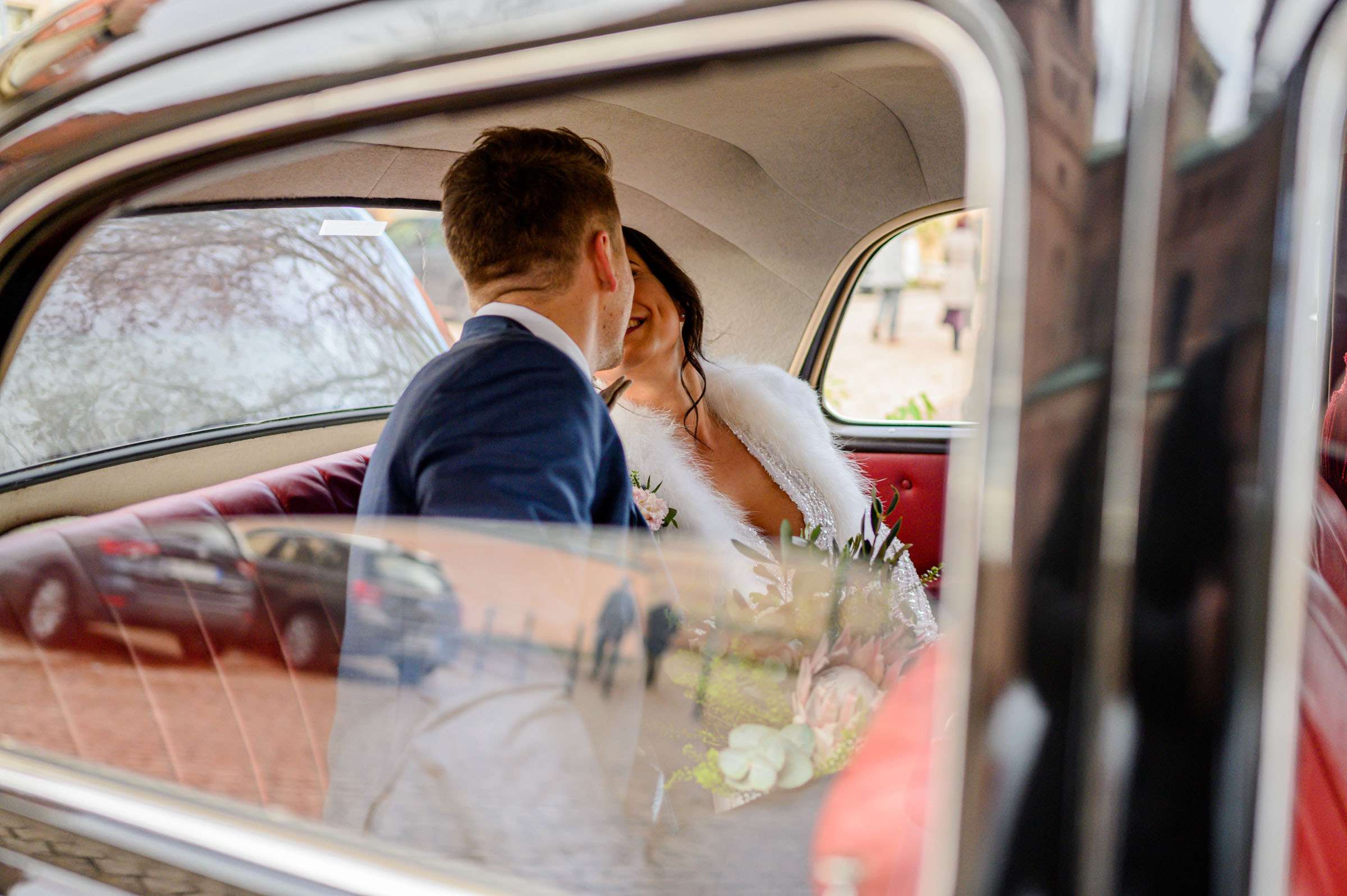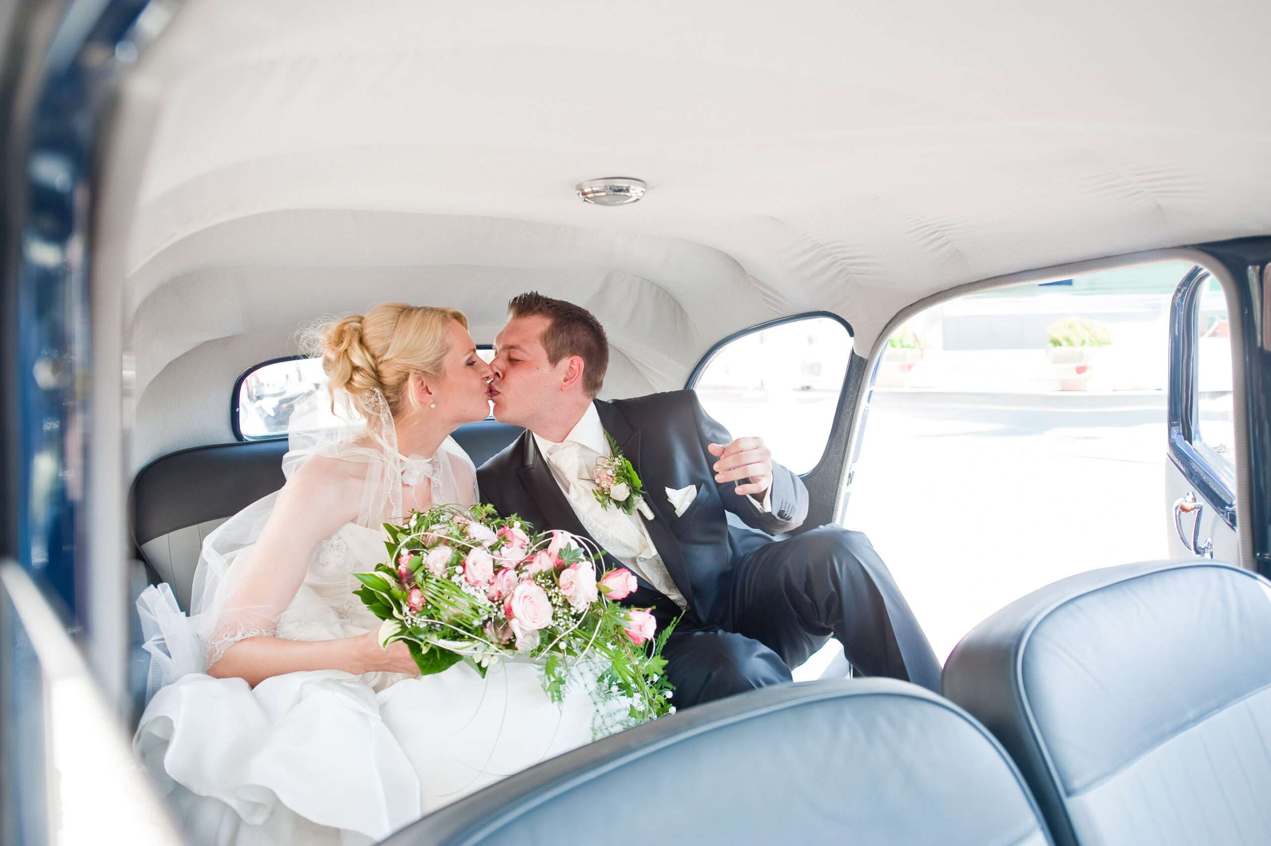 Brautpaar küsst sich im Auto mit Blumenstrauß.