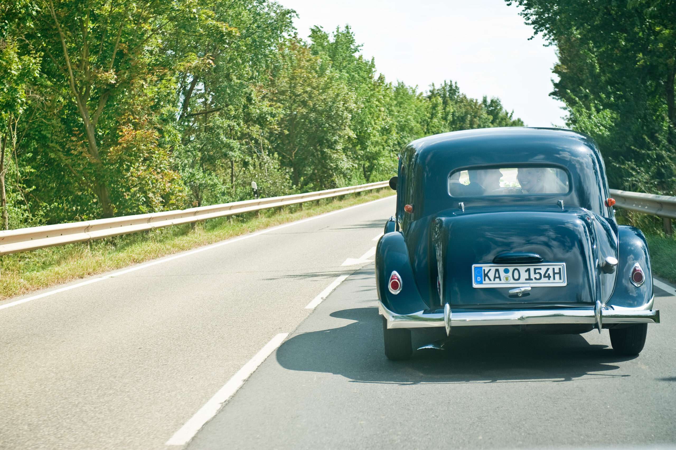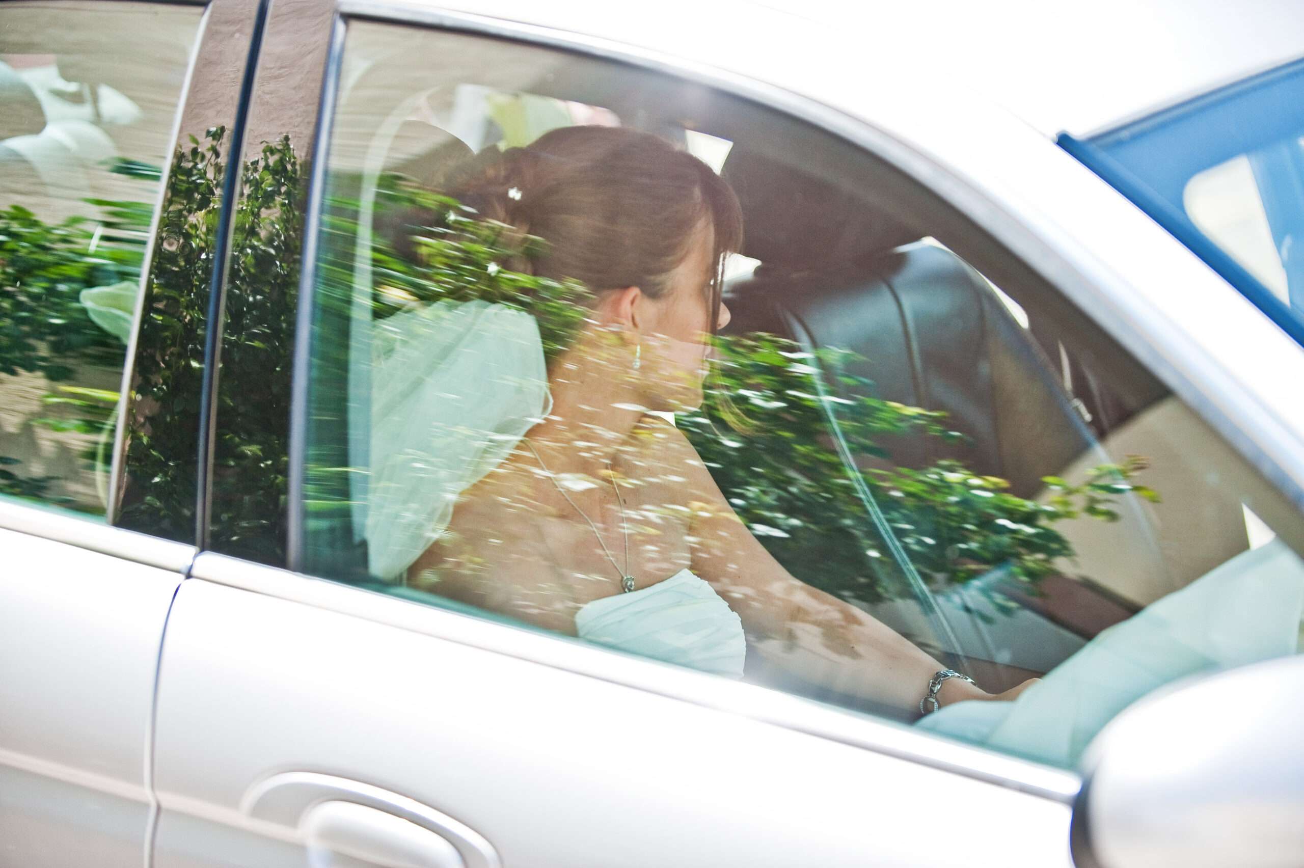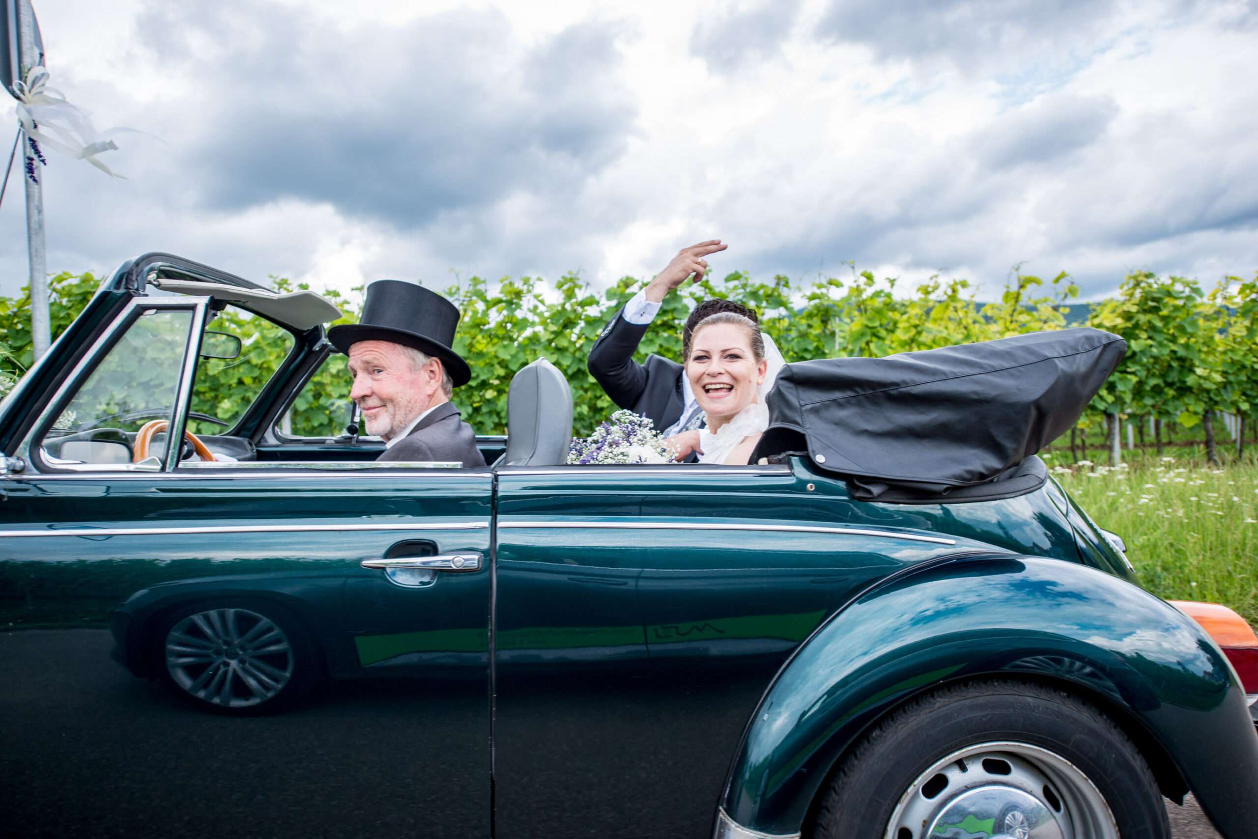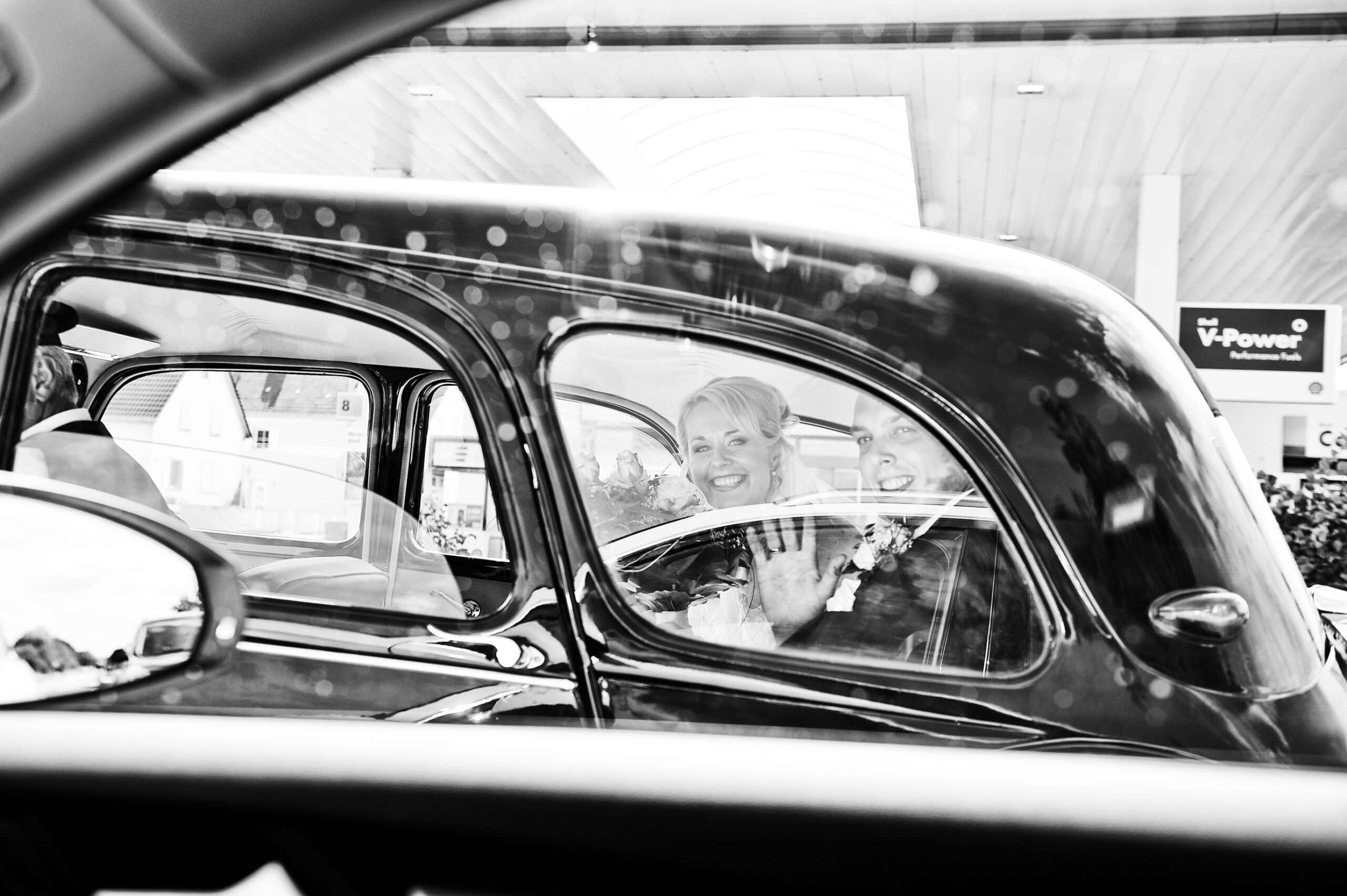 Brautpaar küsst sich im Auto mit Blumenstrauß.