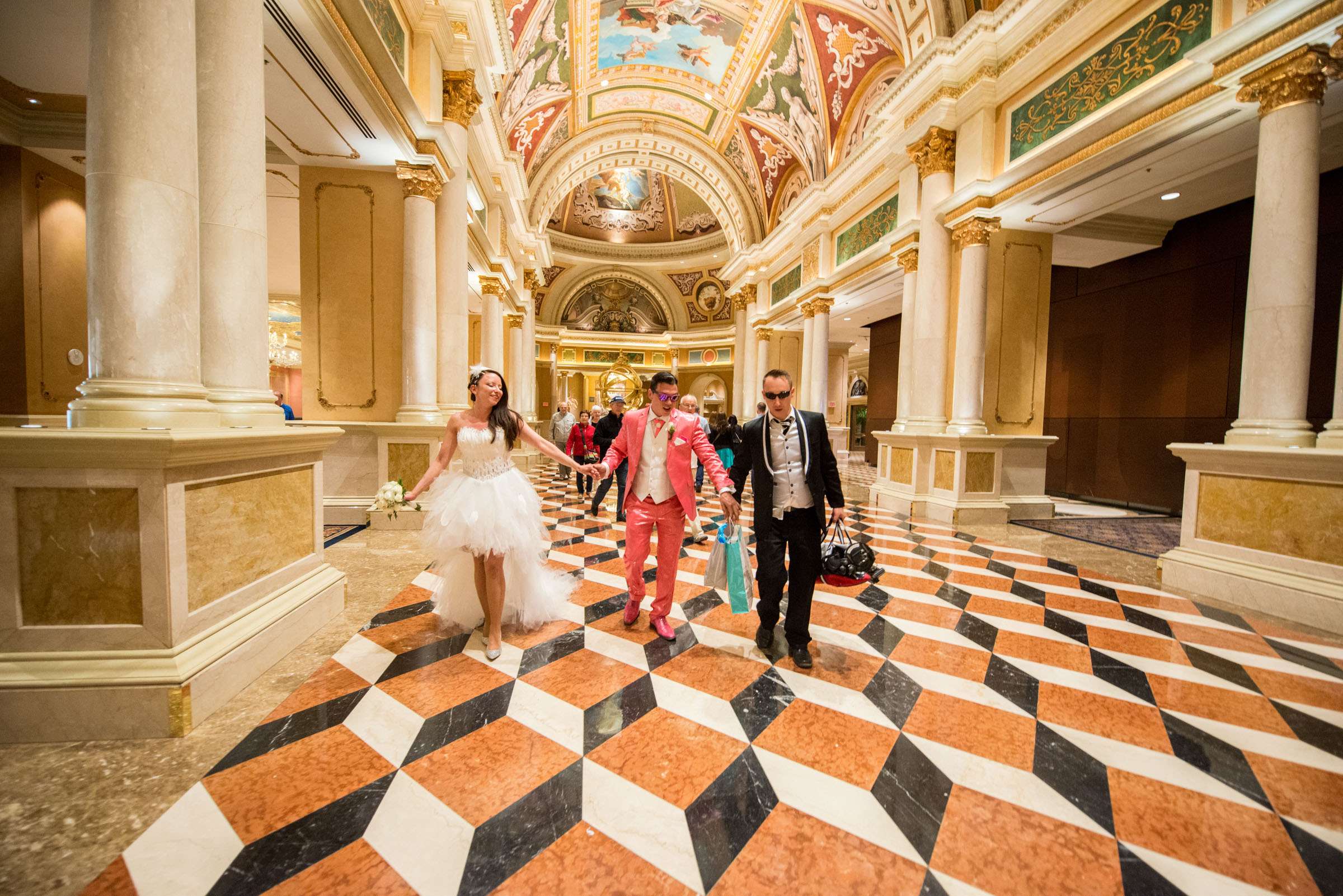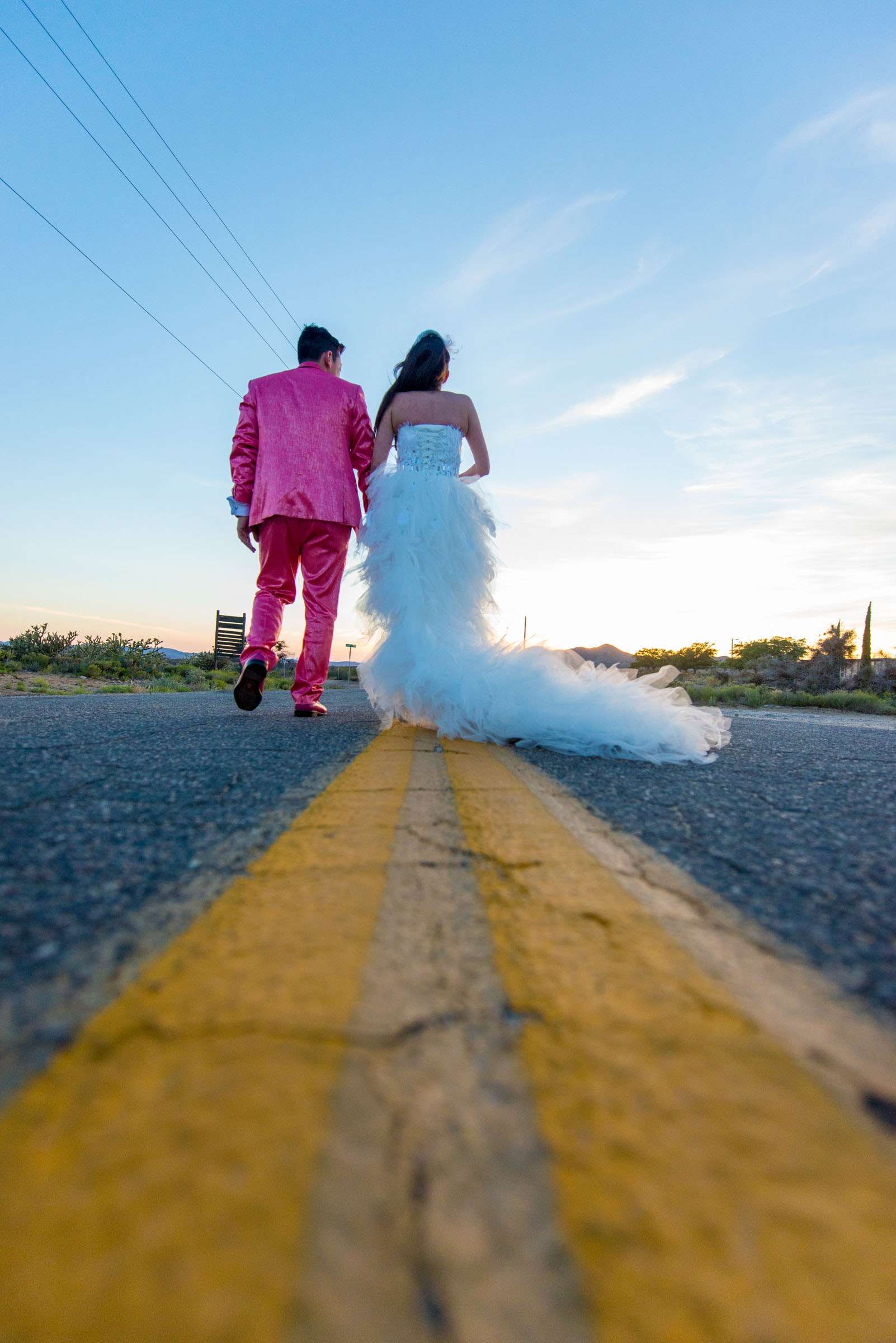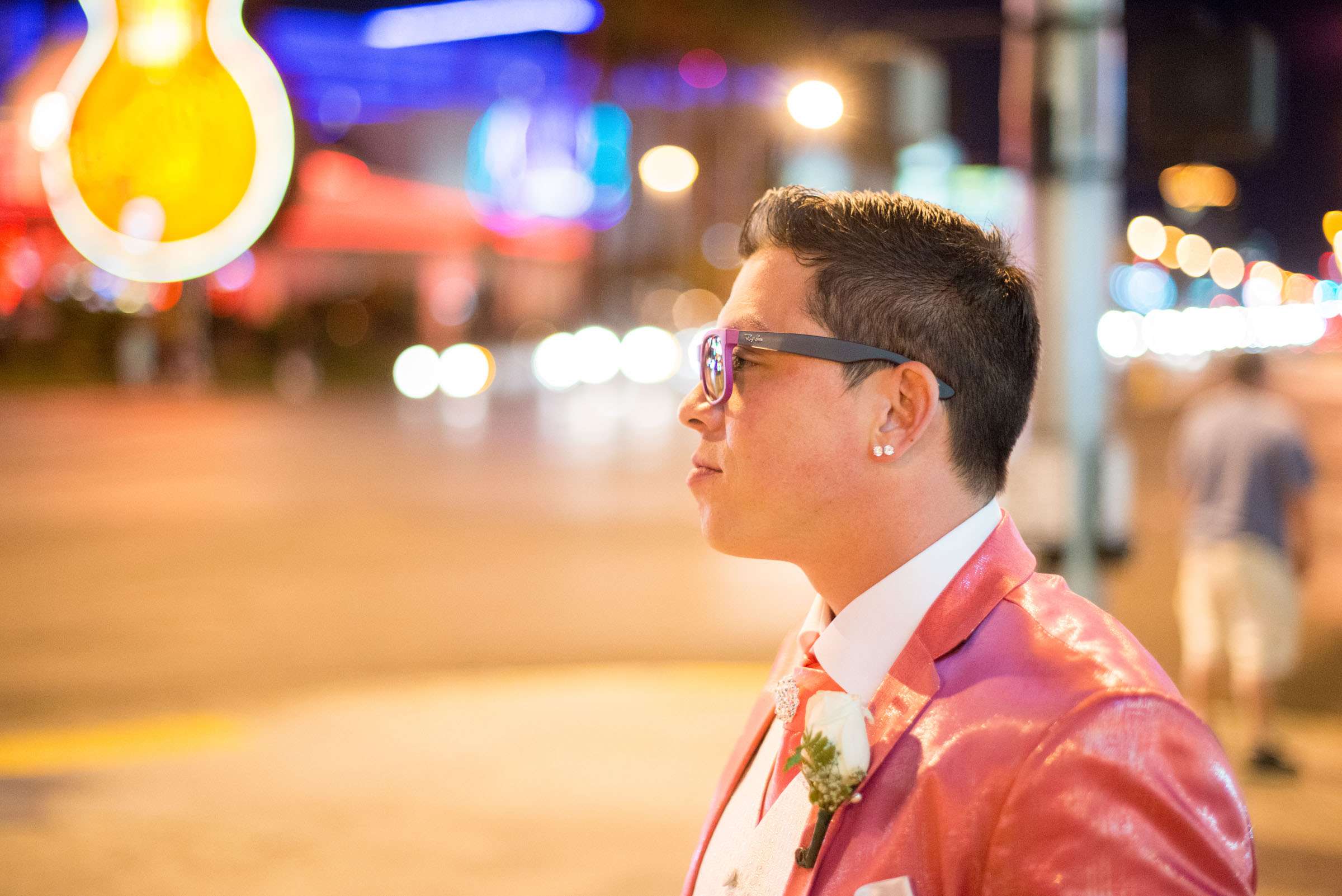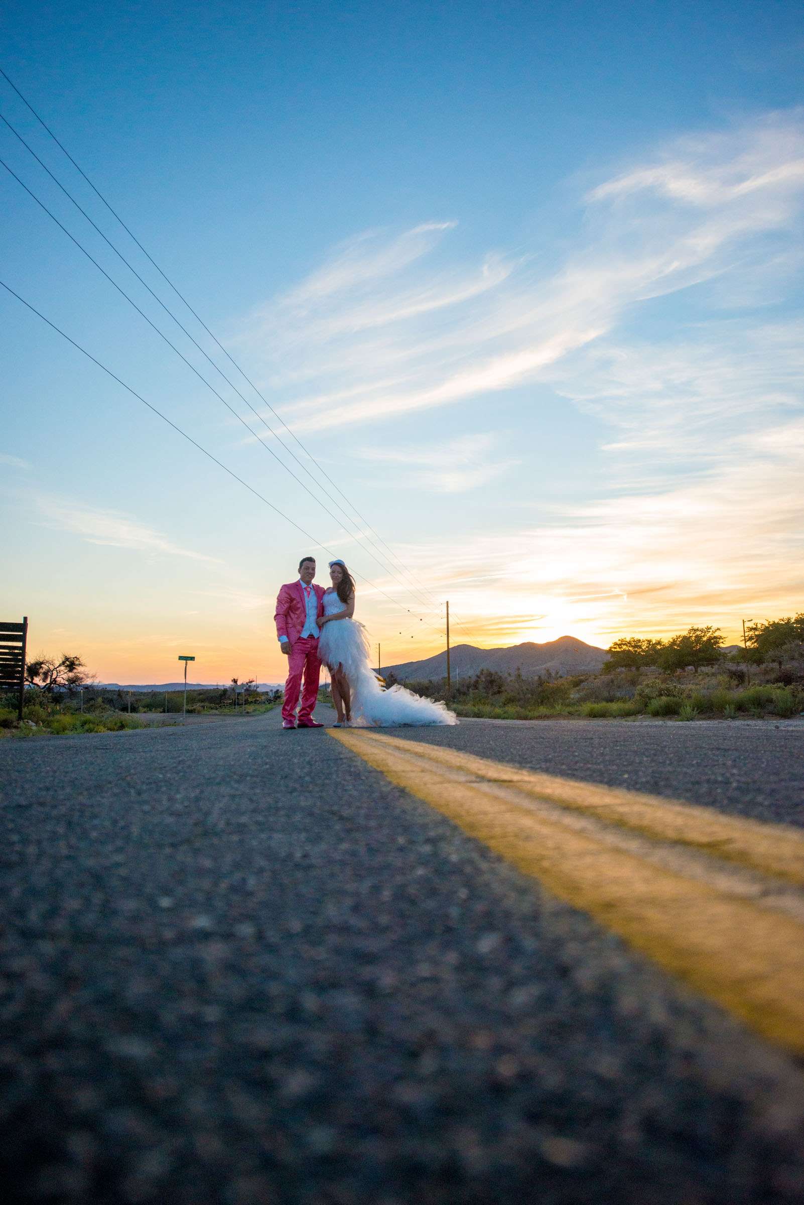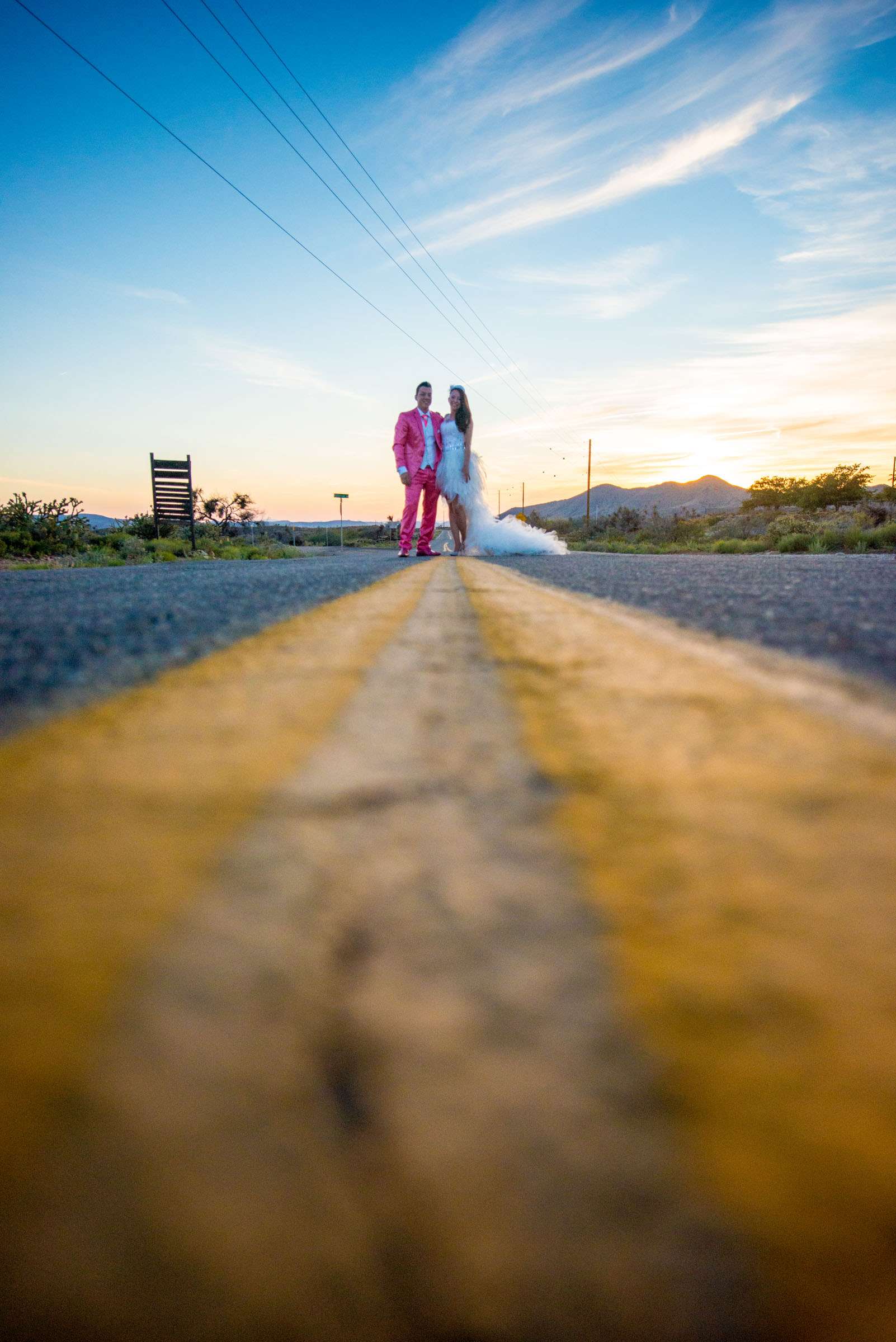 • Hochzeitspaare posieren vor Las Vegas Schild nachts.